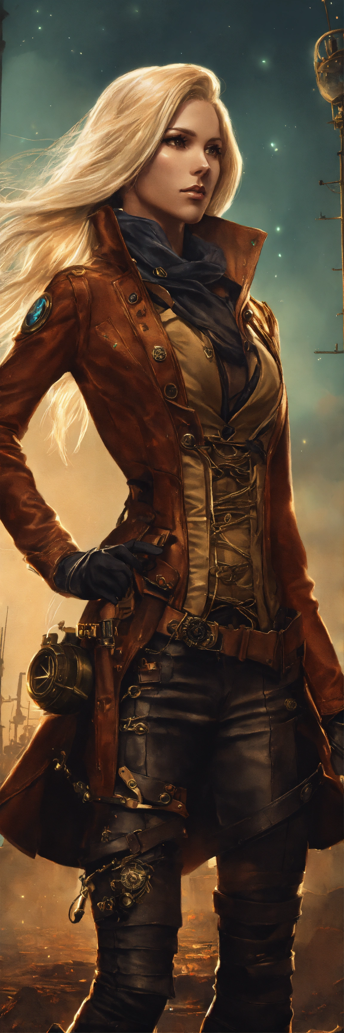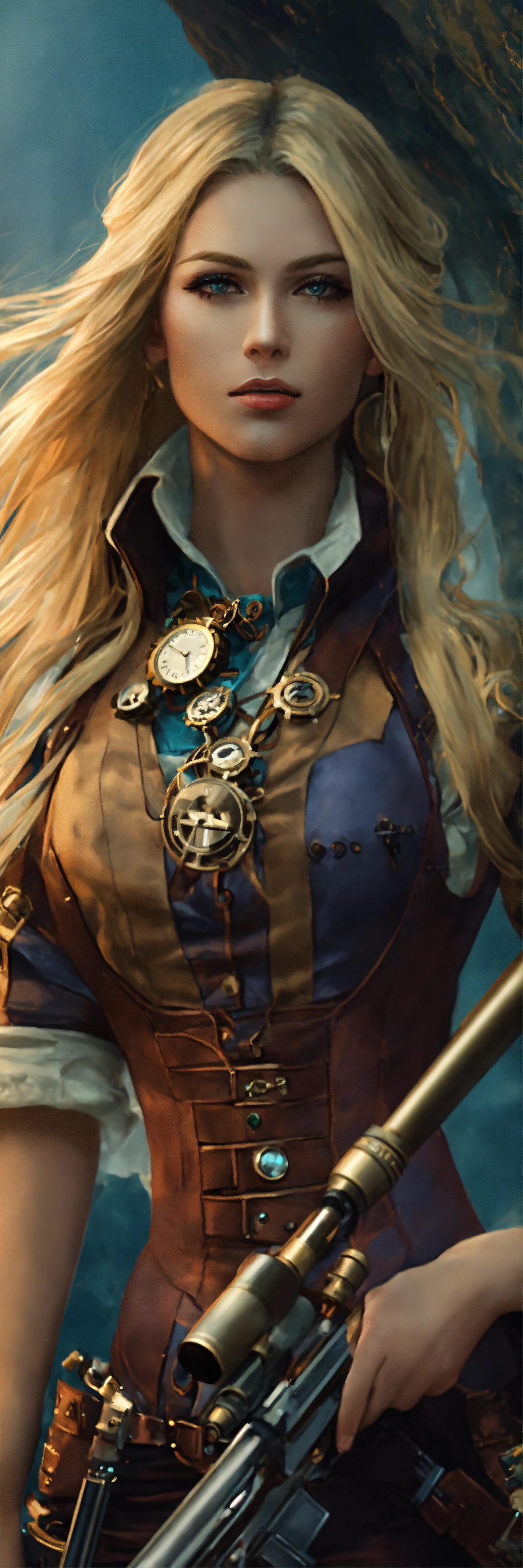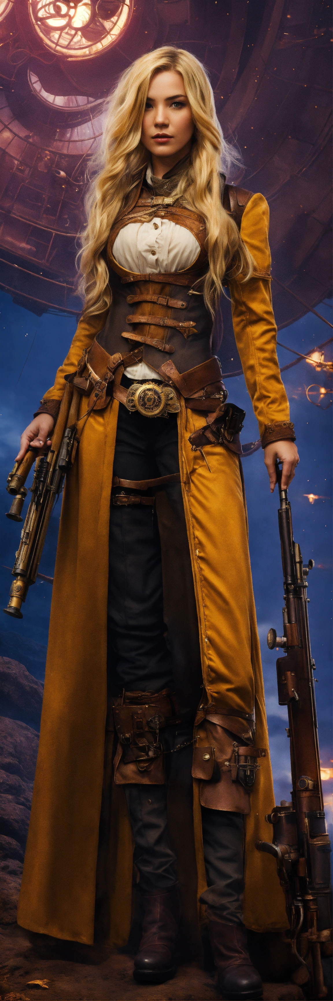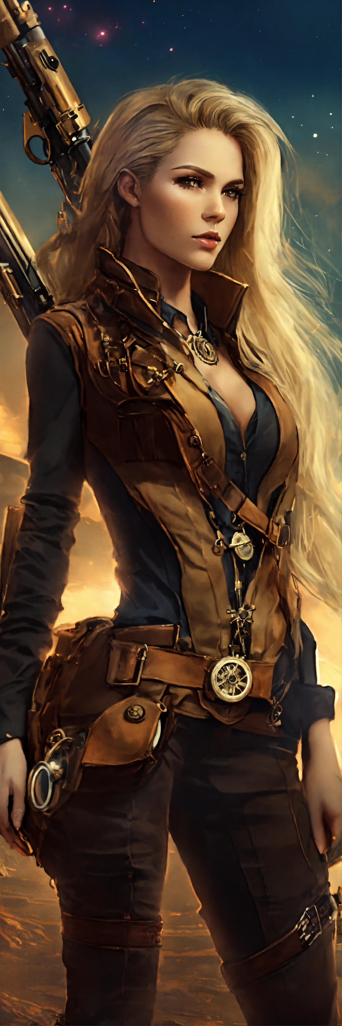 A female sniper with long blond hair in a farwest steampunk outfit in a dark fantasy universe