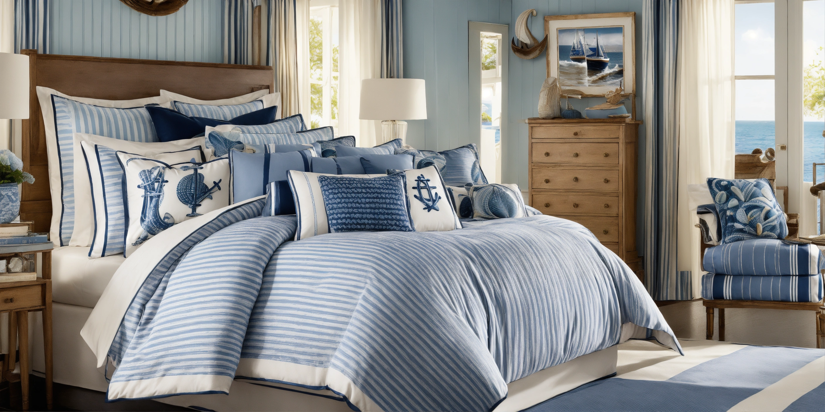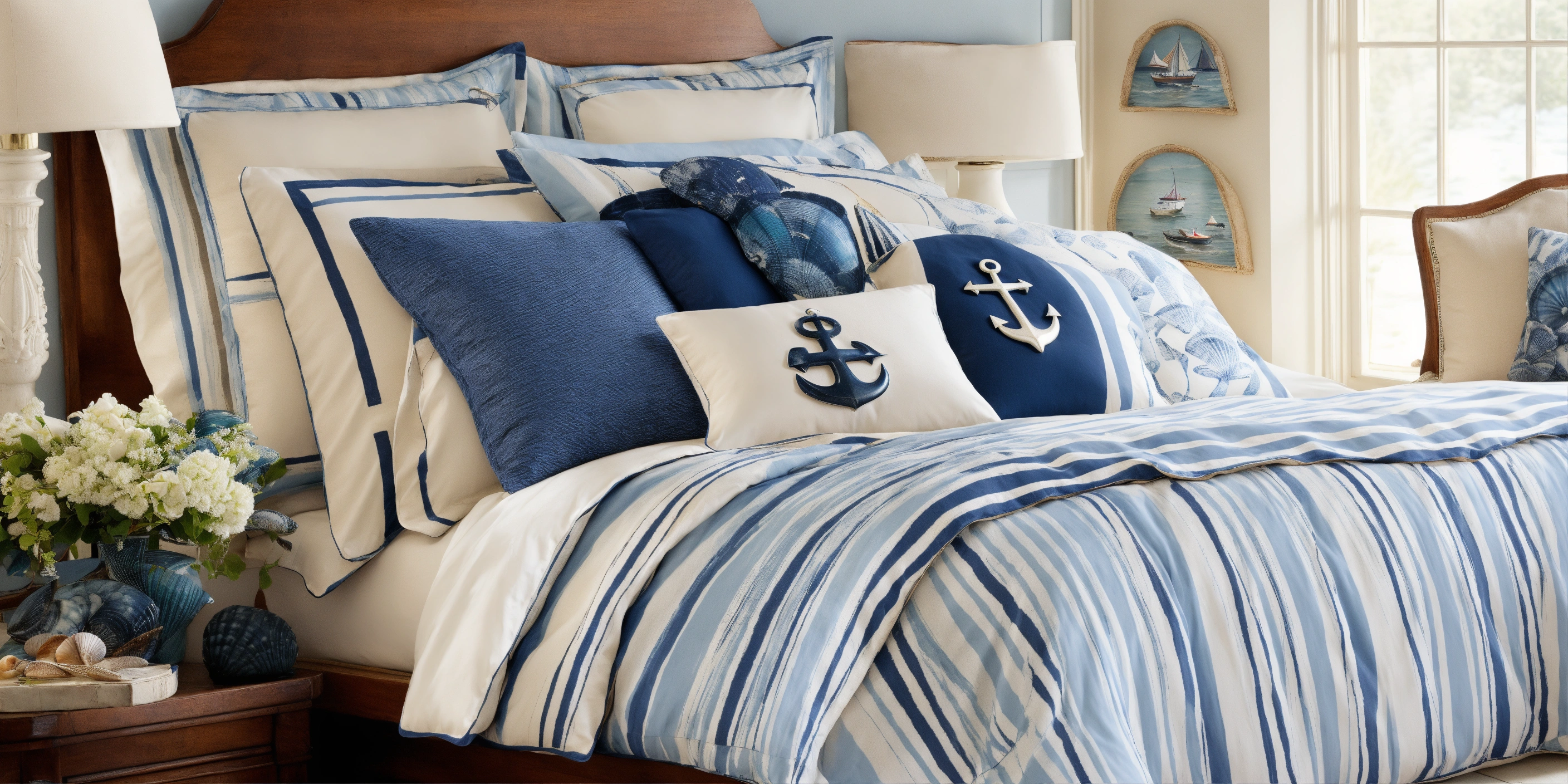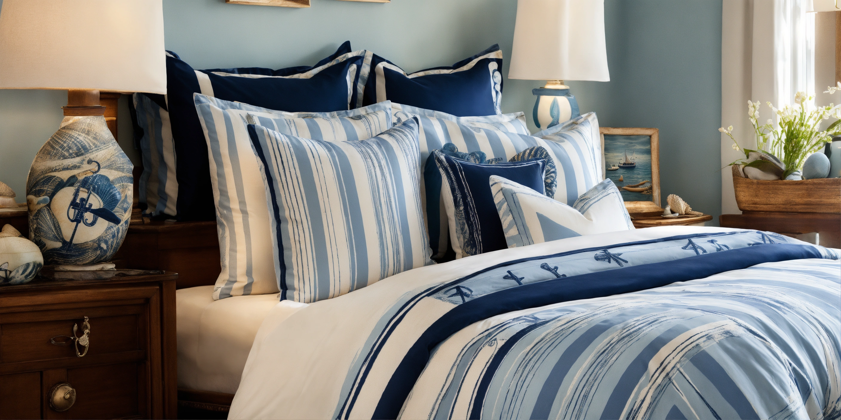 Luxury decorative pillows in blue, light blue and white stripes, sea shells, boat anchors, maritime themes on duvet covers