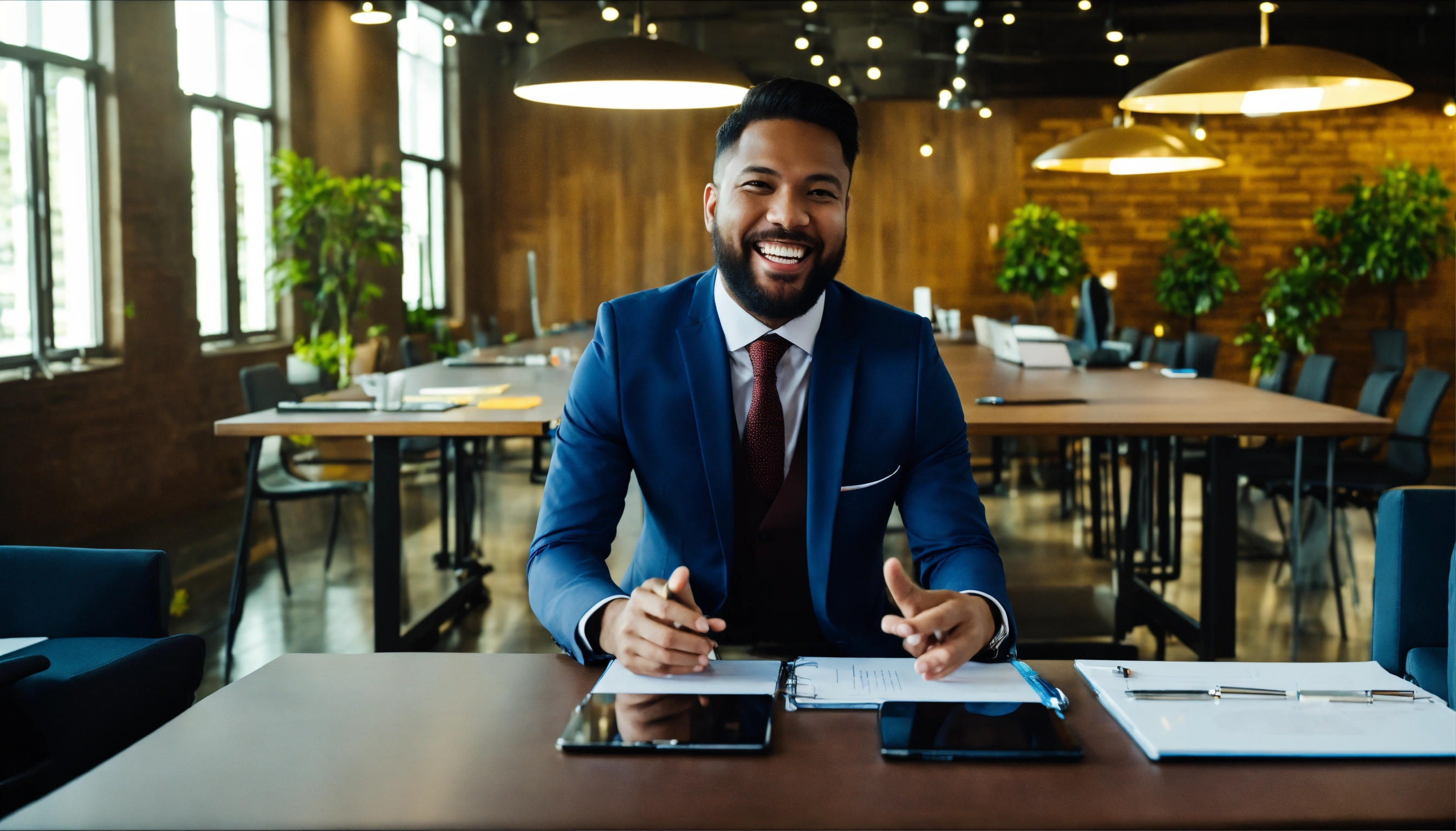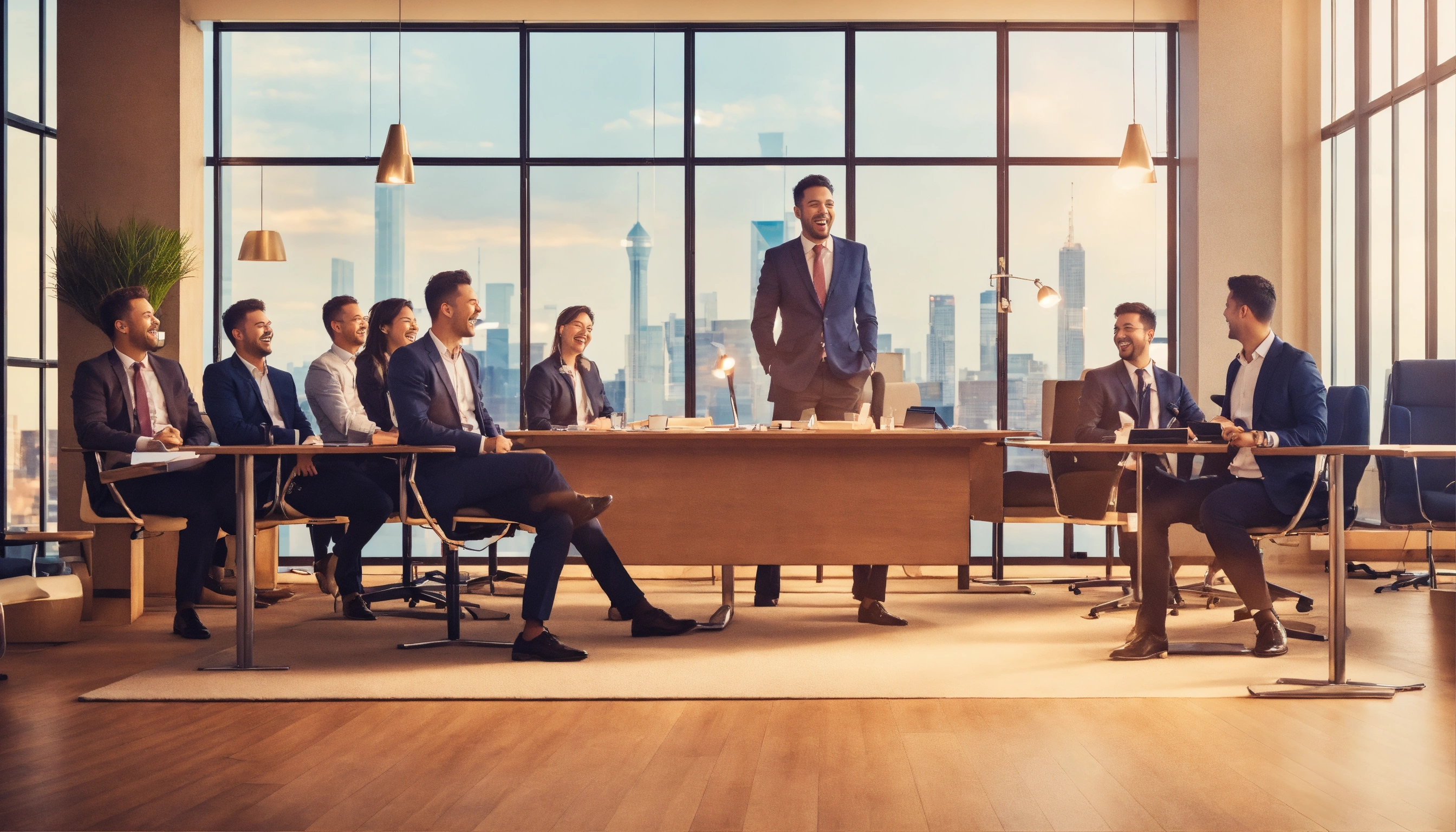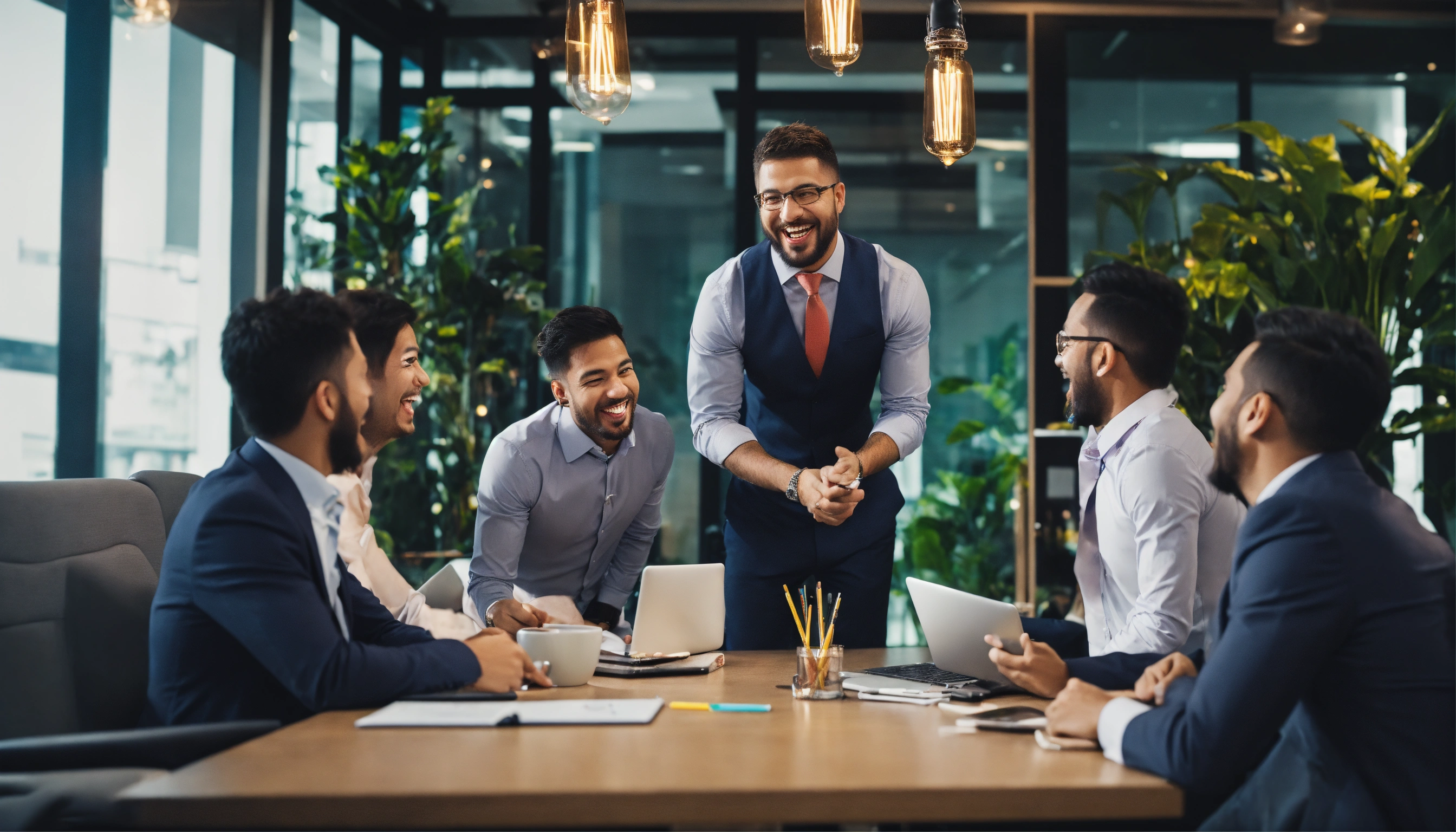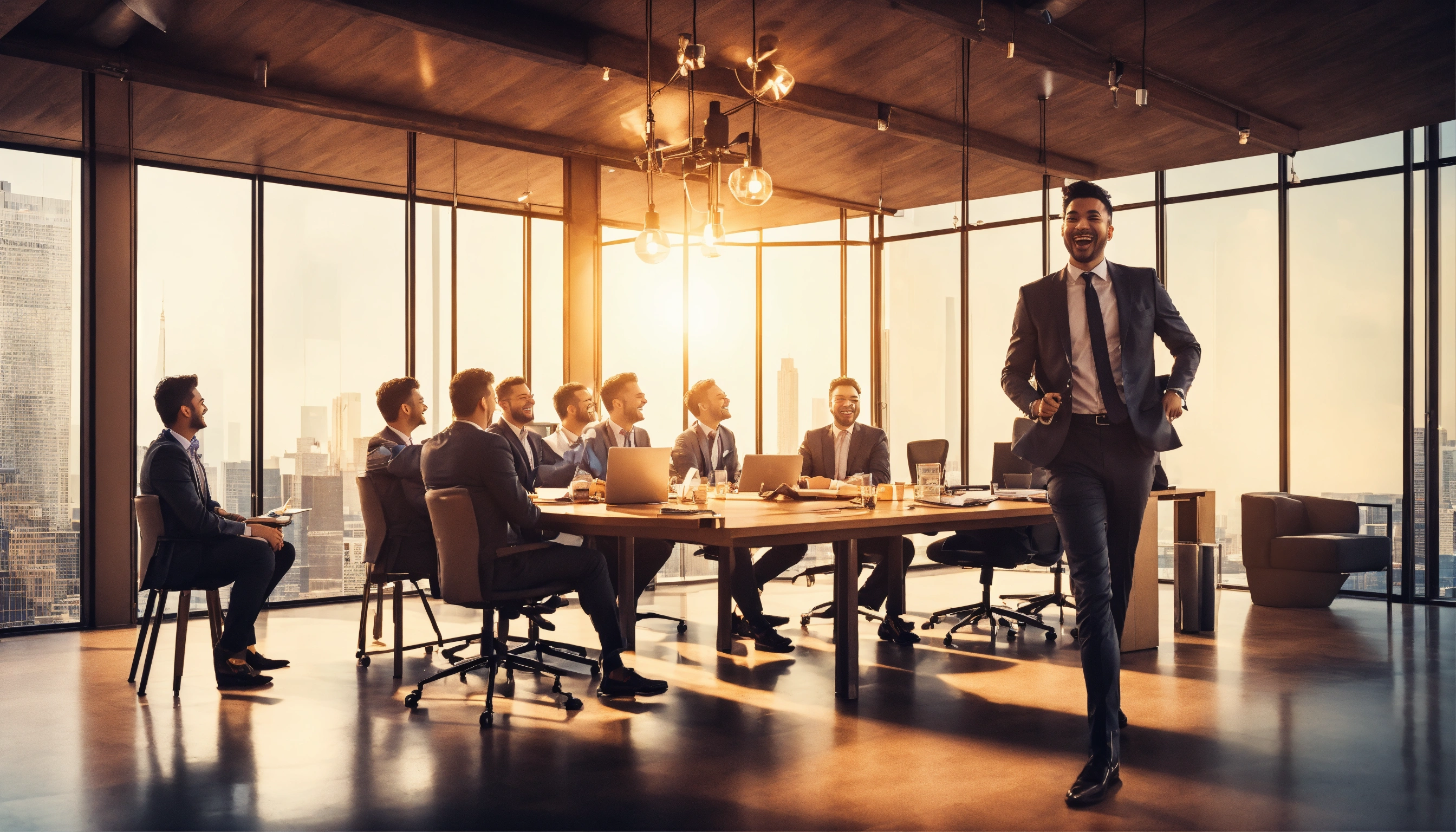 An entrepreneur leader excited because he overcame the challenges that come with entrepreneurship, in meeting area setting, his team excited for the accomplishment