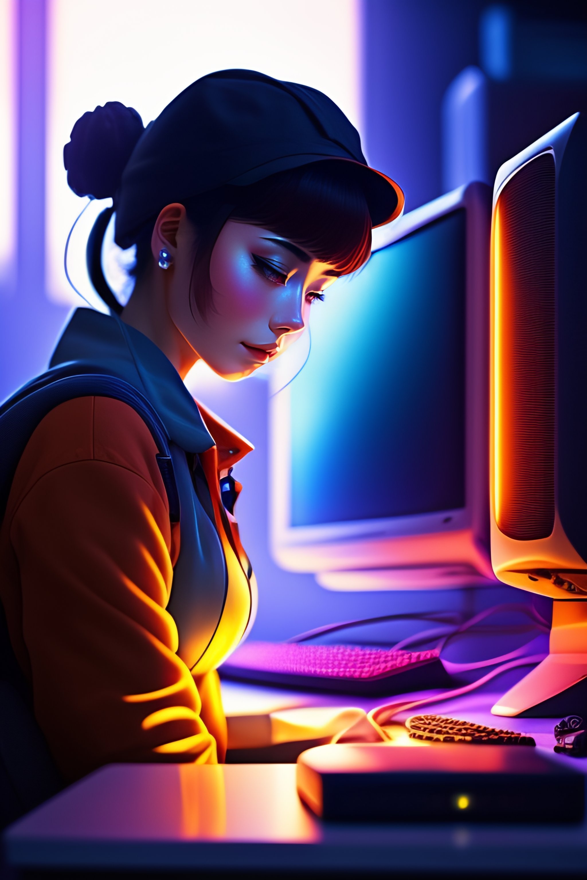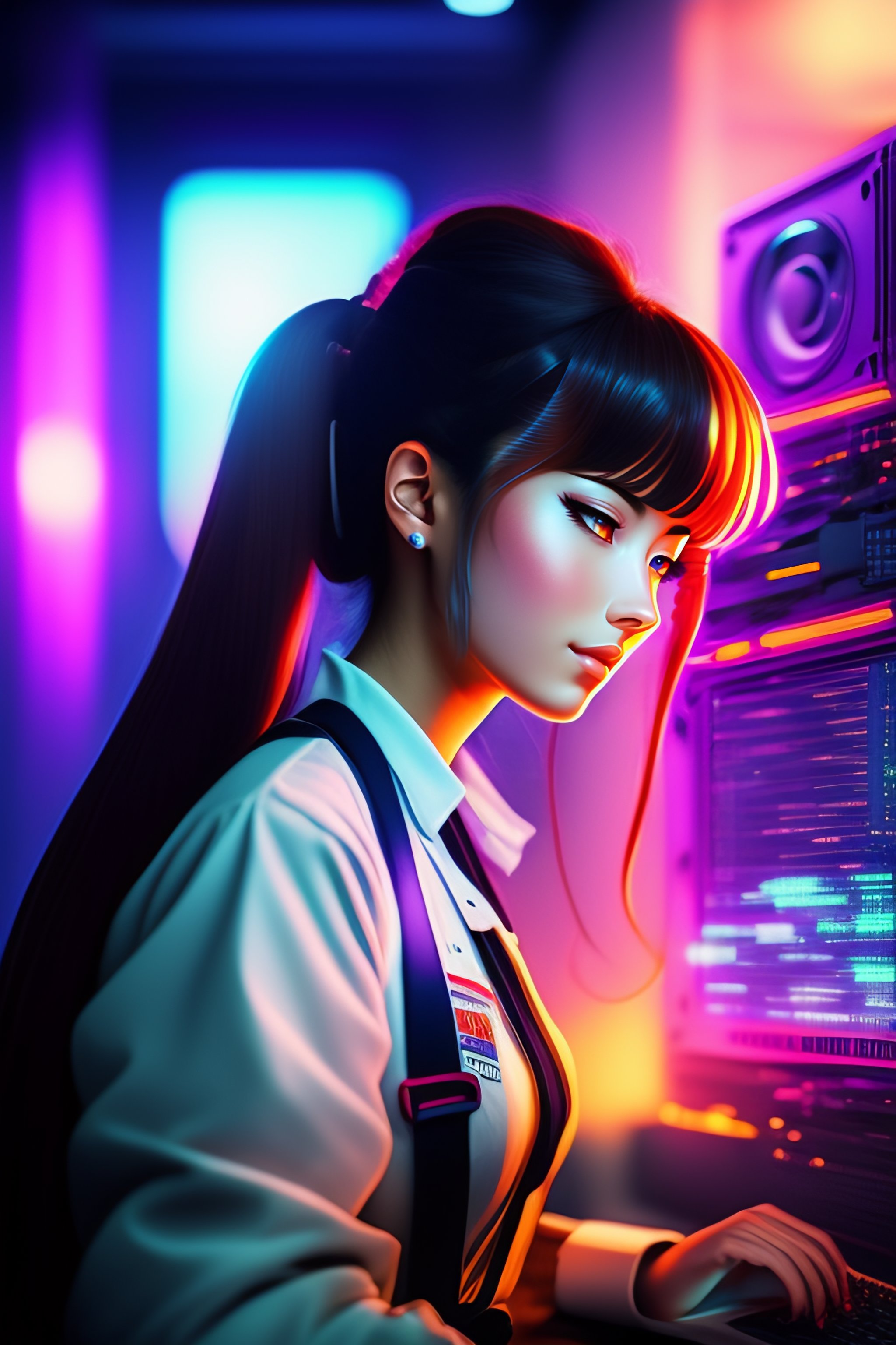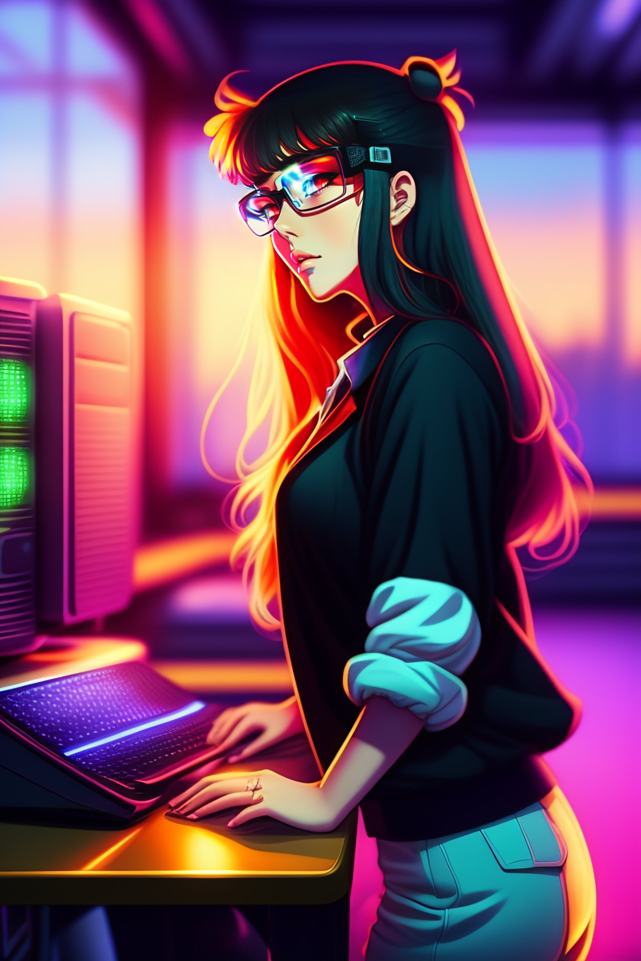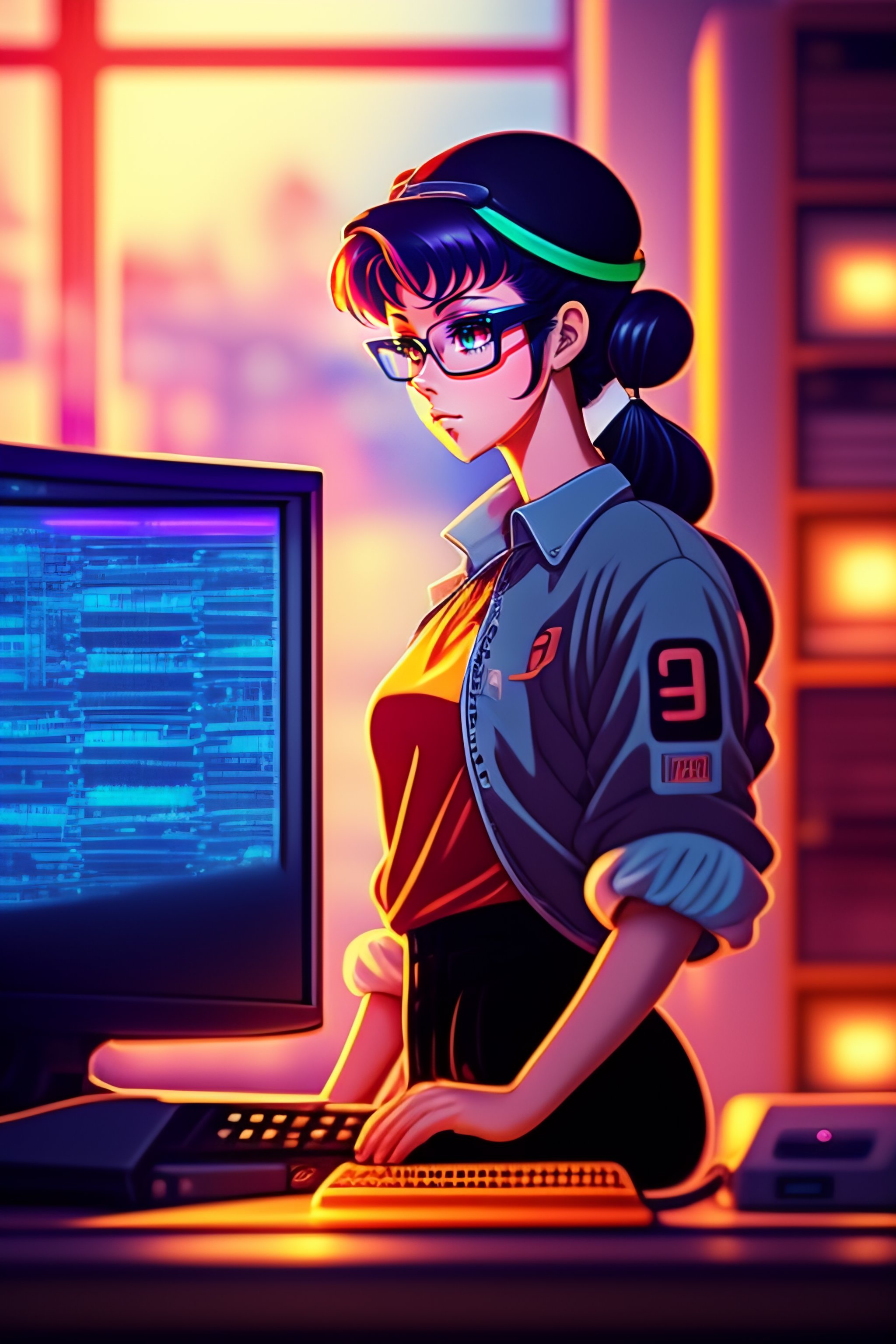 Vintage 90's anime style, a nerdy europian girl is programming at a computer in a room full of gadgets, dramatic lighting