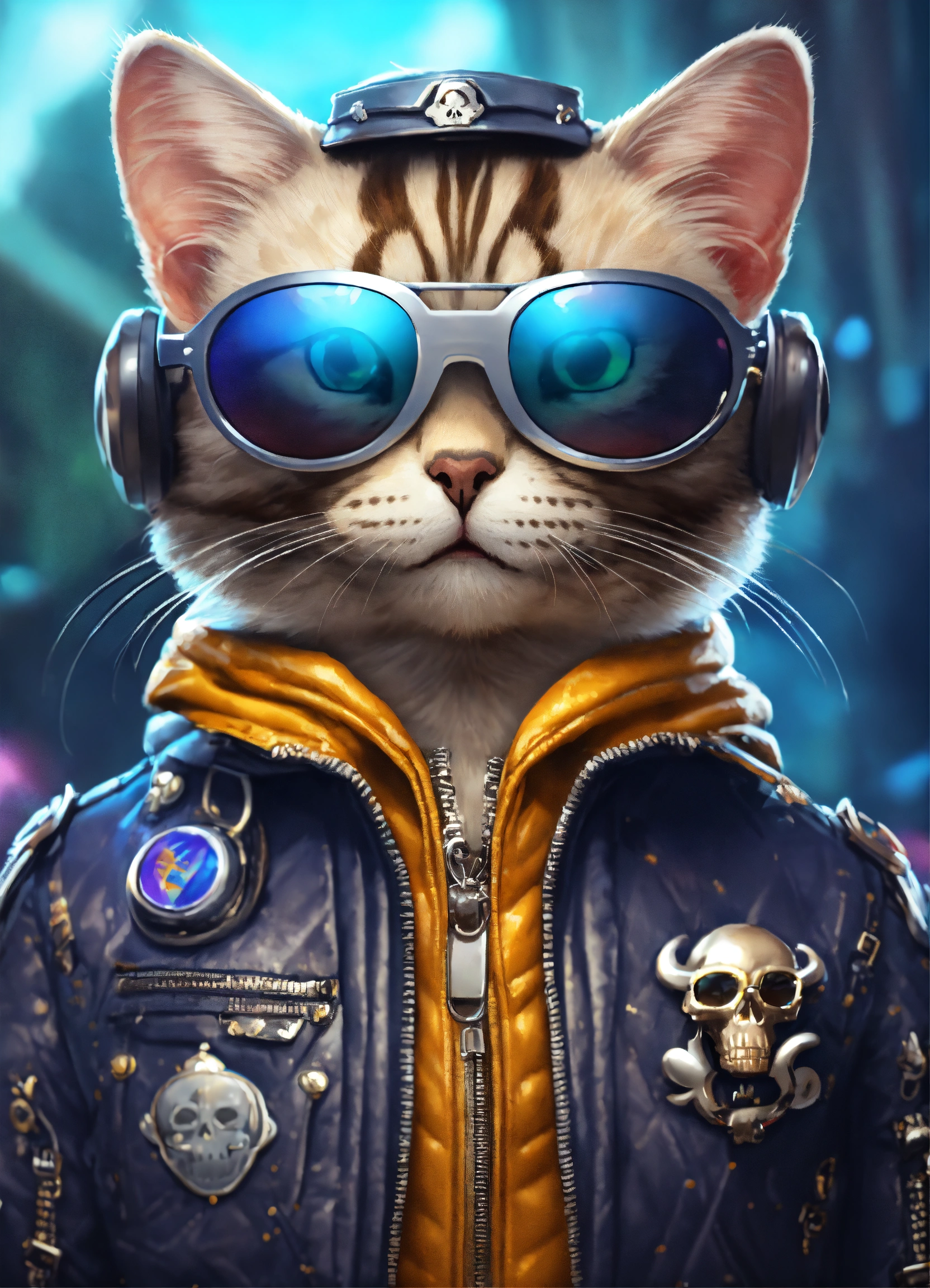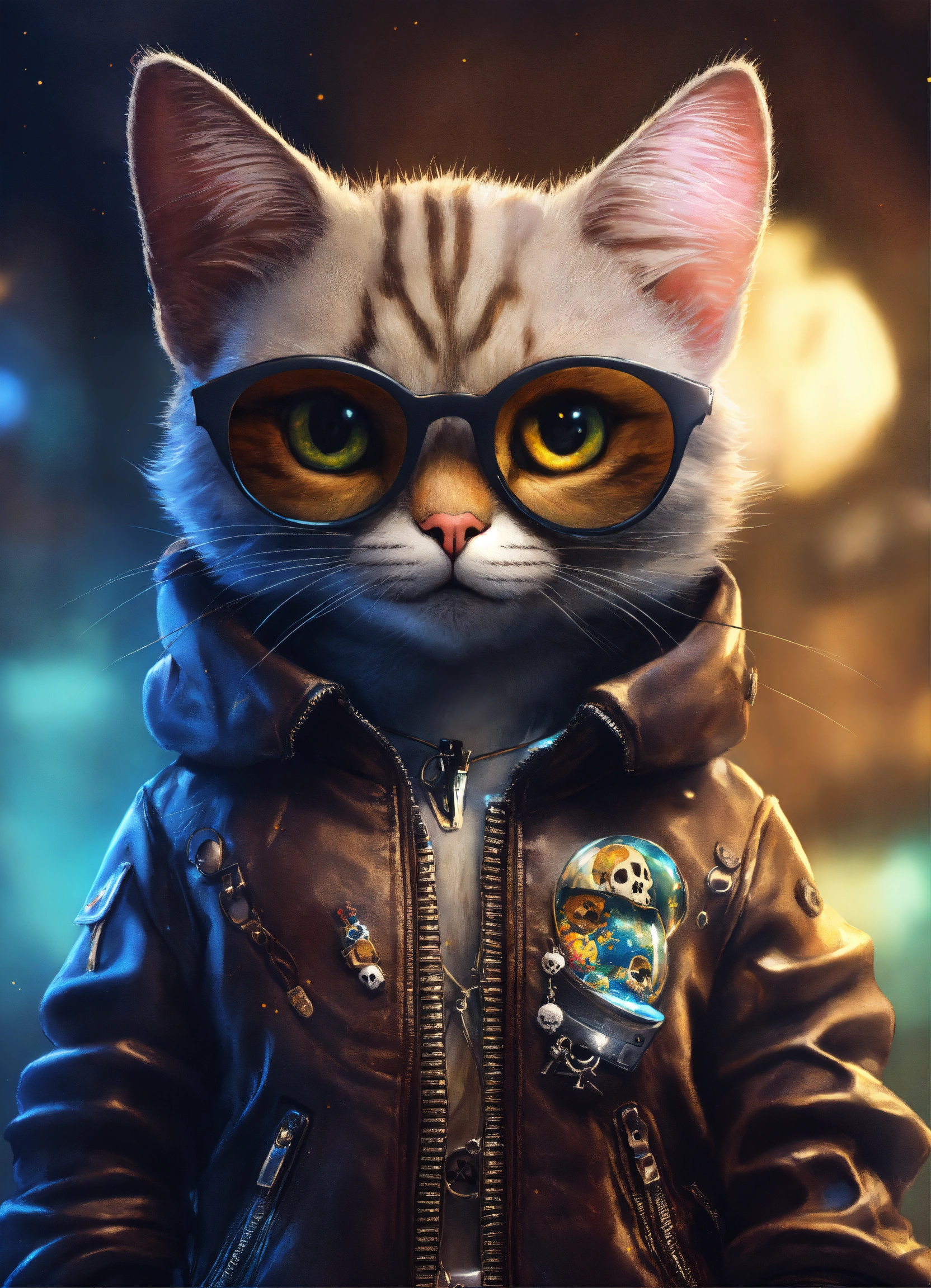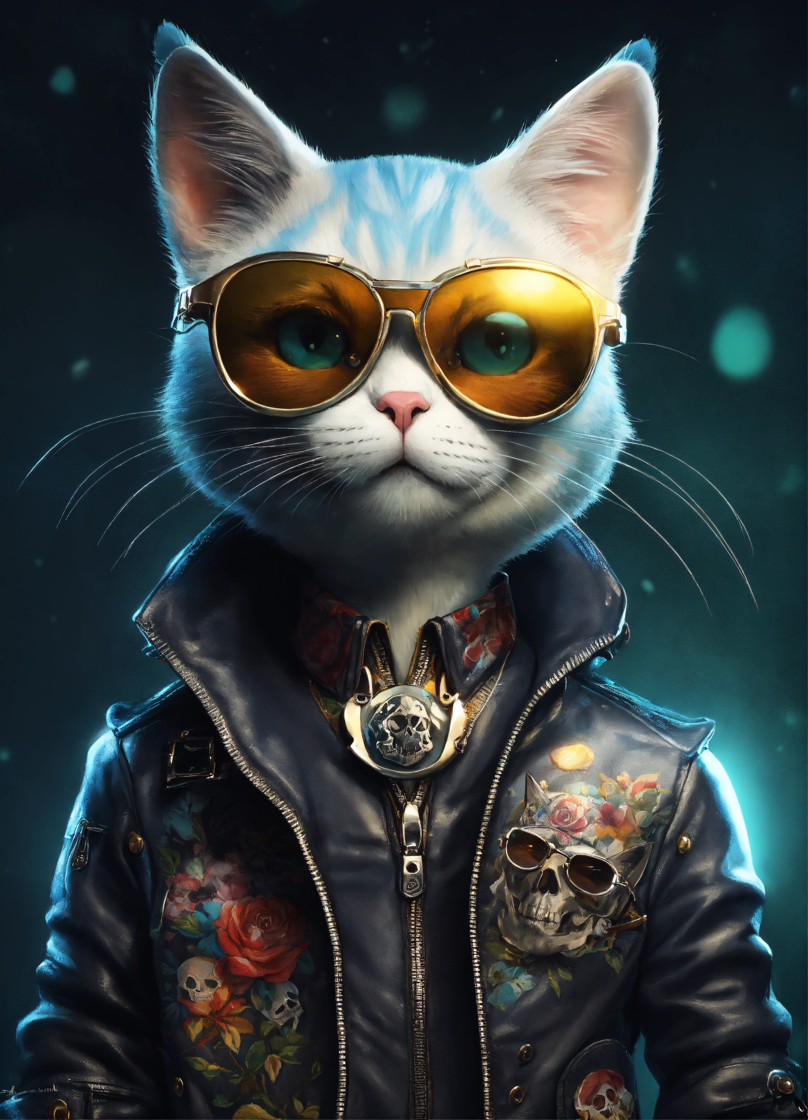Full-bodied portrait, cute and adorable cartoon cat wearing funny skull leather jacket and silver sunglasses, fantasy, dreamlike, surrealism, super cute, trending on artstation, high definition