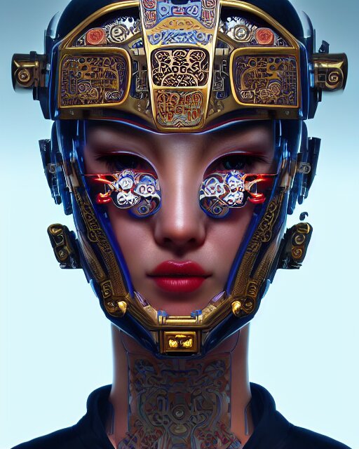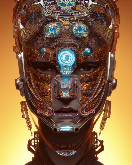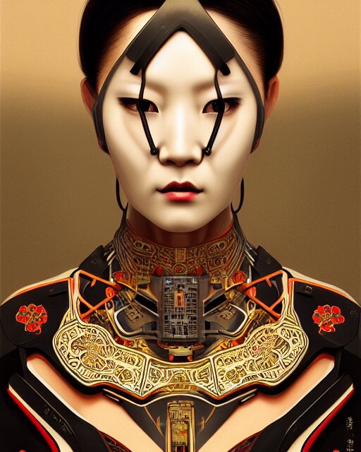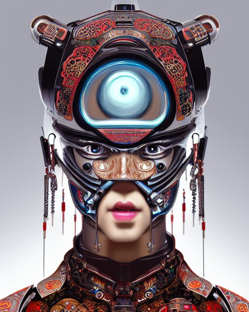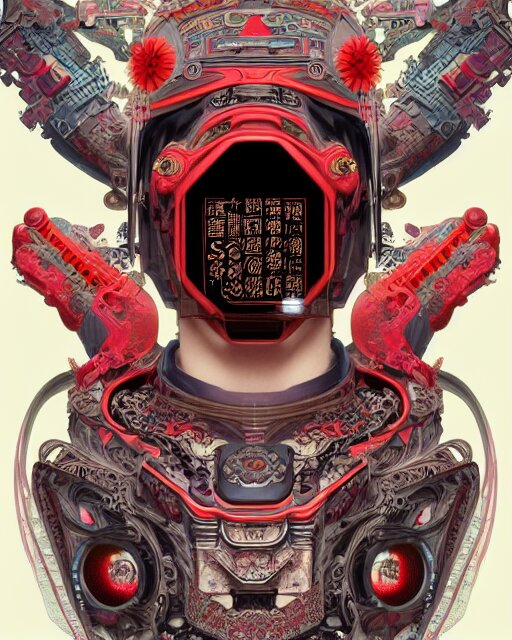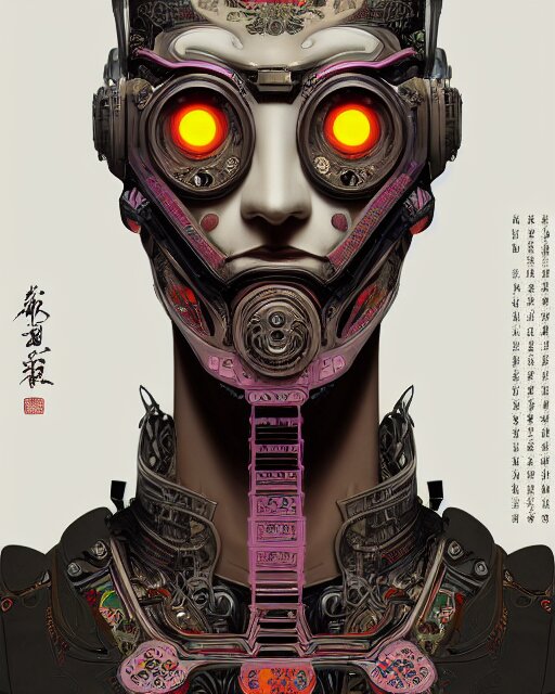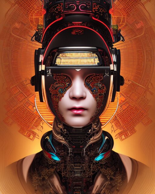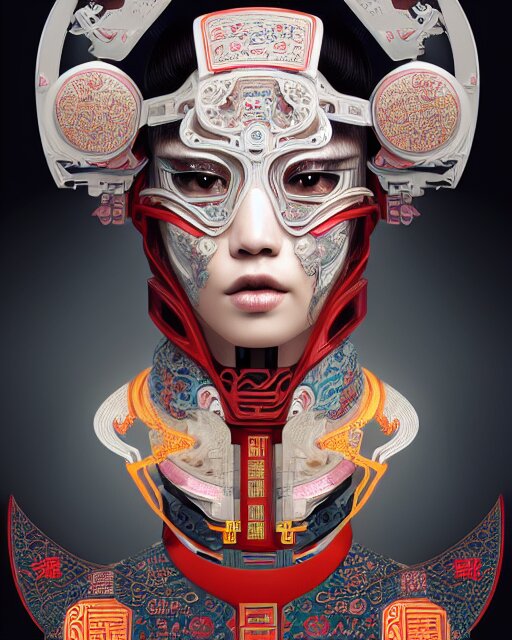 Portrait of a cyberpunk machine, machine face, upper half portrait, decorated with chinese opera motifs, asian, fine china, traditional chinese art, intricate, elegant, highly detailed, symmetry, headpiece, digital painting, artstation, concept art, smooth, sharp focus, illustration, art by artgerm and greg rutkowski and alphonse mucha, 8 k
