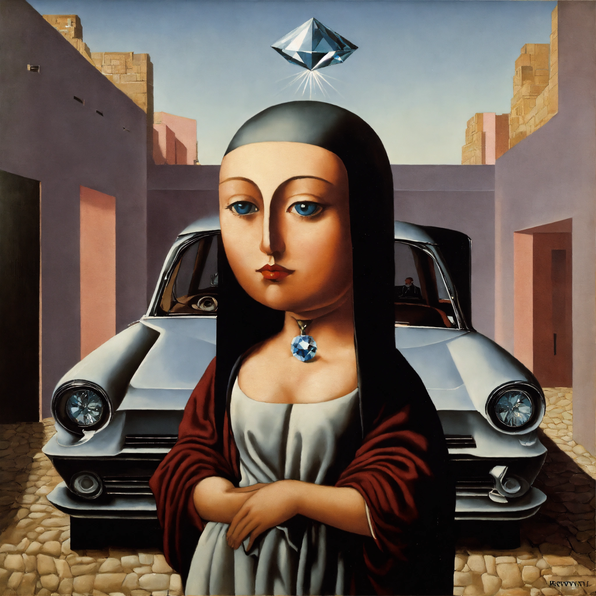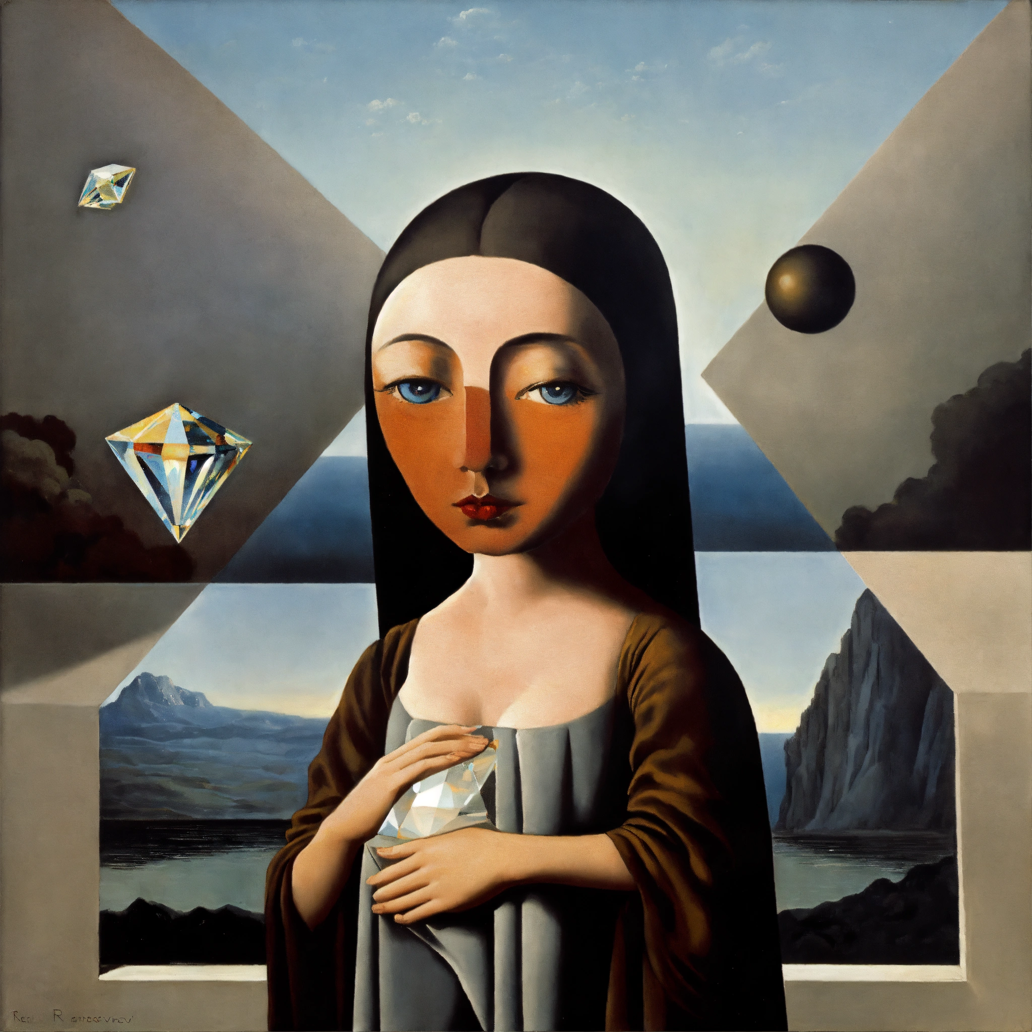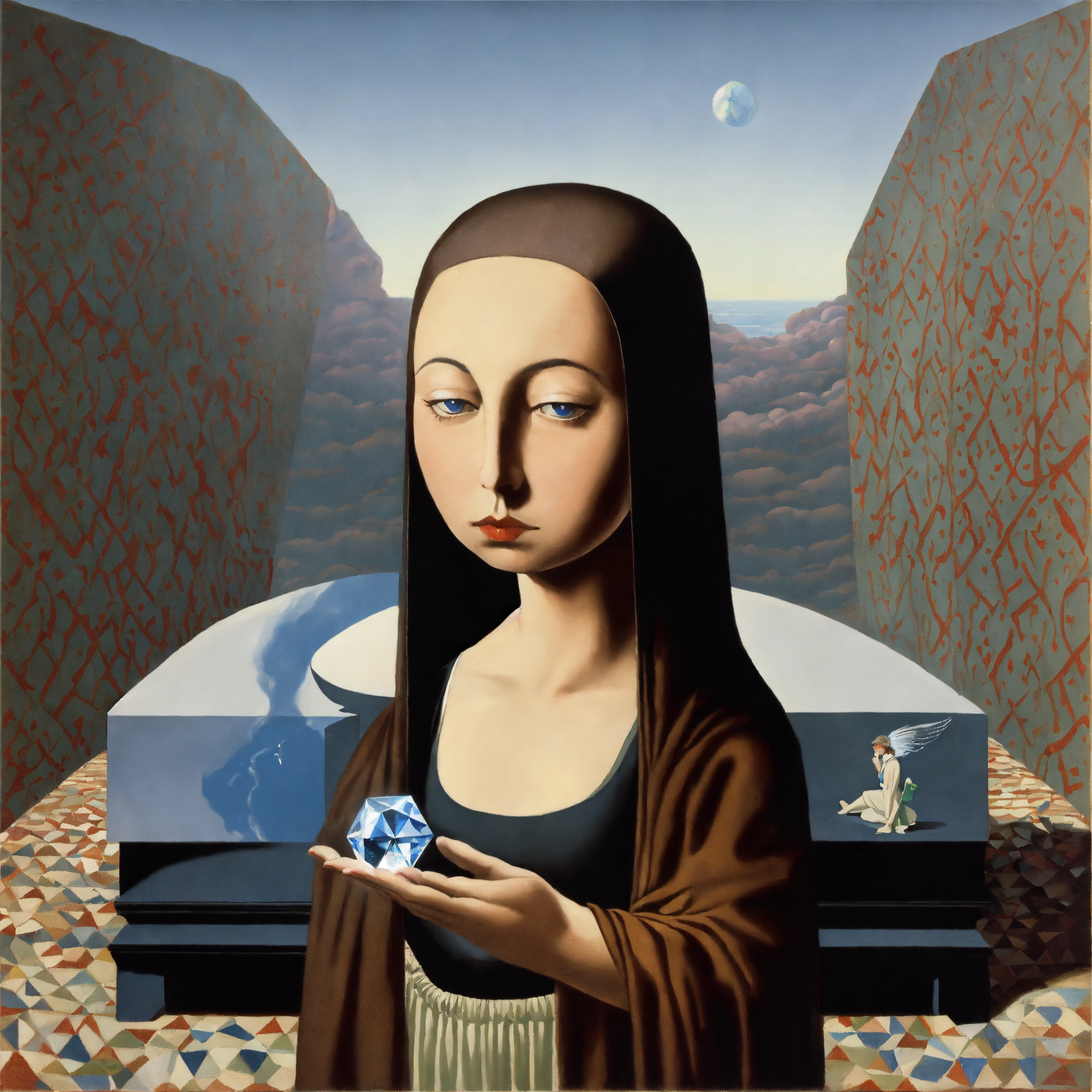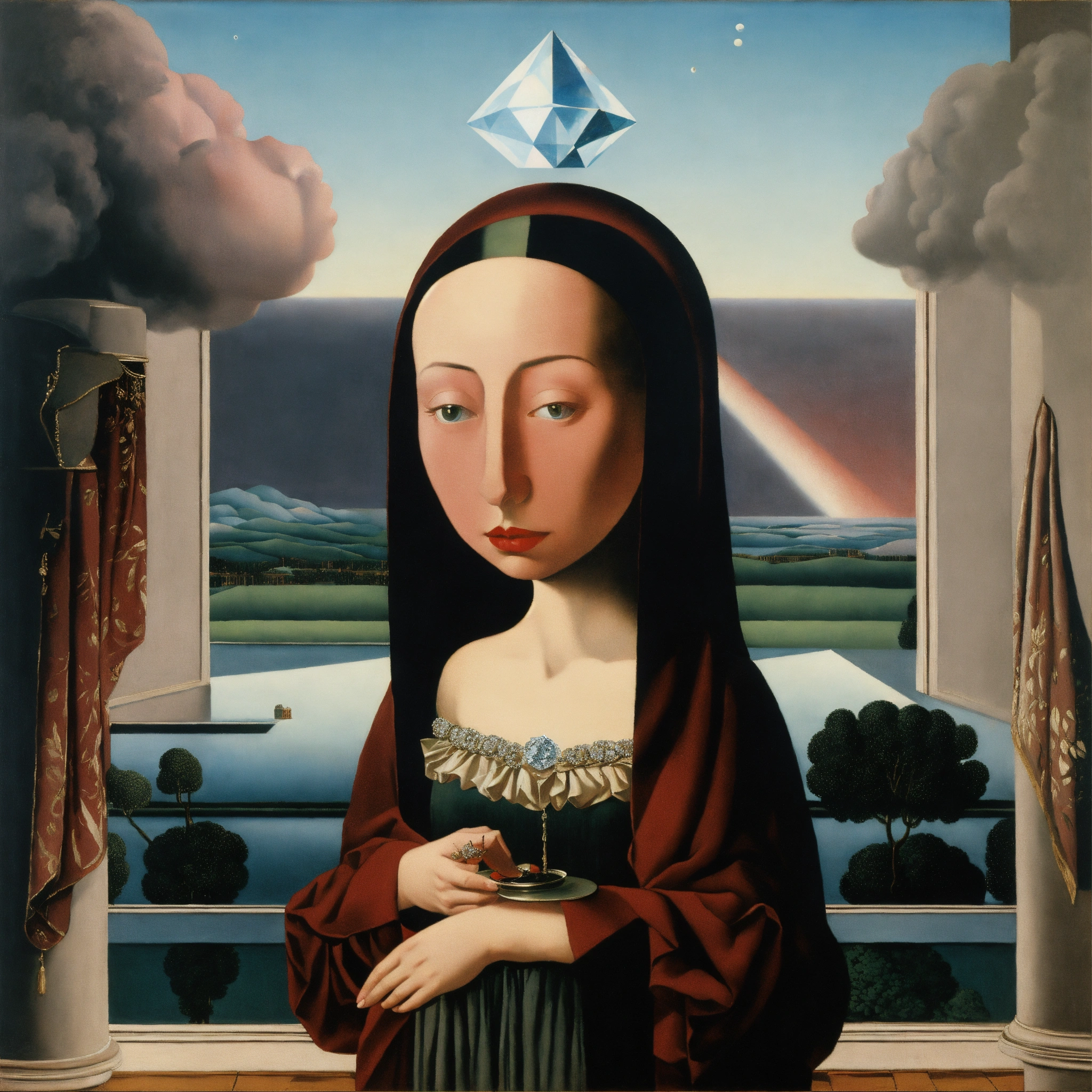 The venus offering a huge bright diamond to igor stravinsky, by rene magritte, a surrealistic setting