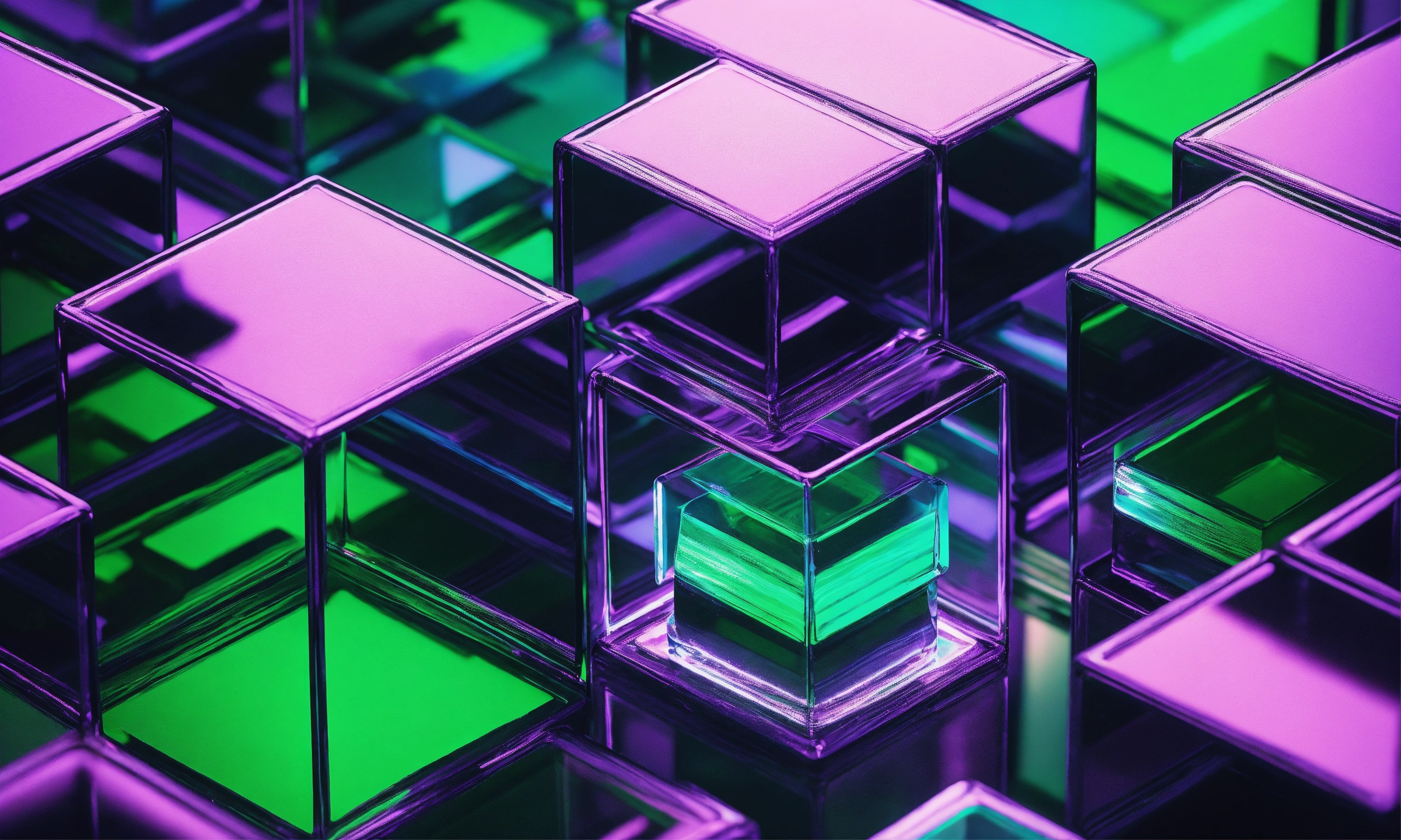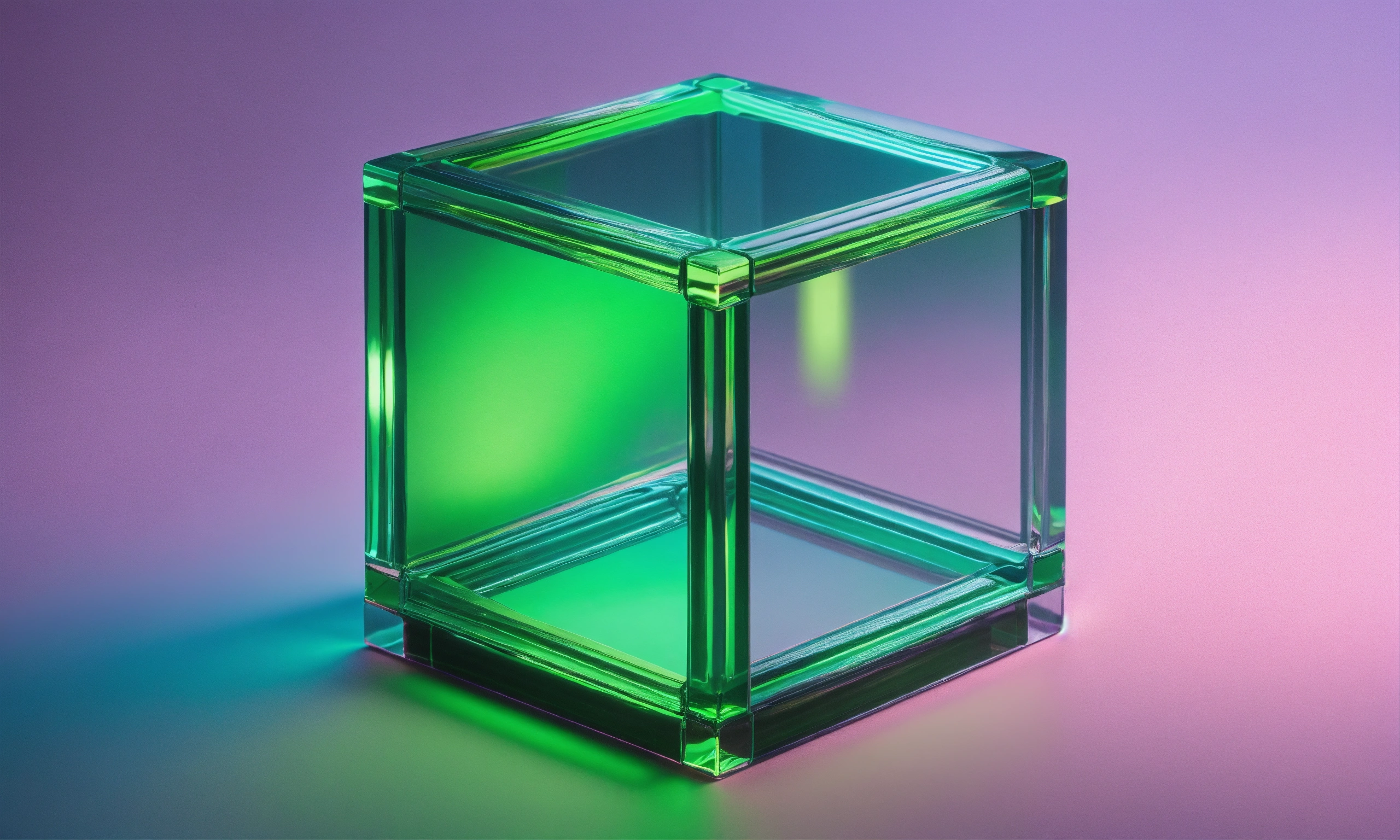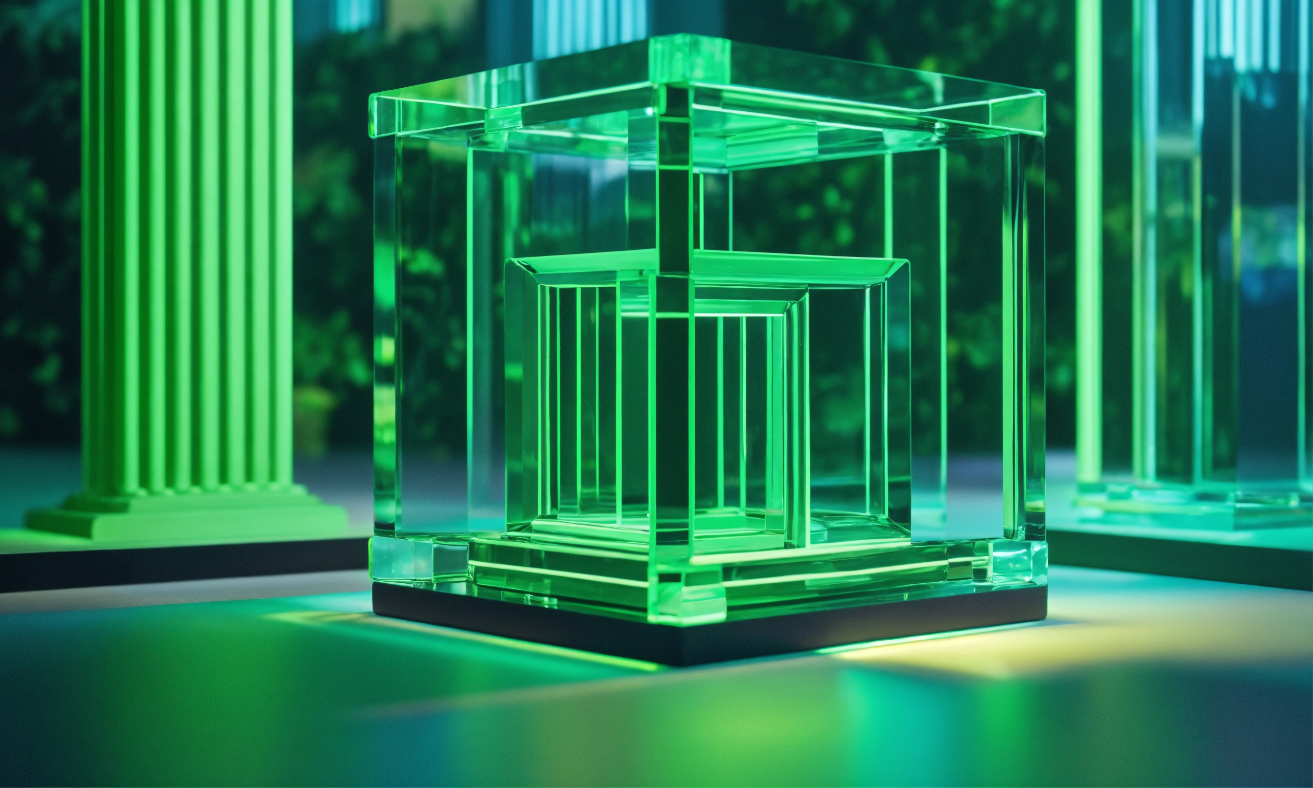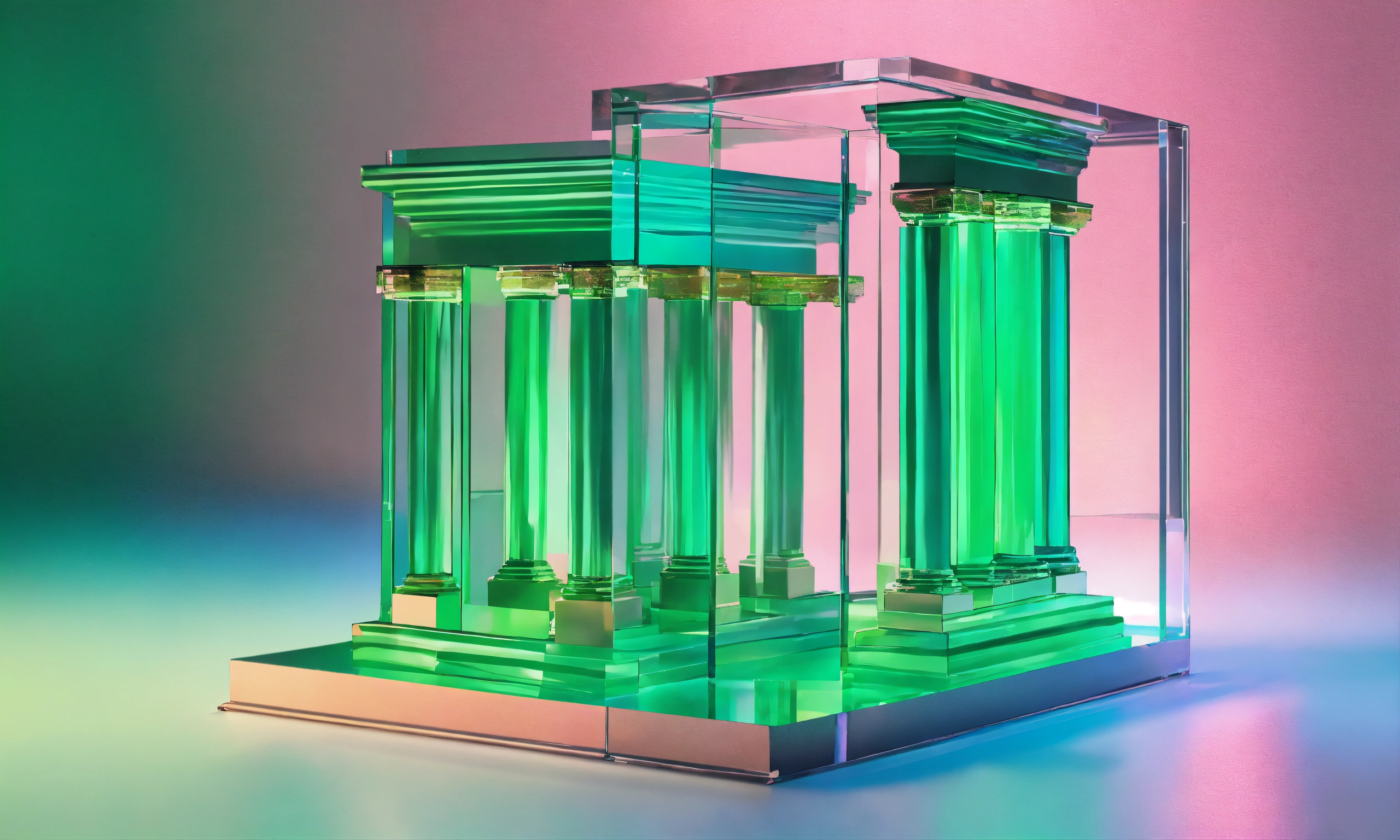 Isometric clear glass cube, stacked sophisticated green roman columns, studio photography, some neon green accent color, 4k, iridescent! muted color background! realistic!