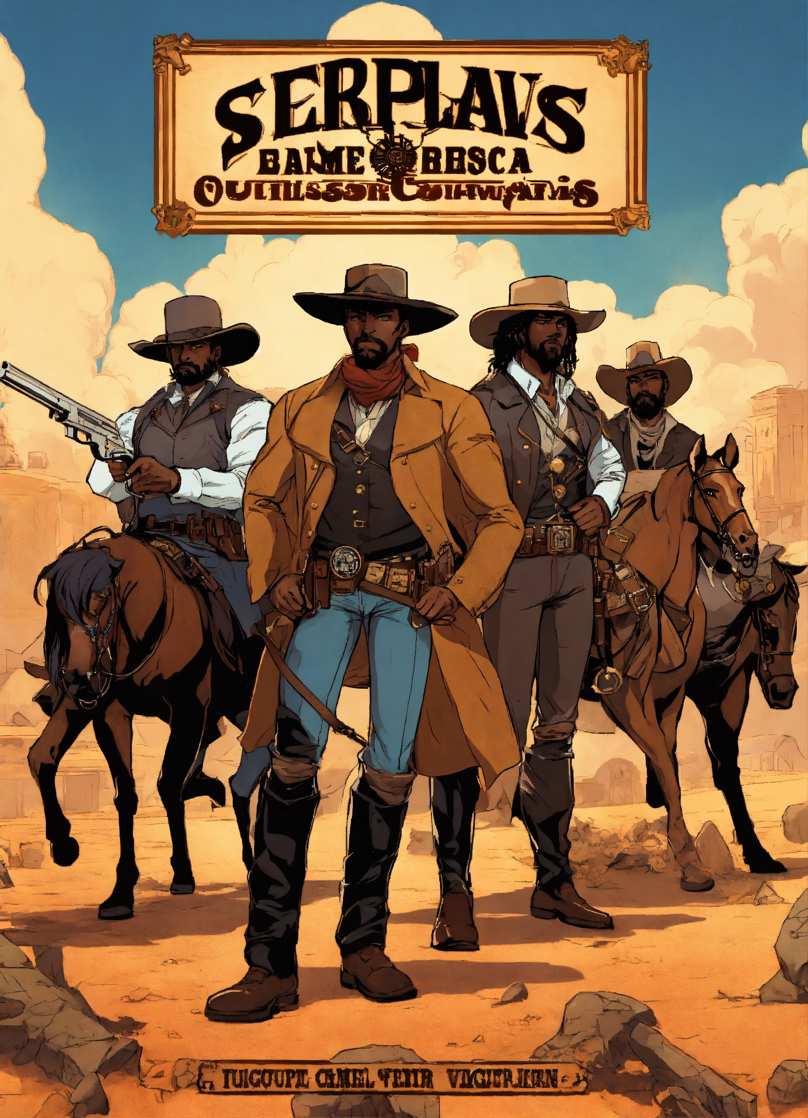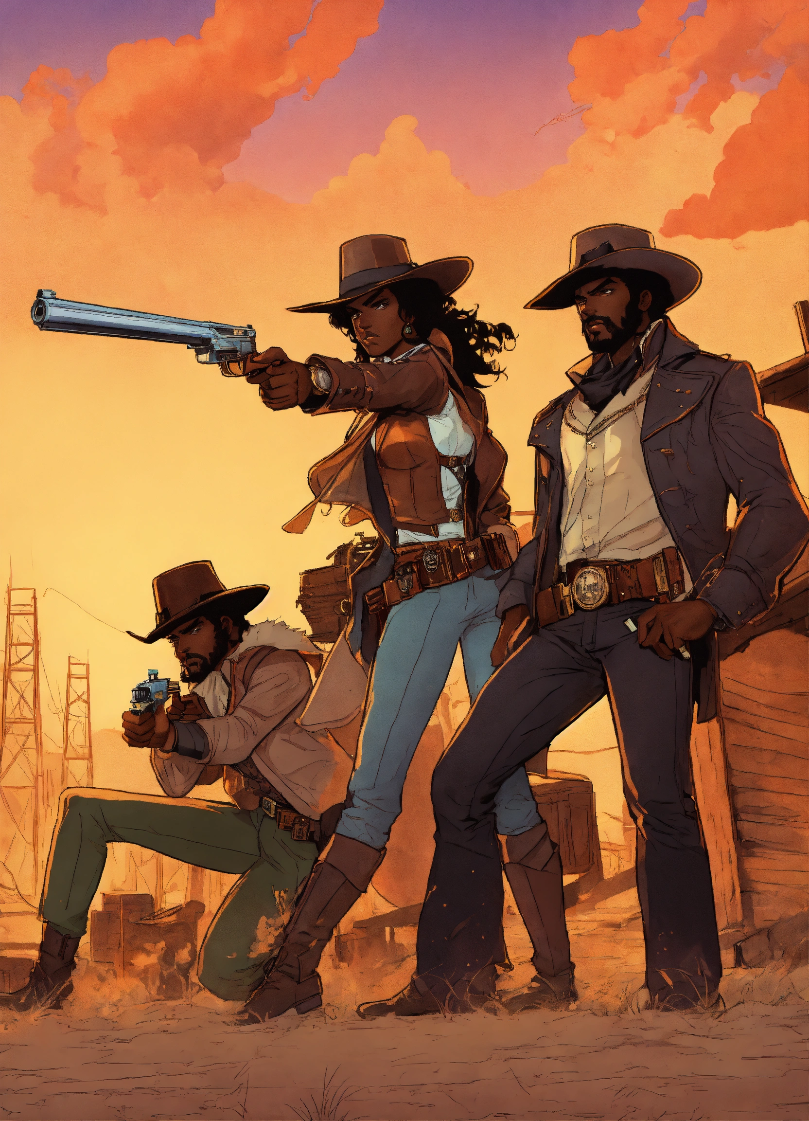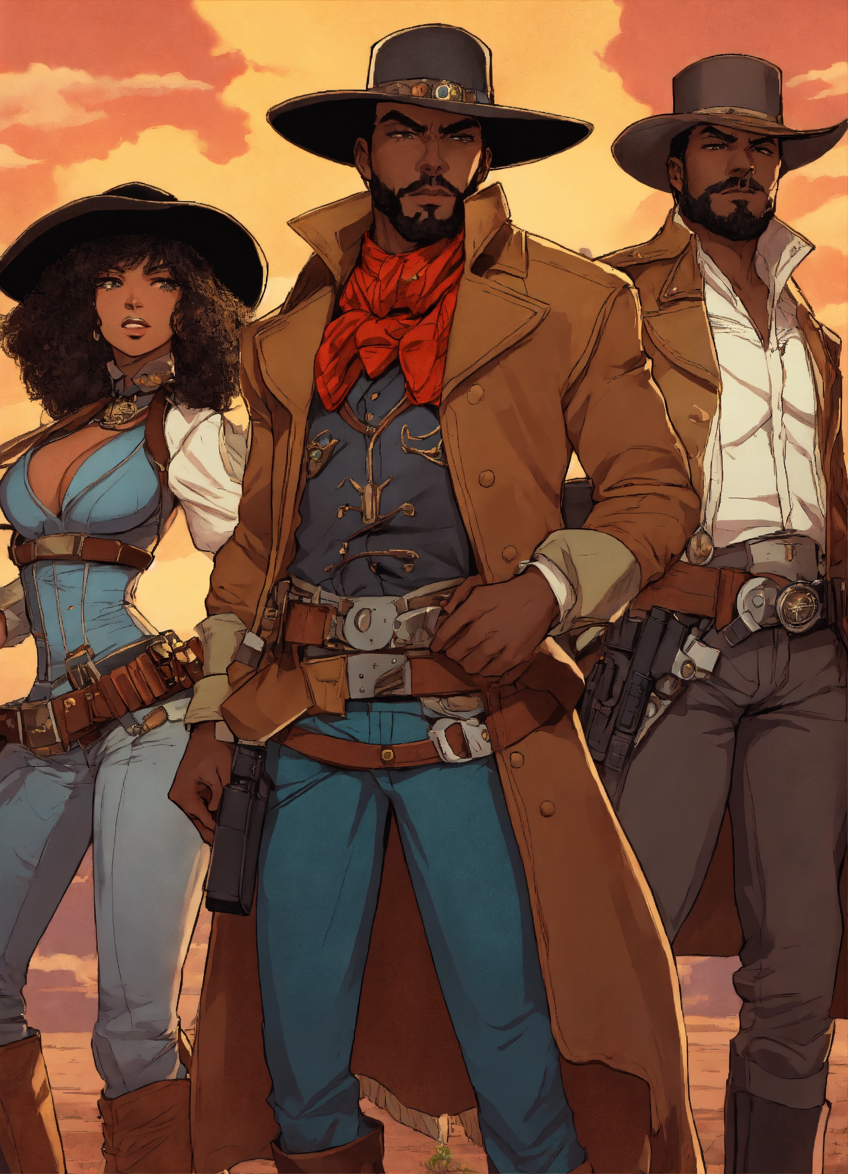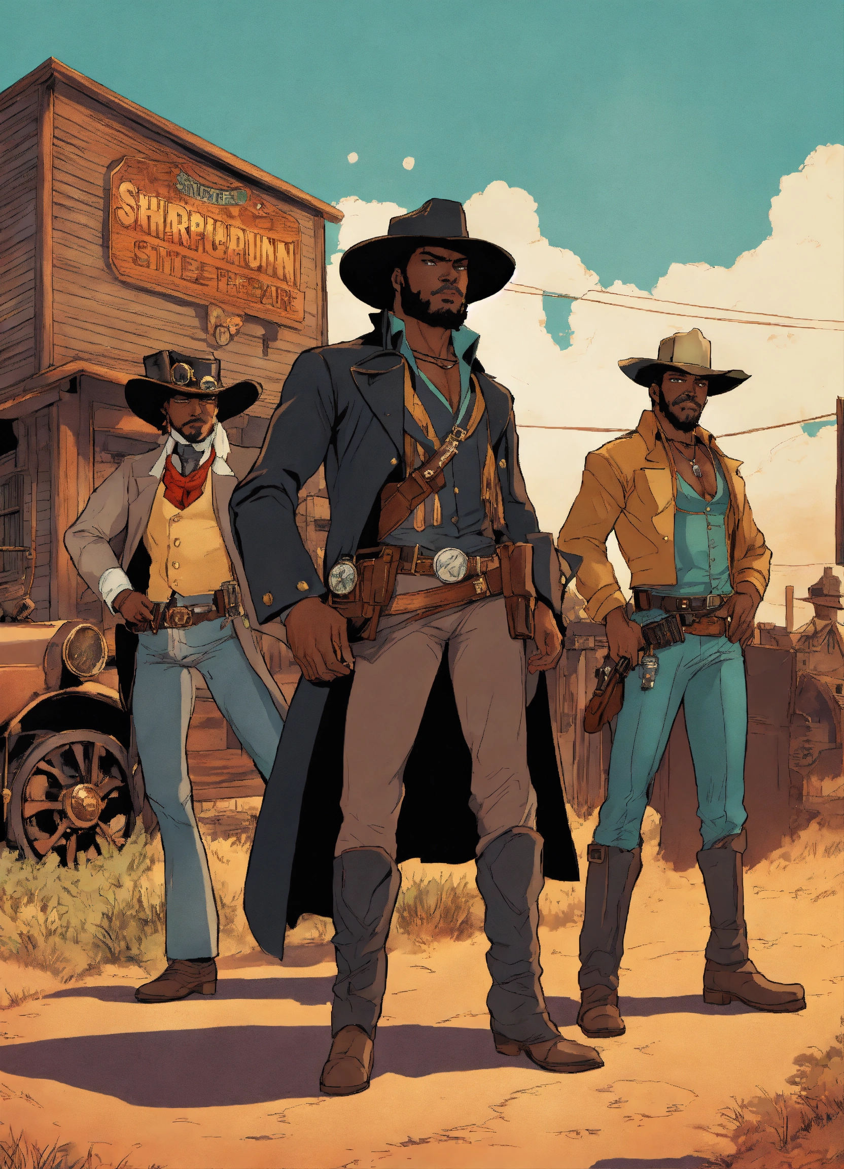 70s anime style black characters in a western setting shootout outlaws sheriffs and vigilantes as well as citizens in a steampunk era comic cover