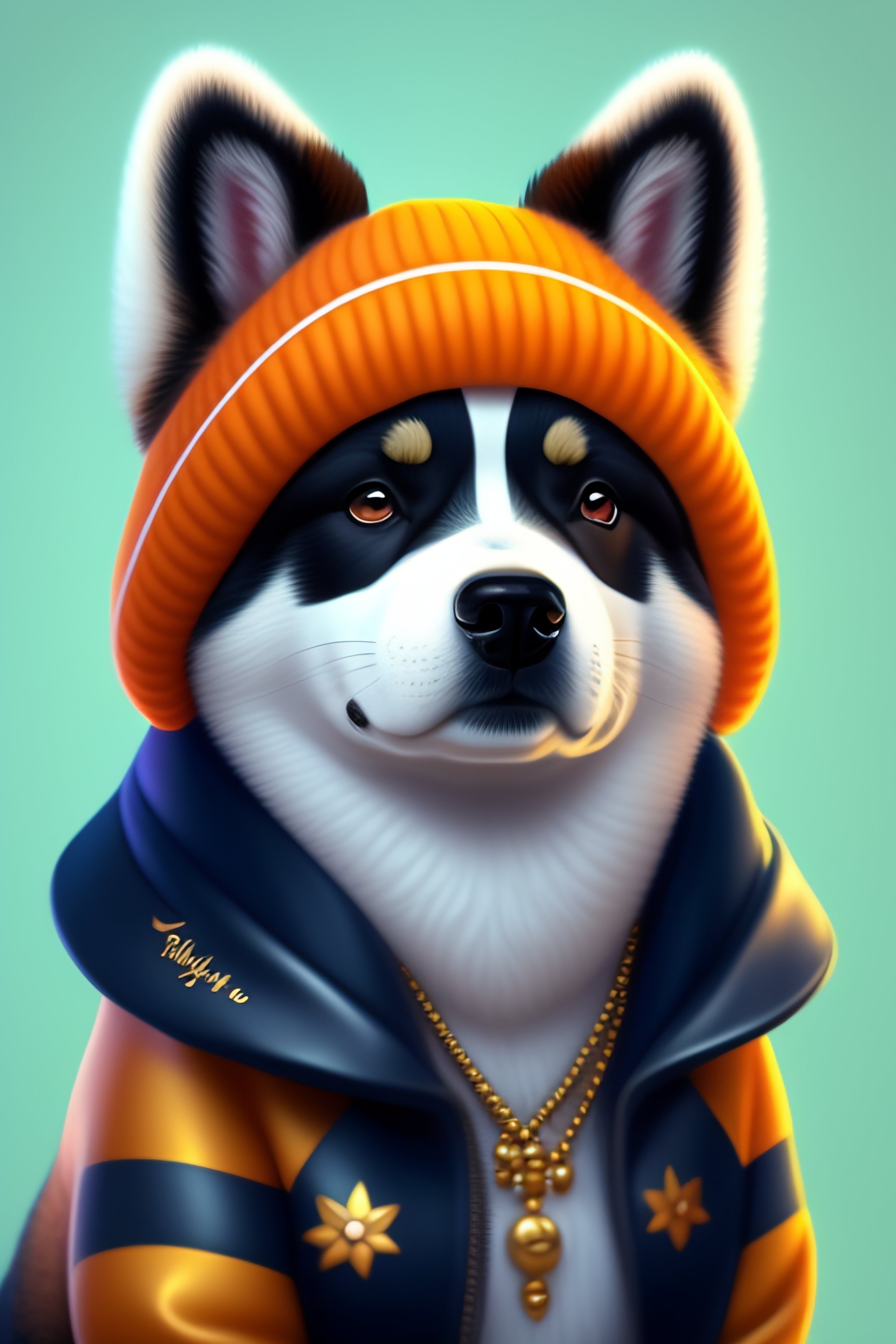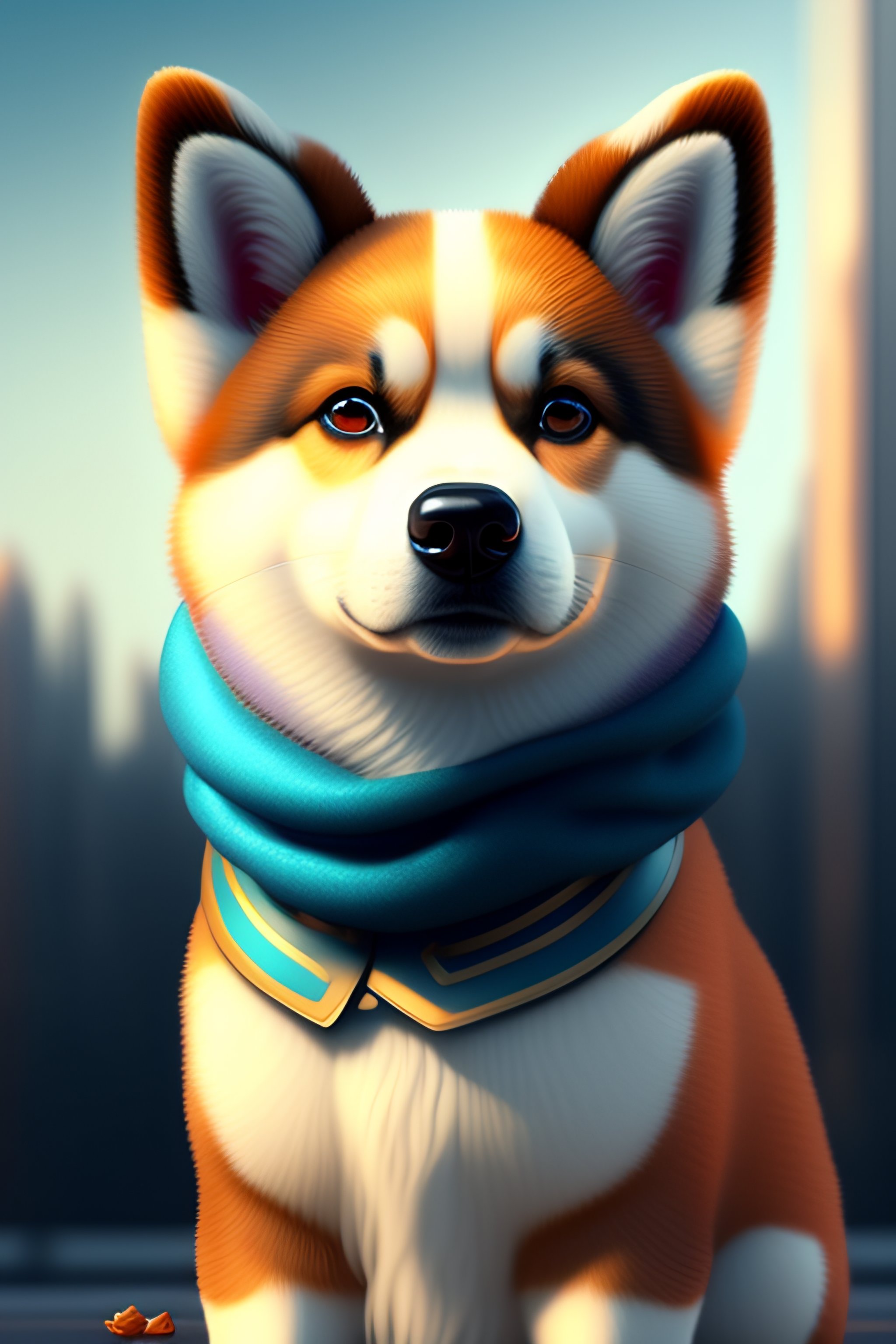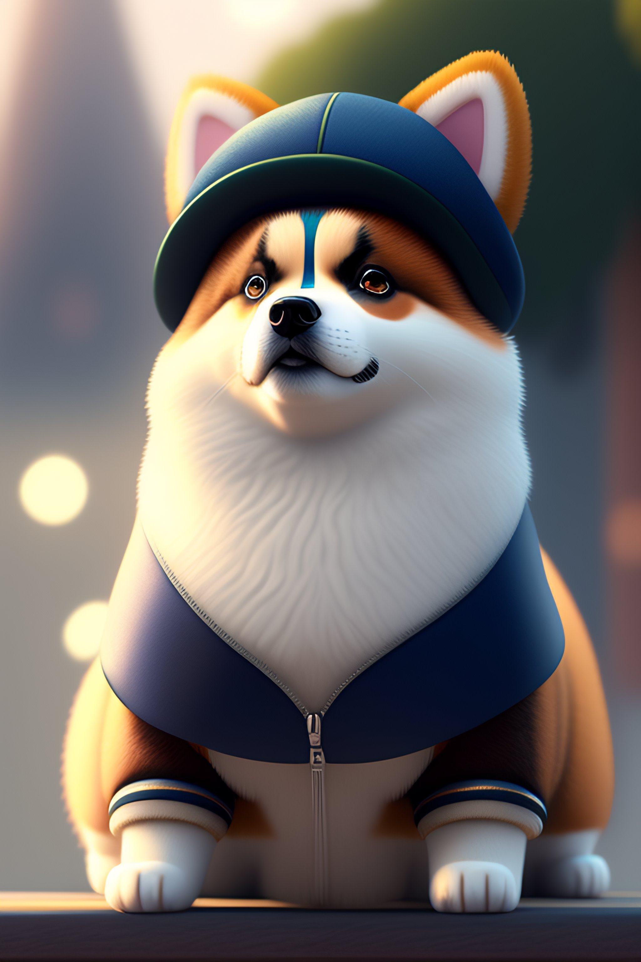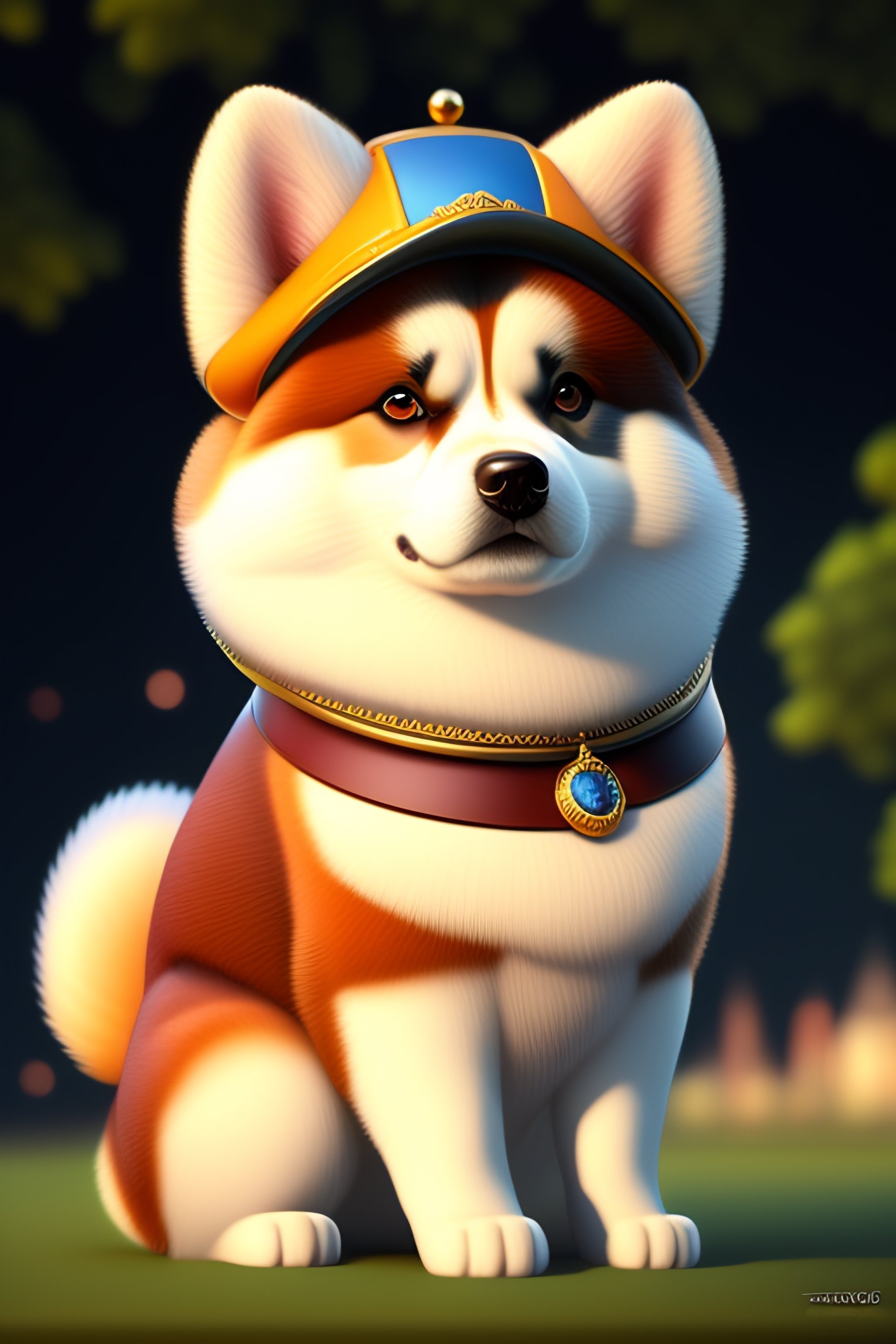 Cute and adorable cartoon fluffy akita inu with cap, fantasy, dreamlike, city scenario, surrealism, super cute, trending on artstation