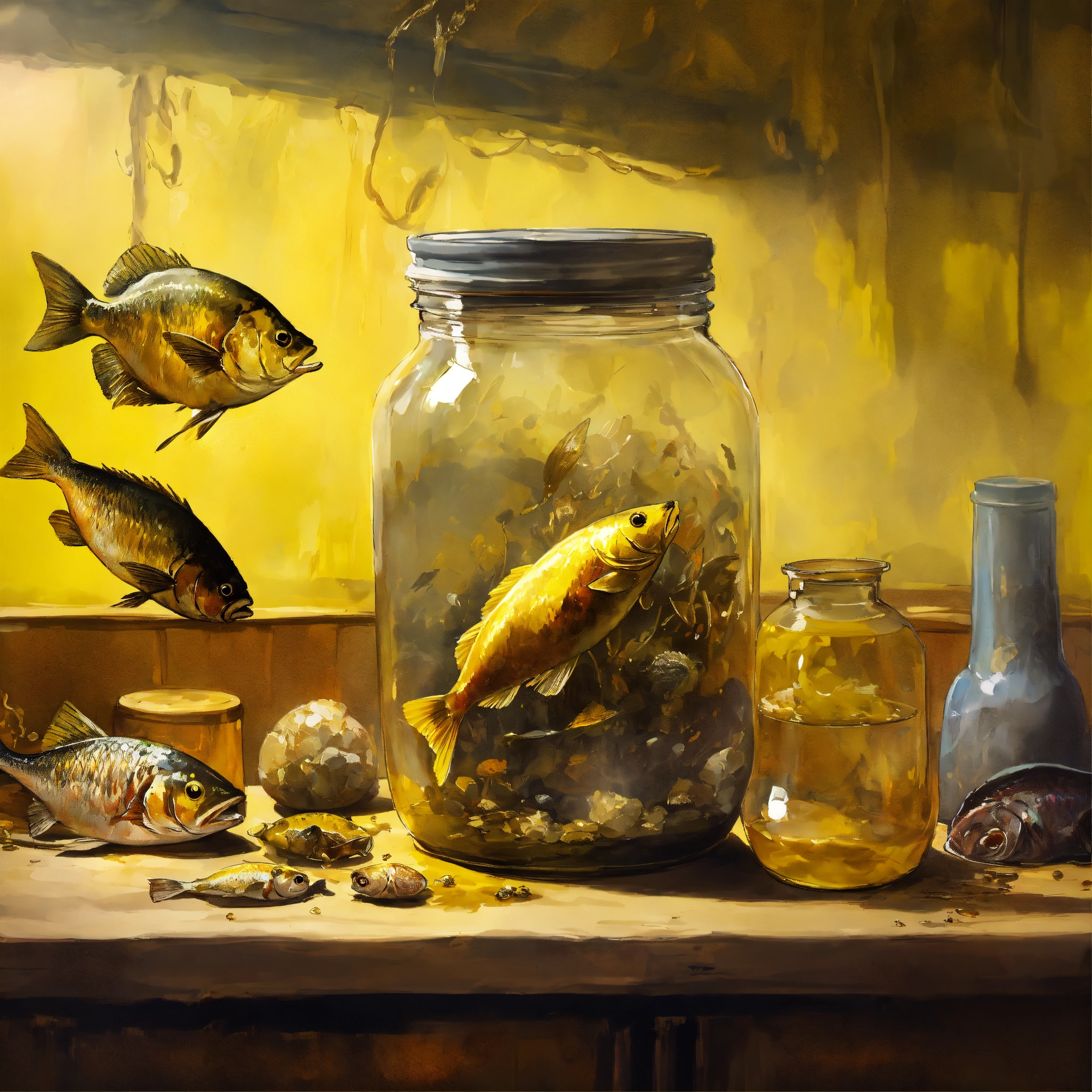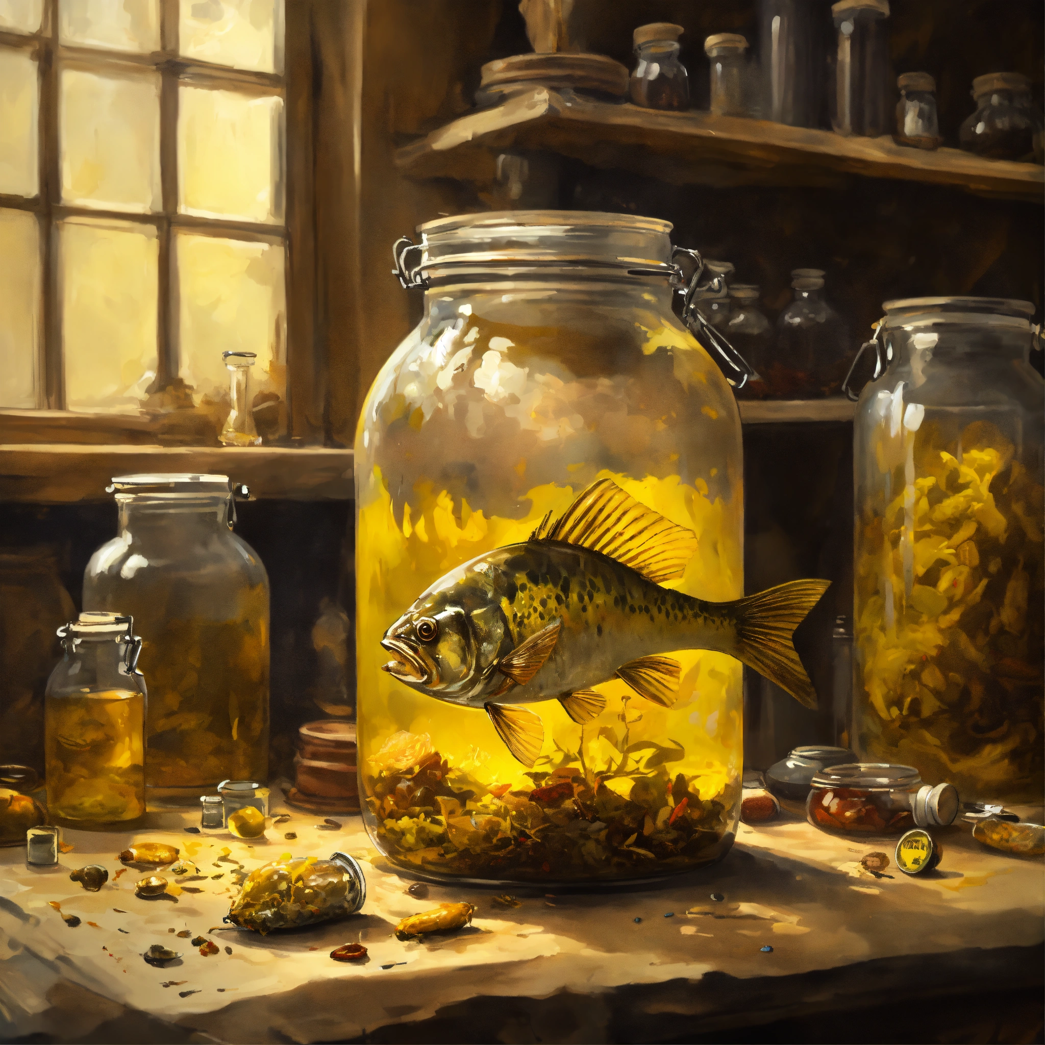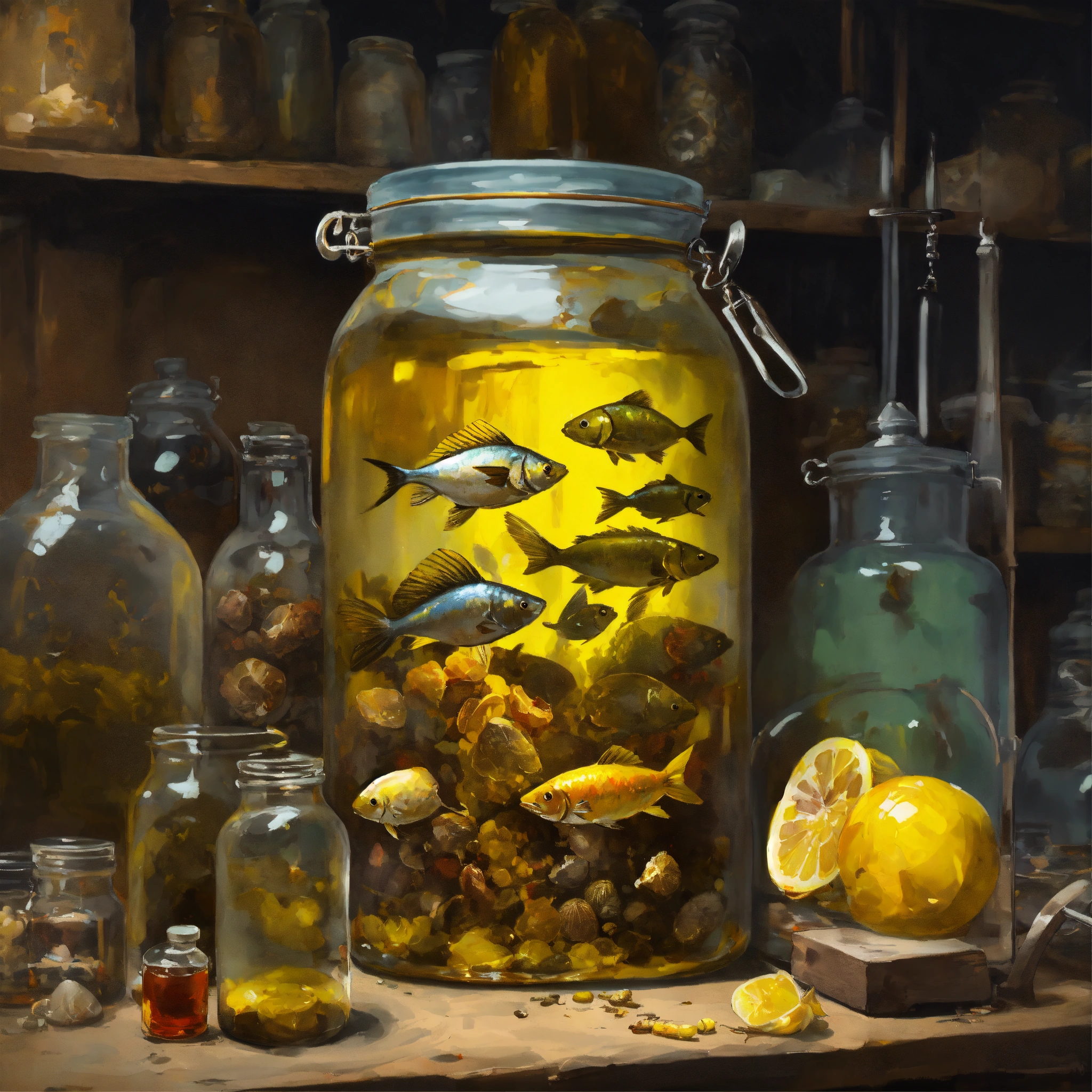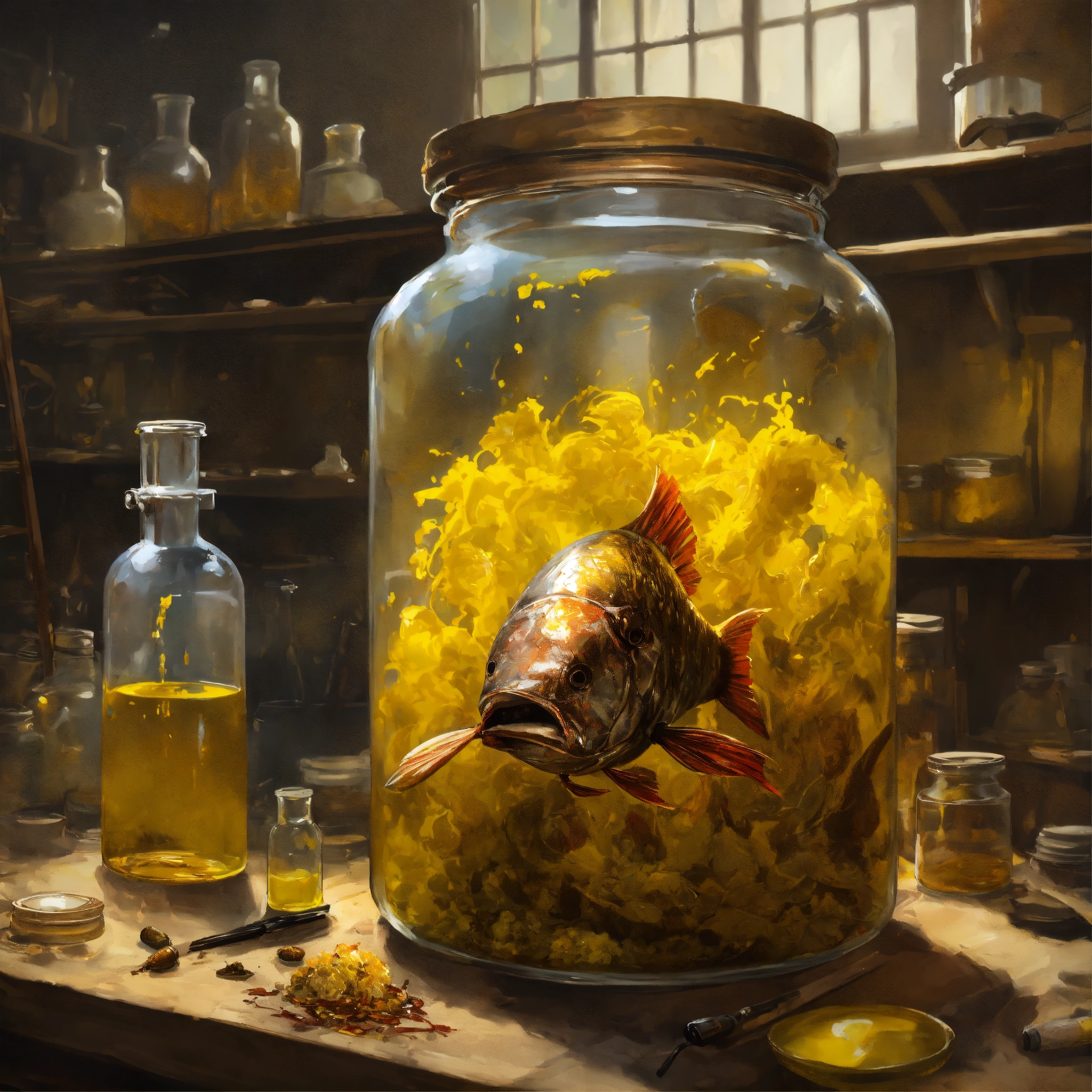 Concept art of a vintage corked big jar of dirty yellow oil, inside a laboratory full of jared preserved fish heads and guts and taxidermy, highly detailed, oil painting style, brush strokes, 8k
