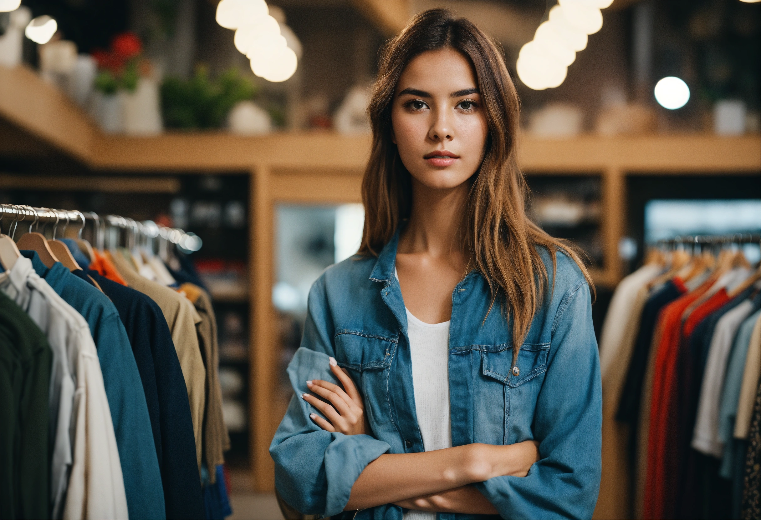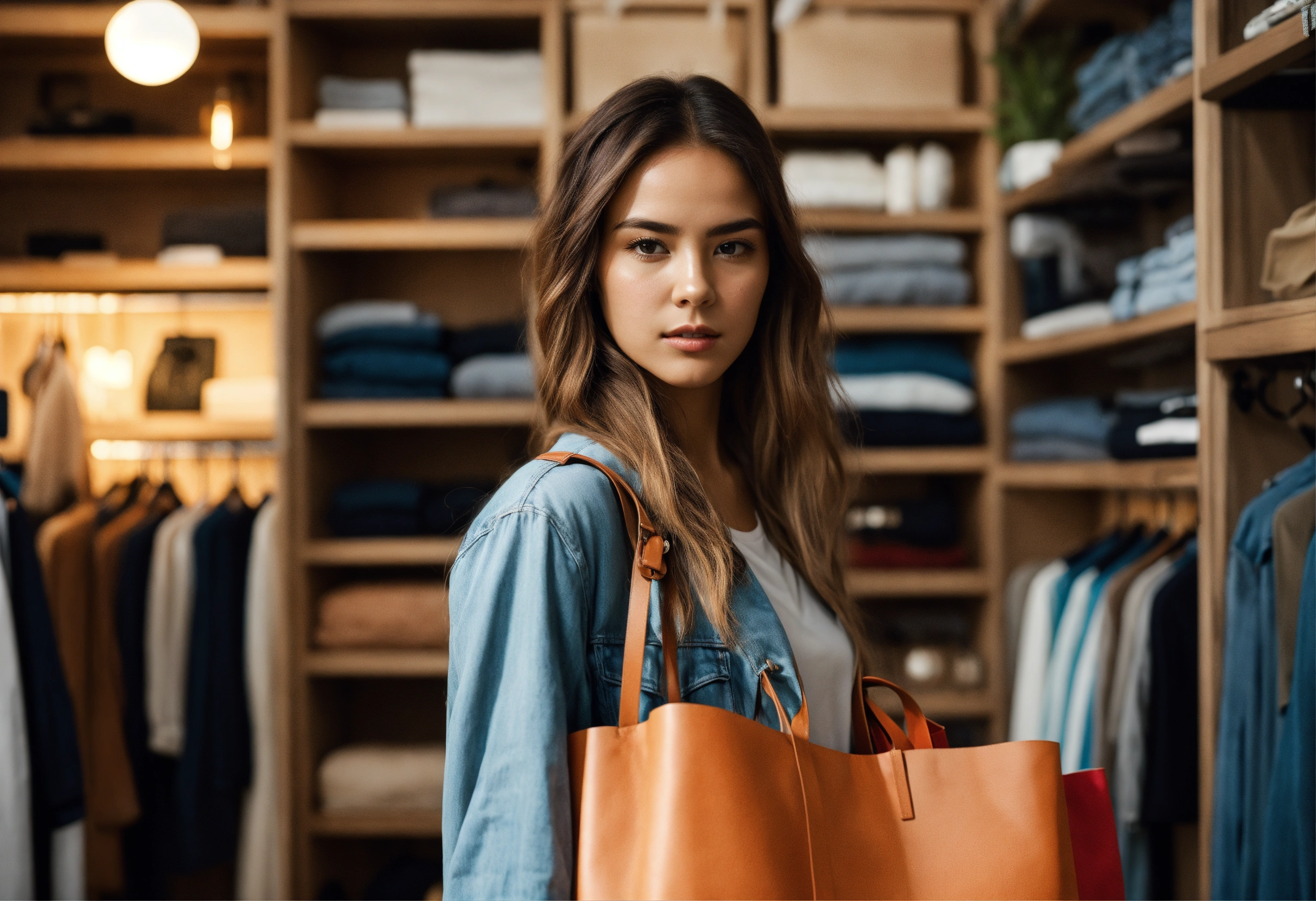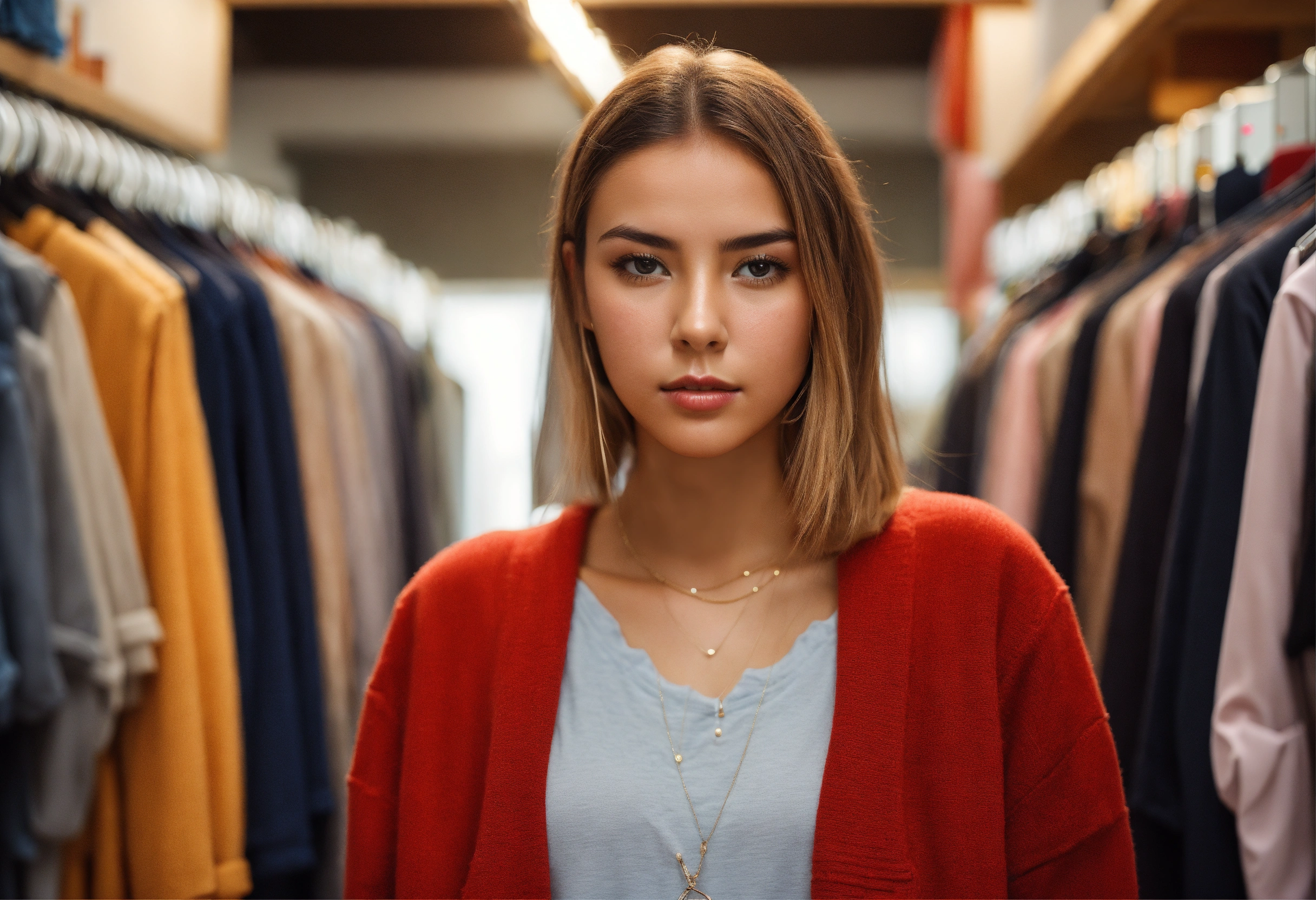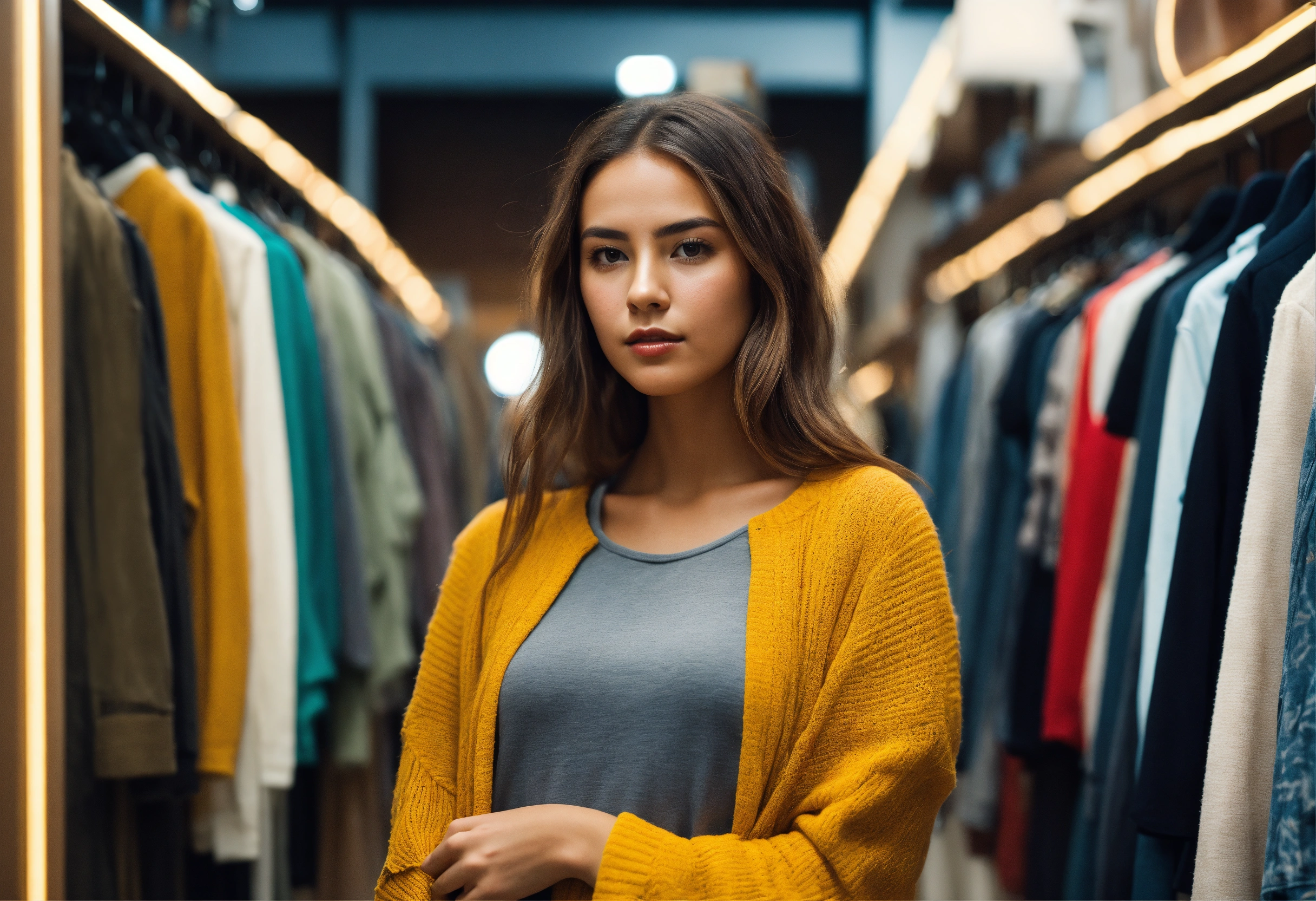 Close up young trendy woman shopping in a full room, open wardrobe, electronics, home goods, looks into the camera