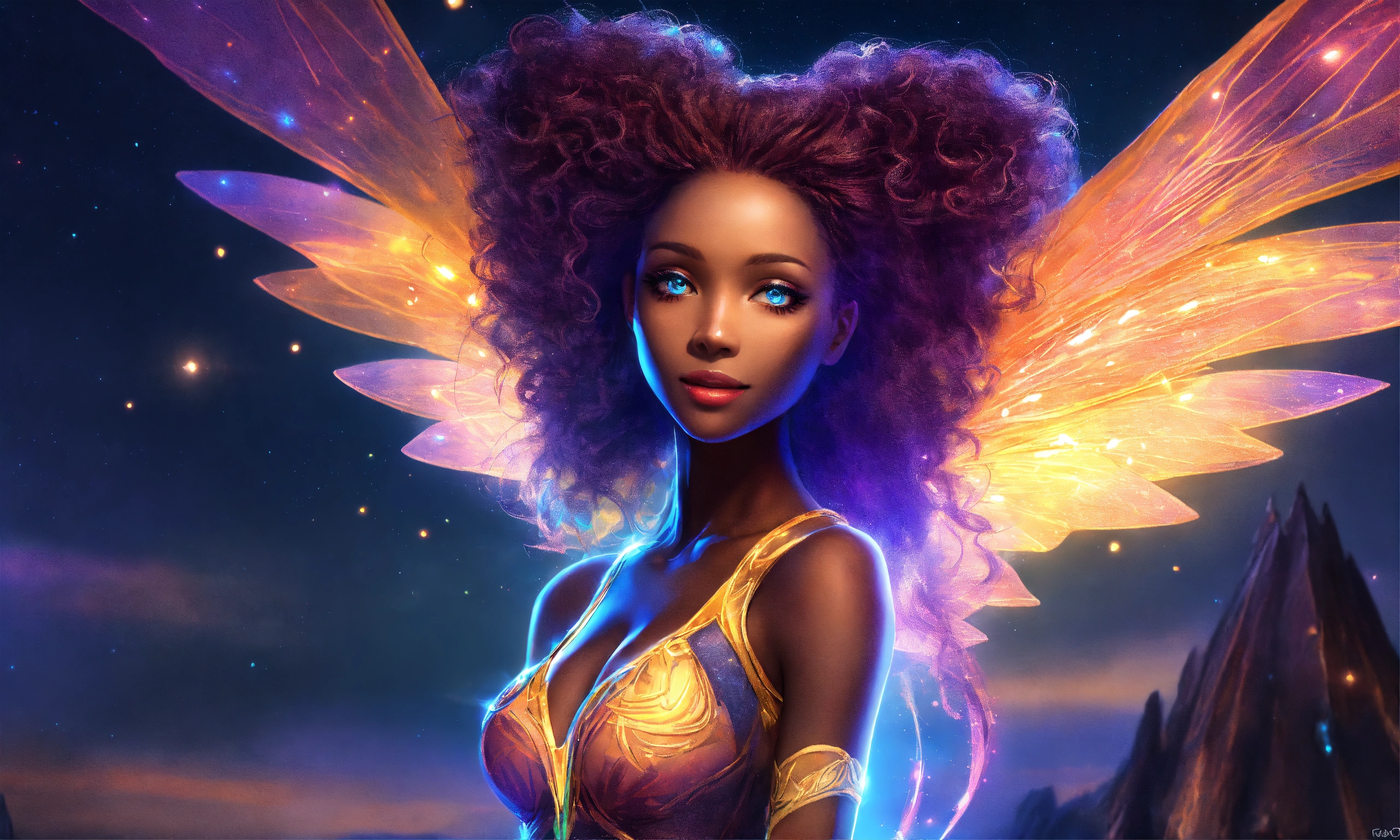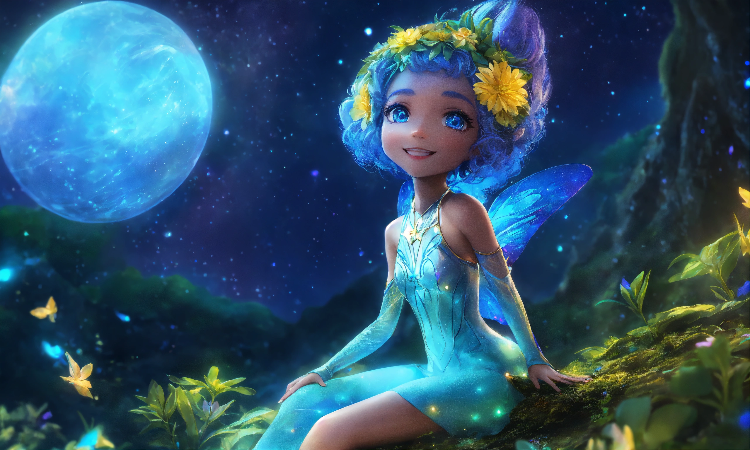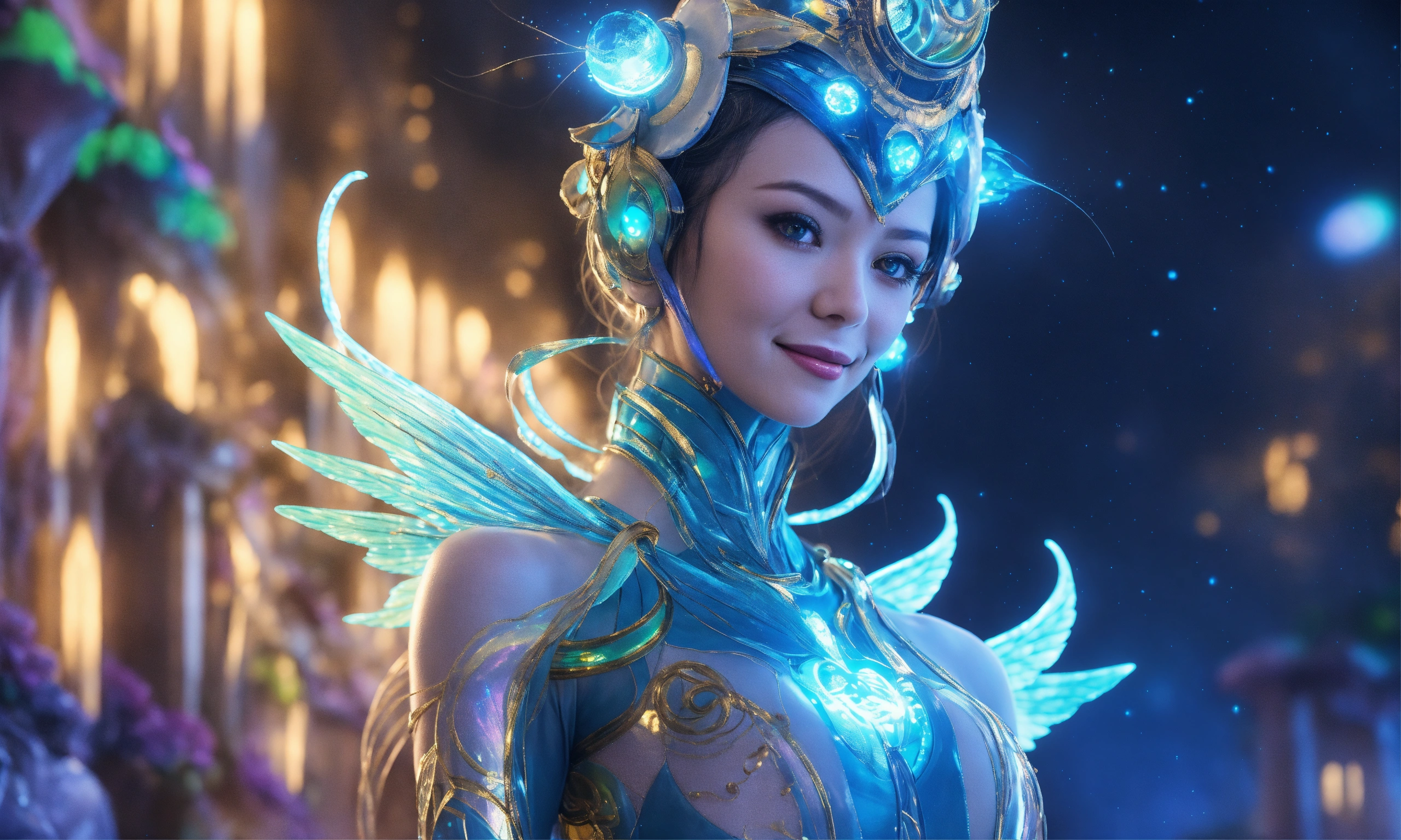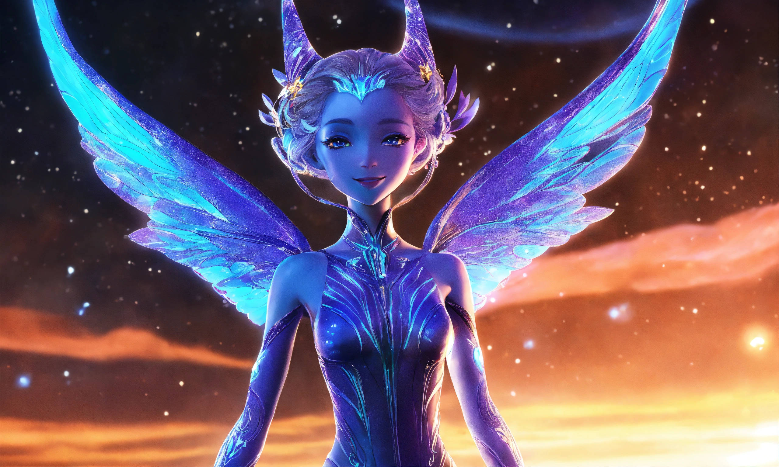 Stellar is a beautiful full body goddess smiling alien with a luminous, ethereal appearance. her skin is a soft, iridescent blue, and she has large, expressive eyes that shimmer like stars. her hair is made up of tiny, glowing filaments that change color based on her emotions and surroundings. she has delicate, bioluminescent wings that allow her to glide gracefully through the air.