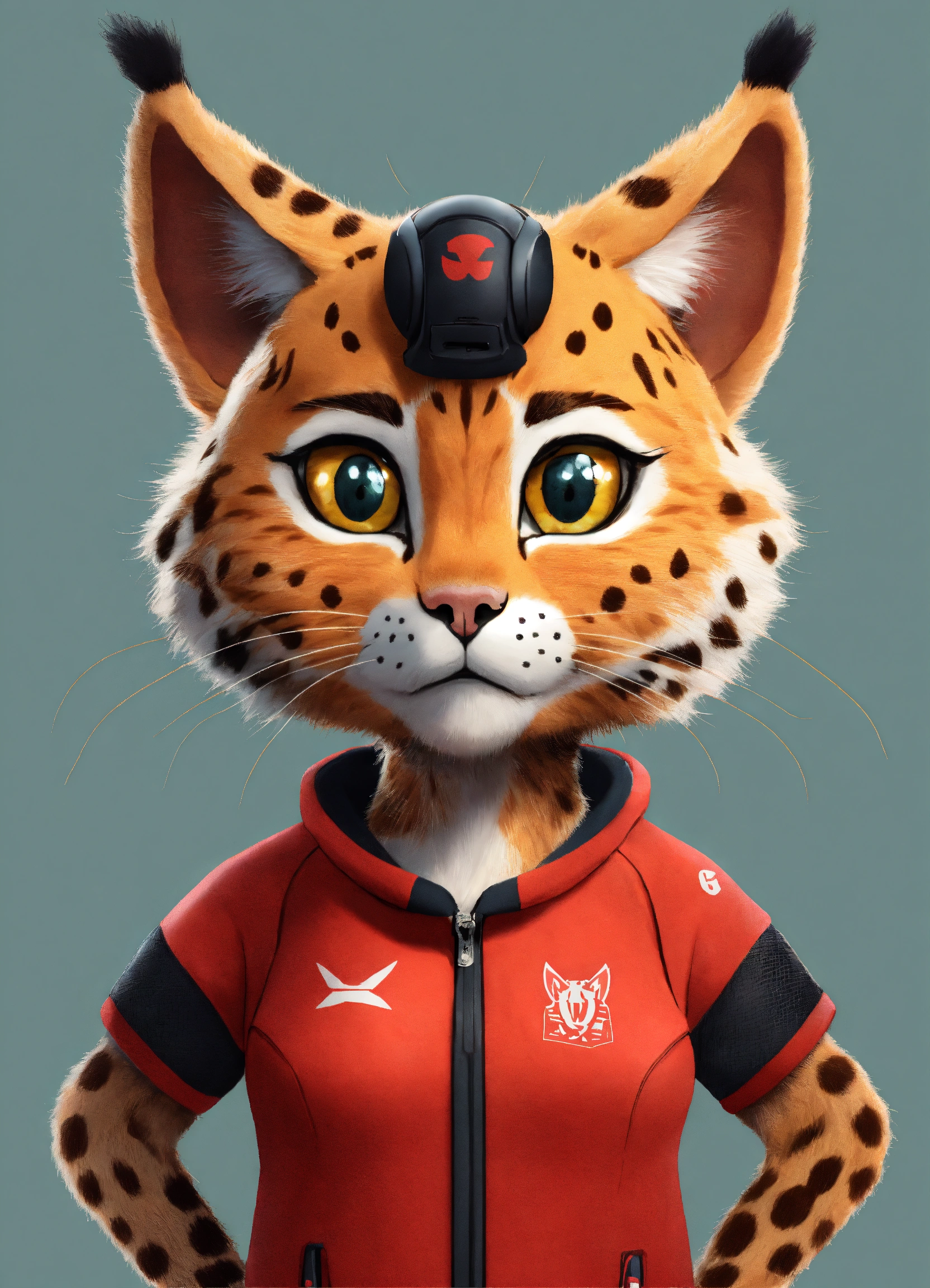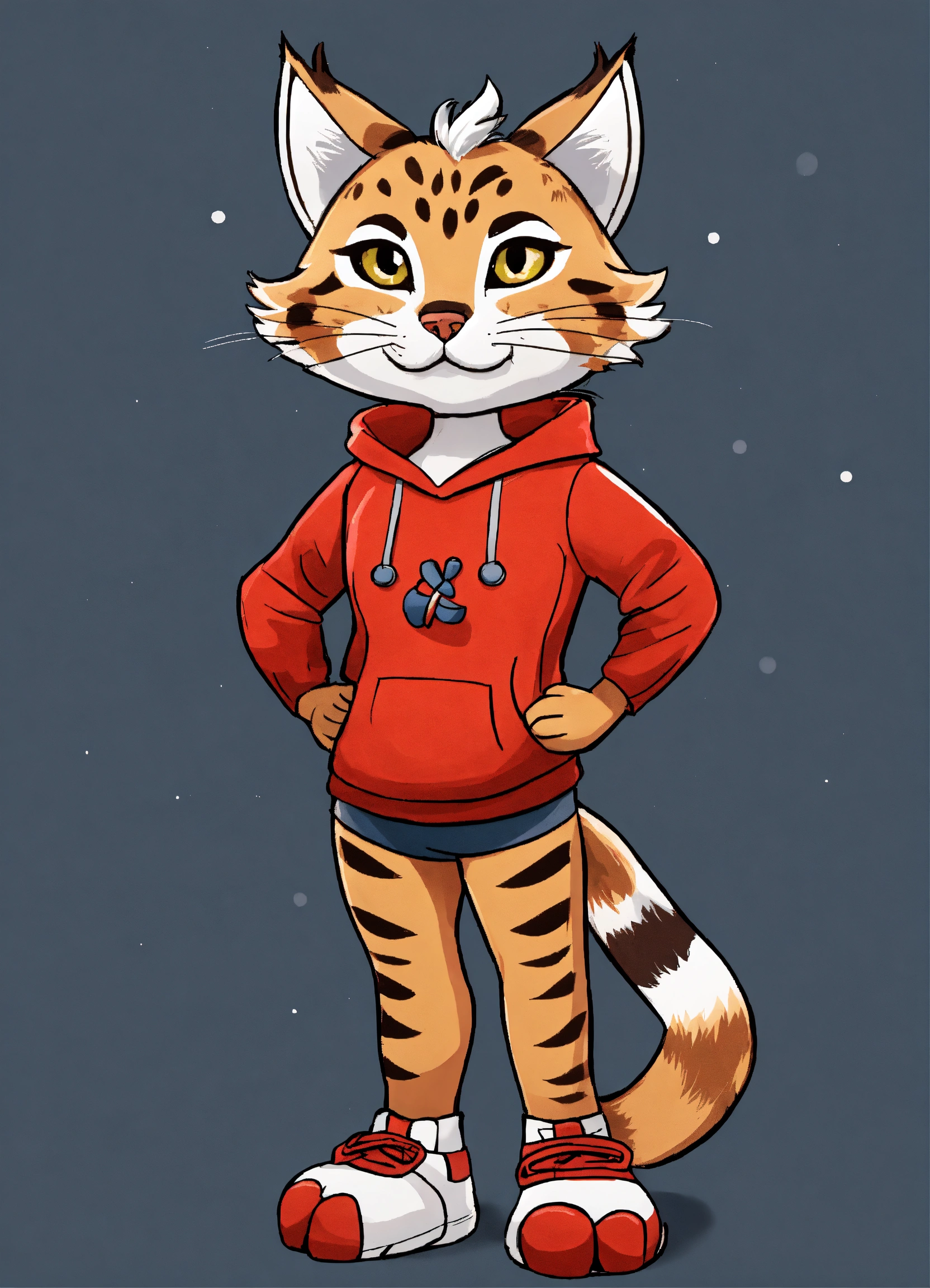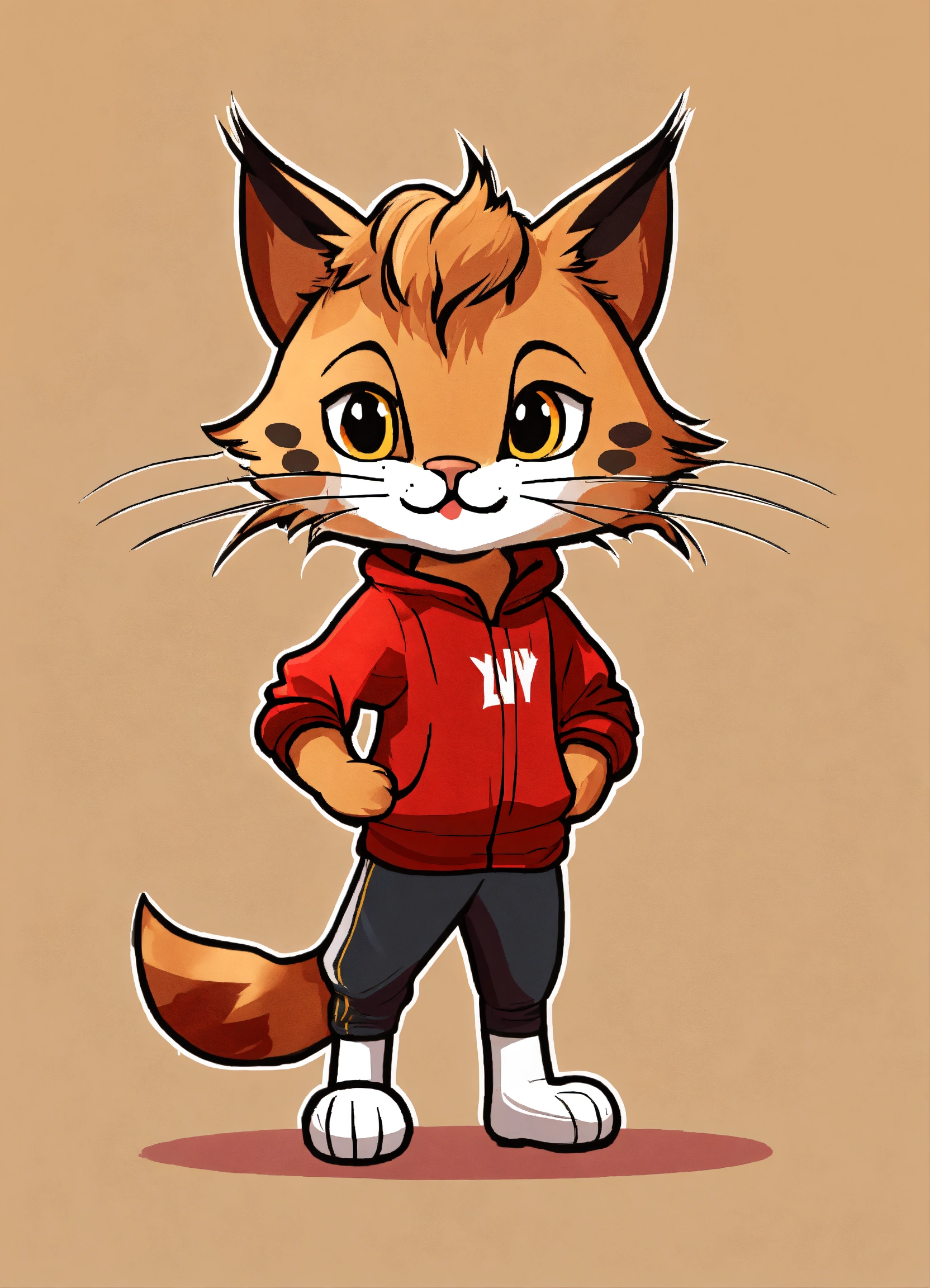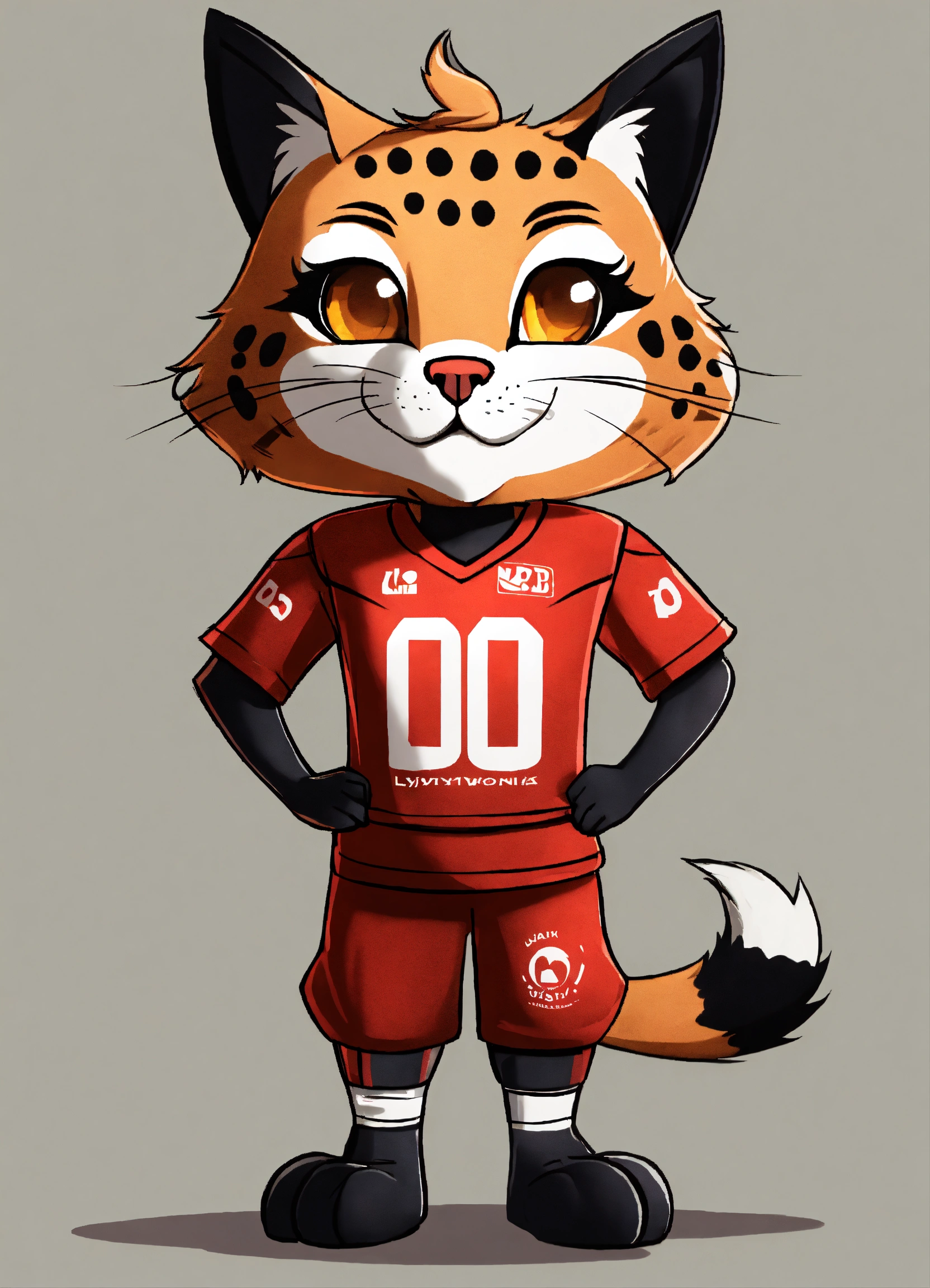 Lynx female cat as a mascott, standing straight, wearing red jersey, brown colour with black dots on the head, kids drawing, cartoon style, 8k