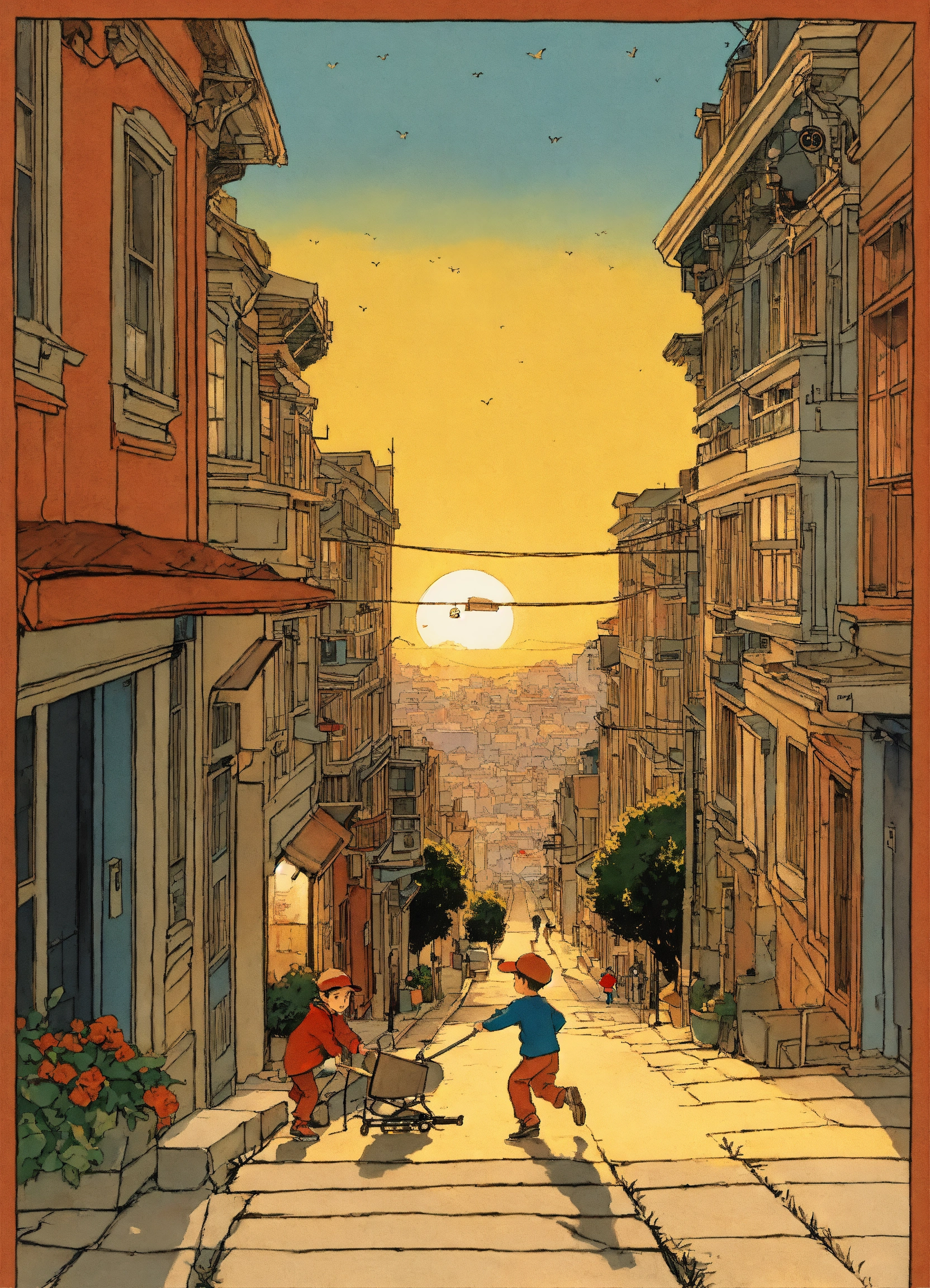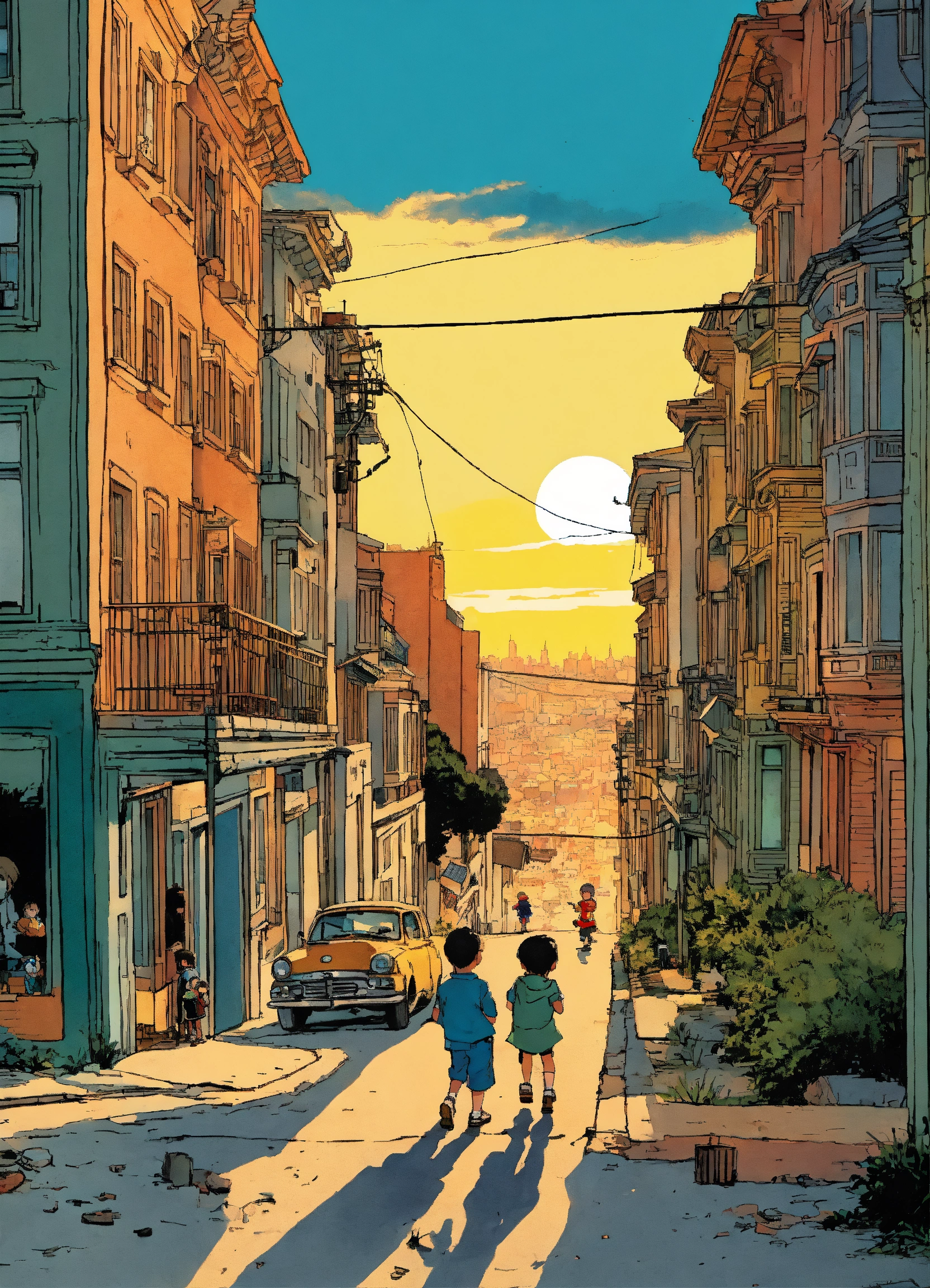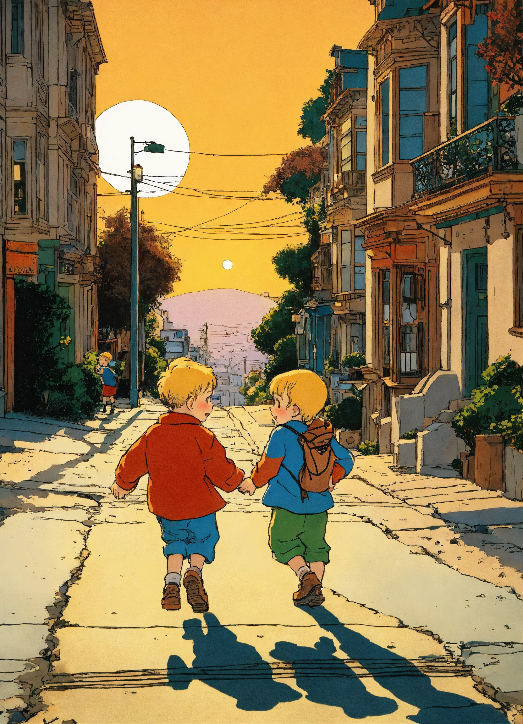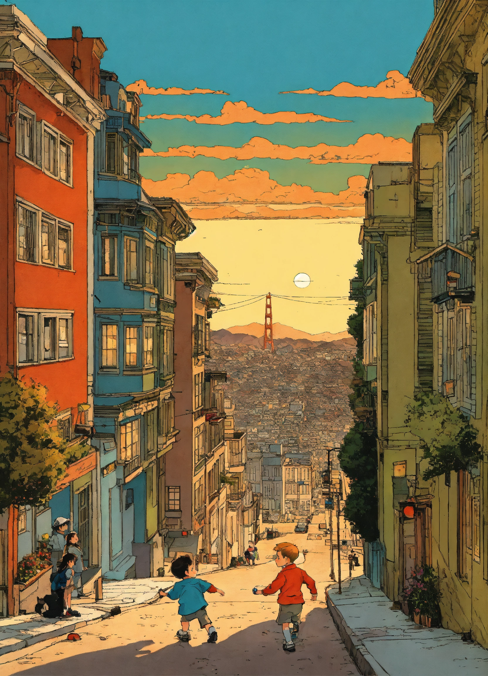 Beautiful illustration by hergé of a little boy and girl playing in the streets of san francisco at sunset