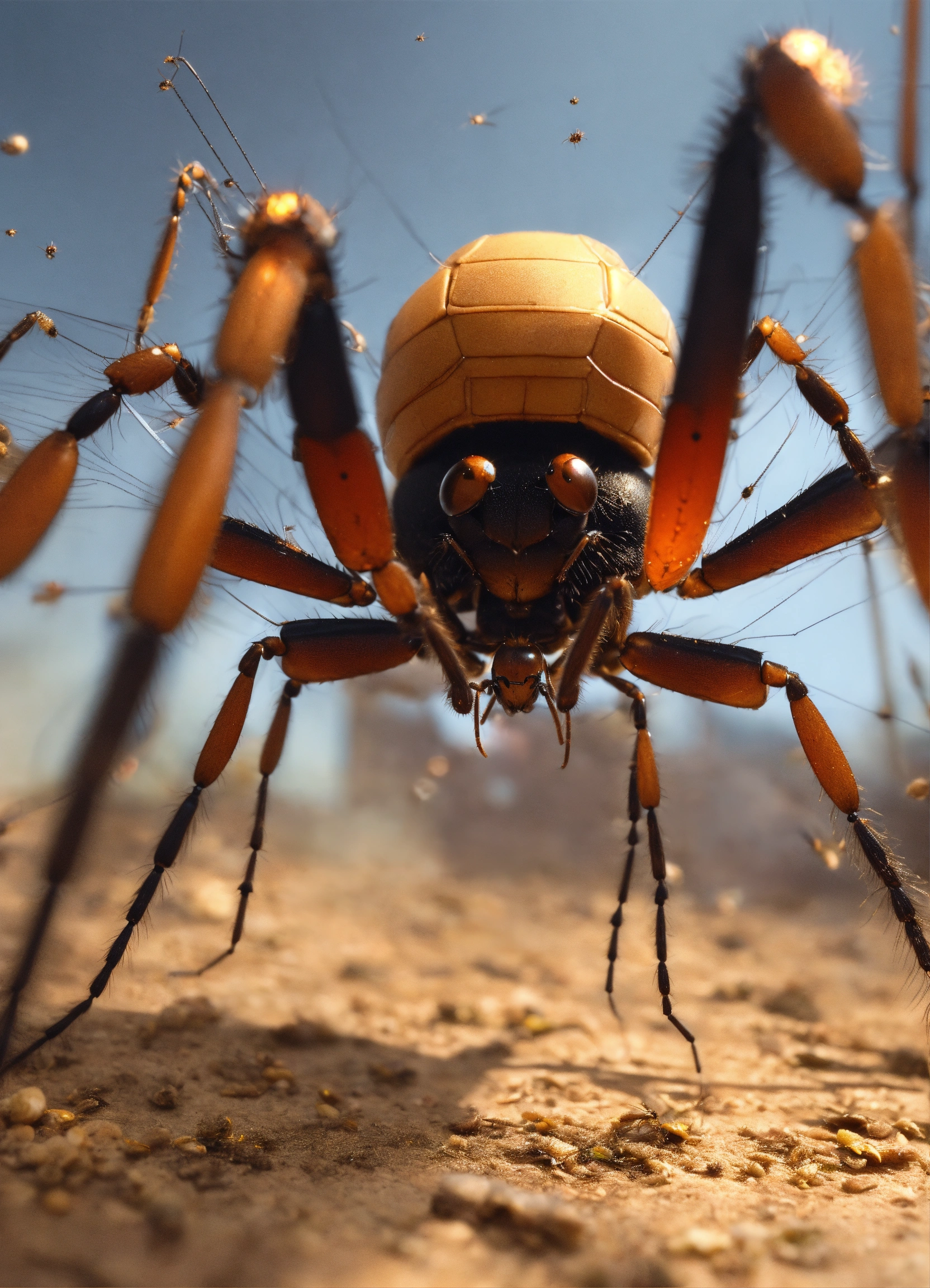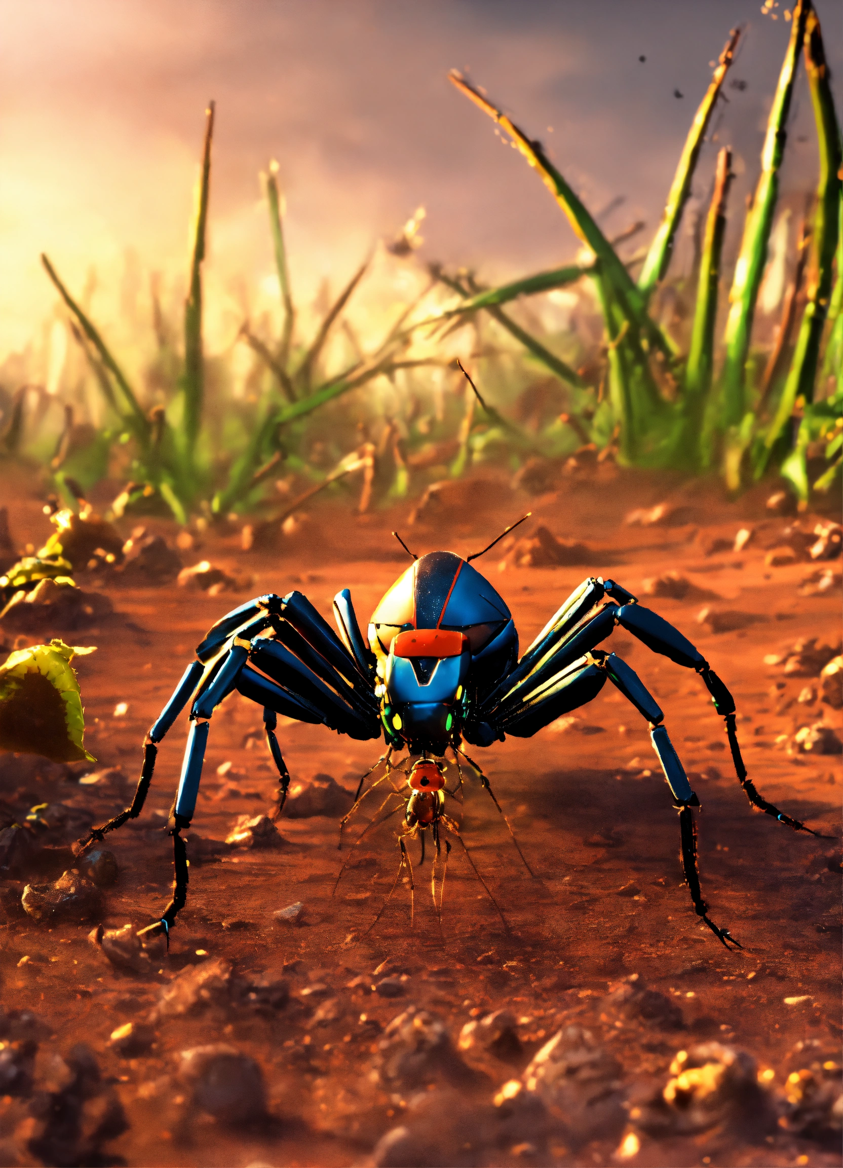 Swarms of large ant faced spider legs, electronic insect bots attack, shooting lazers, destruction, wasteland