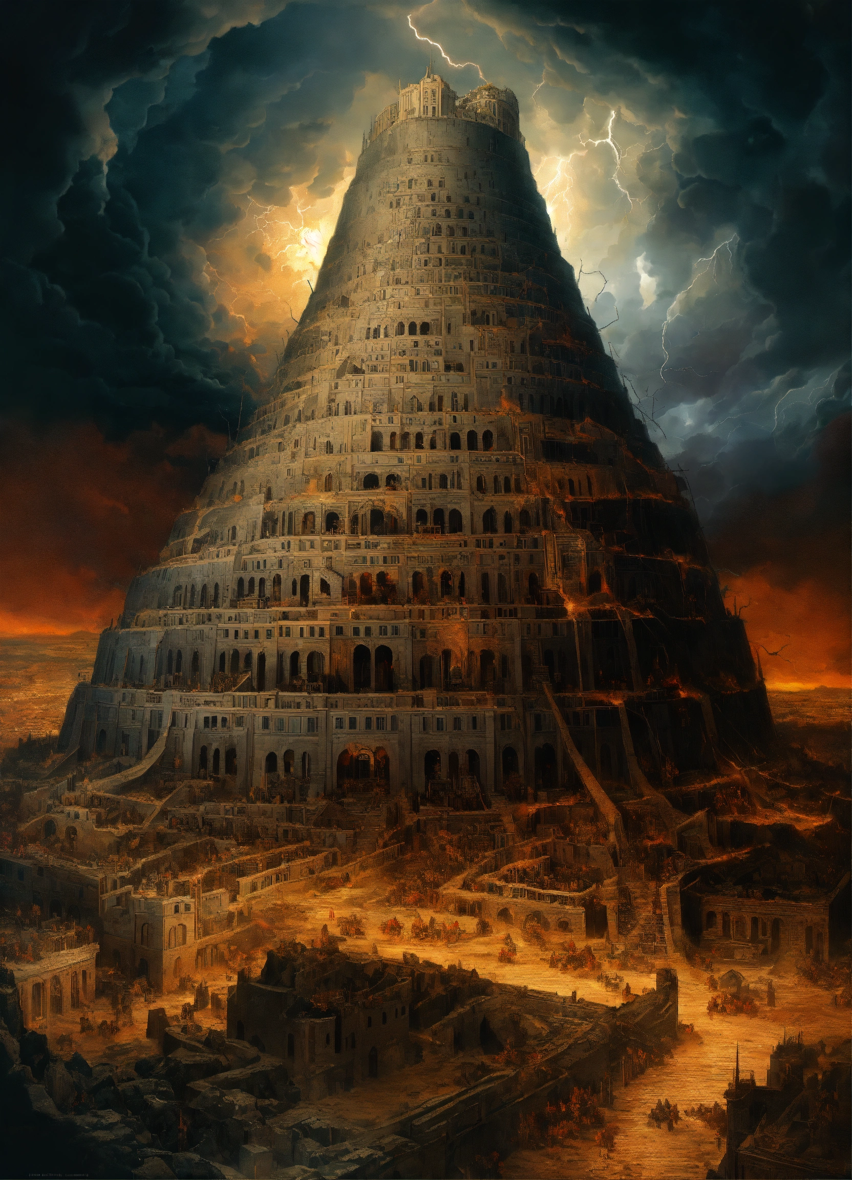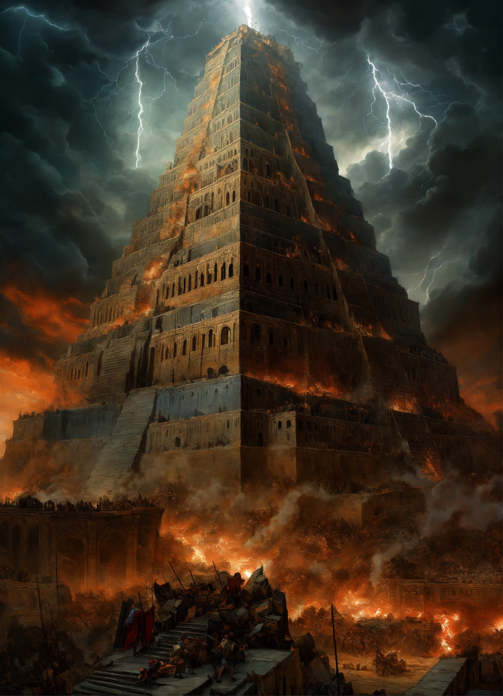 Tower of babel, sharp color, intricately detailed, foreboding, intense, dark clouds, wrath of god, lightning, symmetrical architecture