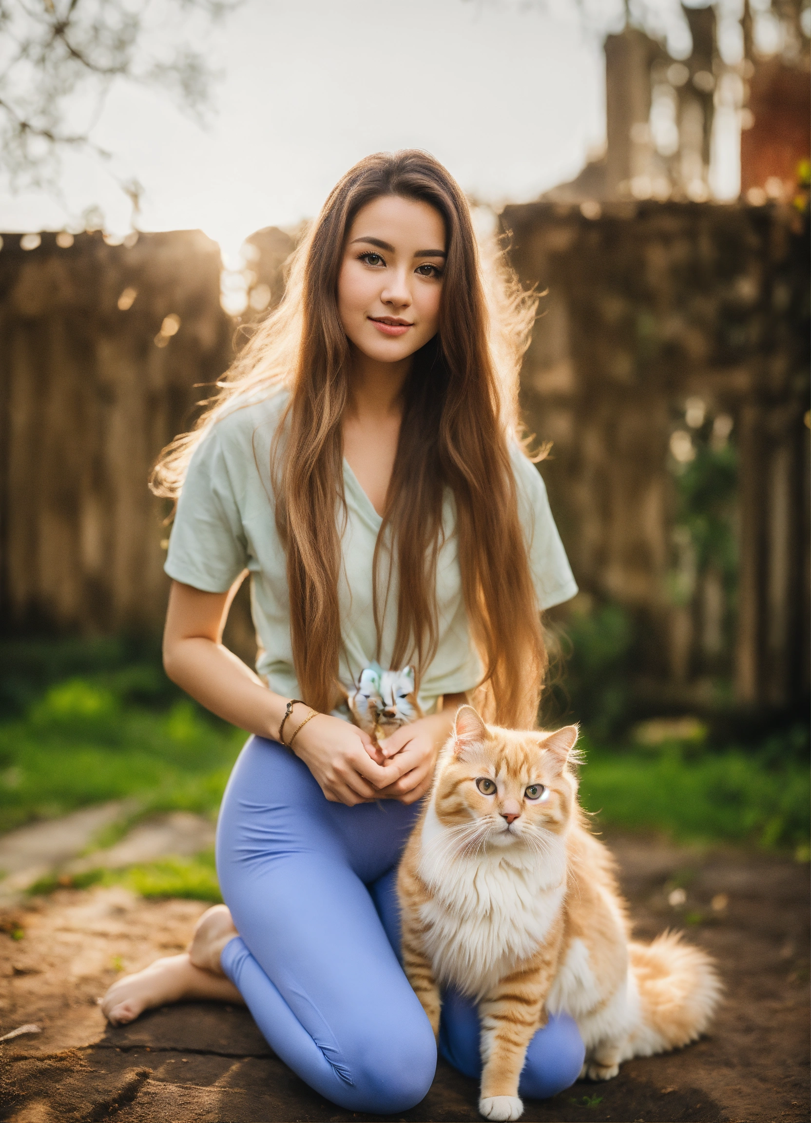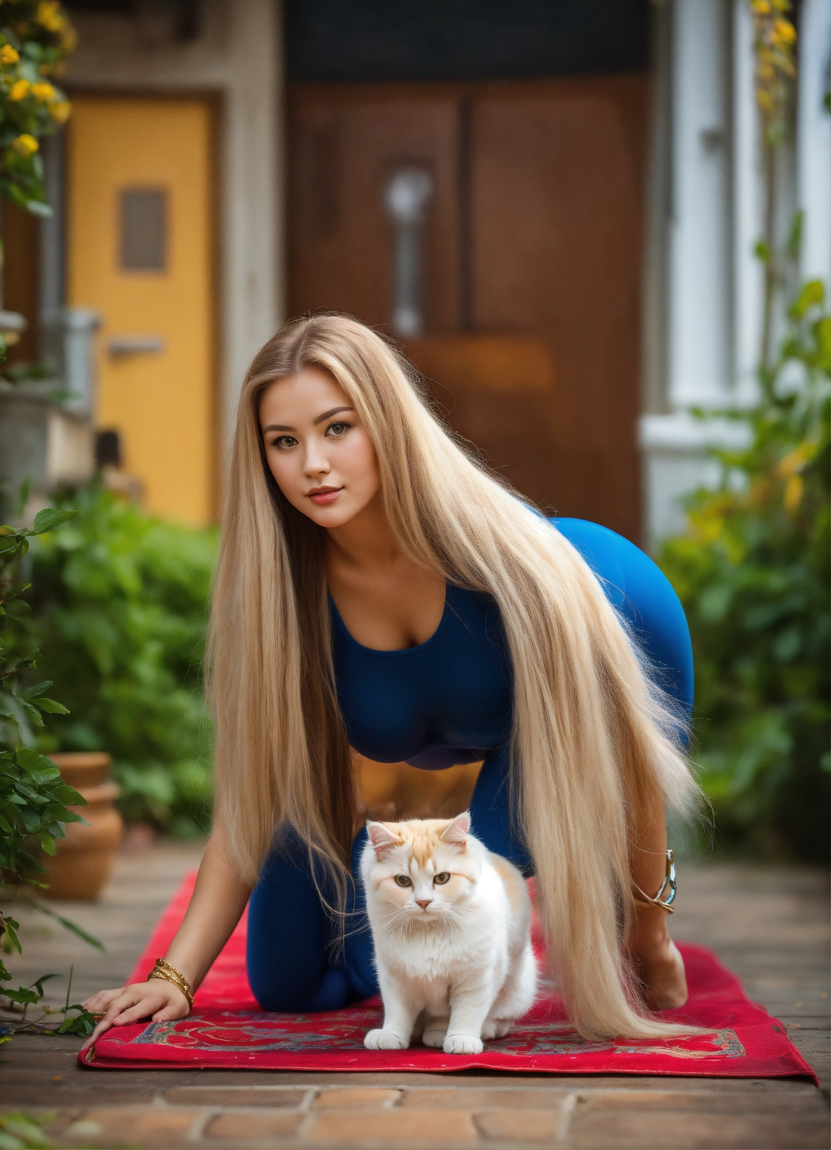 A beautiful eastern european woman wearing yoga pants, with charming big eyes, snow-white skin, and long golden hair, is doing a handstand and holding a persian cat in one hand. the cat has hair all over its body and is colorful and charming. best quality, full body portraits, real pictures, intricate details, depth of field, fujifilm xt3, beautiful lighting, raw photos, 8k ultra hd