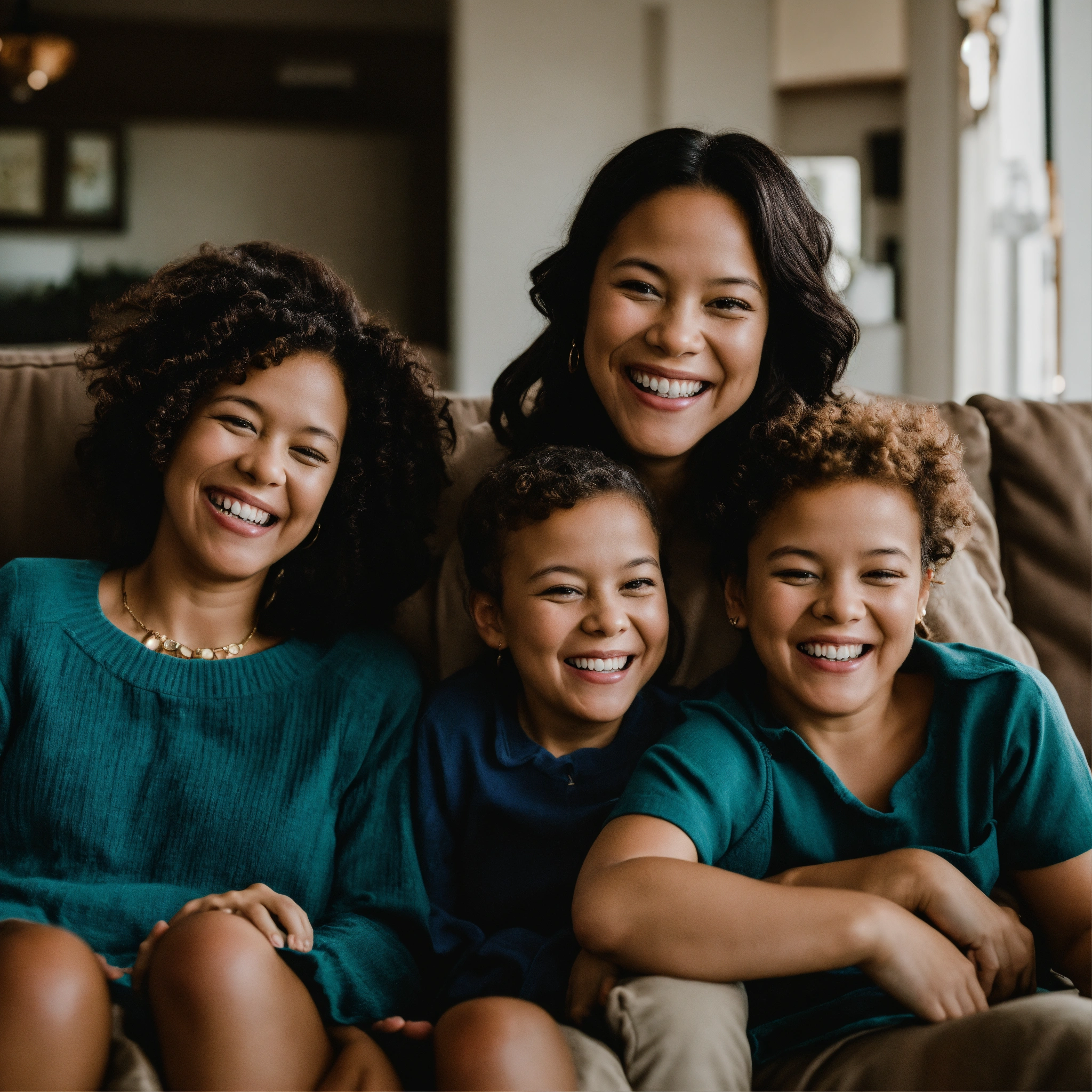 A photo of a family of four, the family is sitting on a couch and laughing, the background is a living room