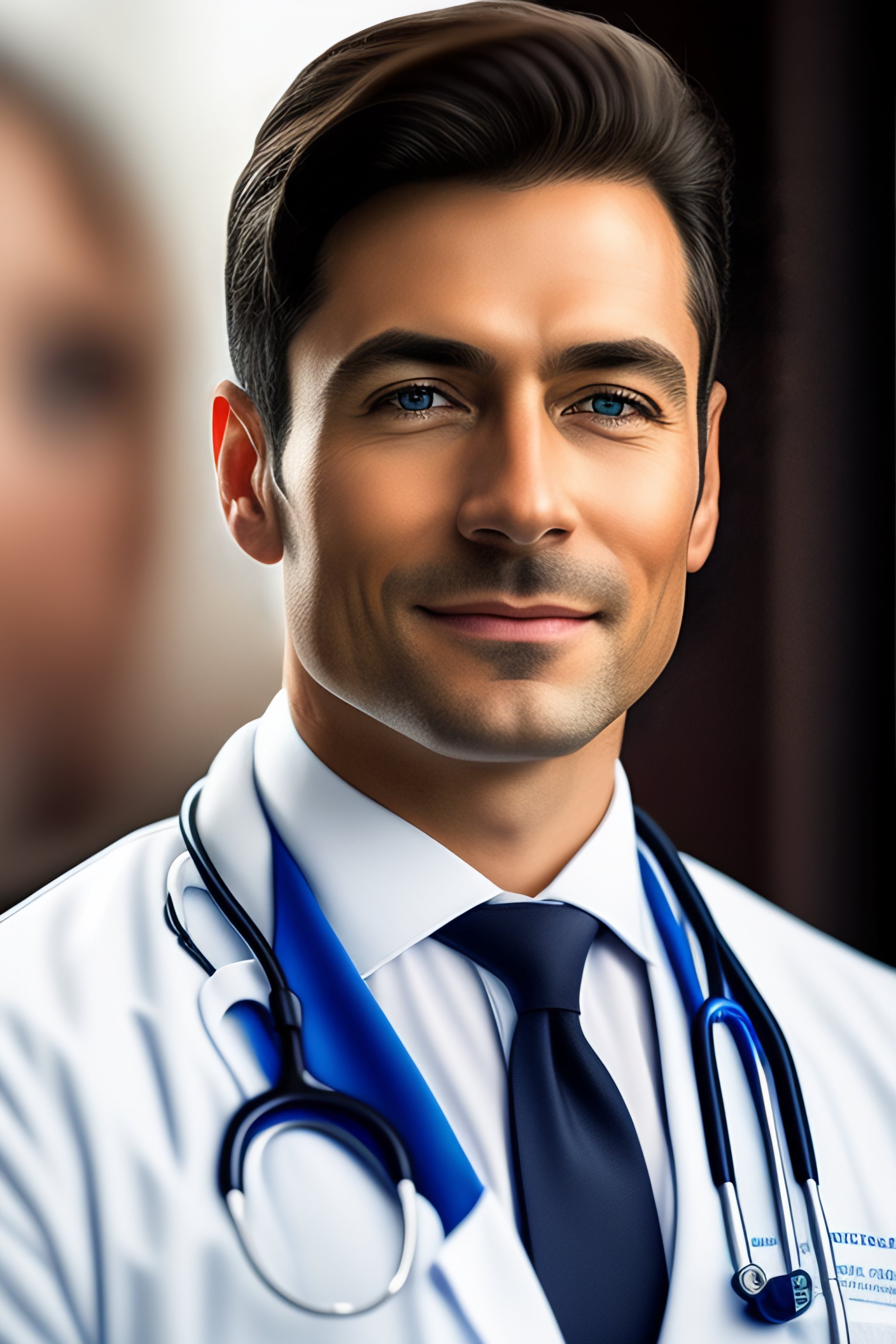 Photo of a realistic experienced german doctor wearing a doctors outfit, realistic, sharp focus, 4k high definition, insanely detailed, intricate, elegant, art by stanley lau and artgerm, with blurred hospital background