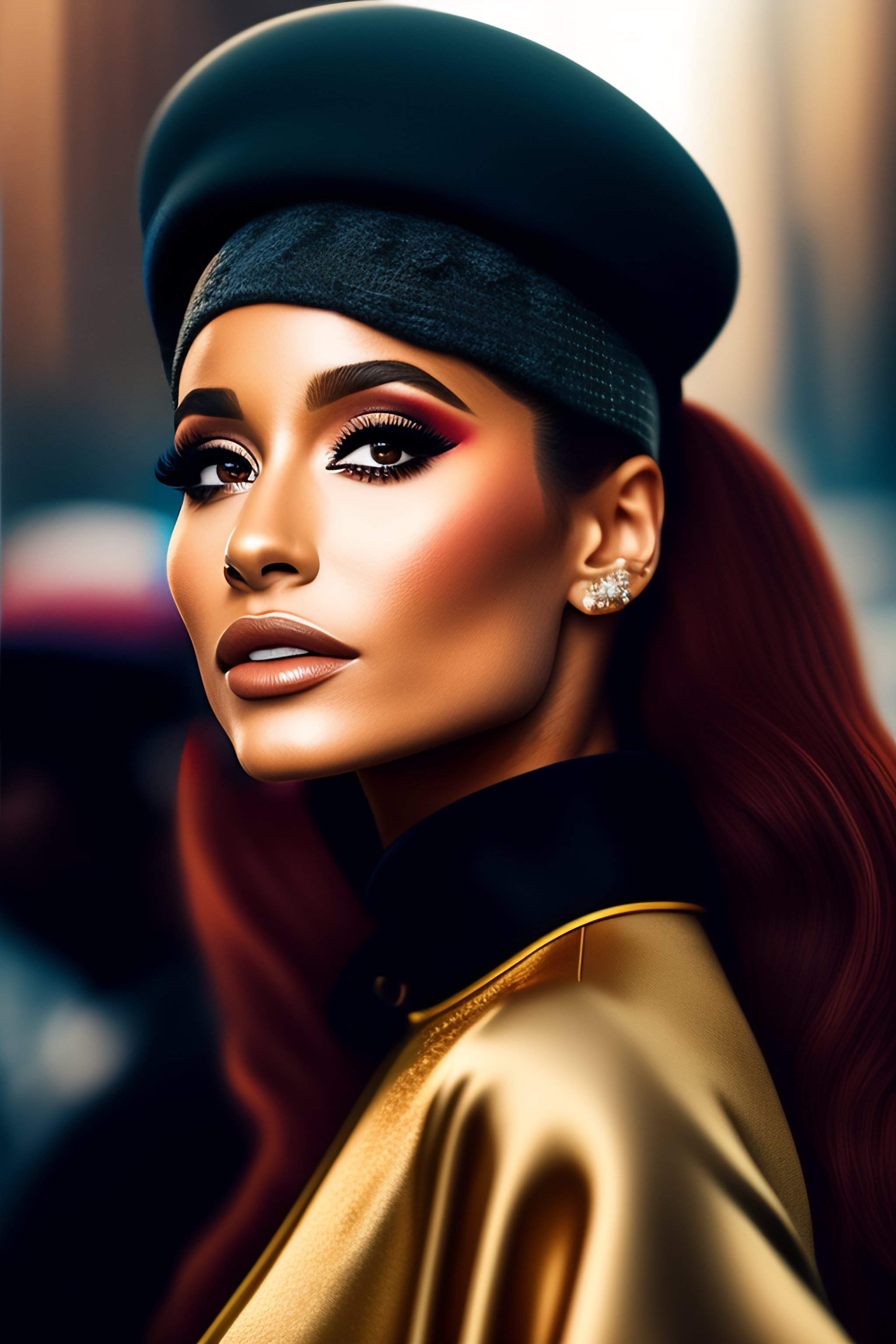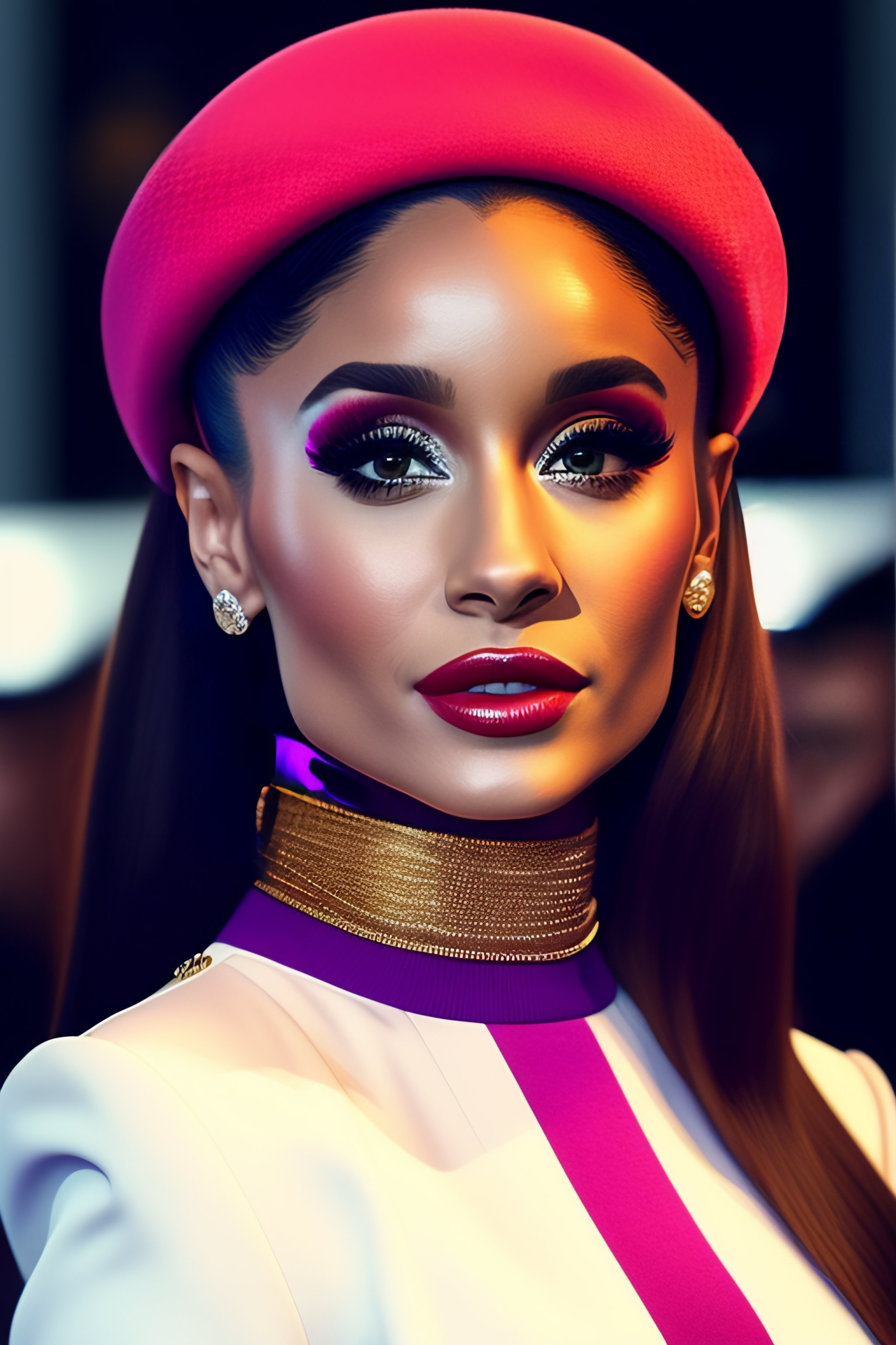 Ariana grande with a beret in a retrofuturistic city, retro futuristic fashion, photography award winning