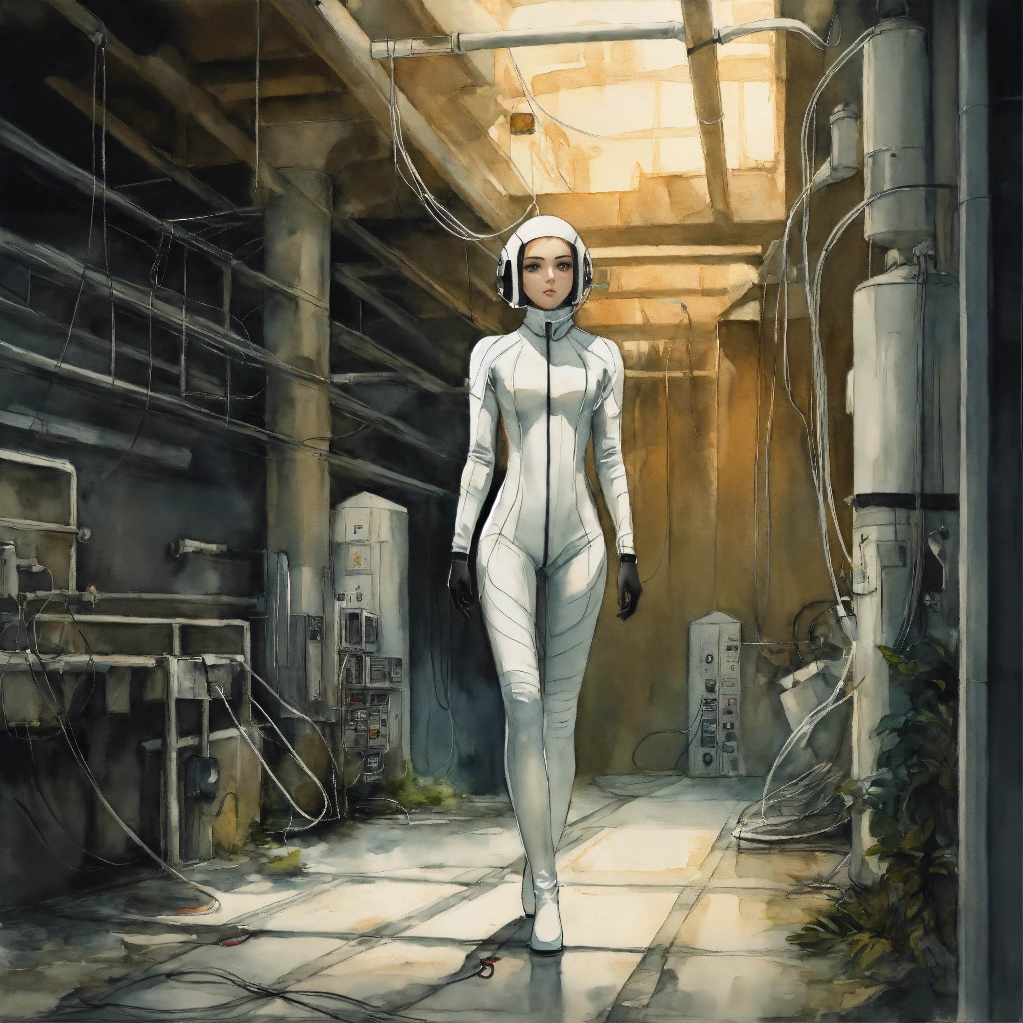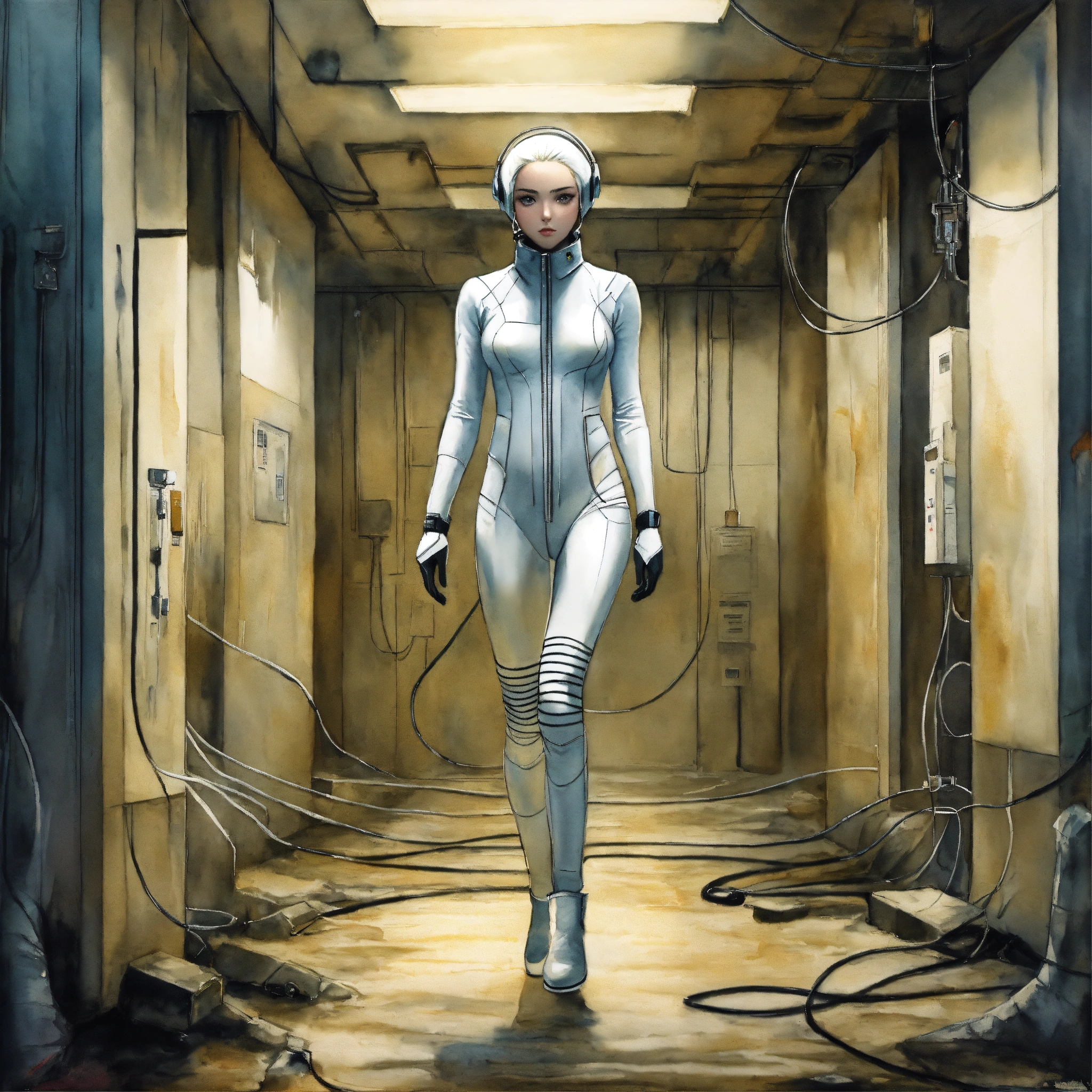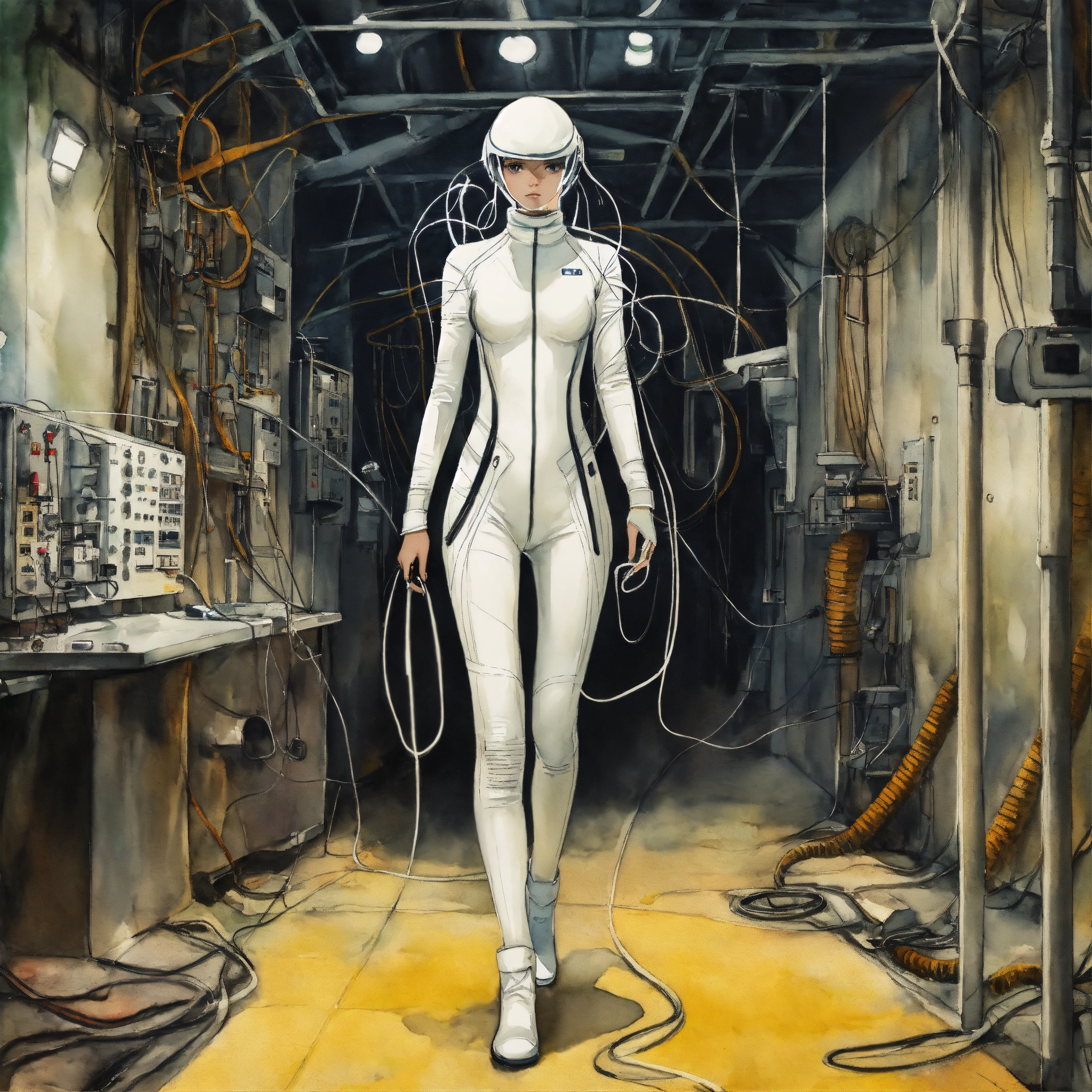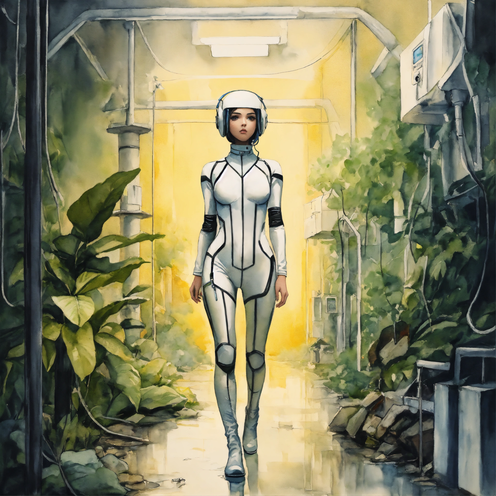 Full body illustration of a woman, young, 18 years old, beautiful, wearing a white futuristic catsuit with black highlights, various wires, walking out of a concrete laboratory in the jungle, watercolors, gloomy and depressing ambient, artwork by tom björklund