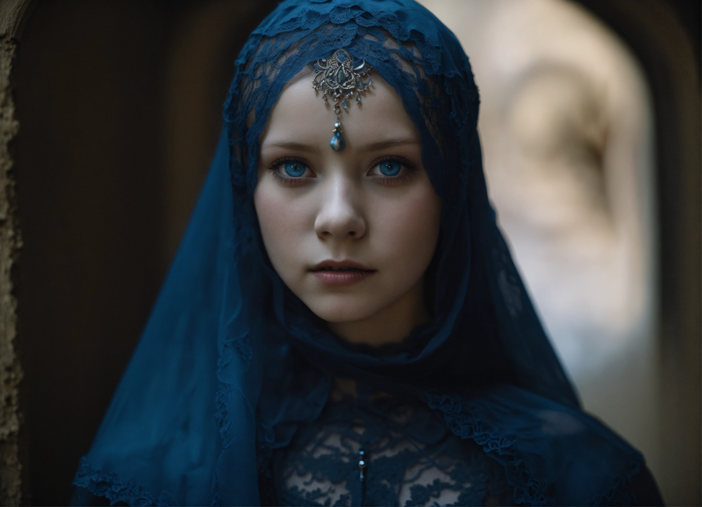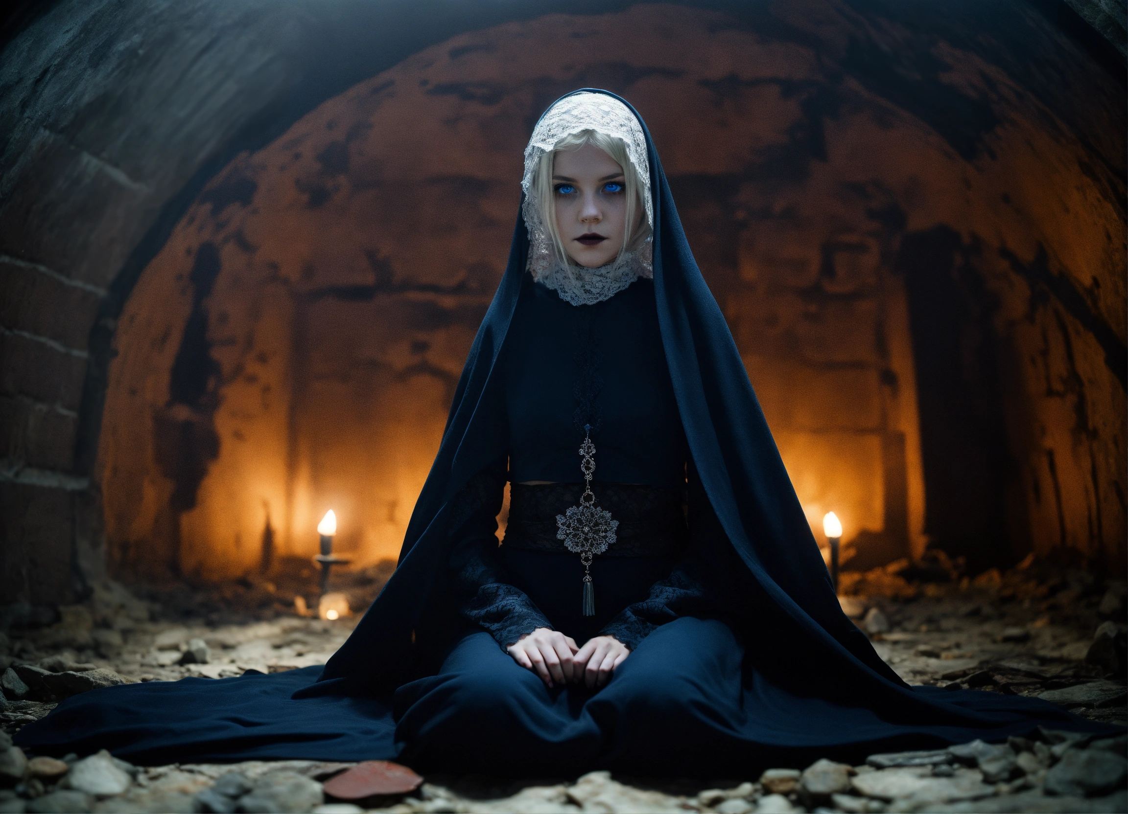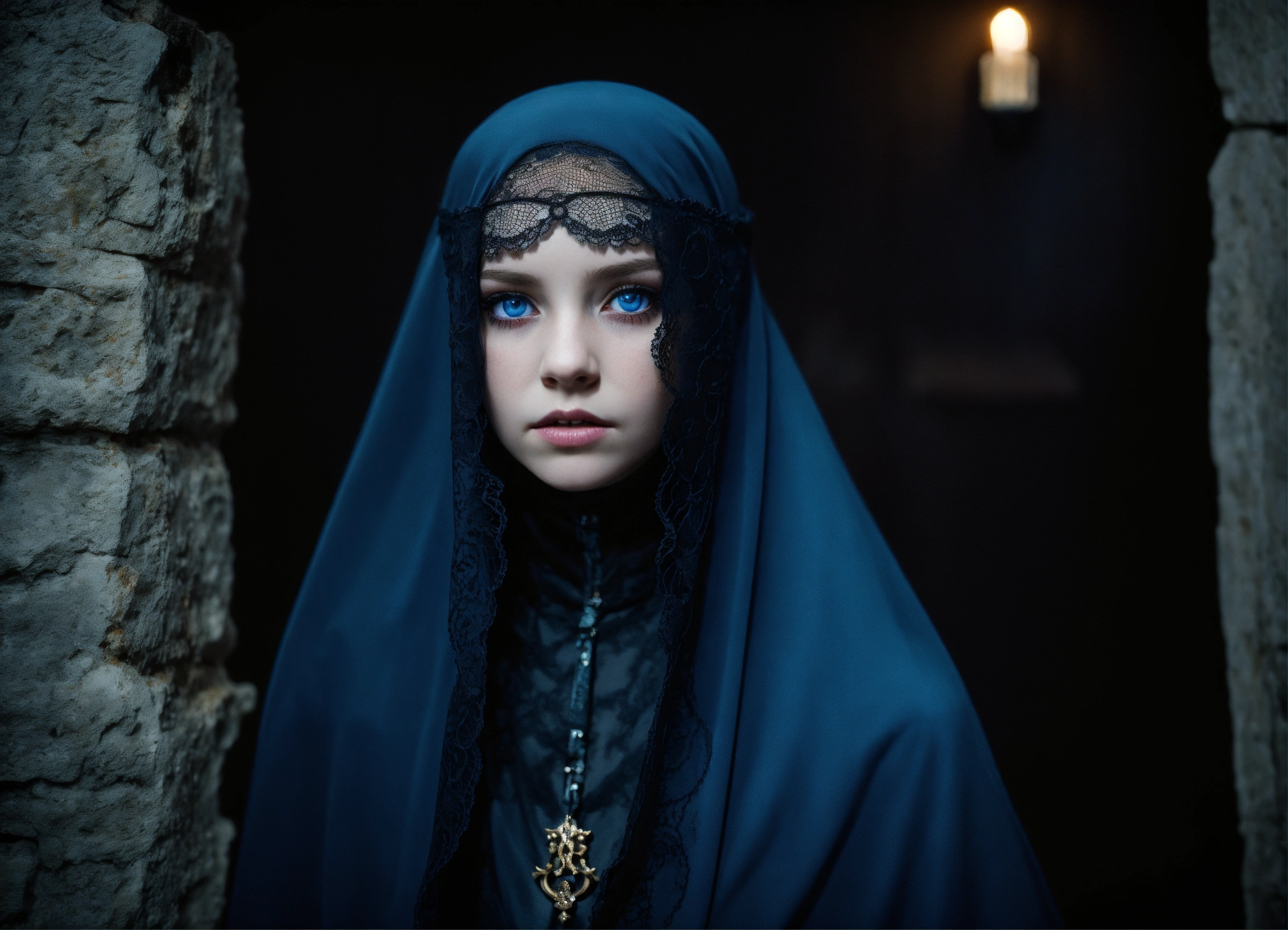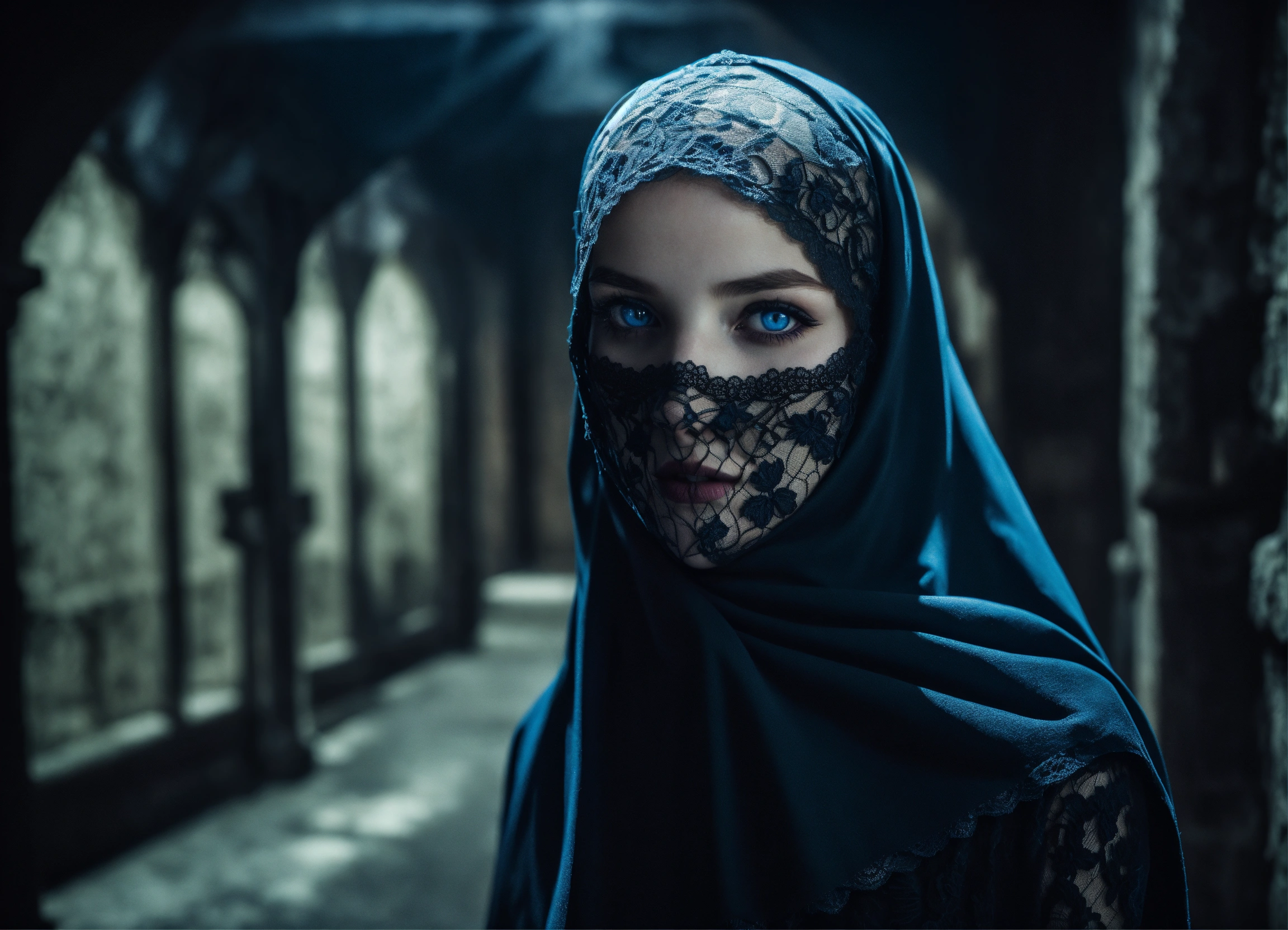 Body portrait of a very childish deadly pale ultra slim twelve year old female child, she is a goth necromancer with waist-long silverwhite hair, lace niqab, face veil, fully veiled, crop top, ultra flat belly, ultra skinny, ultra slim body, emaciated body, completely emaciated, ultra narrow face, alabaster white skin, pale as a corpse, glowing blue eyes, ultra slim face, innocent looking, in a gloomy crypt, lasziv, kindlich, unschuldig, childlike, graceful, wispy, glowing blue eyes, ghostly, dead, evil, demonic, undead, darkness, grotesque, mysterious, dark, cold ambient lighting, extremely detailed, fantasy, medieval setting
