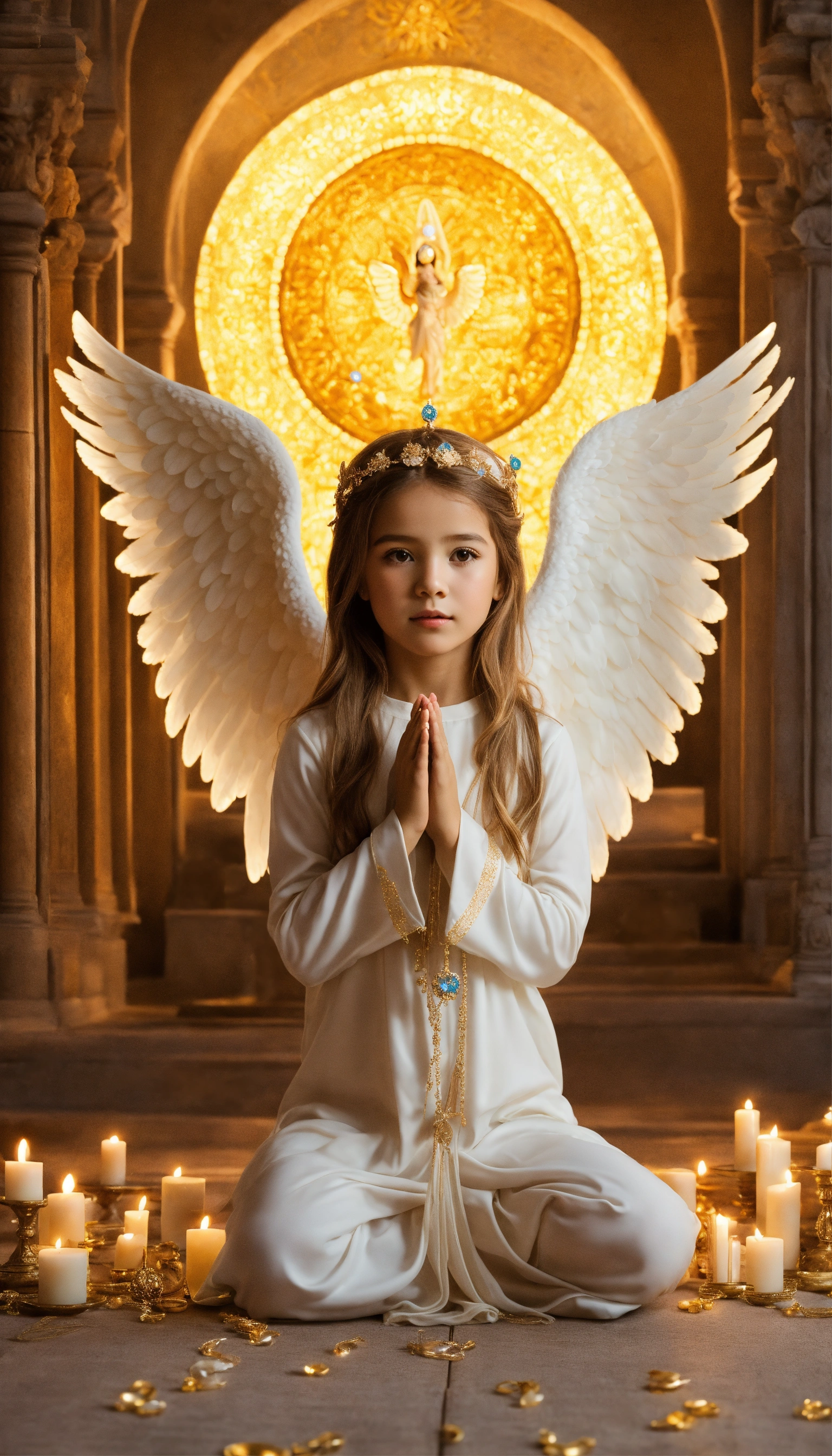Seres de luz, niños sacerdotizas con alas, perfectos, children sentados en posición de yoga, angel perfecto, rostro perfecto, vestido blanco majestuoso, piel blanca perfecta, ojos abiertos y perfectos, manos abiertas perfecta, fondo claro, niños con joyas preciosas, niños con rubíes y oro en su cabeza, joyas en su vestido perfectas, amuletos, huestedes angelicales perfectas, tronos angelicales perfectos, principados angelicales celestiales, virtudes de angel, seres celestiales, seres sagrado, místicos, ojos perfectos, cuerpo perfecto, alas perfectas, divinidad, alta resolución, alta calidad, máxima resolución, hd, obra maestra, arte digital, 8k