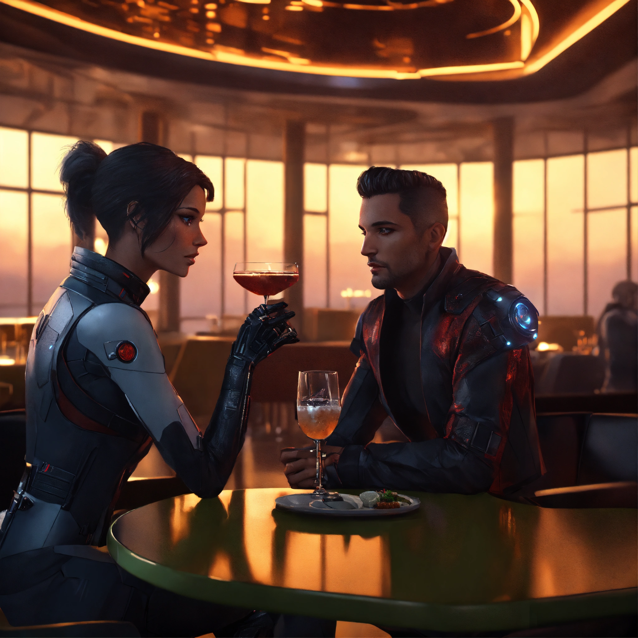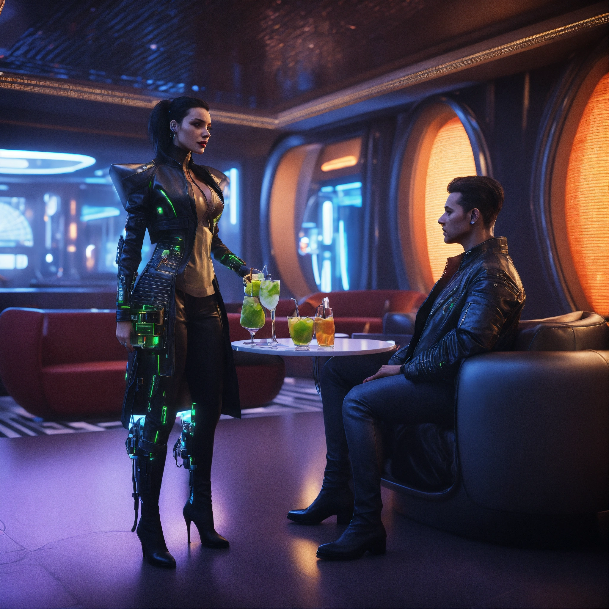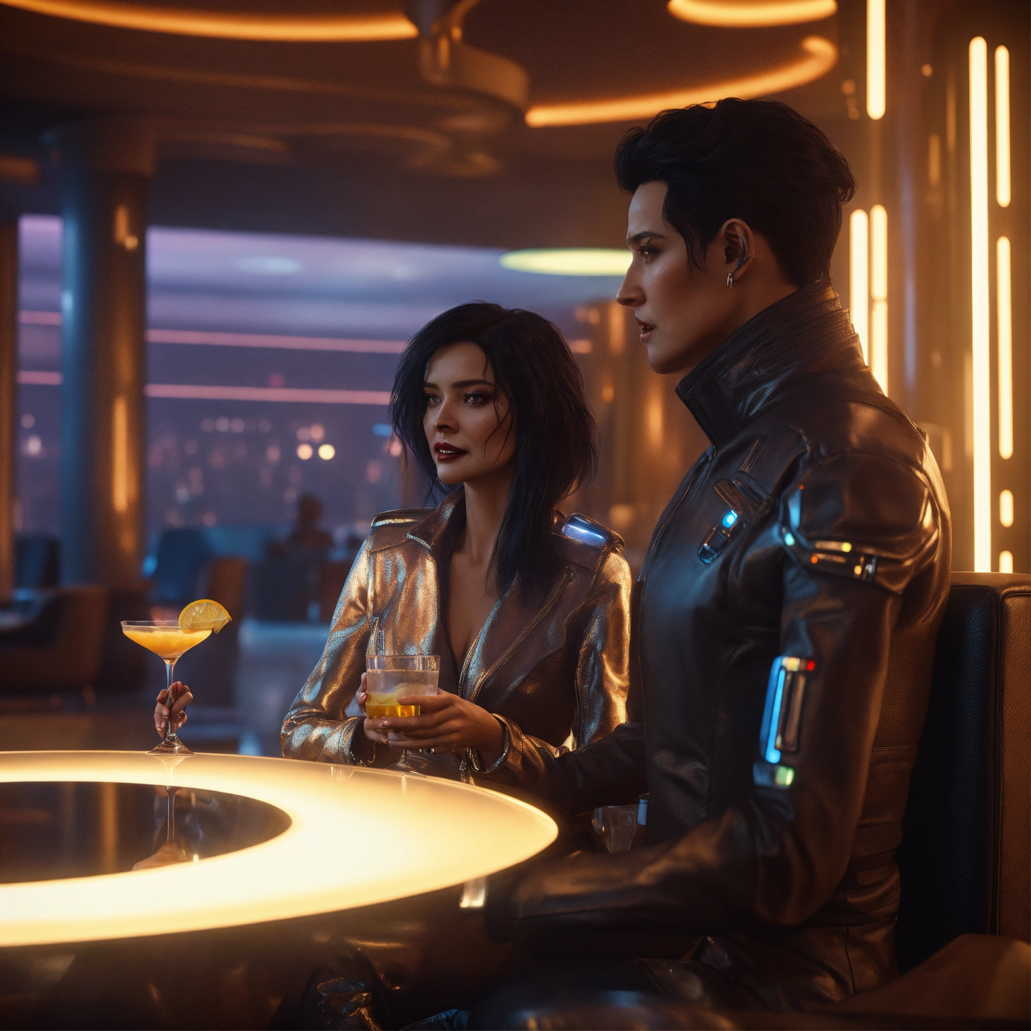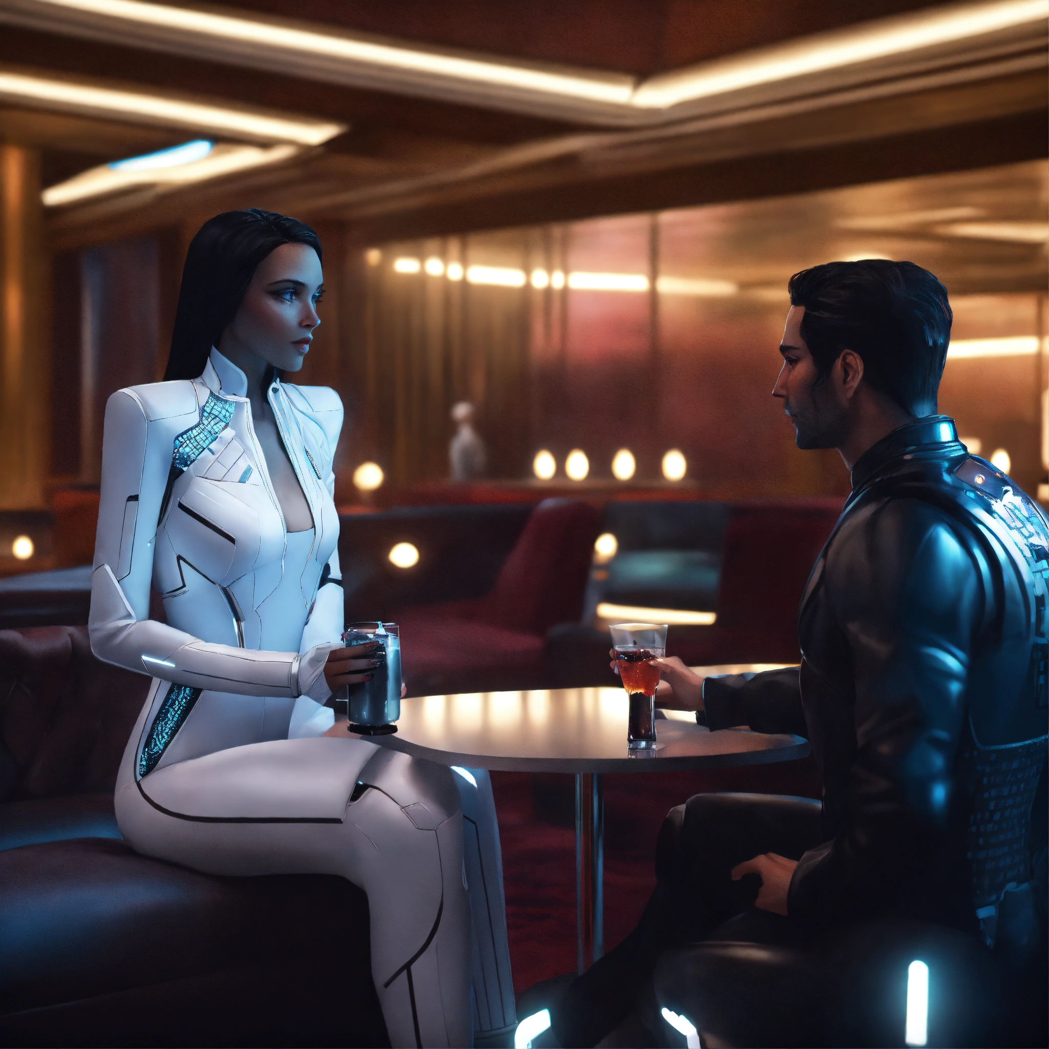 A zombie android woman holding a drink and flirting with a 35 year old white male with black hair wearing futuristic spy jacket in a luxurious space port hotel lounge, realistic, futuristic, sci-fi, 8k, unreal engine, pixar, zaha hadid