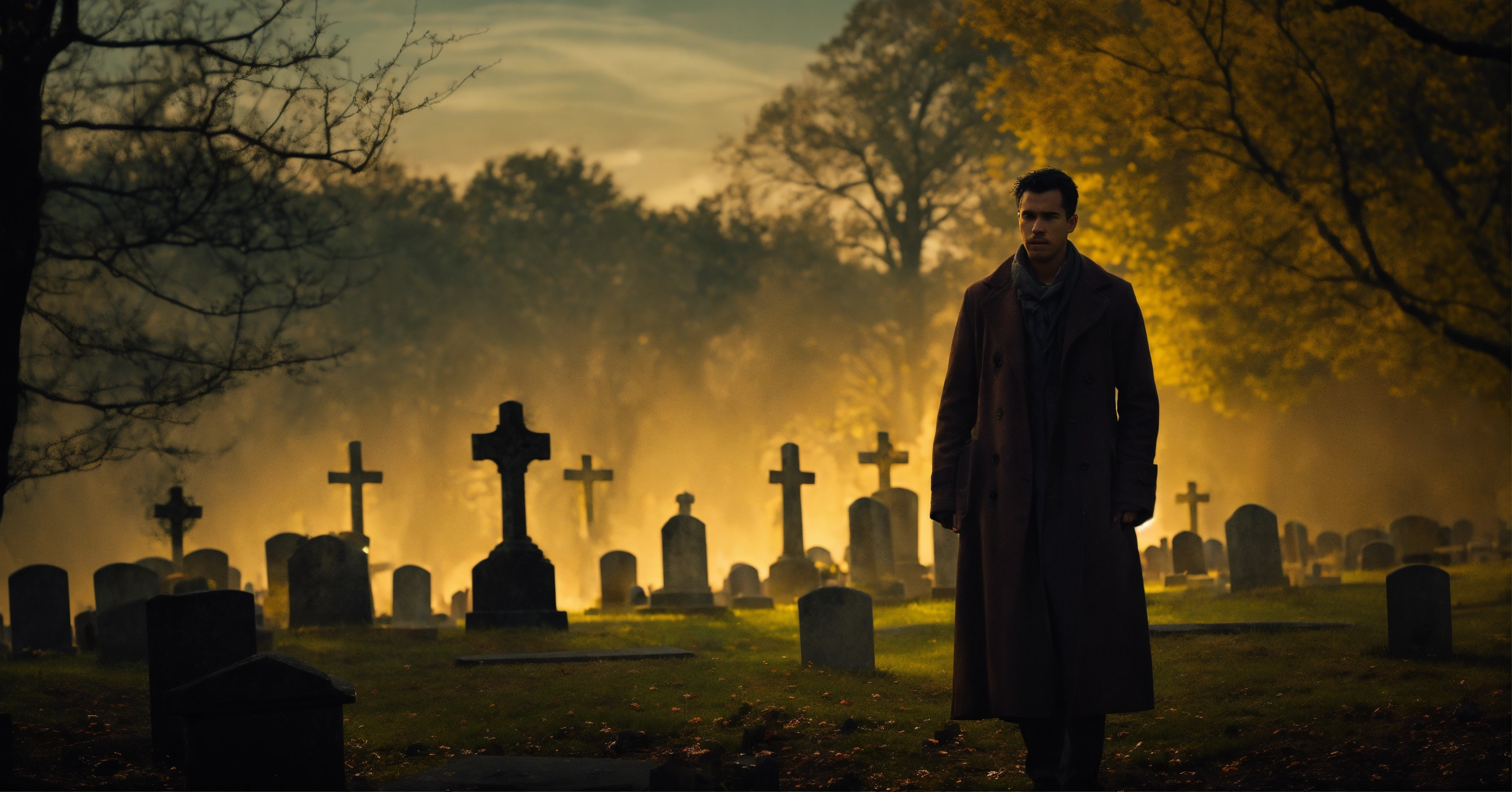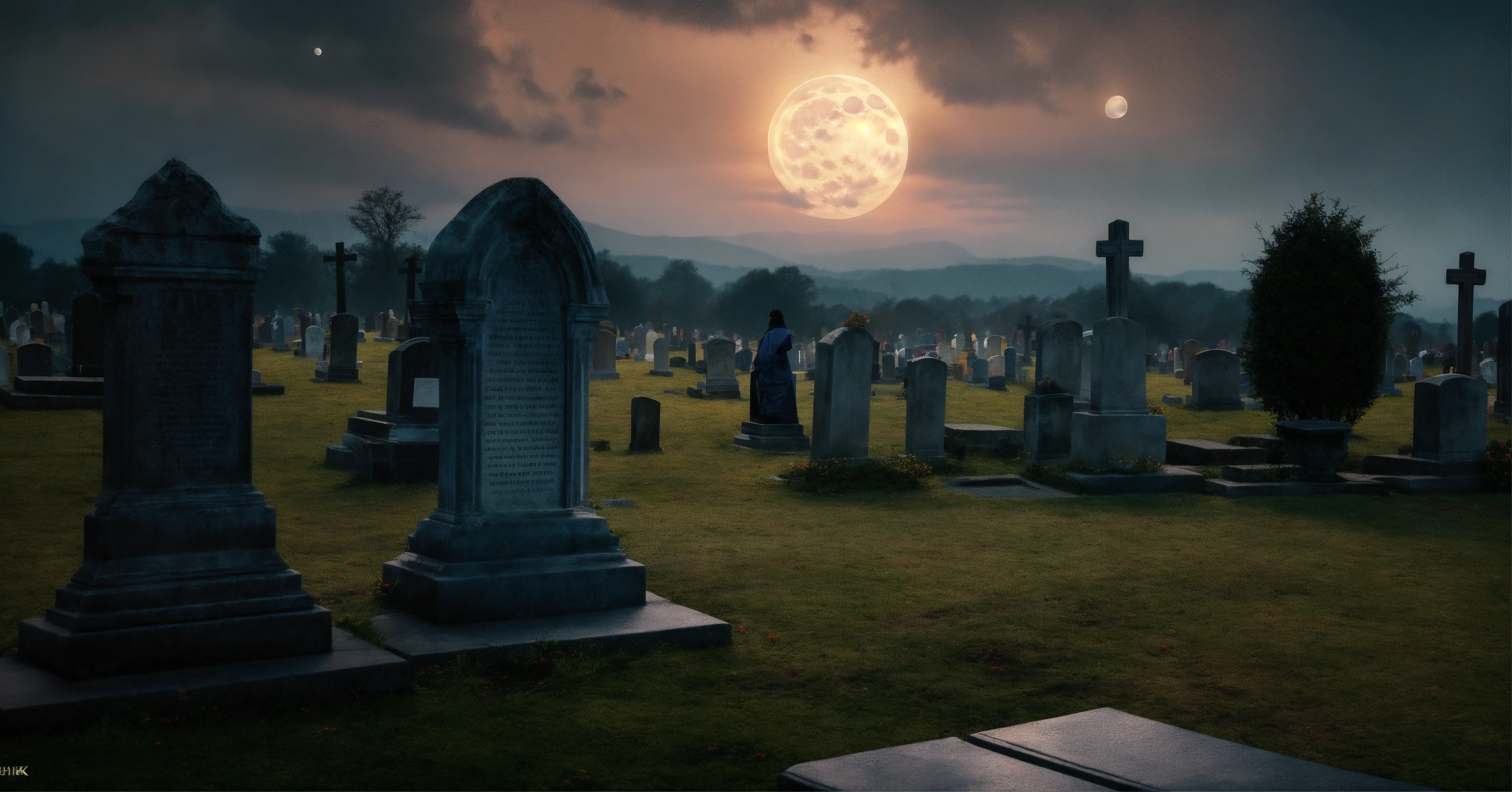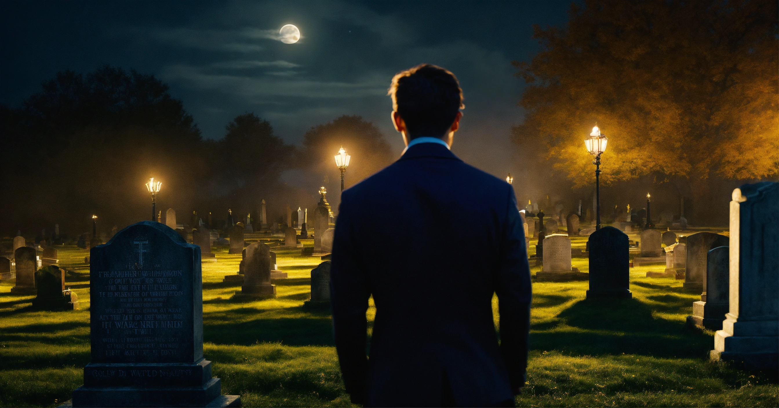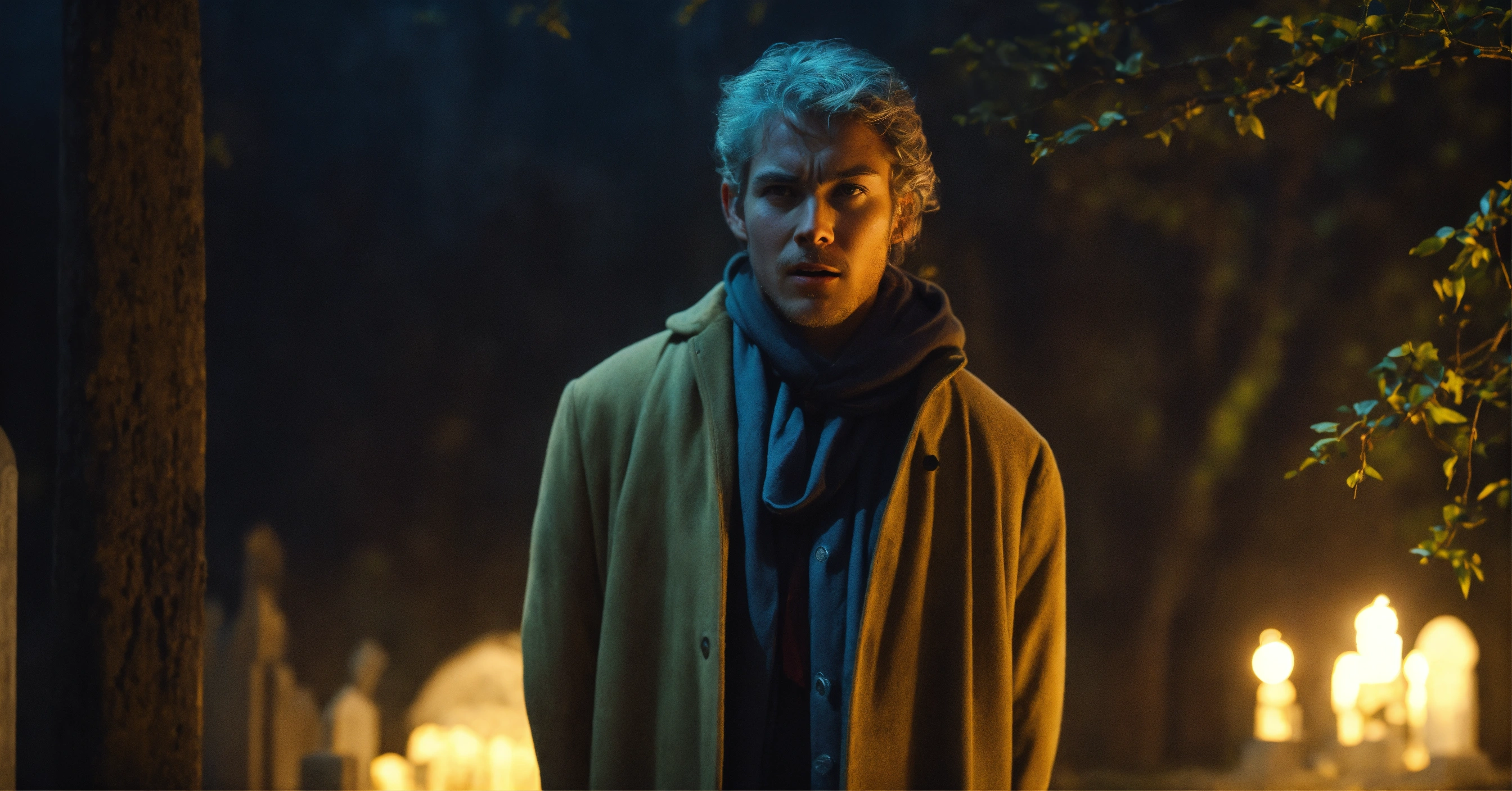 In a graveyard, a person shrugs their shoulders, confused, as if to say, "i don't know." a cold wind blows, while the moonlight casts haunting shadows on the tombstones, creating a dark, mysterious ambiance. the person’s facial features are clearly visible, sharply defined, & fully rendered in 8k uhd, showing impeccable attention to correct anatomy. the scene is captured w/ clear, crisp imagery, so every detail comes to life. composition is carefully constructed w/ complex detail, emphasizing the person's bewildered expression. sharp focus & clear lines bring out the scene's realism, immersing the viewer. the golden ratio is skillfully applied in the composition, enhancing visual appeal & balance. the person's face and body are depicted w/ a stylized yet hyperreal approach, capturing the essence of emotion and adding artistic flair.