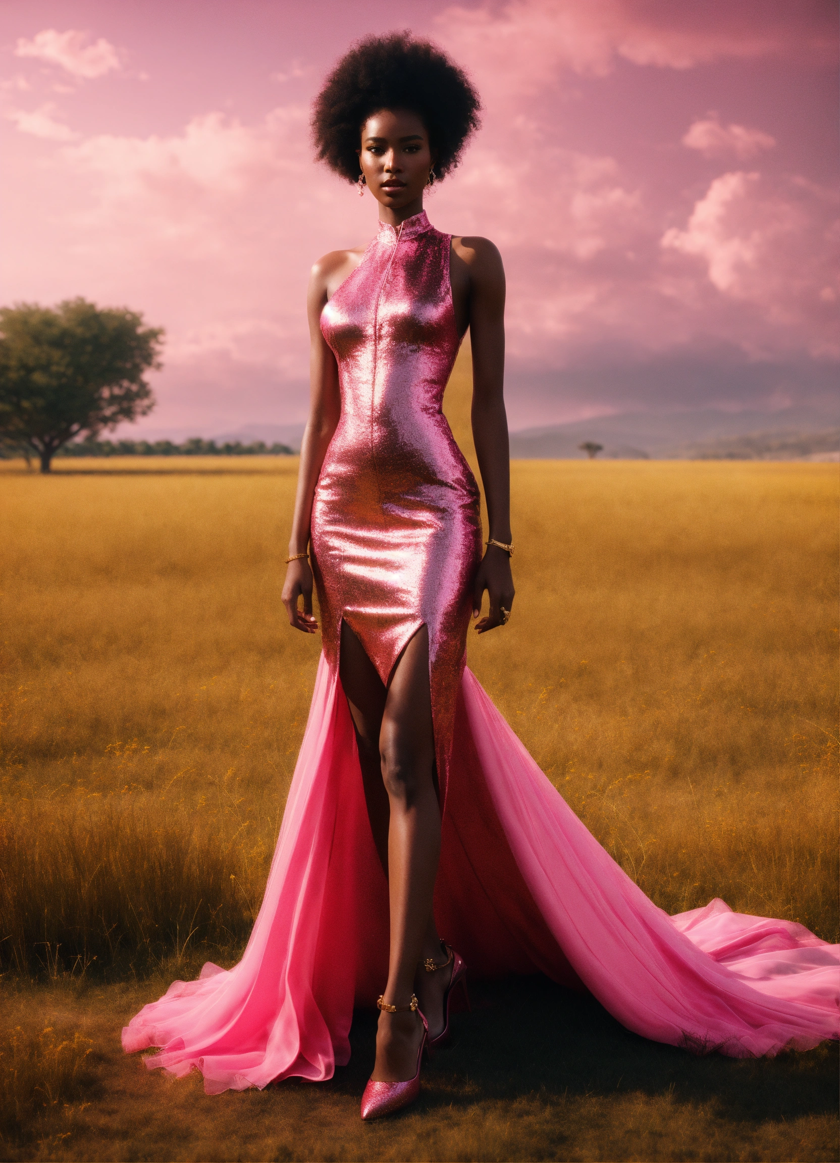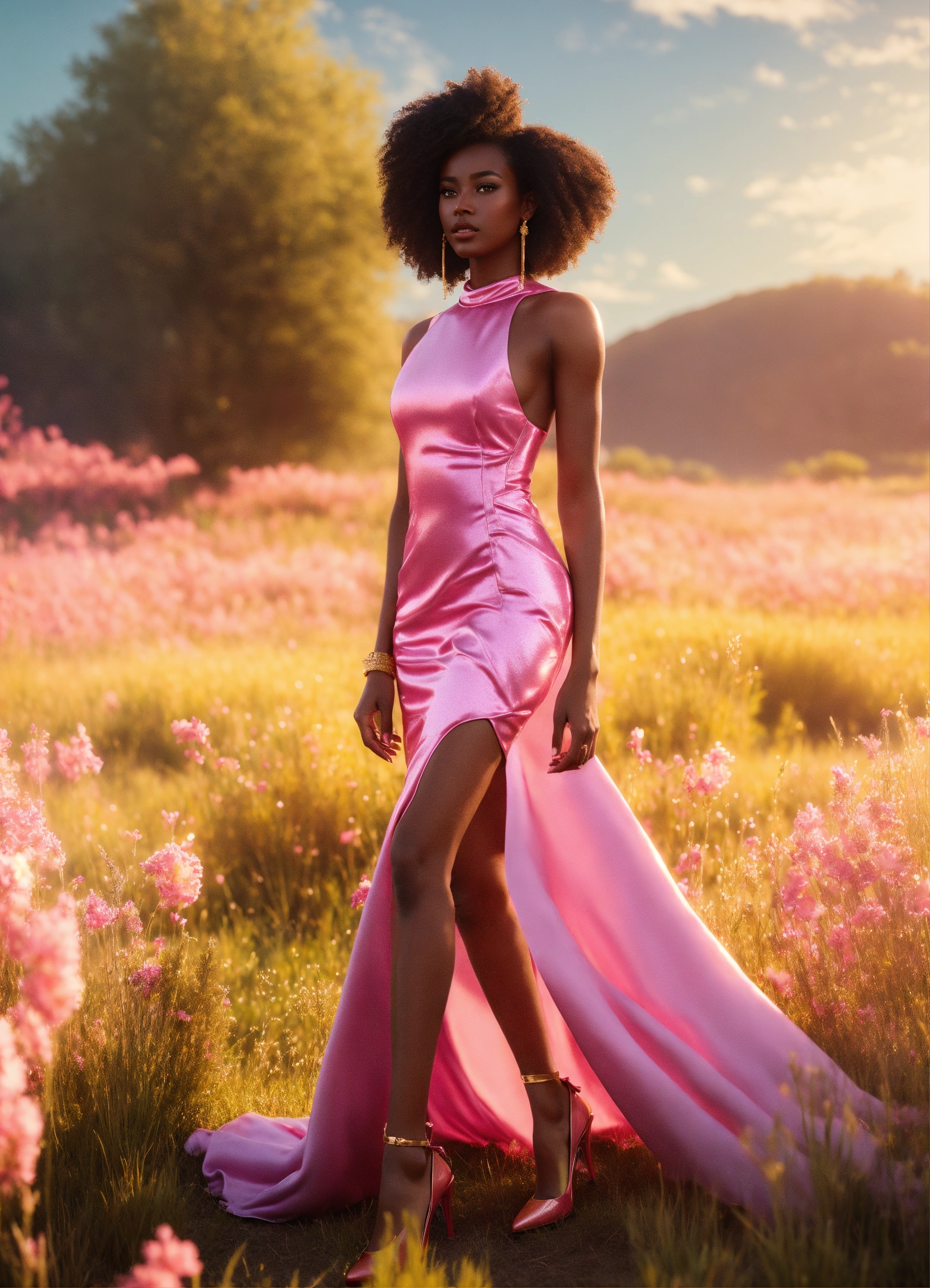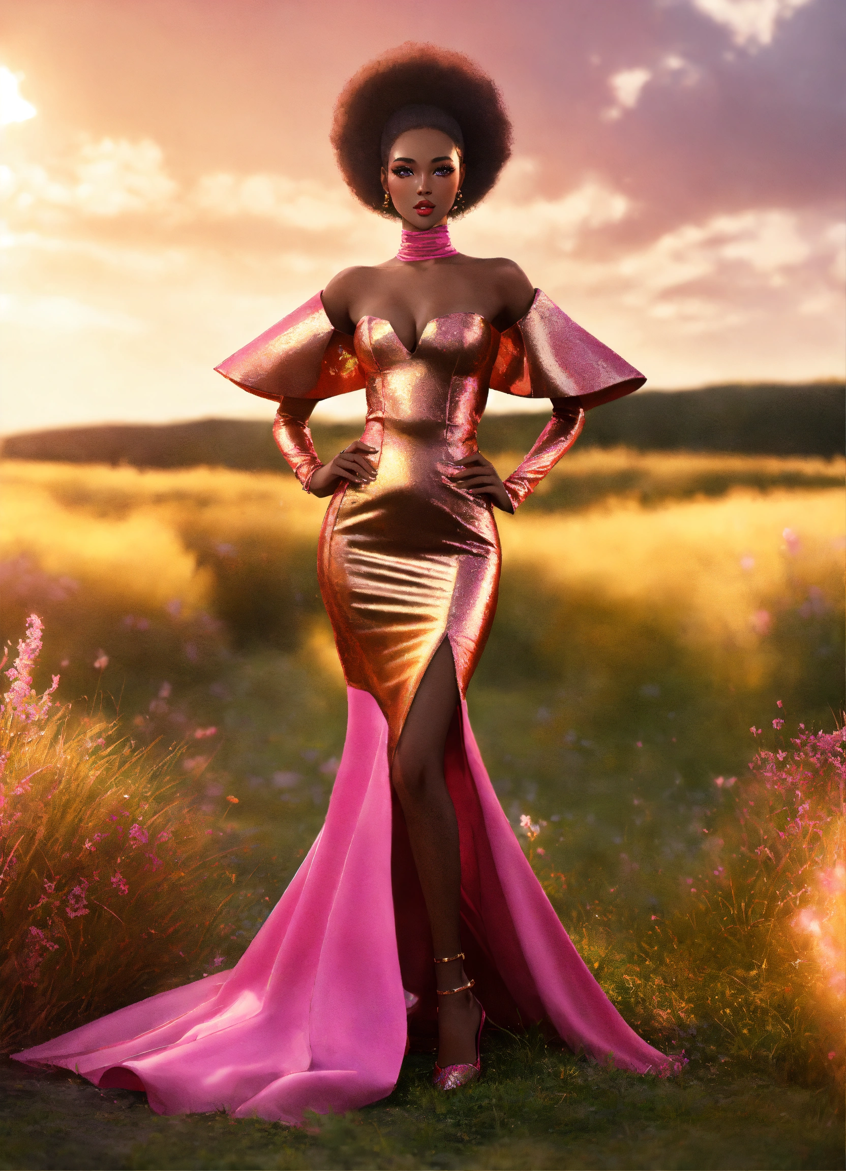 Pretty human looking alien, golden dark skin, african features, volumpious, in haute couture pink dress, and heels, in grassy field, bright sunny day, 8k, unreal engine.
