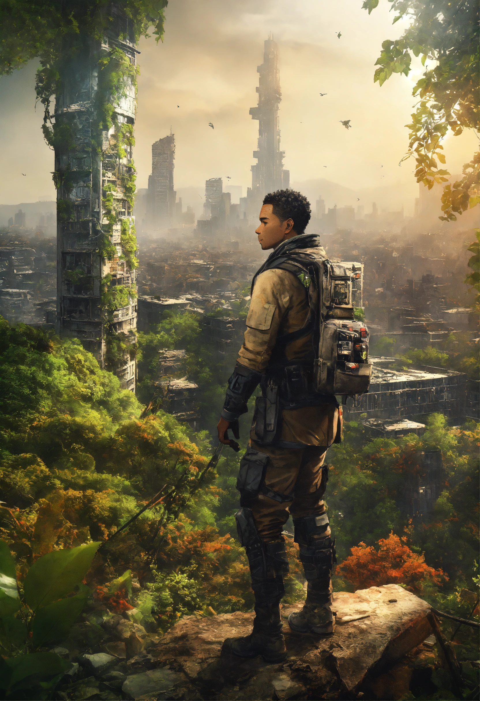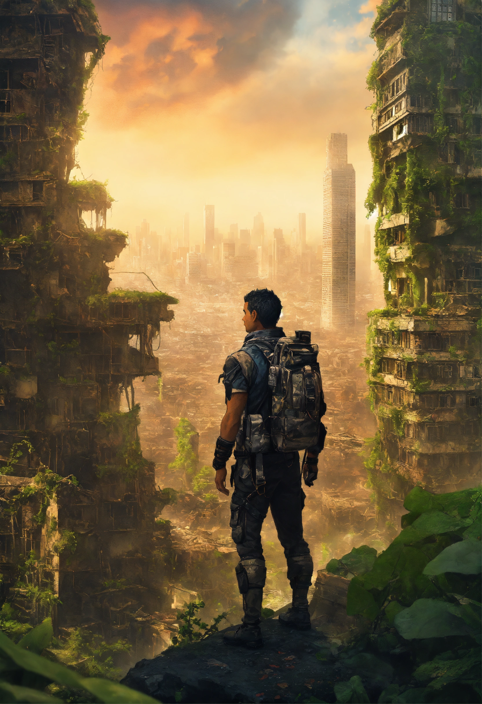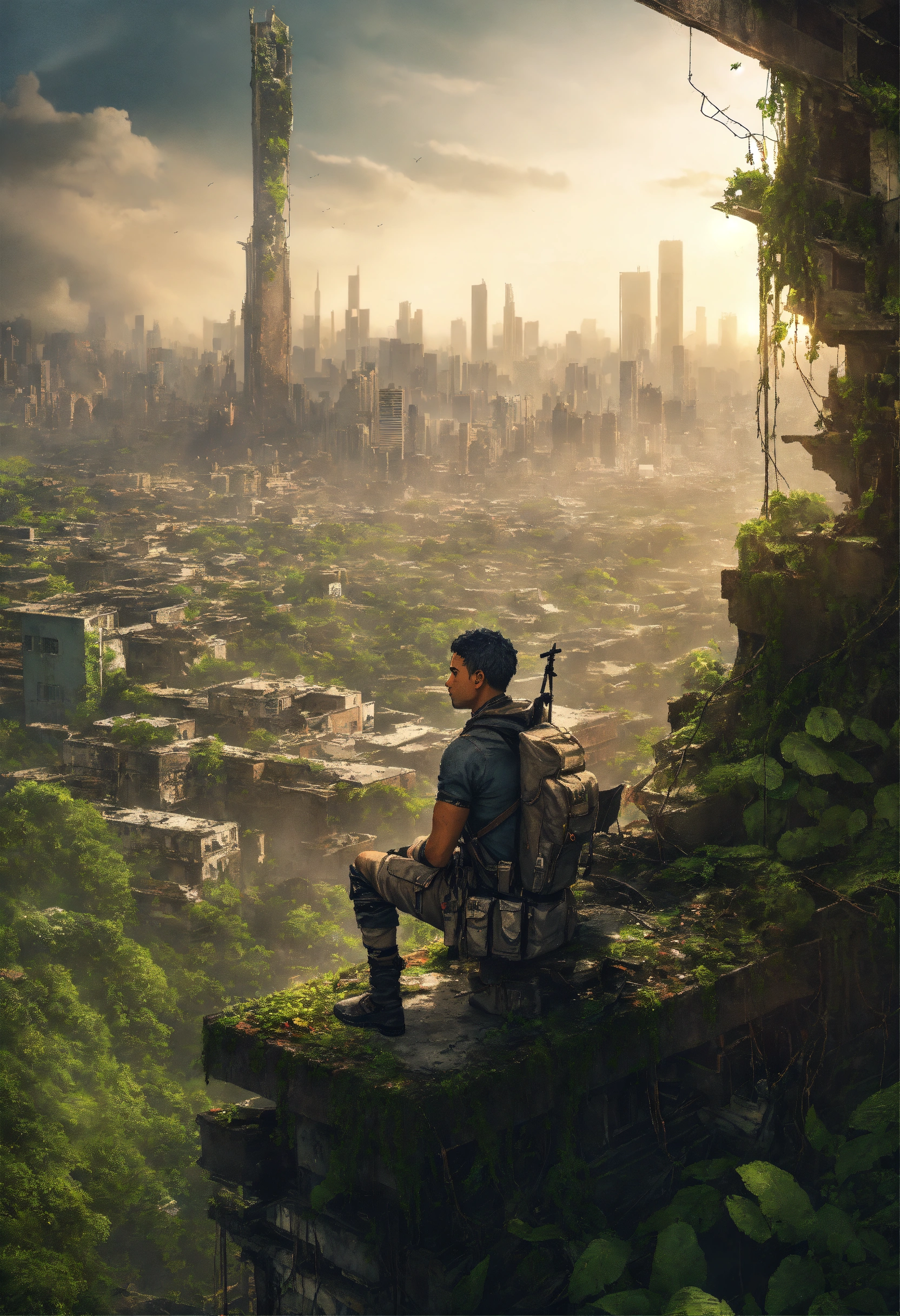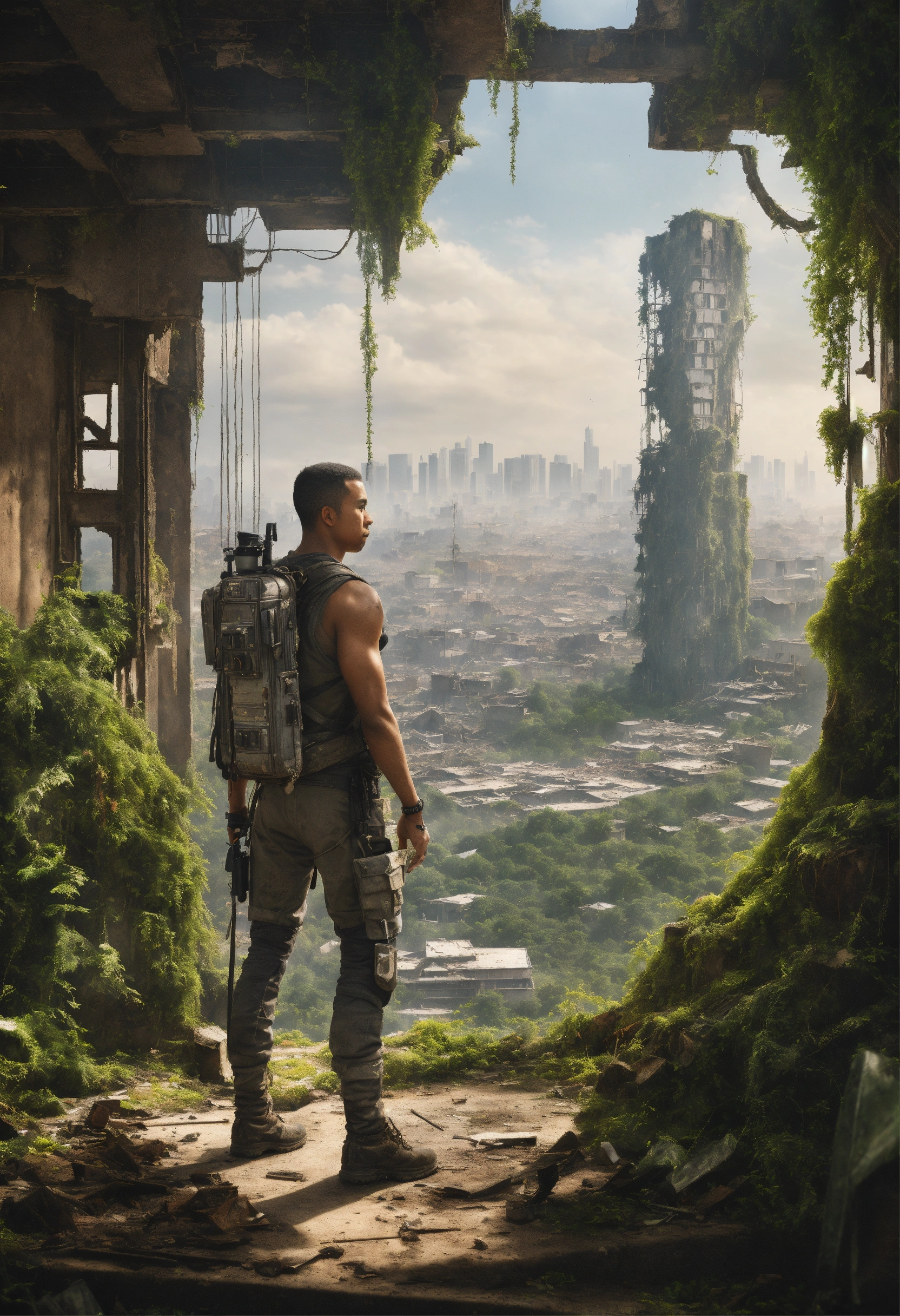 A light tanned mixed race man, black, asian, age 39, with short speckled gray hair, from a distant future, dressed in thin, sleak, next generation survival gear looks out over a desolate, full body shot, ruined city, densely packed, dilapidated, foliage, overgrown, hanging vines, crumbling skyline. 9000 years have past and the world that was is no more. post-apocalyptic. for countless miles all there is are buildings covered in foliage, a ruined ultra-high technology civilization has collapsed, buildings are thousands of years old, weathered, eroded and falling apart