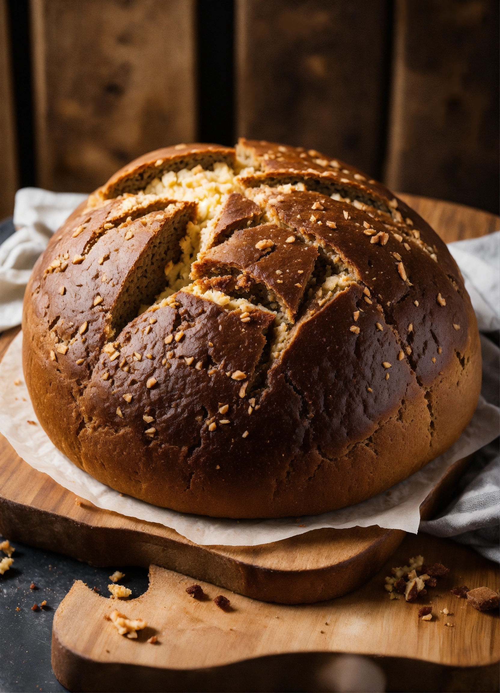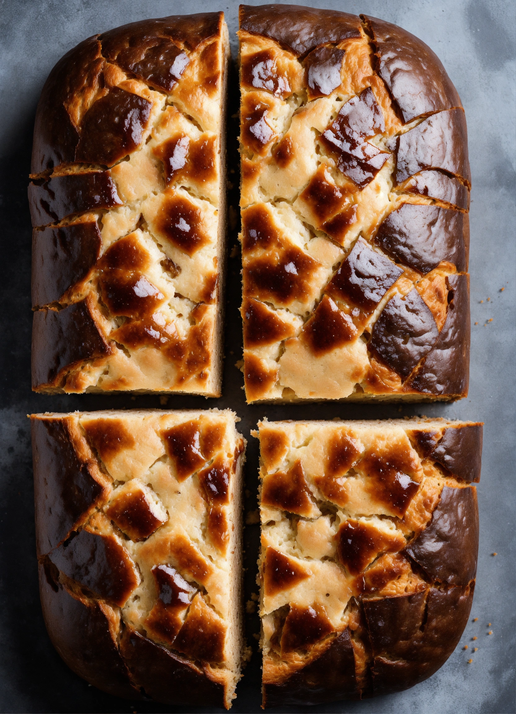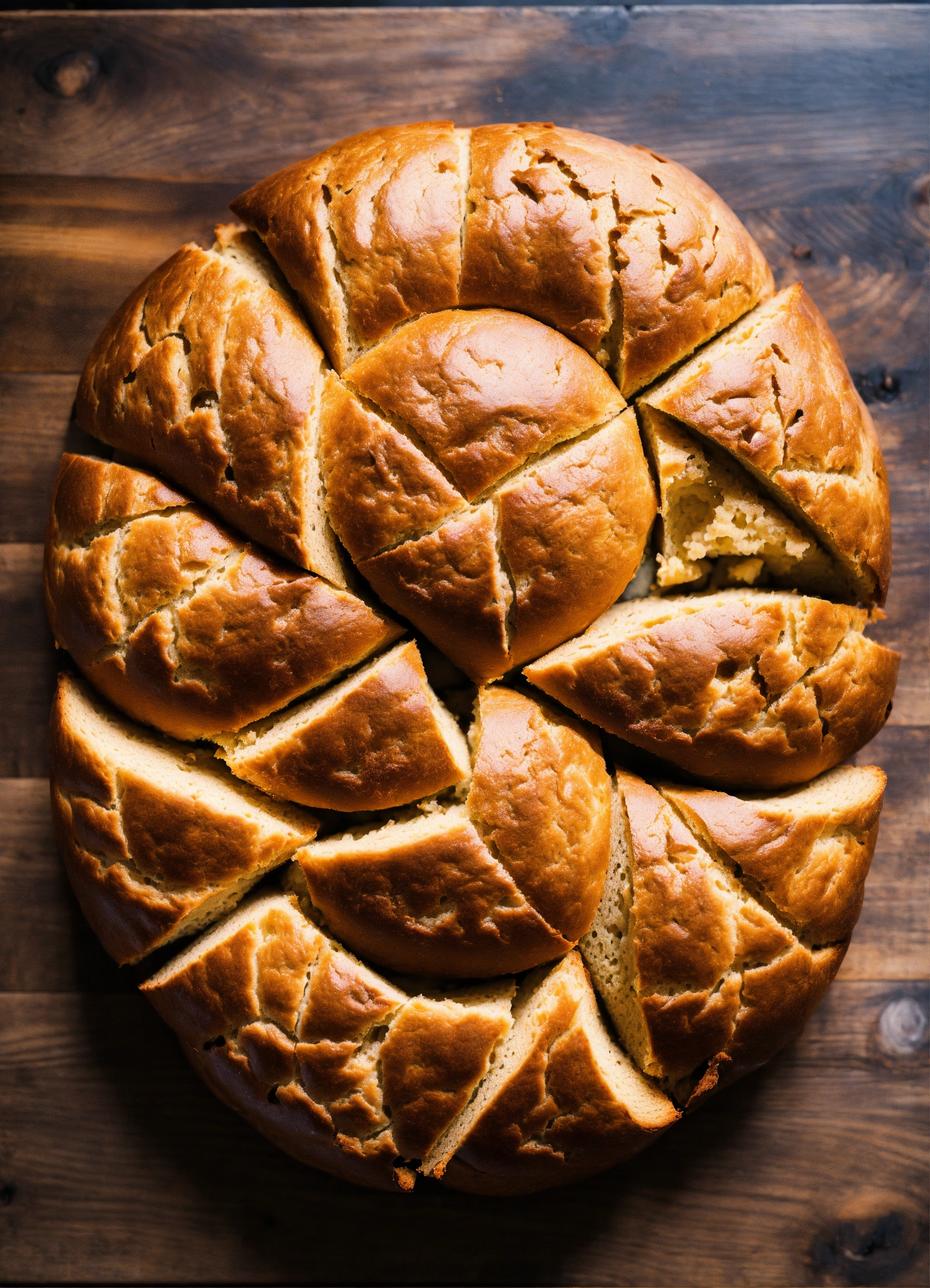 One loaf of dark round-shaped bread picture view from the top, divided into 6 uneven slices and looking like chart pie.