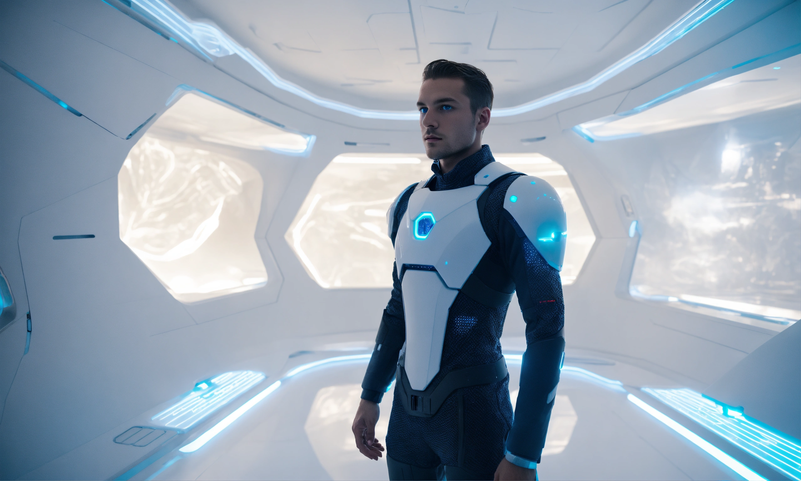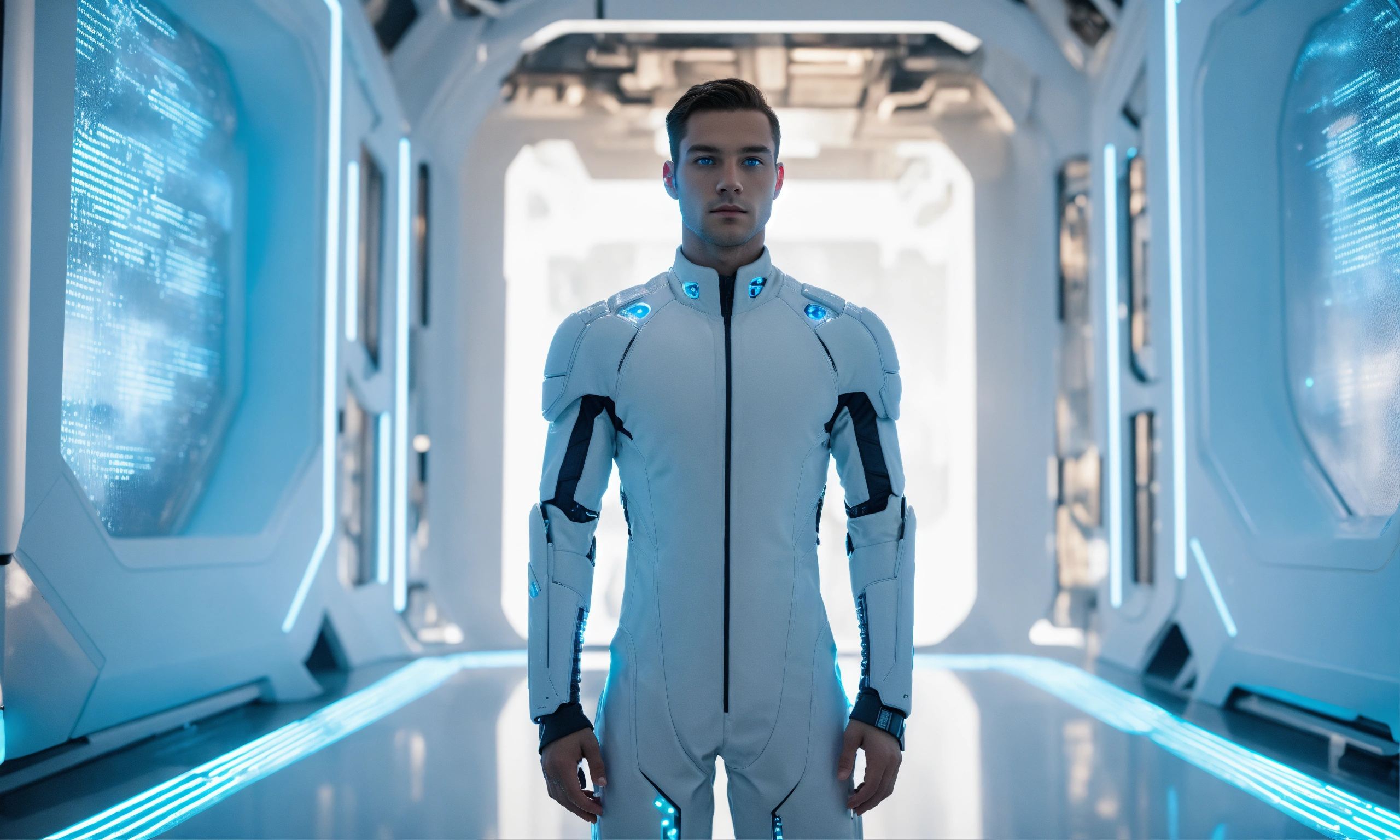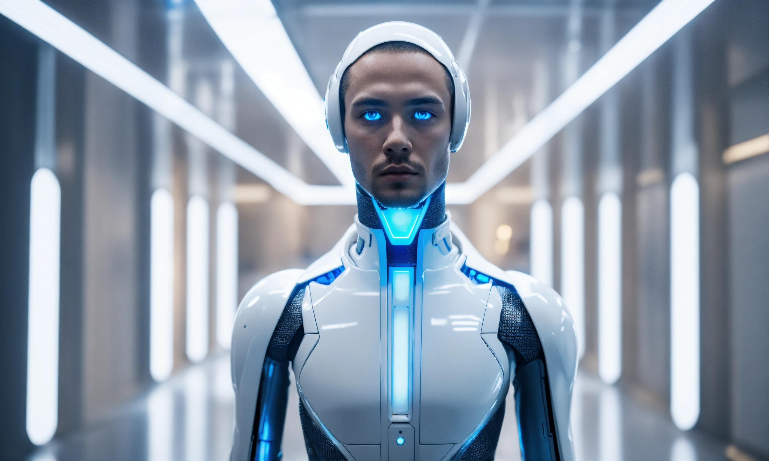 Human looking male android standing in a white futuristic room with glowing blue eyes