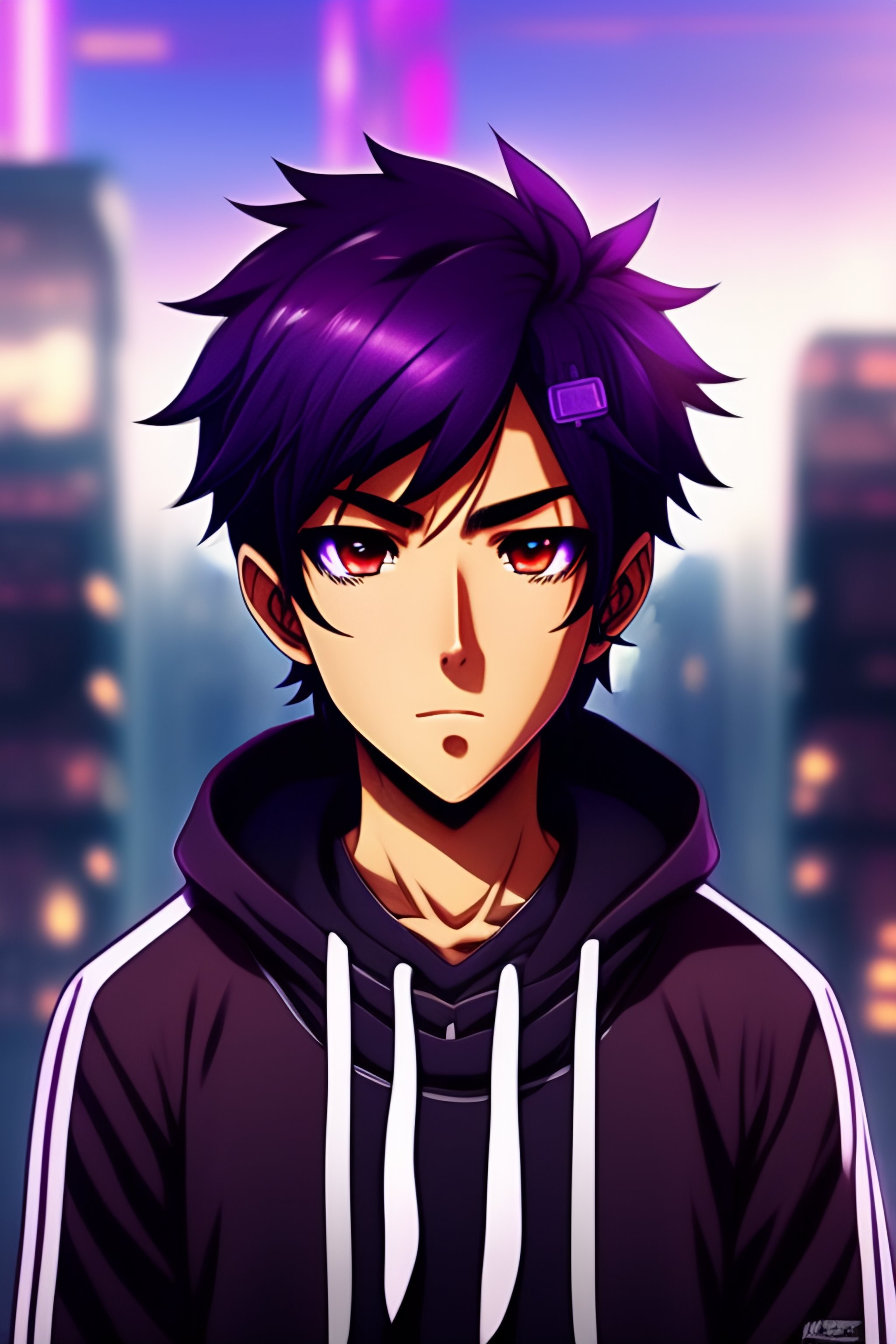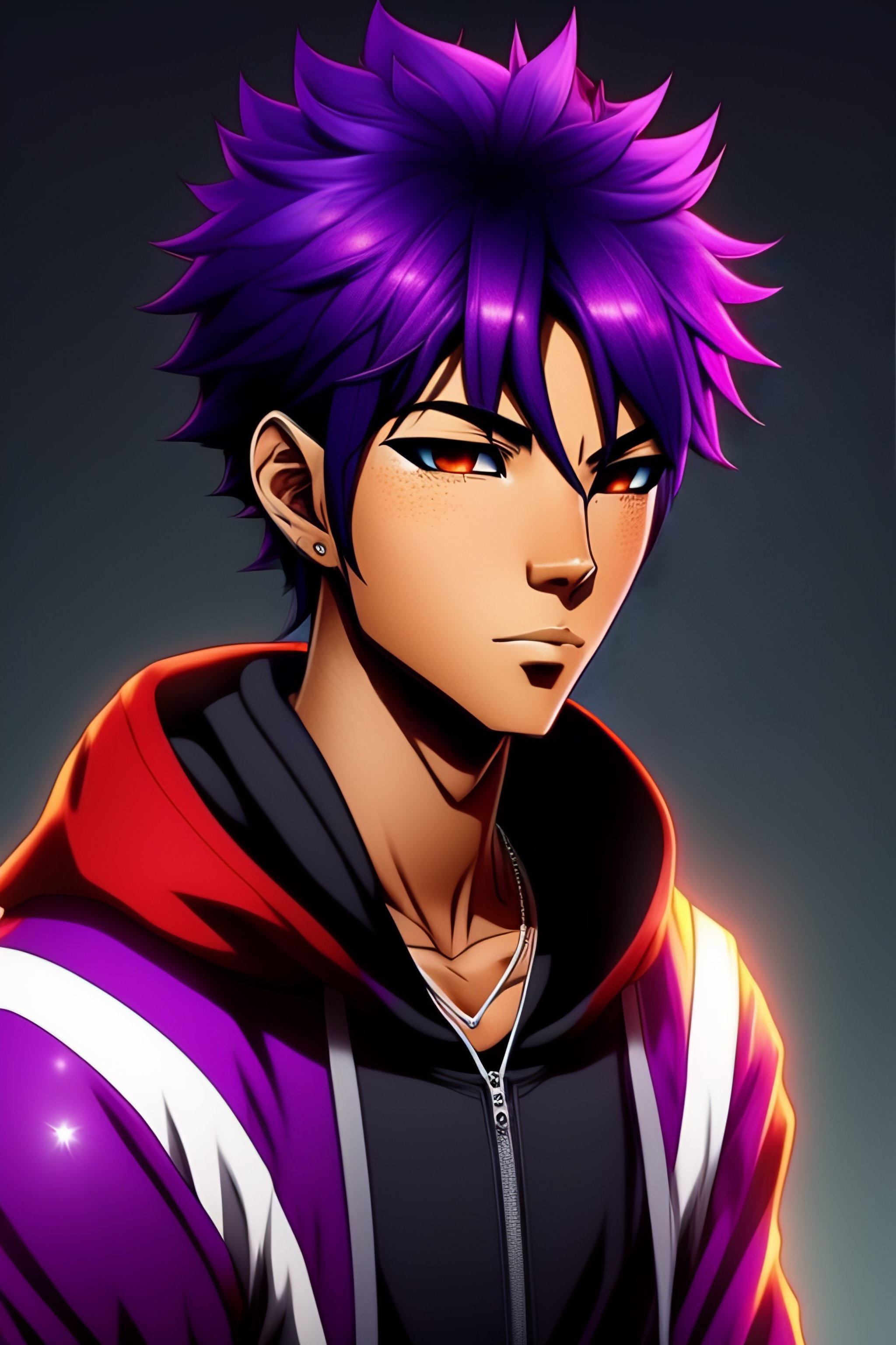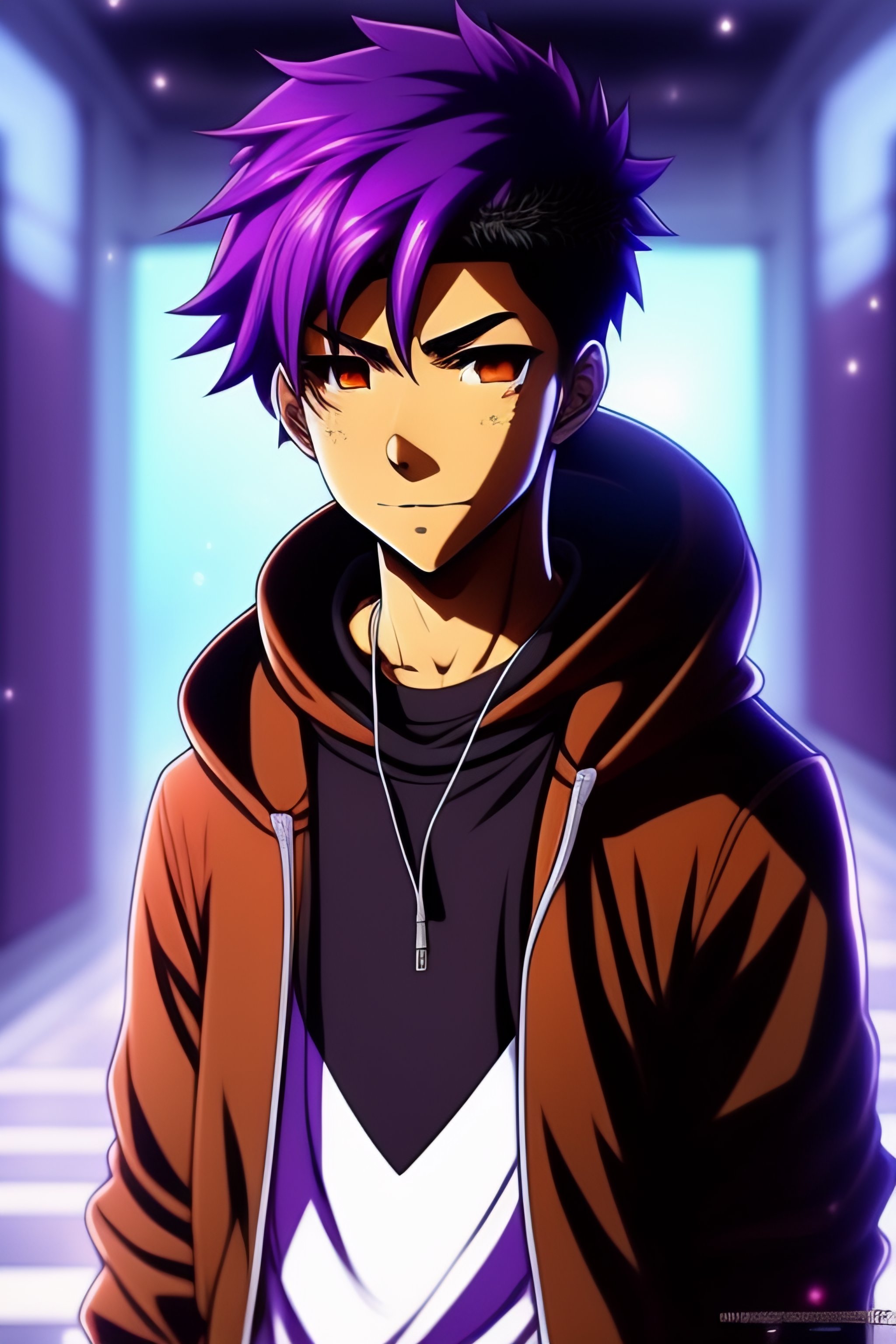 Purple hair anime brown guy, dark skin, brown face, hoodie, light brown skin, hacker, no expression, no emotion, anime style, manga, cartoon, anime