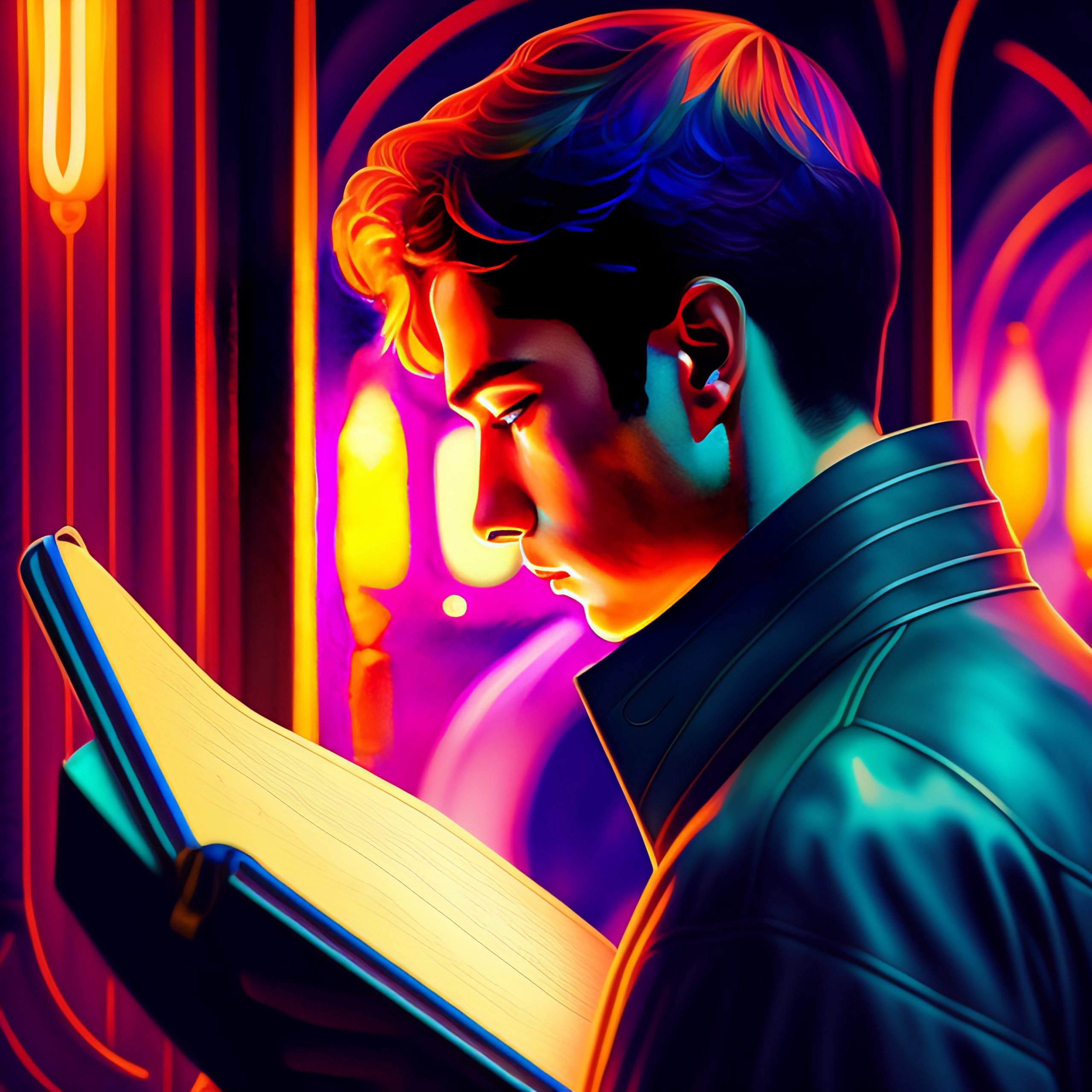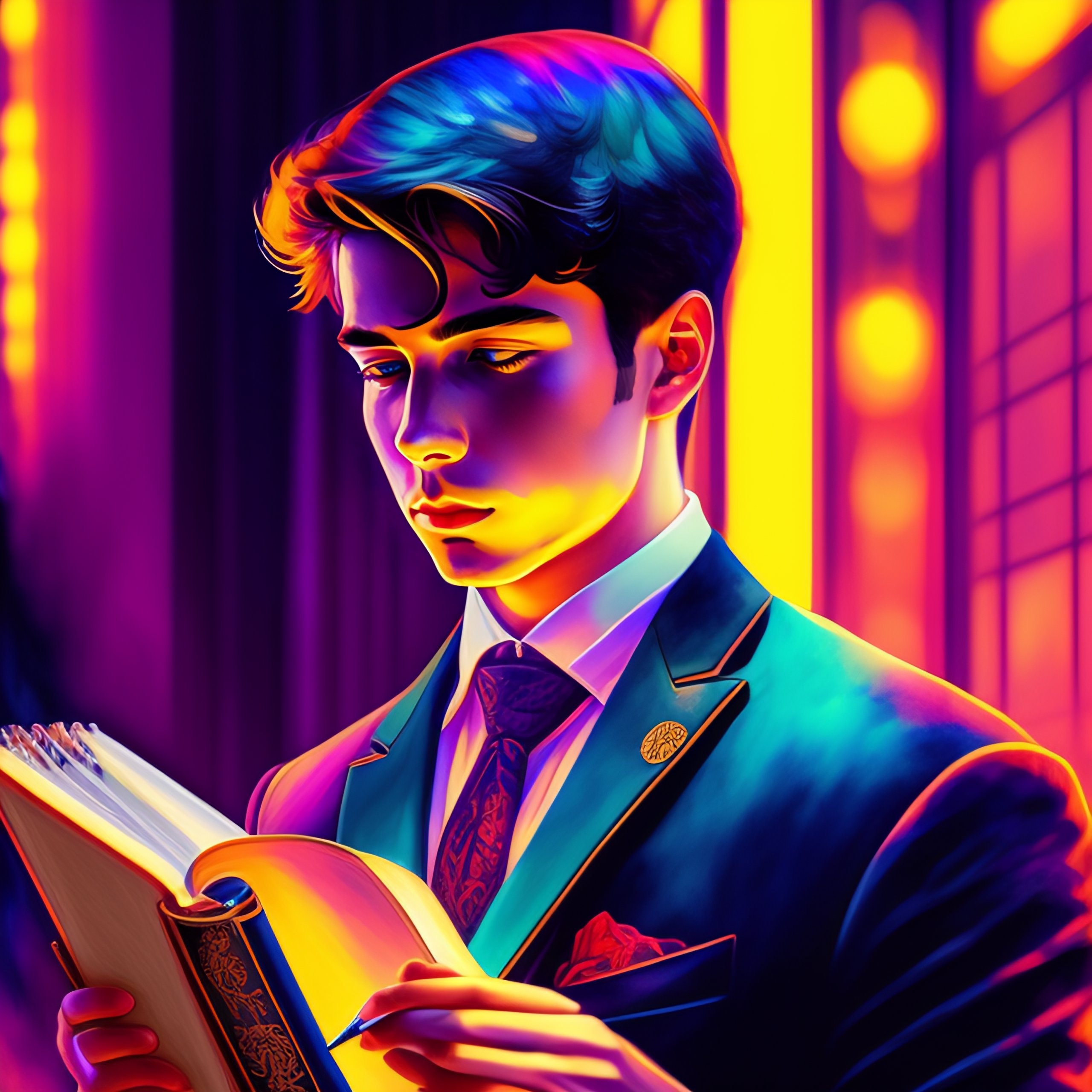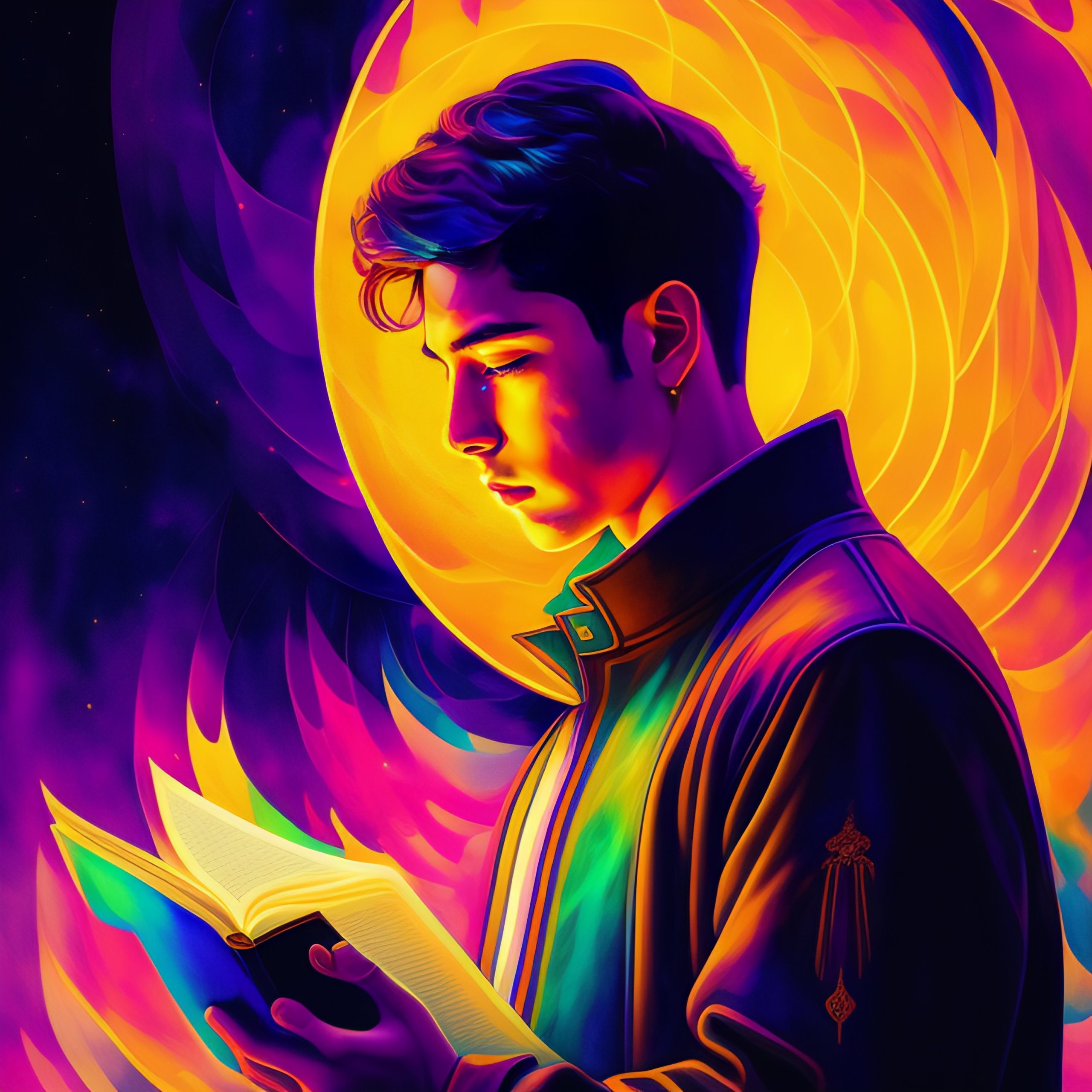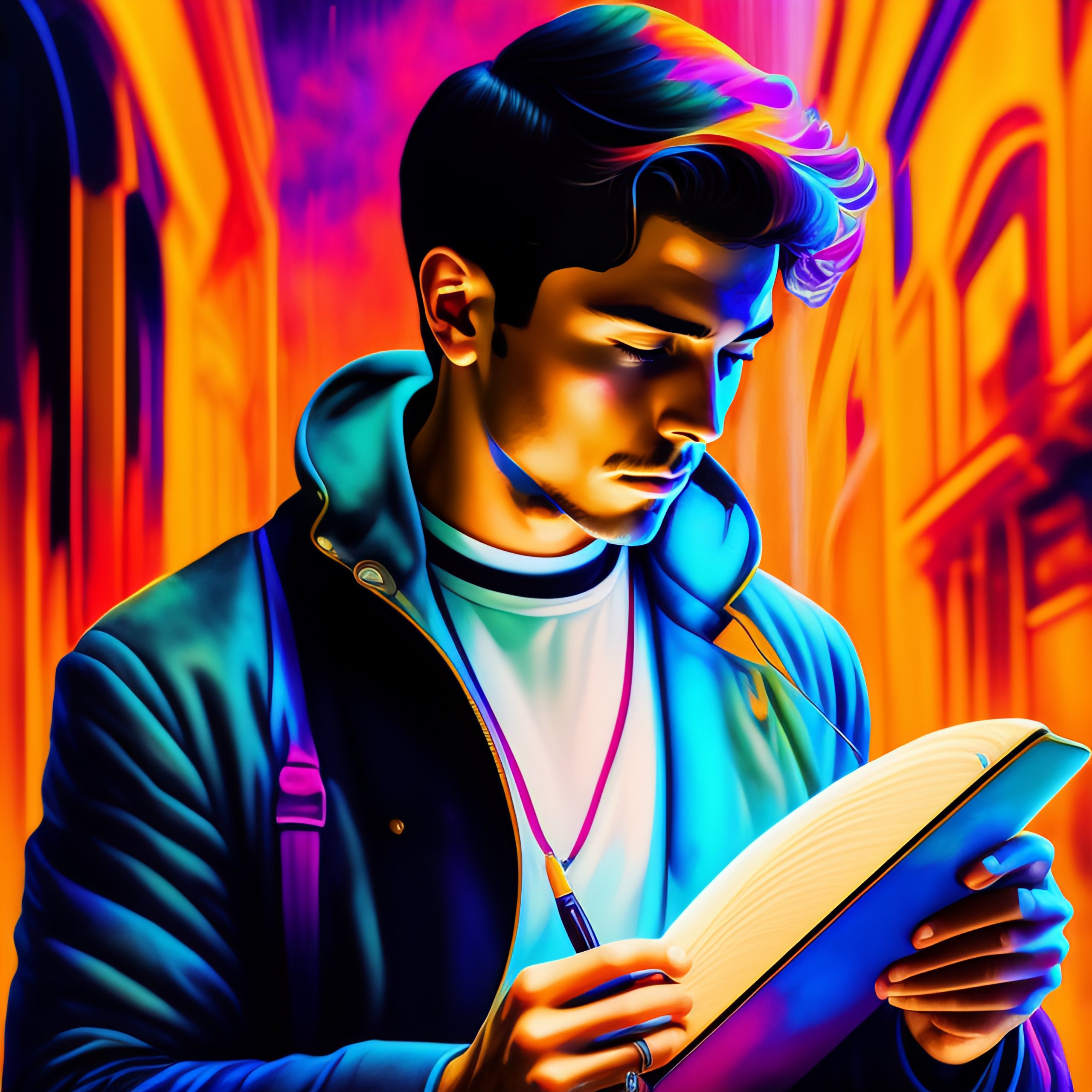 Self reflecting young man taking notes in a journal. in art-nouveau style. 18mm portrait, sharpen focus, serious, watercolor explosion, by ilya kuvshinov, caravaggio, sci-fi colors, neon lights. detailed line art.