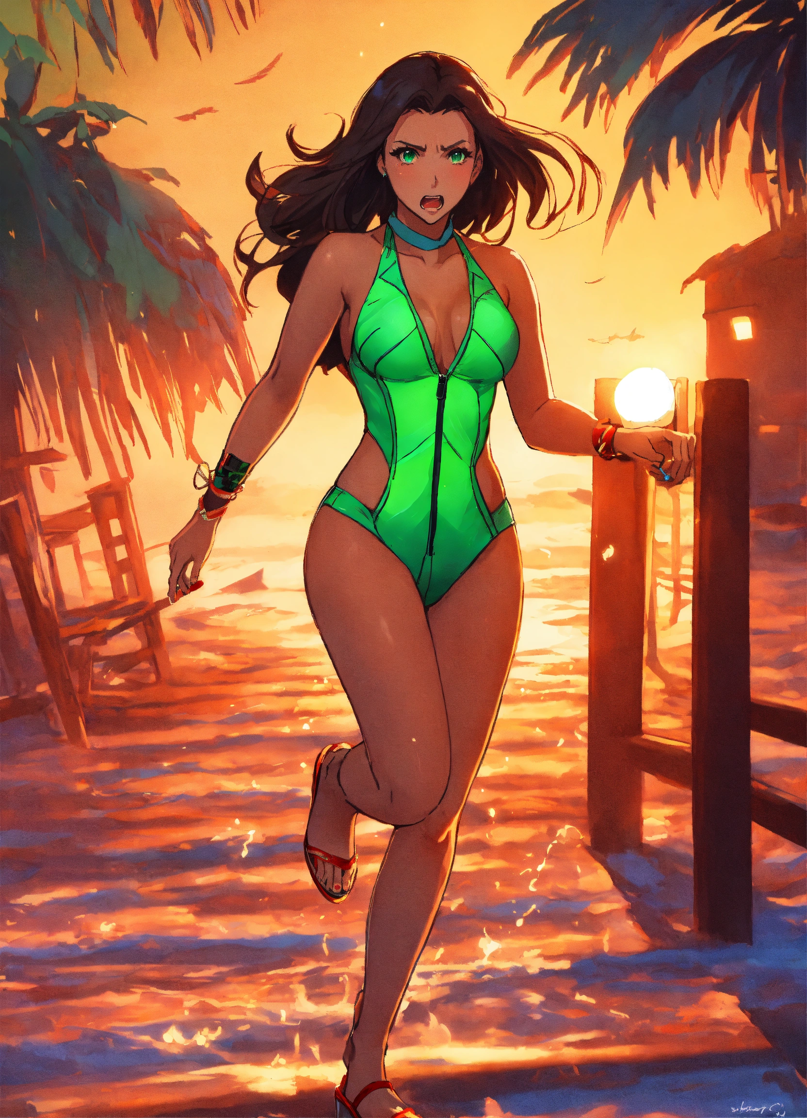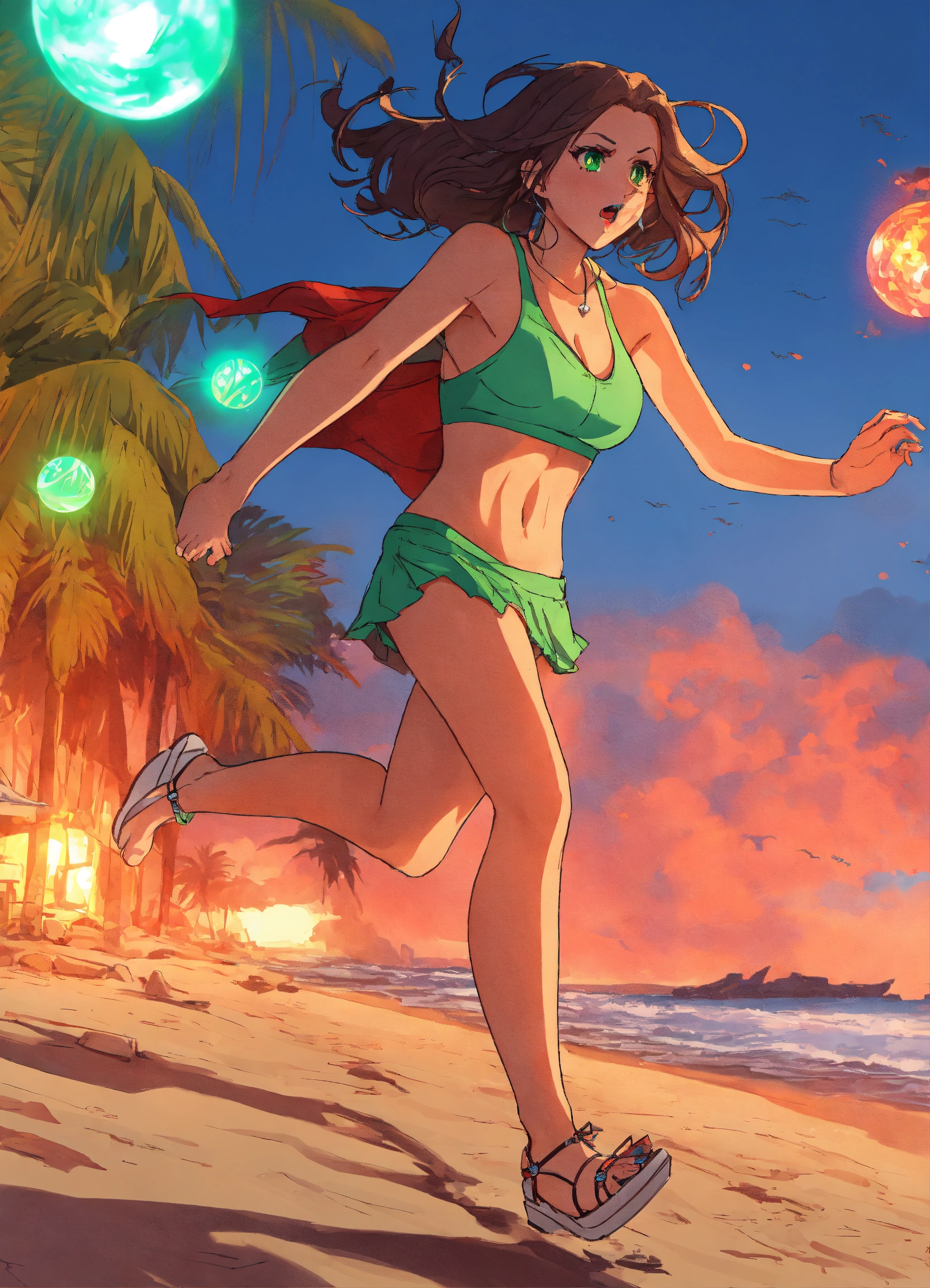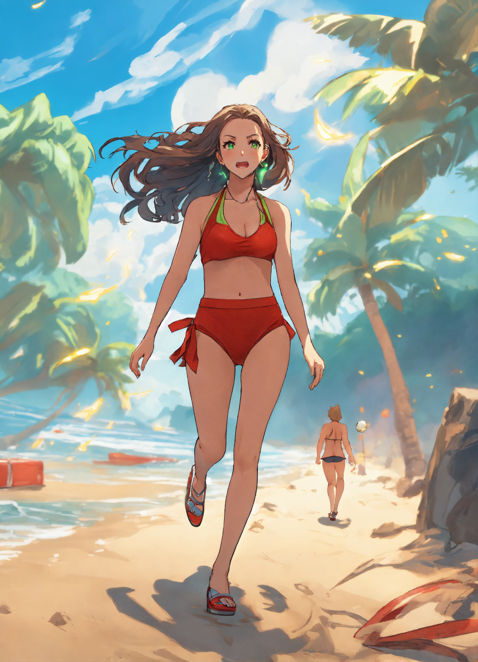 Anime illustration full body image of scared and afraid lacey chabert with neon green glowing eyes, being chased and running away from a tiny blue smoky orb with a smoky trail, on a daytime beach wearing a red two-piece swim suit, wearing wedges, shein short cover up skirt, wearing wedges, walking out, angry, swim suit, wearing wedges on feet, heavy makeup, wedge heels, glowing green eyes