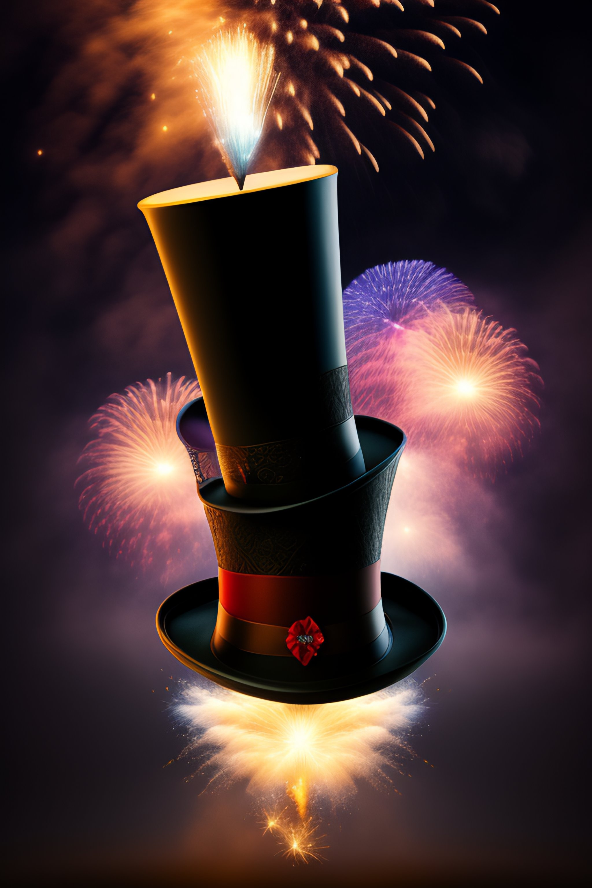 A magician's top hat turned bottom up, with fireworks exploding from inside of it and raffle tickets flying out of it
