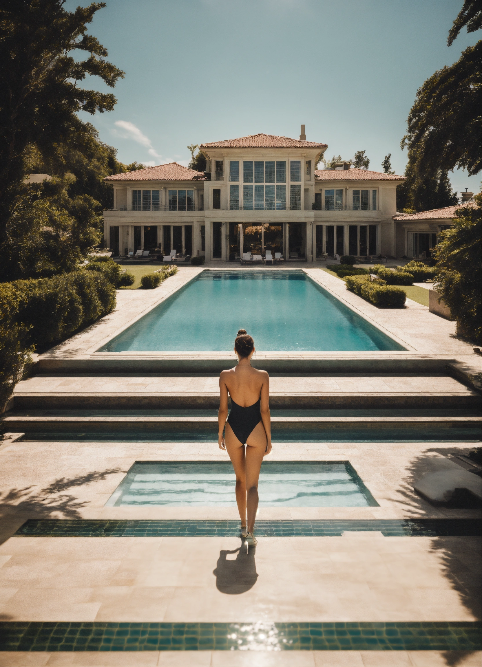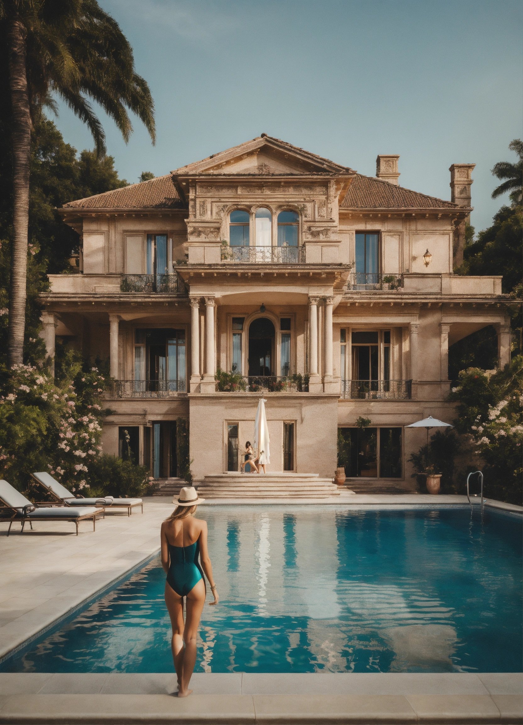 Luxury mansion at the swimming pool with a fashion model at a distance