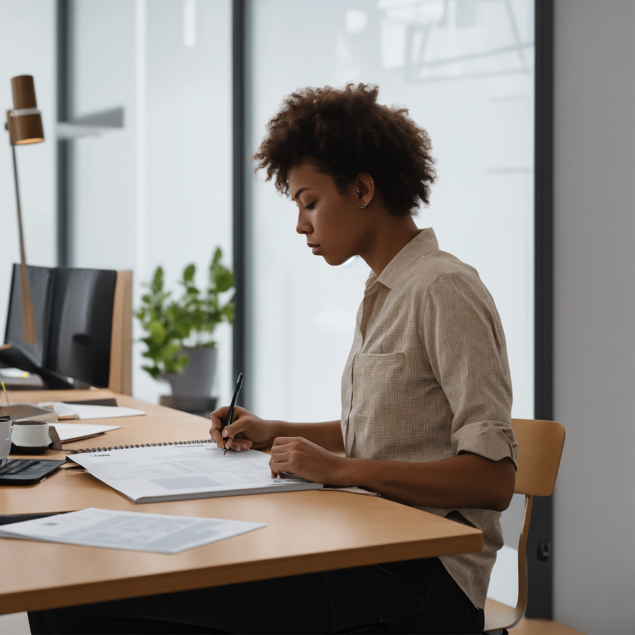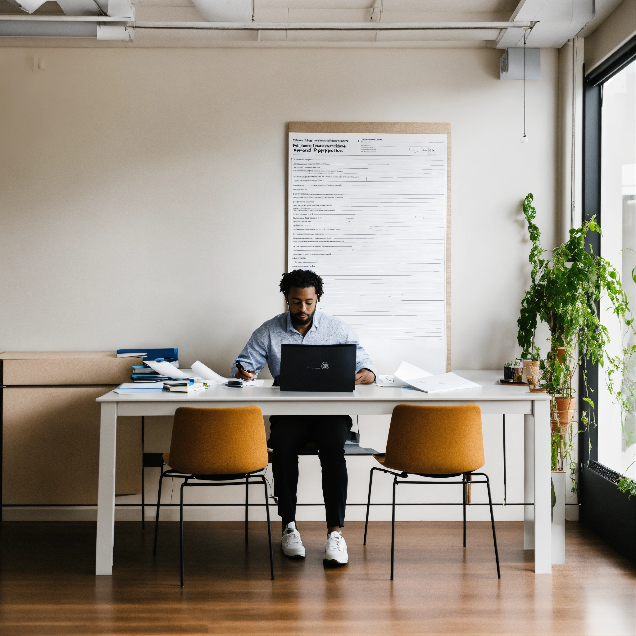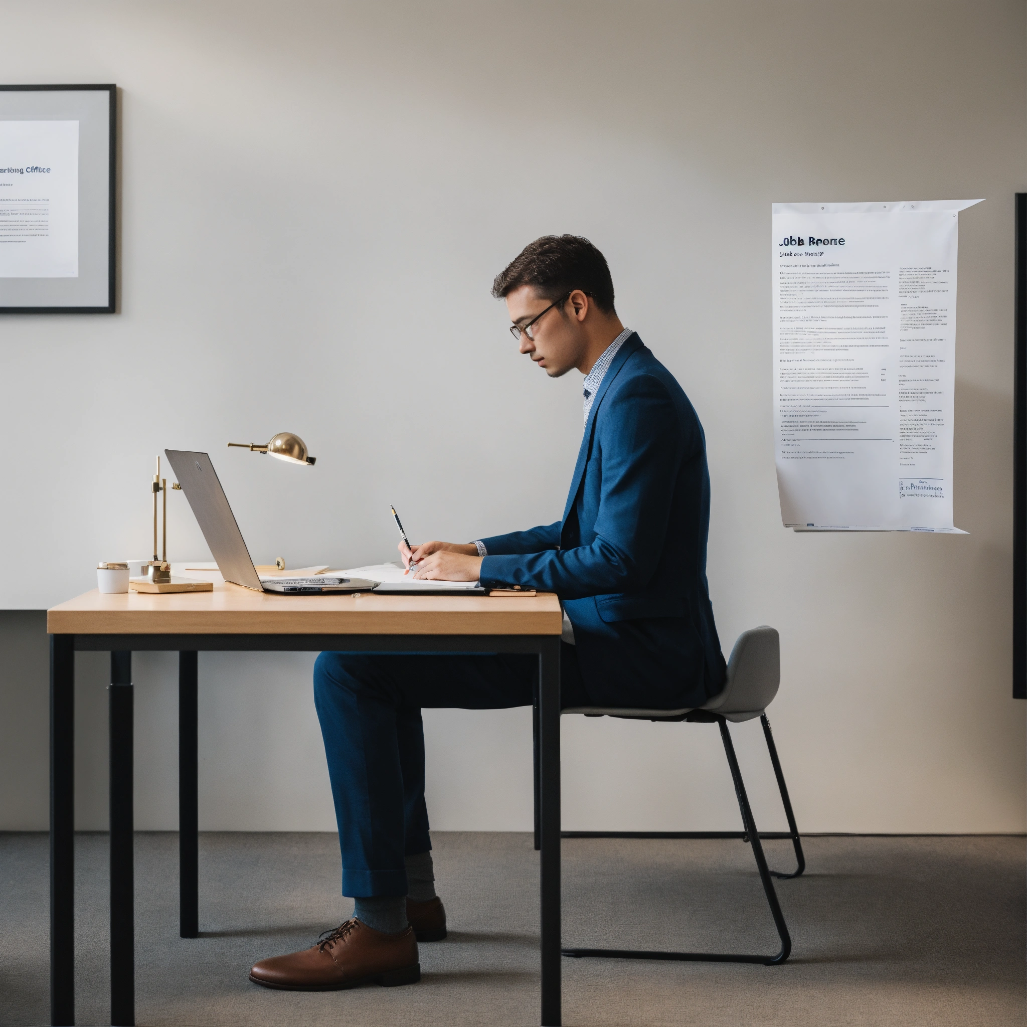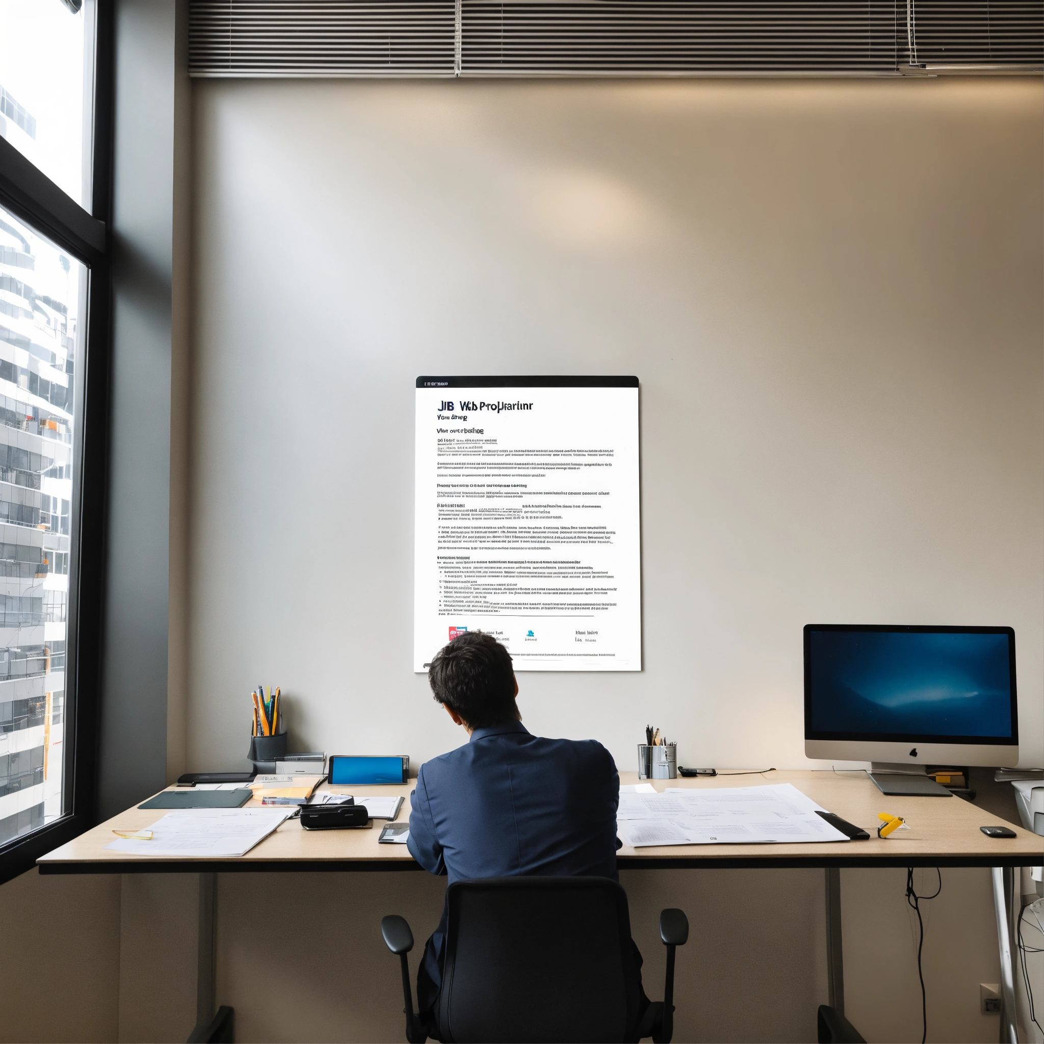 A photo of a person reading a job posting, the person is sitting at a desk in an office, the background is a blank white wall