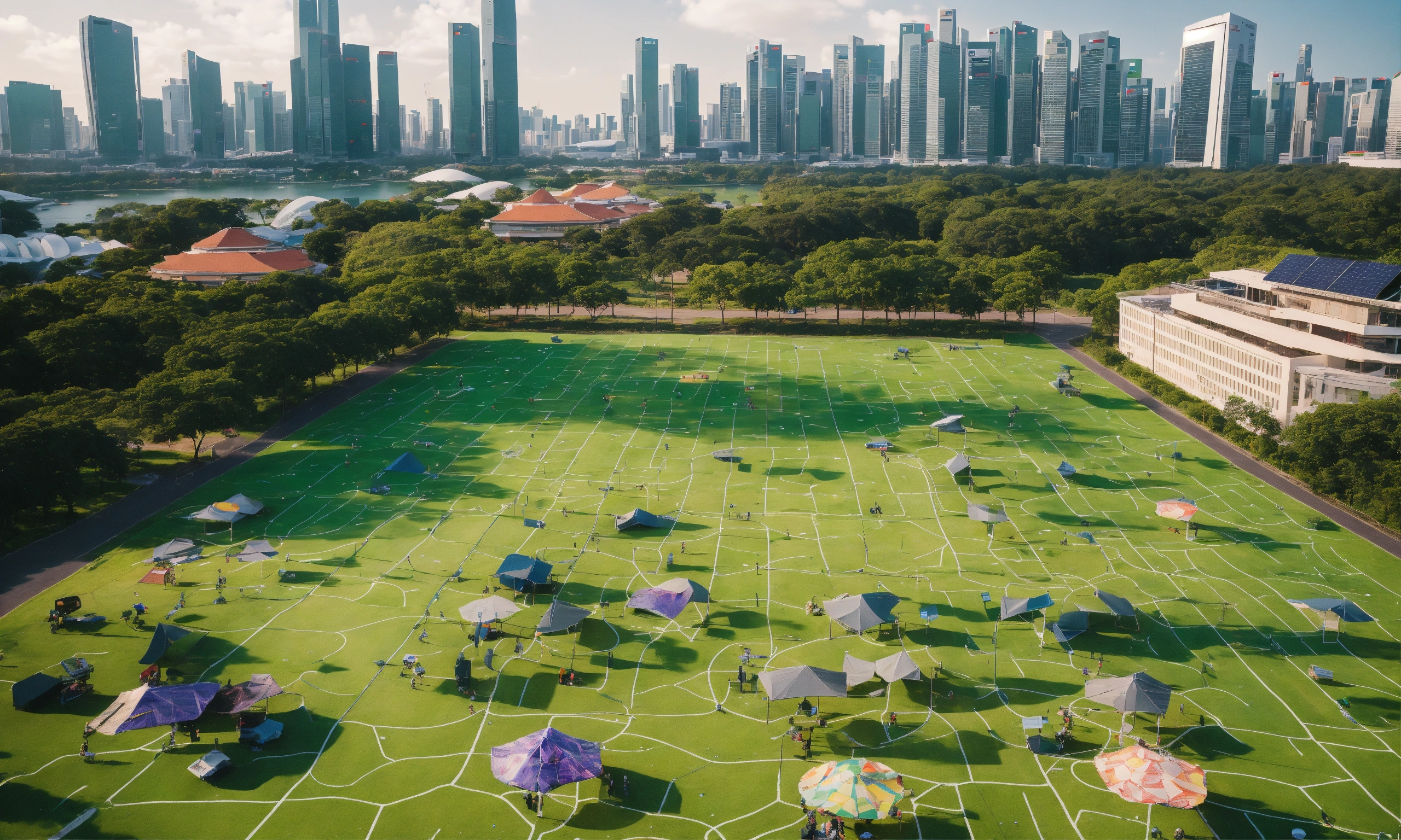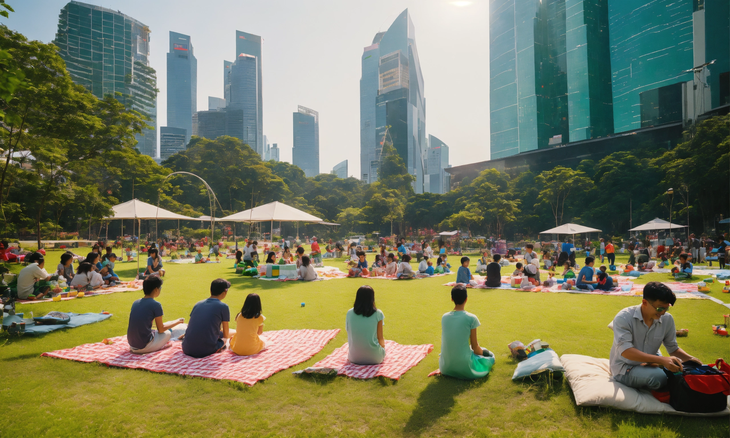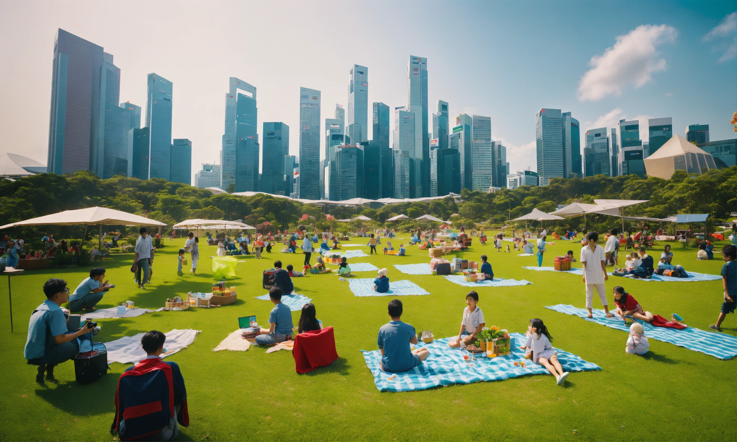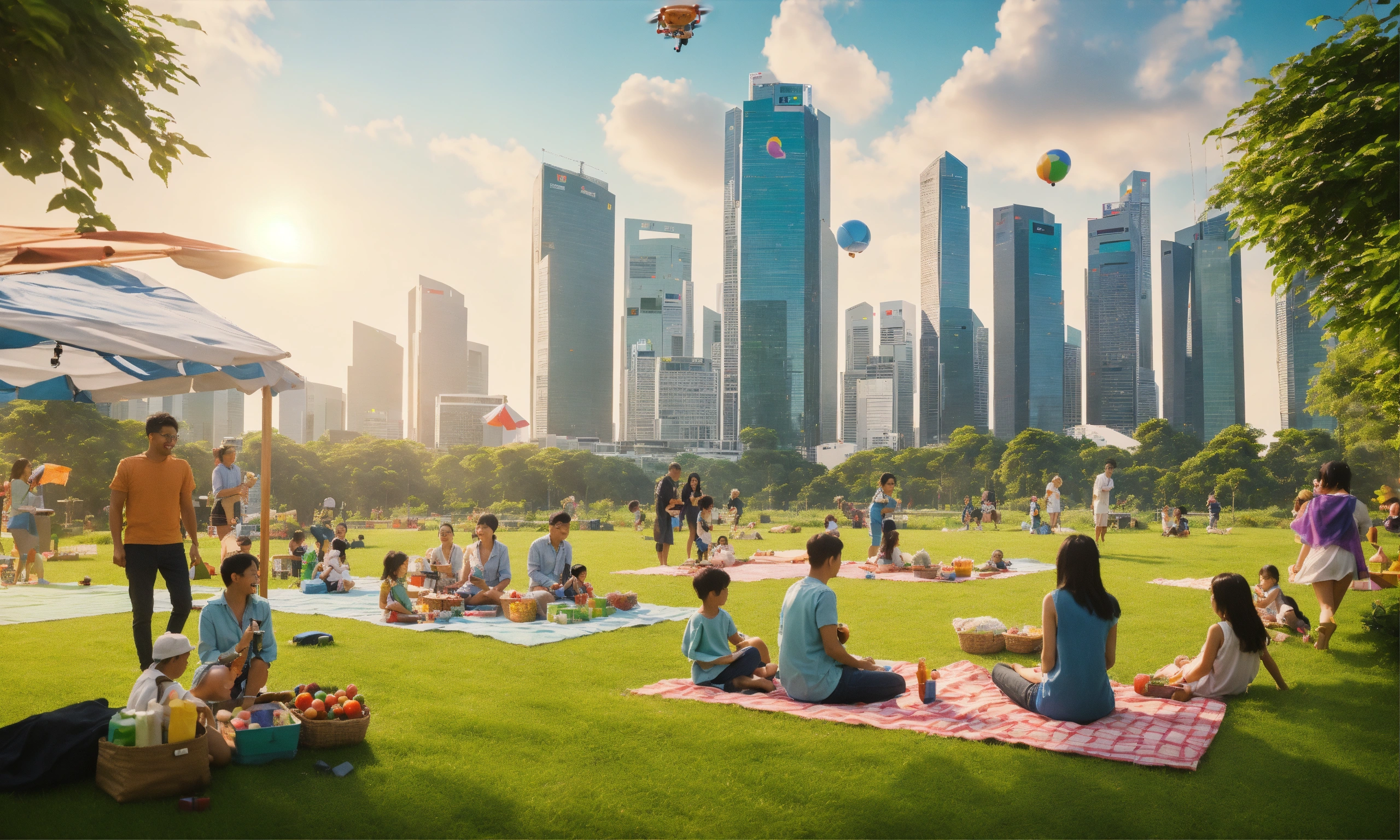 Midday, realistic, wide-angle shot of a technologically advanced green field, picnic blankets with integrated touch screens, drones delivering food to the families, kids playing with augmented reality toys, in the backdrop, buildings of singapore cityscape with solar panels, 5 families with varying ethnicities, joy, engagement, relaxation, laughter, gathered for conversations, games, picnics, modern nostalgia combined with futurism, vibrant, highly detailed, sunlit with dynamic tech-augmented shadows, 35mm camera for closer yet wide field view, portra 200 film for soft natural colors, slight film grain