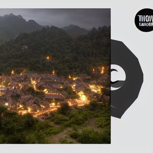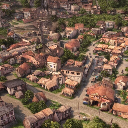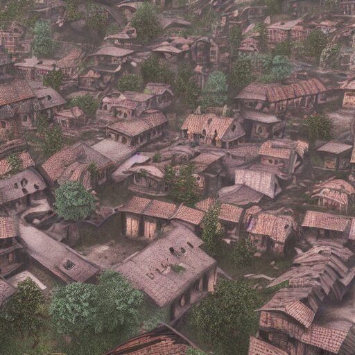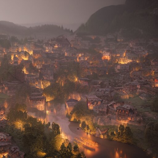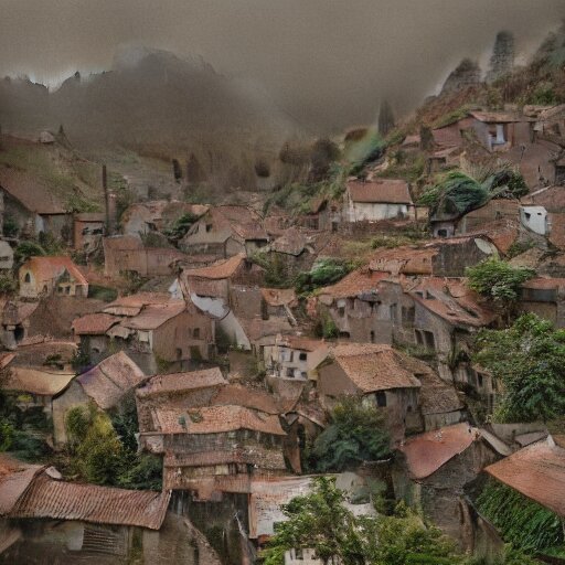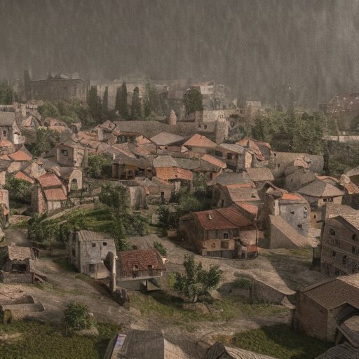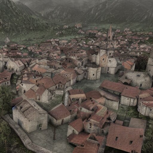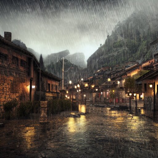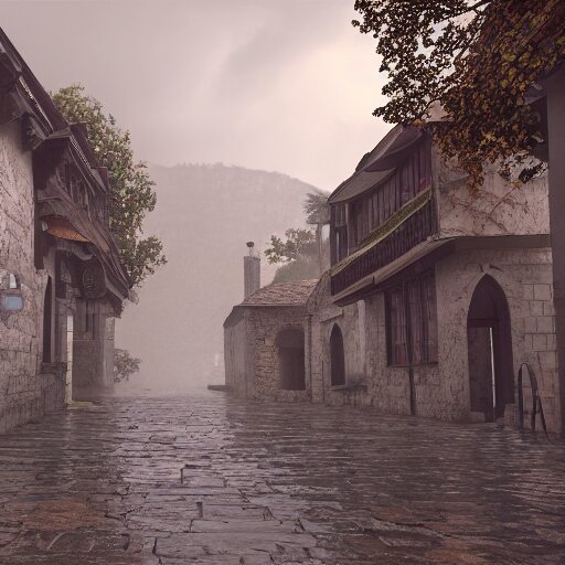 The center of a poor medieval town under heavy rain at late dawn, in a valley, surrounded by mountains, highly detailed, octane render, ultra detailed cinematic, 8 k, widescreen, hd