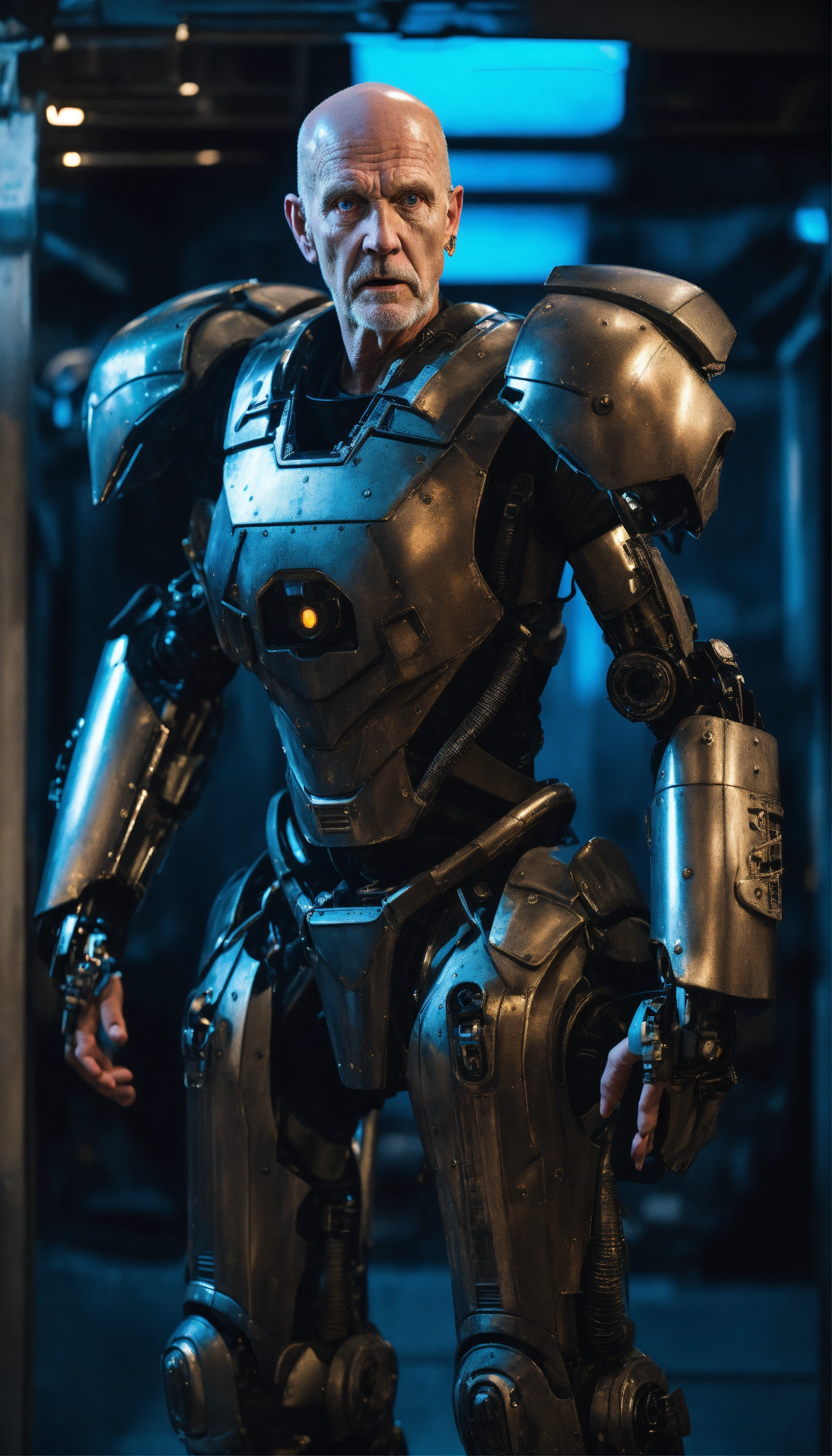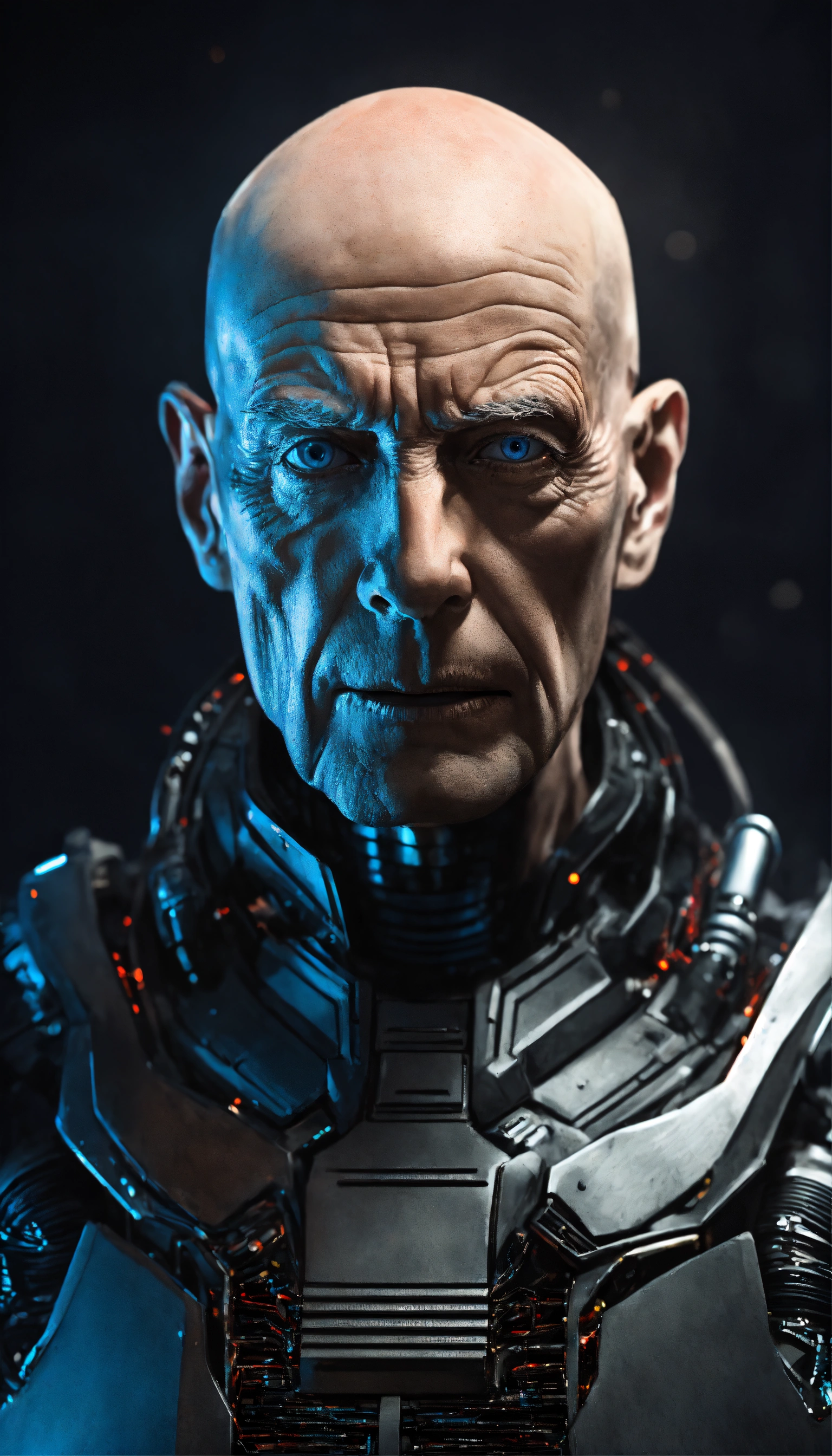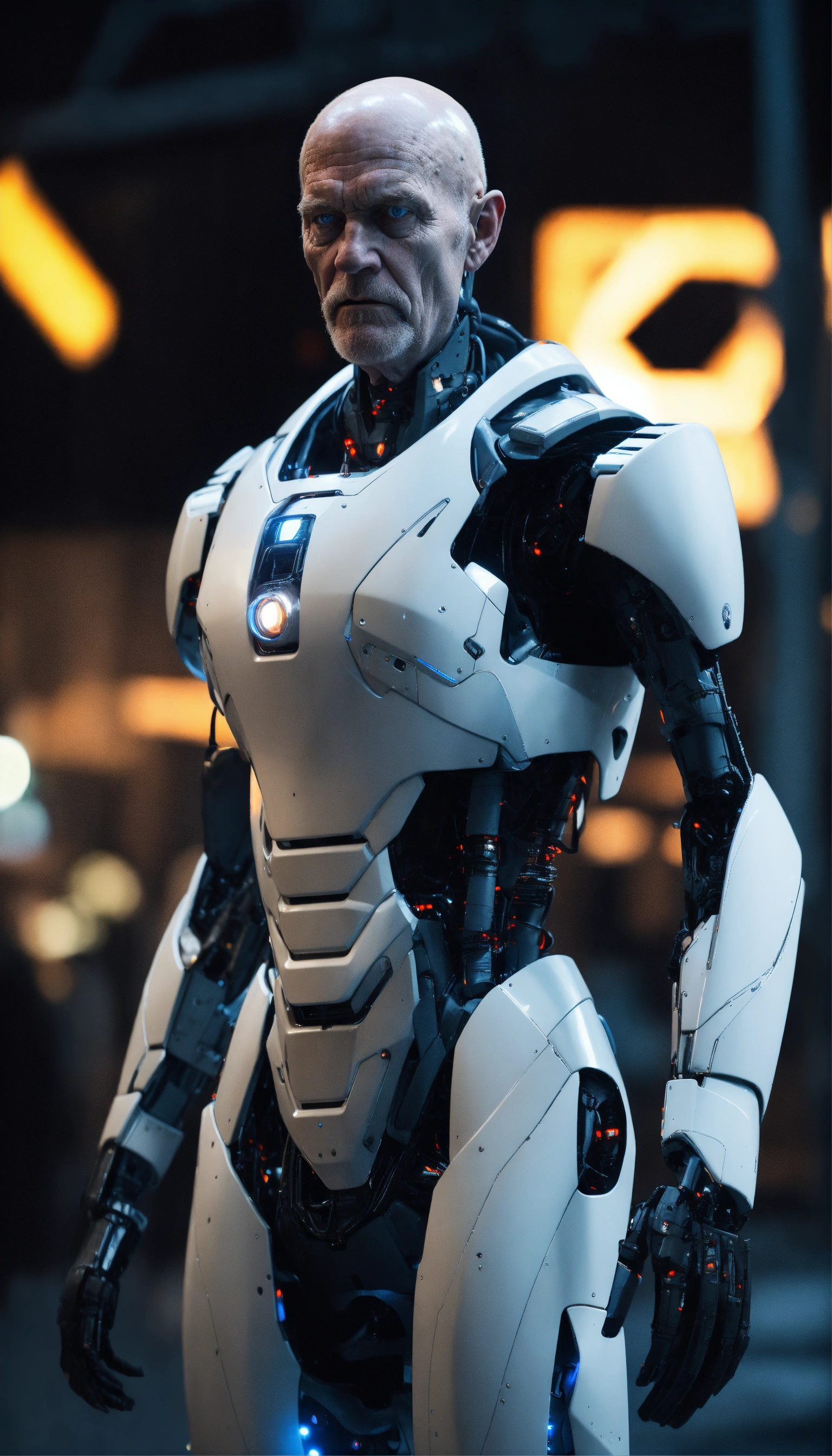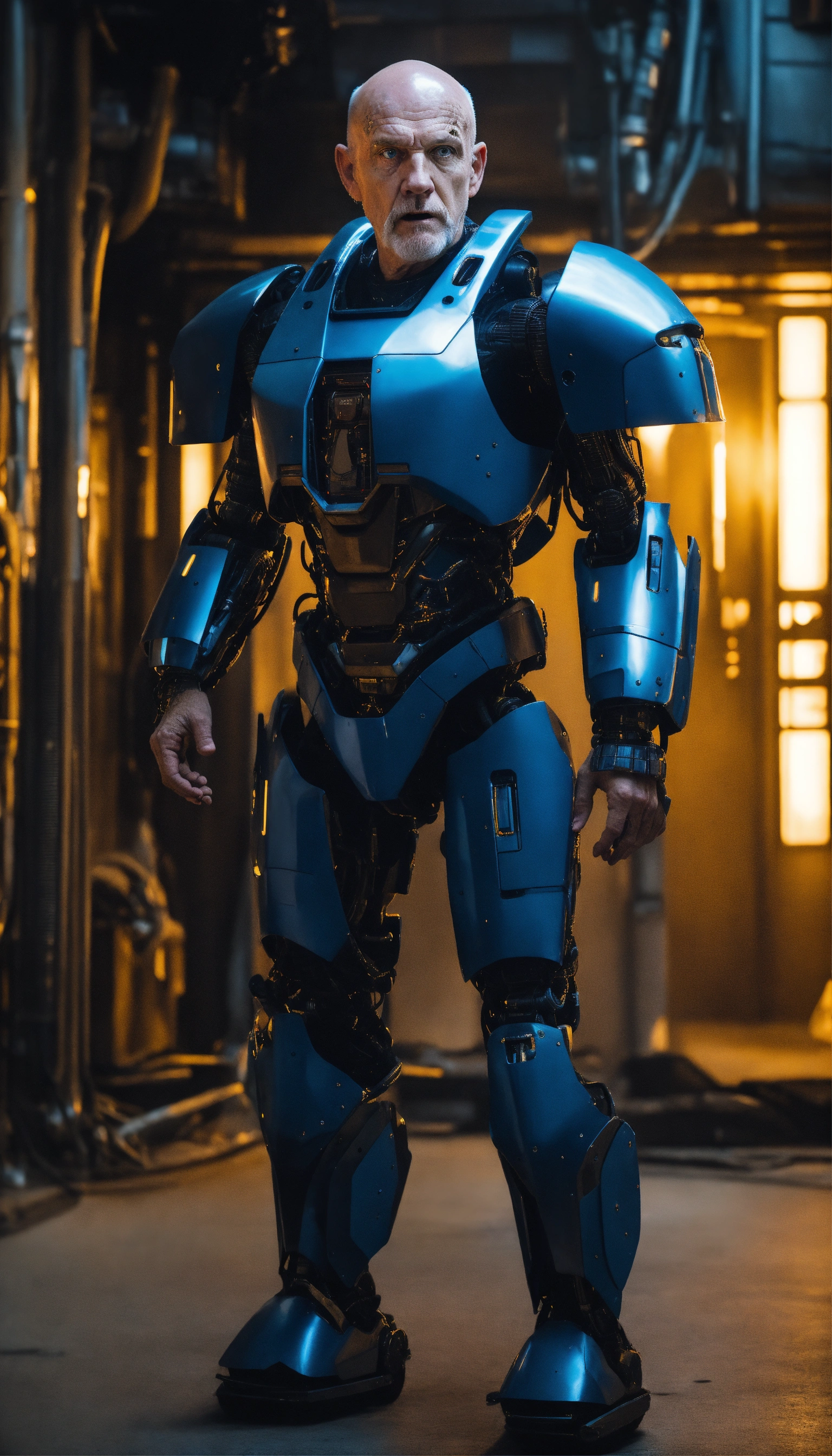 A realistic full body photograph of a creepy 70-year-old white man, with an intimidating expression, bald, no beard, scary ugly face, very thin and decrepit face, deep blue eyes, inside a colossal futuristic robotic black full body armor, dramatic illumination, hyperdetailed, hyperrealistic, 8 k