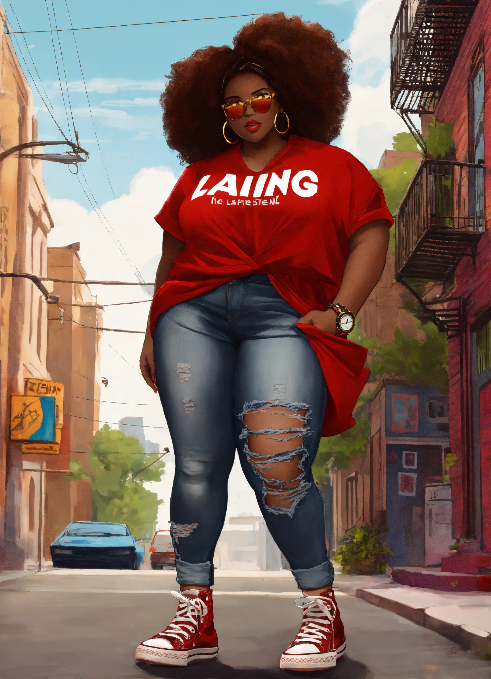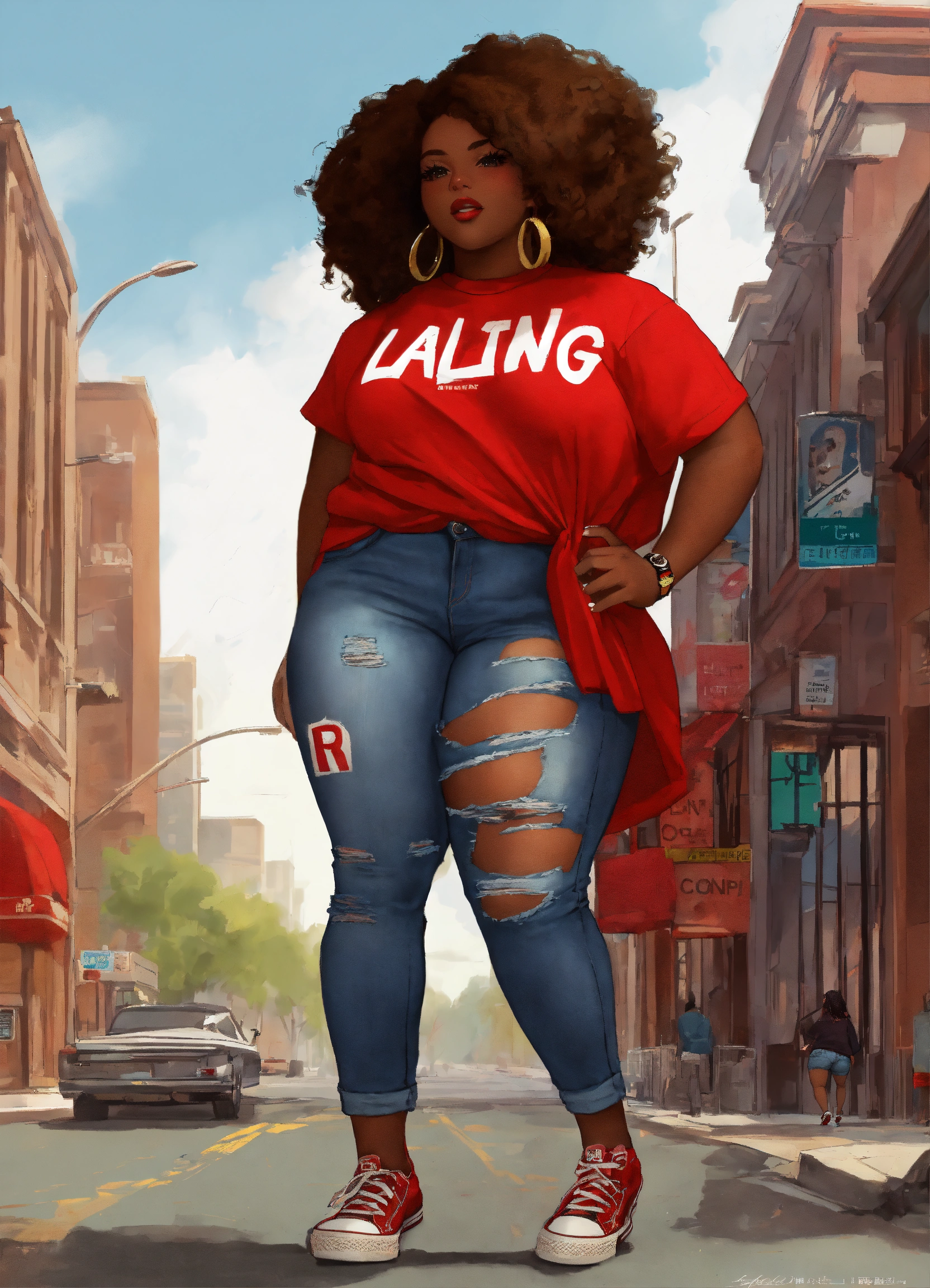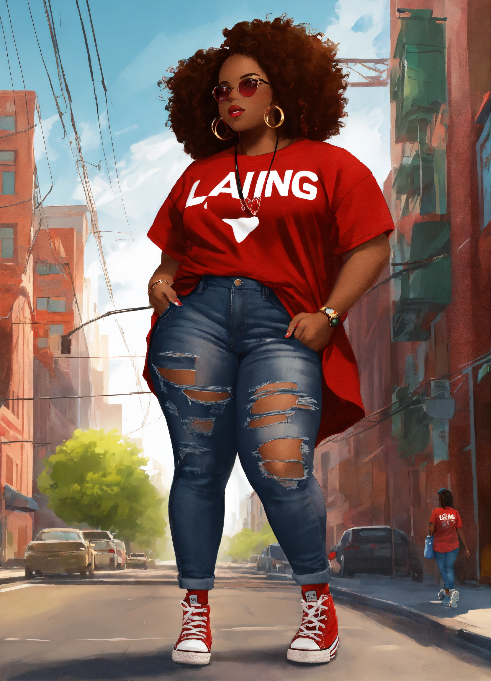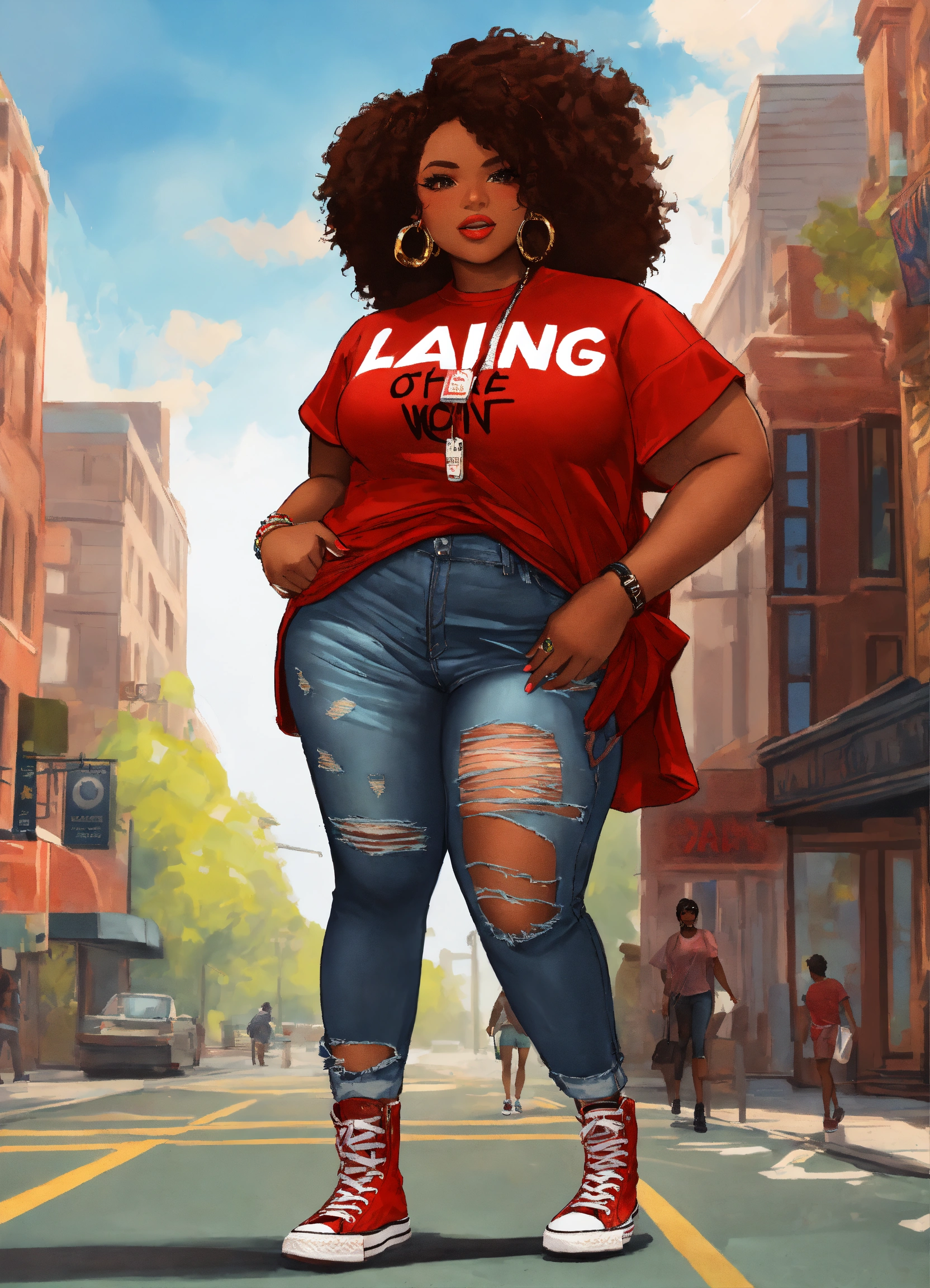 In the vibrant streets of the city, a confident digital illustrated chibi style plus size african american woman strolled with grace. her attire spoke volumes about her unique style and personality. a crimson tee shirt adorned her figure, proudly displaying the word "laing" in bold letters, a symbol of her individuality. complementing her top, she wore distressed jeans that exuded a sense of edginess and rebellion. with every step she took, her red converse tennis shoes echoed her determination and resilience. this woman was a walking masterpiece, effortlessly blending fashion and culture into a captivating ensemble.