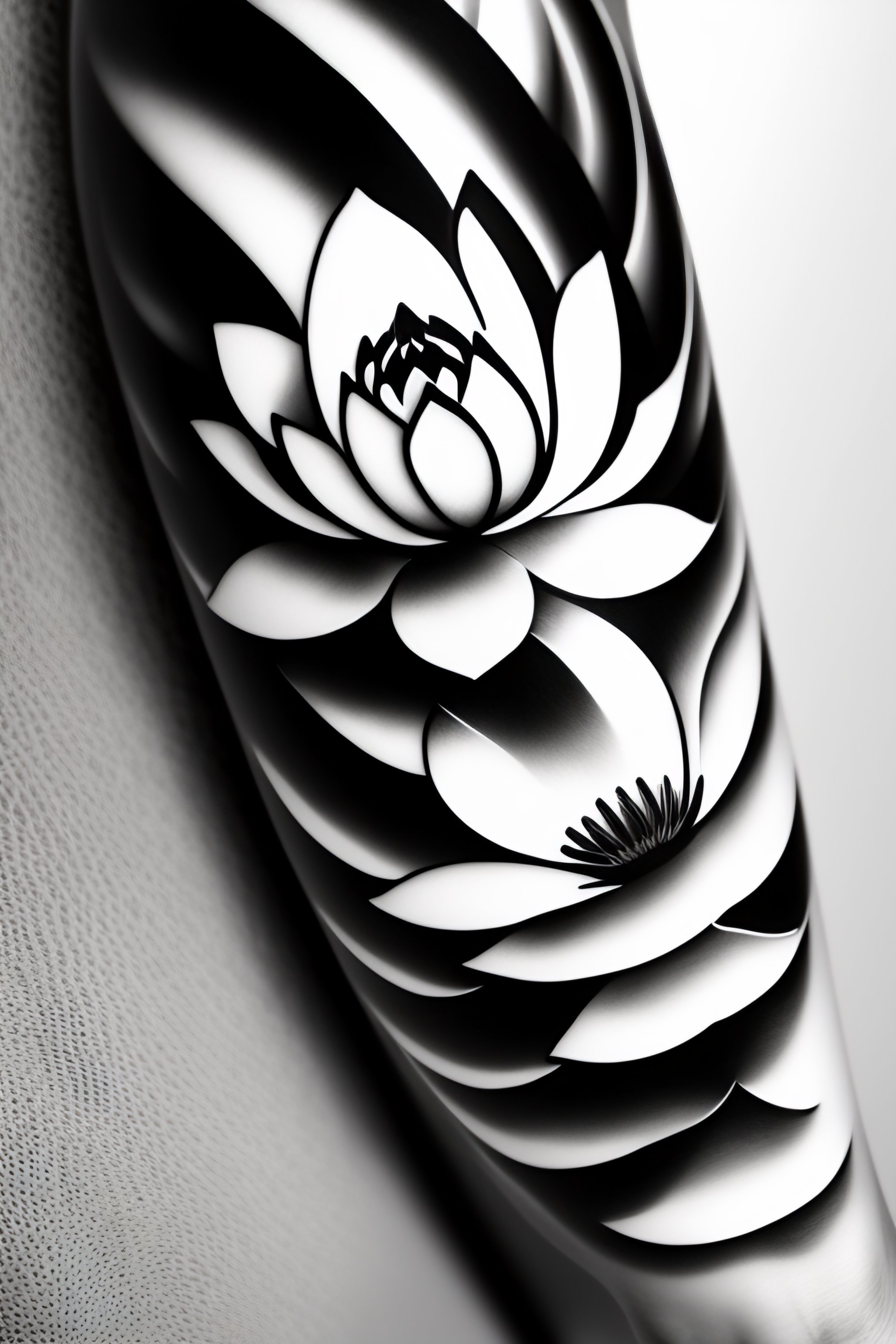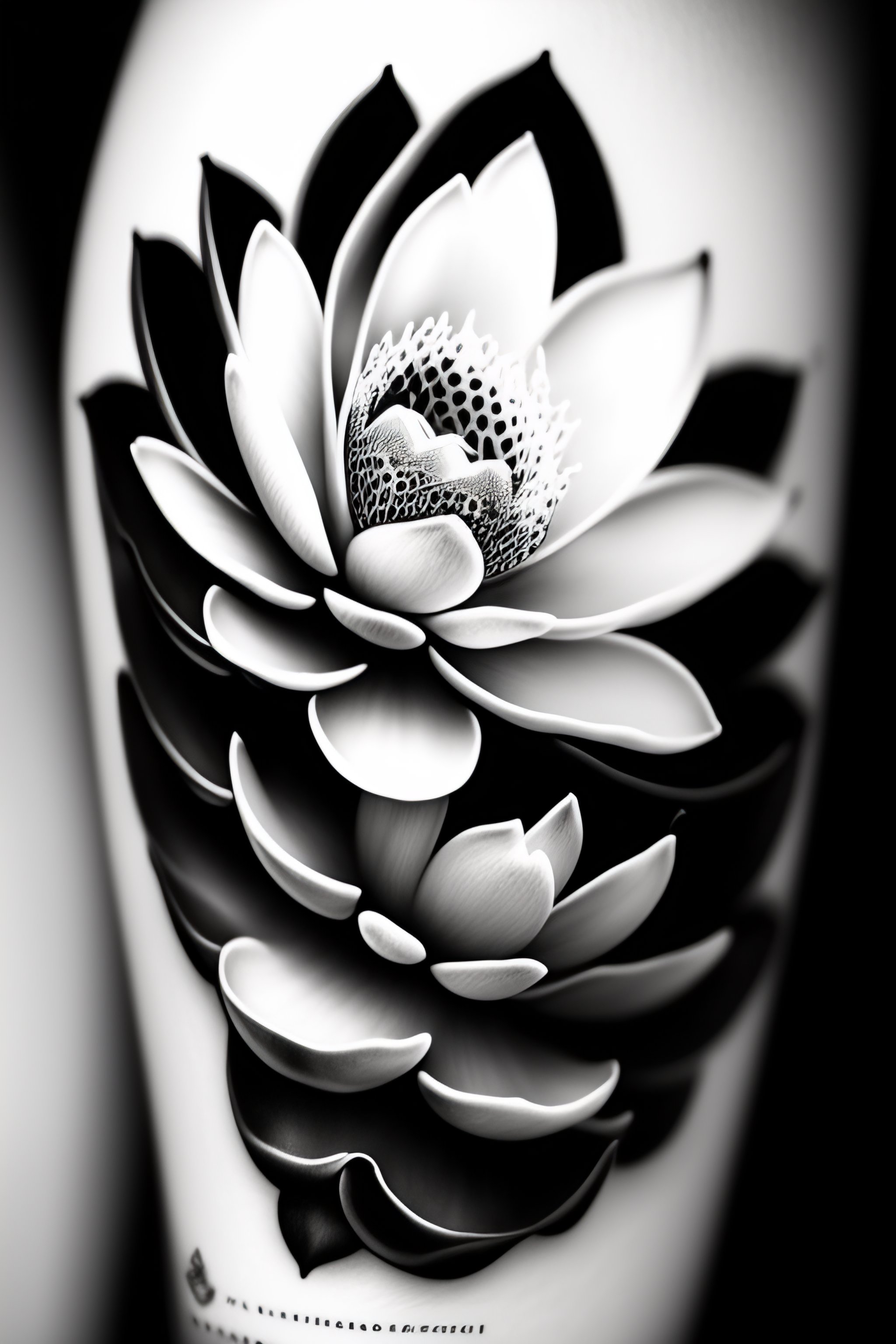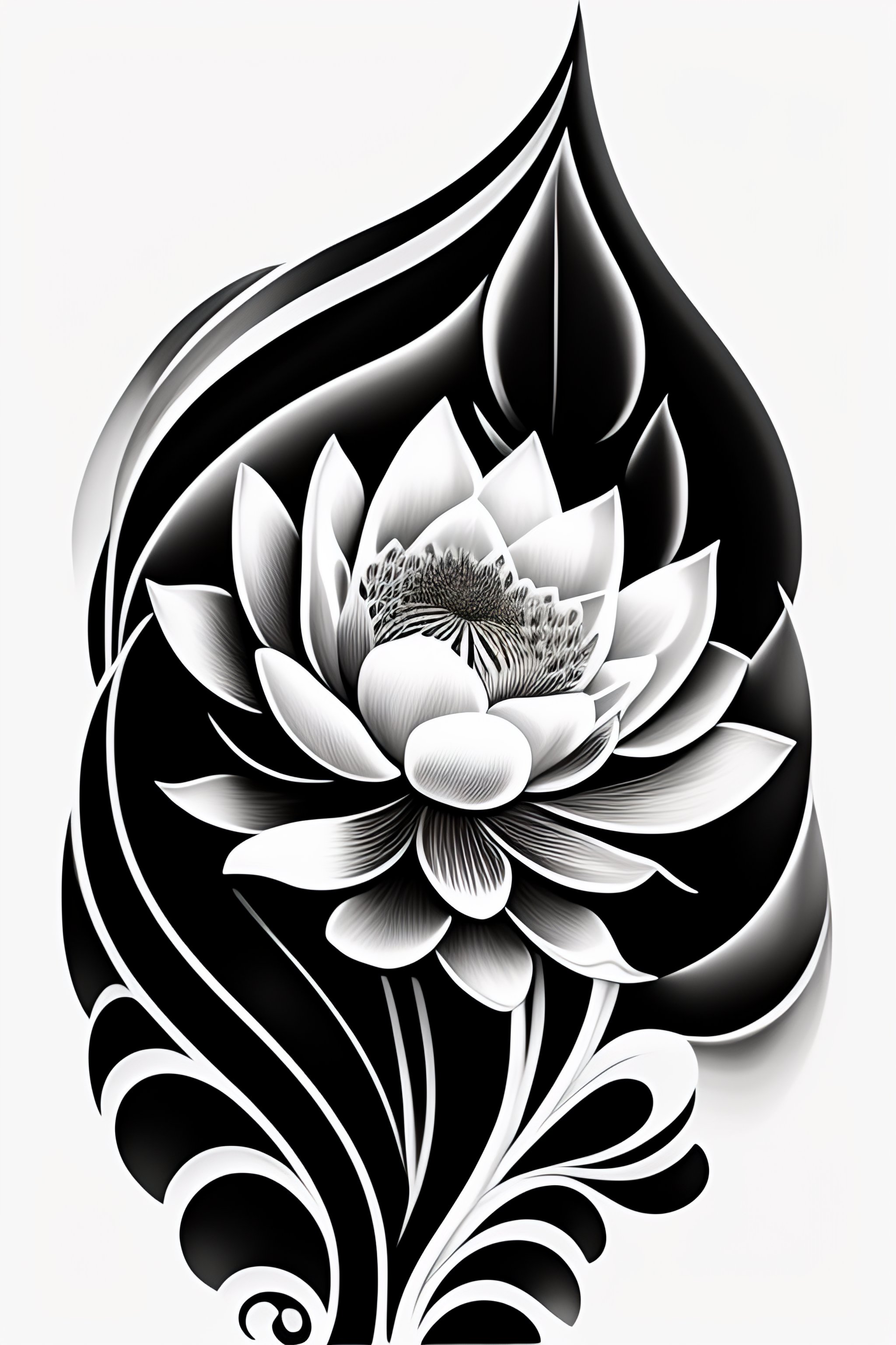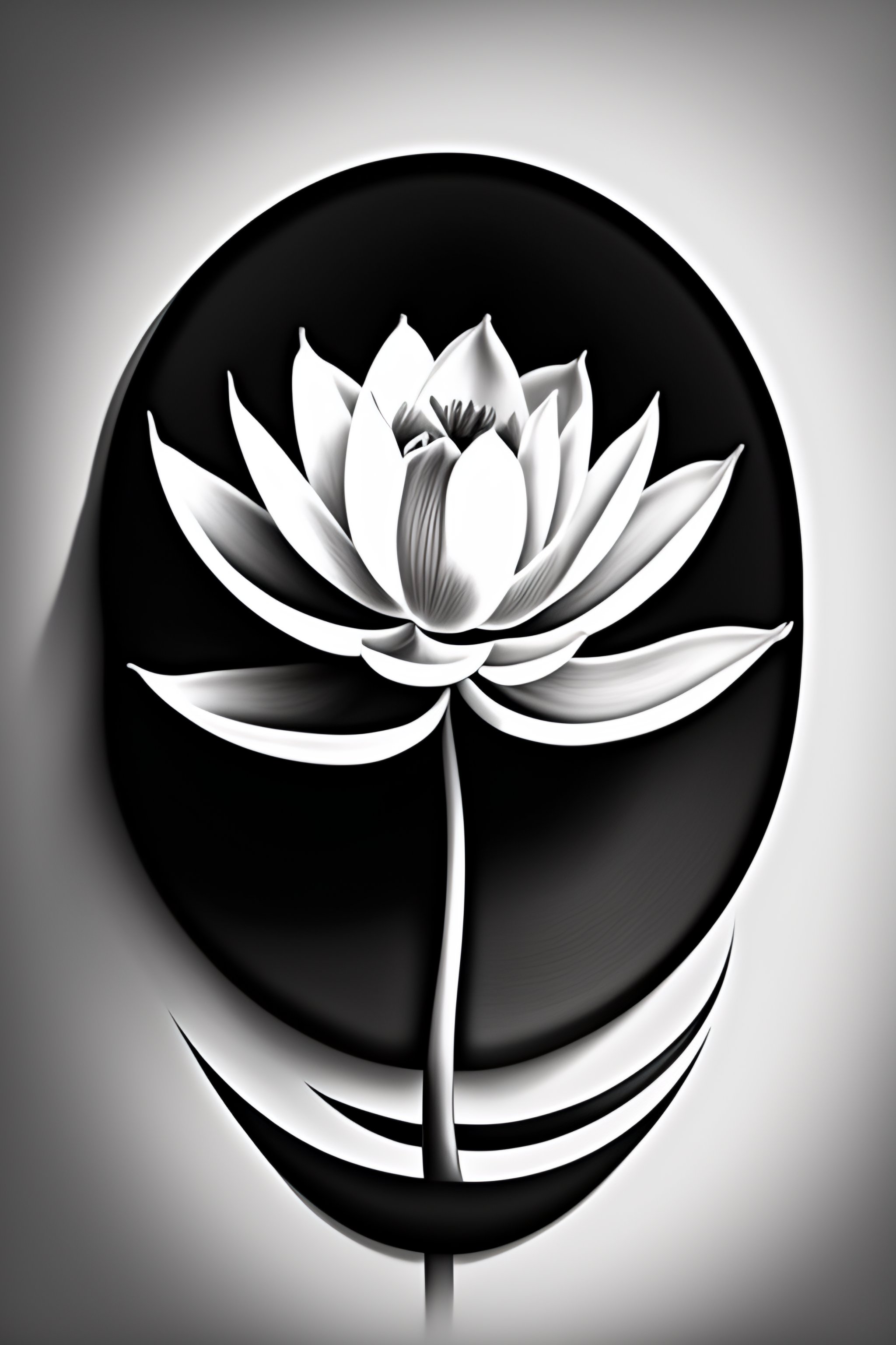 Minimalist tattoo black and white lotus flower with fine stripes realistic shadow white background
