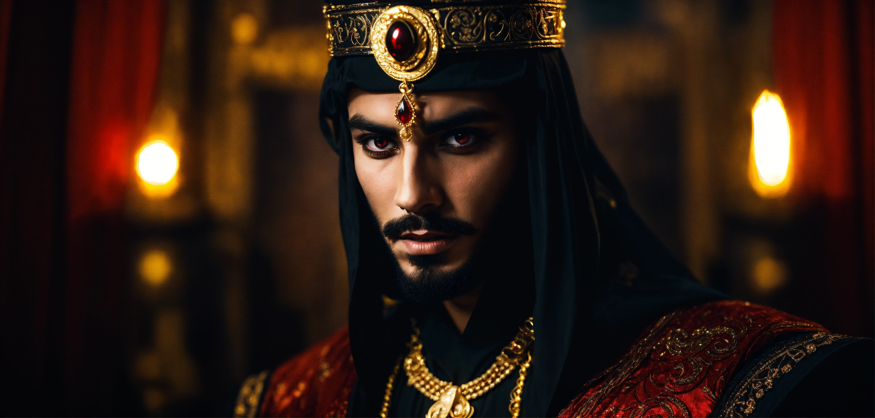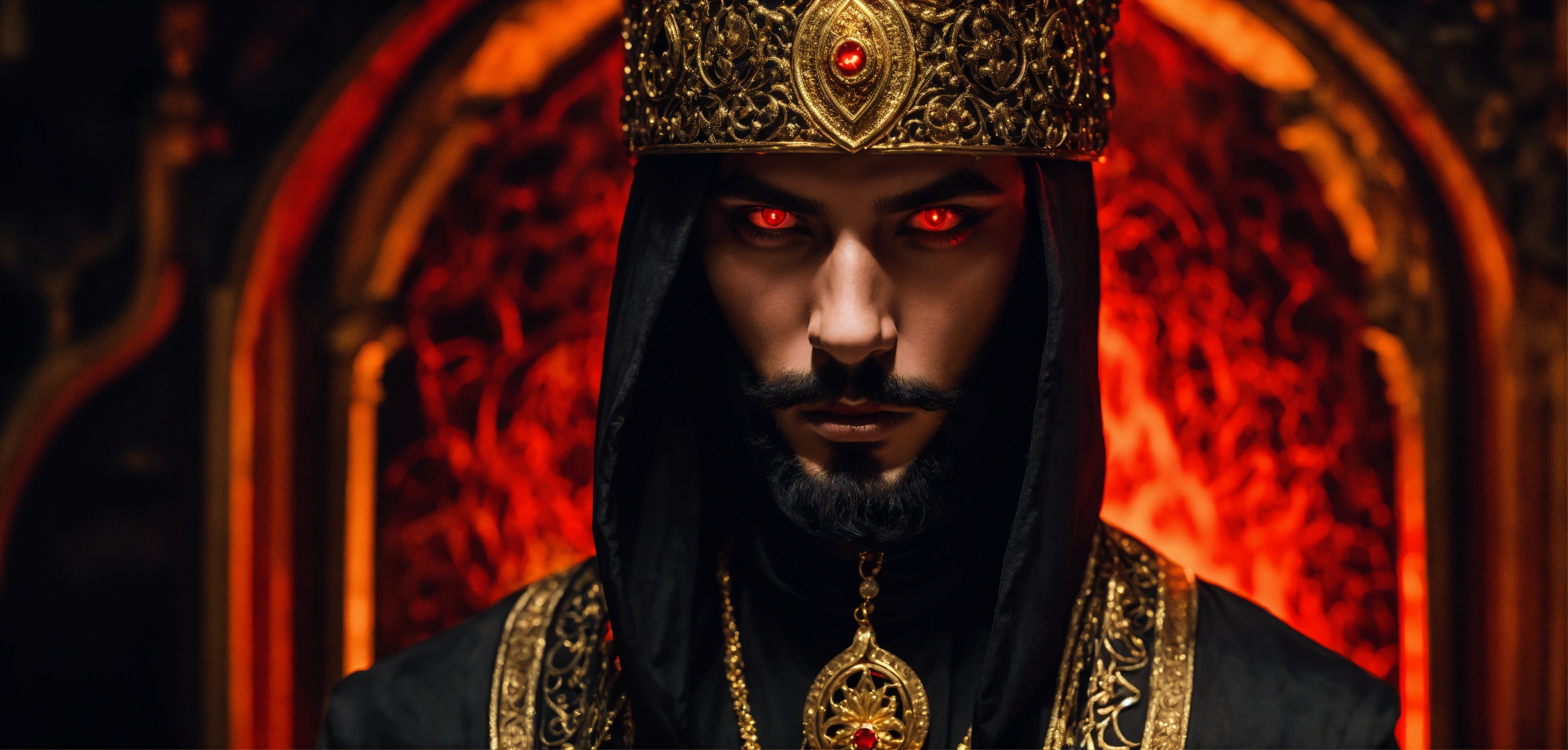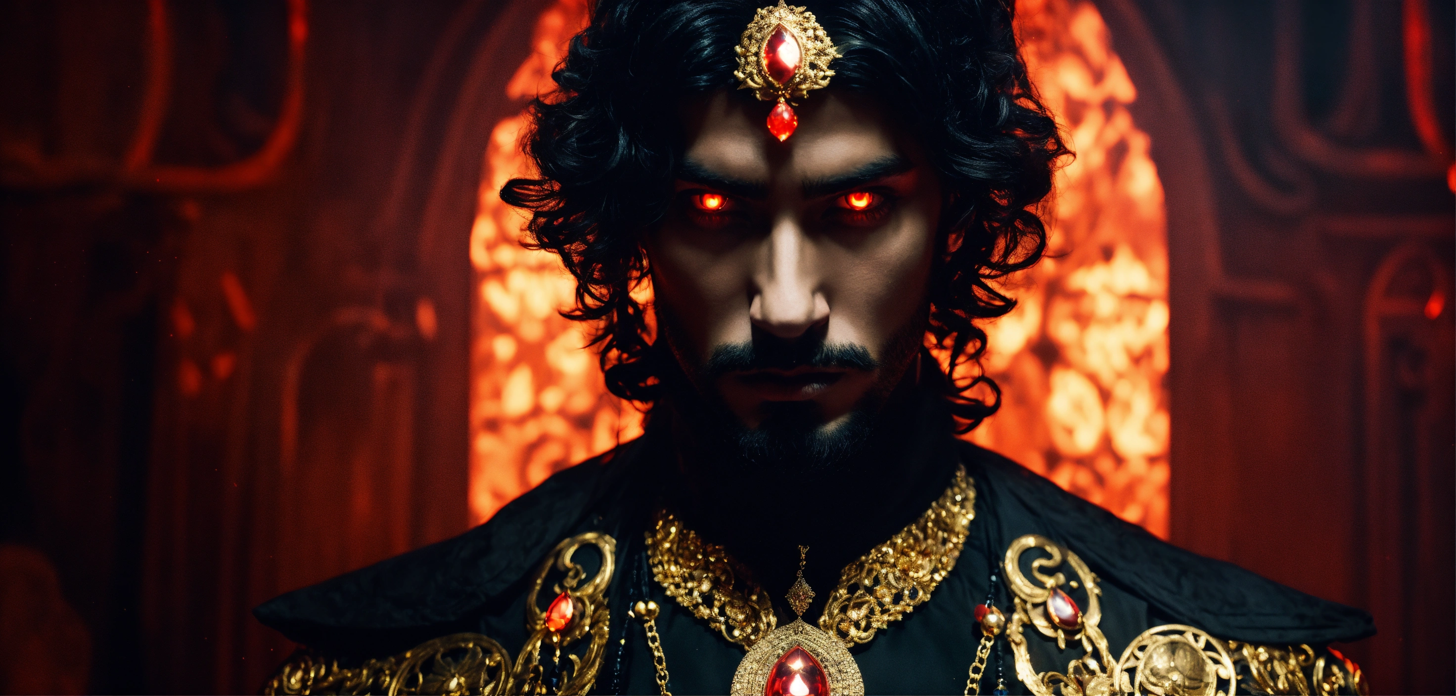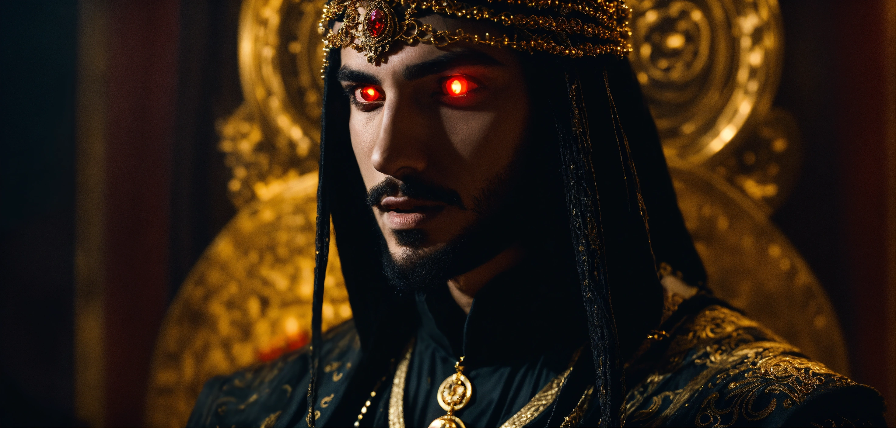 Sinister and dramatic headshot of a young handsome arabic evil sorcerer with hypnotically glowing red eyes wearing black elaborate mystical clothes and gold enchanted jewellery, mesmerising the viewer in a hidden dimly lit chamber.