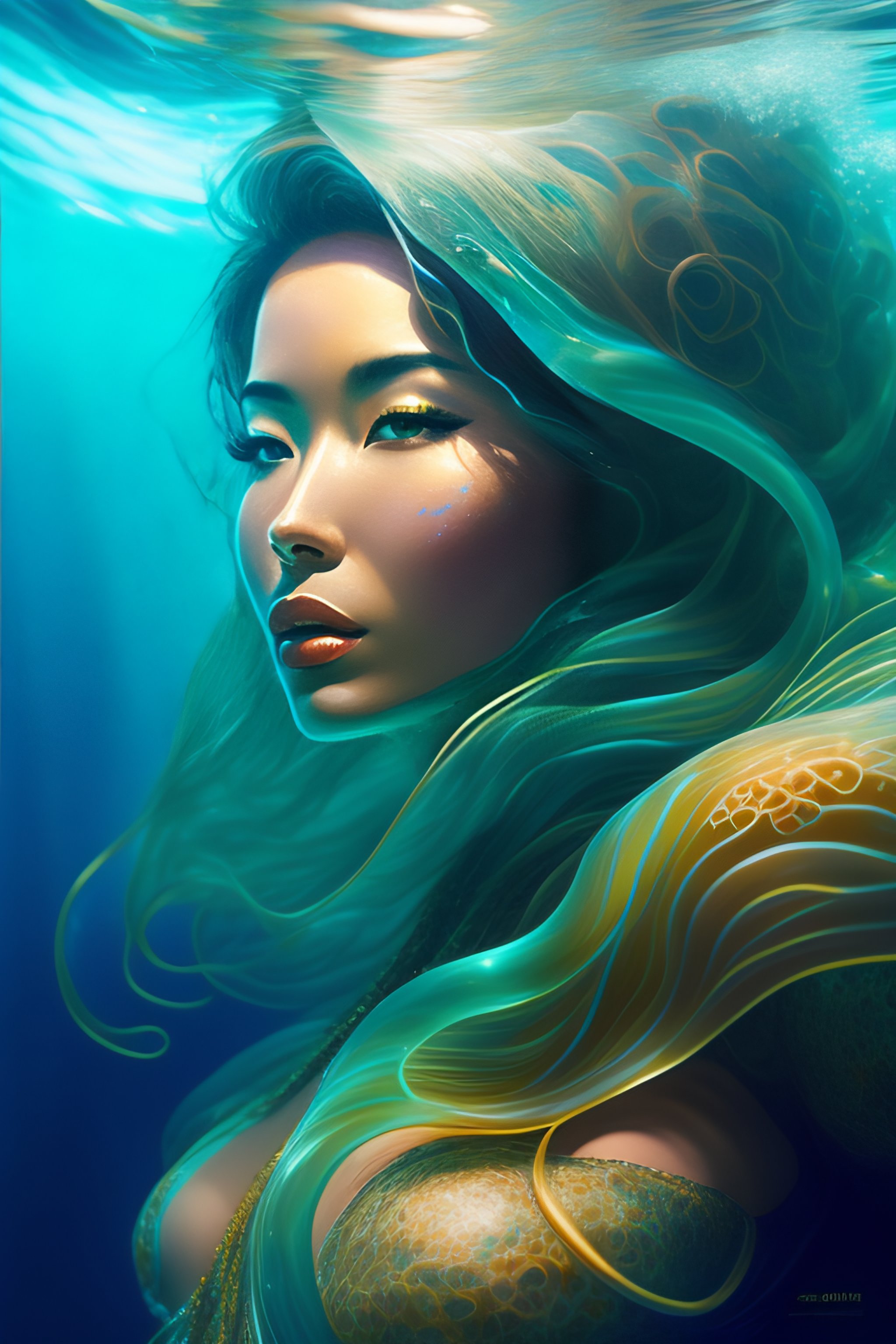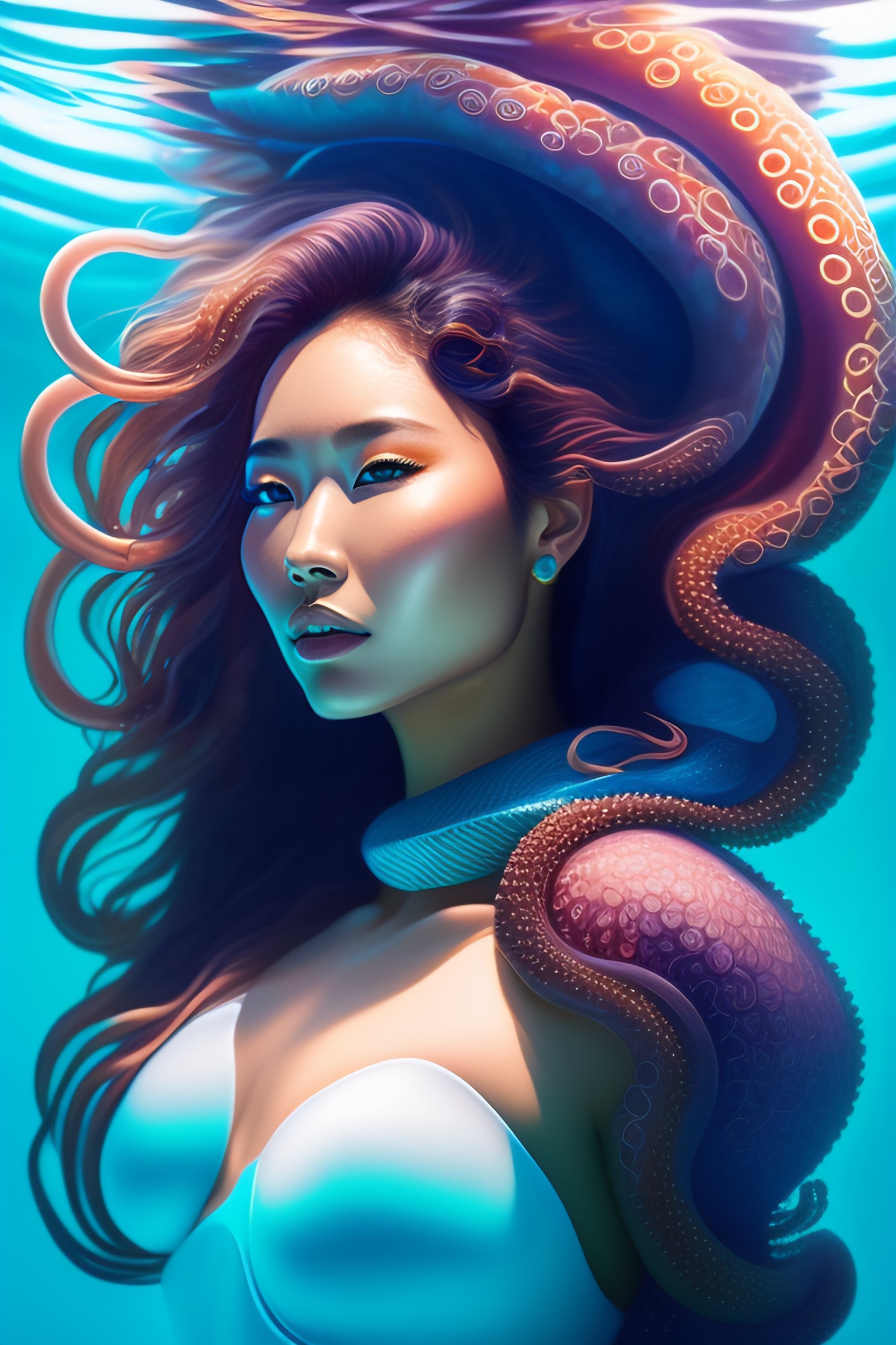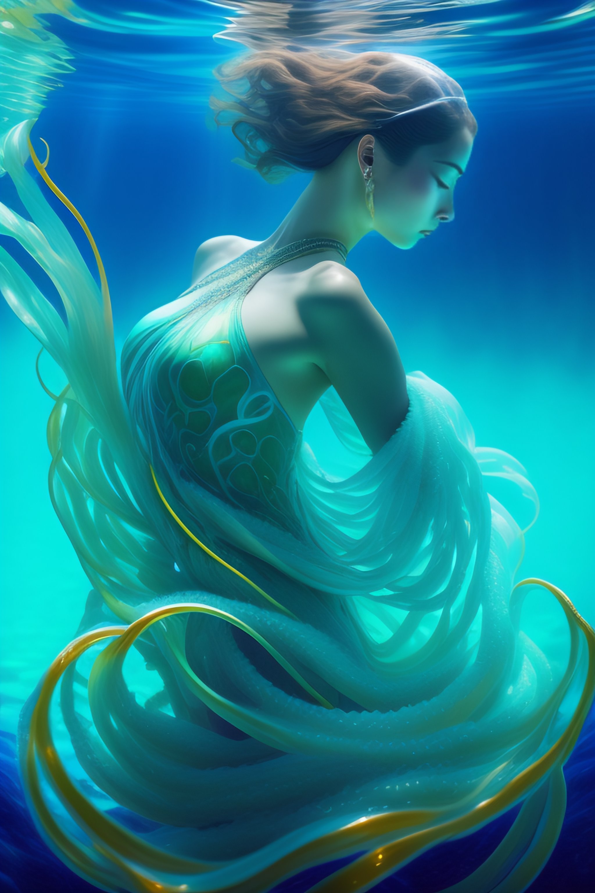 Underwater beautiful strong woman full body entwined with kelp, hyperrealistic, backlit, turquoise water, style of hajime sorayama, octopus tentacles wrapping
