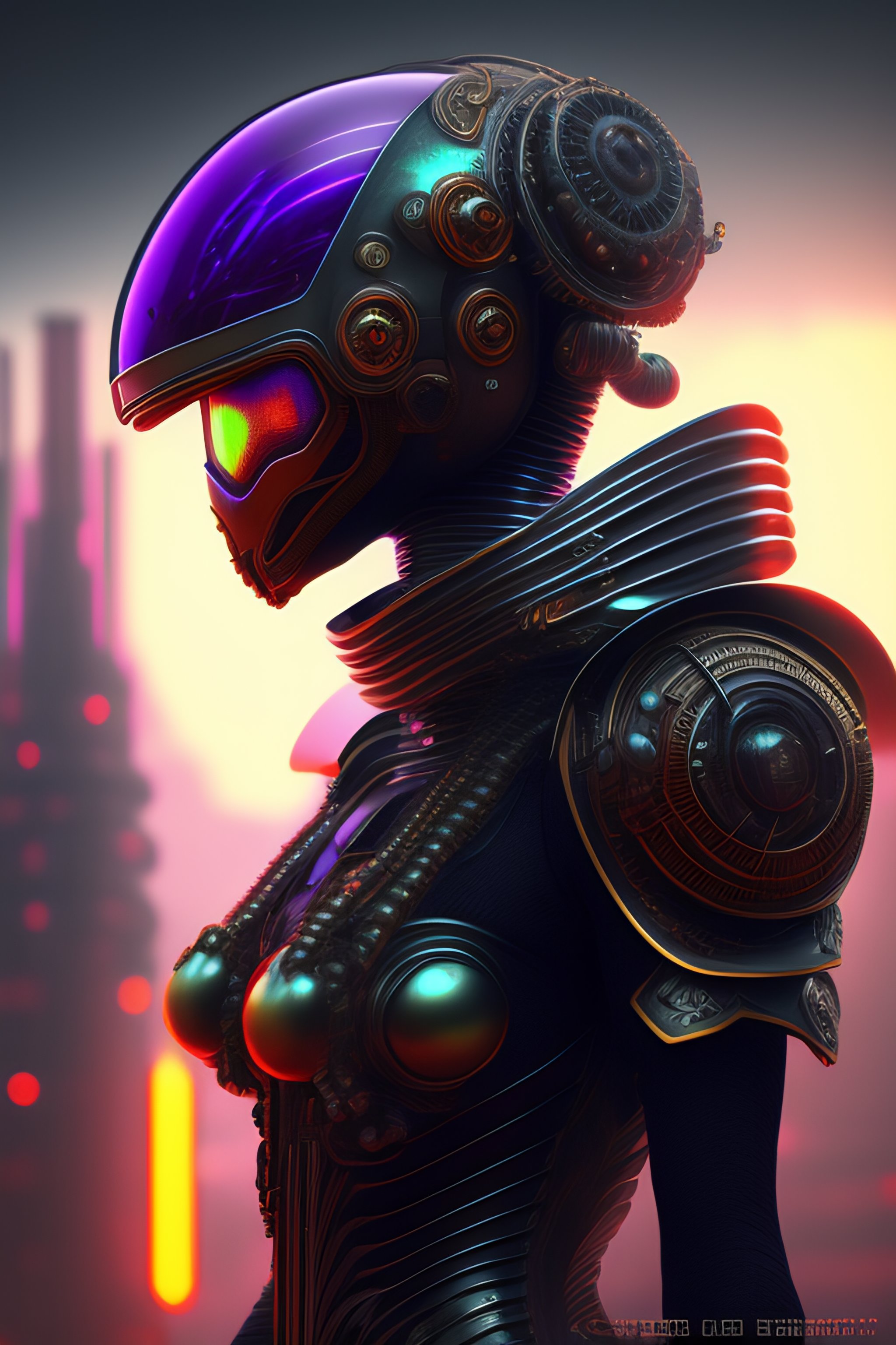 Alien cyborg, in the style of hr geiger and lovecraft, cyberpunk, steampunk, biopunk, synth wave, sharpened, intricate detail