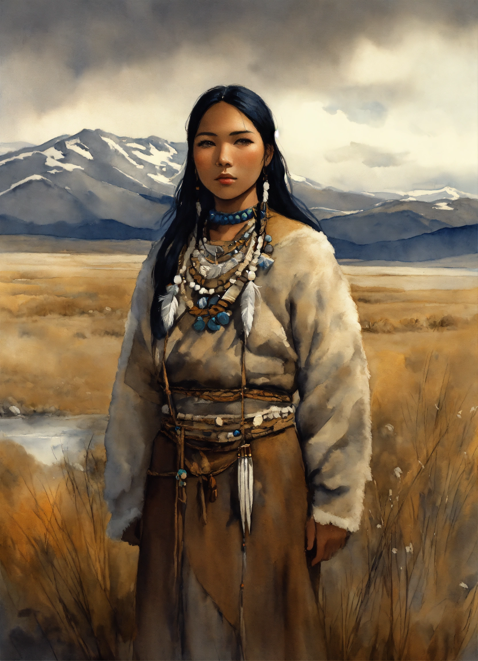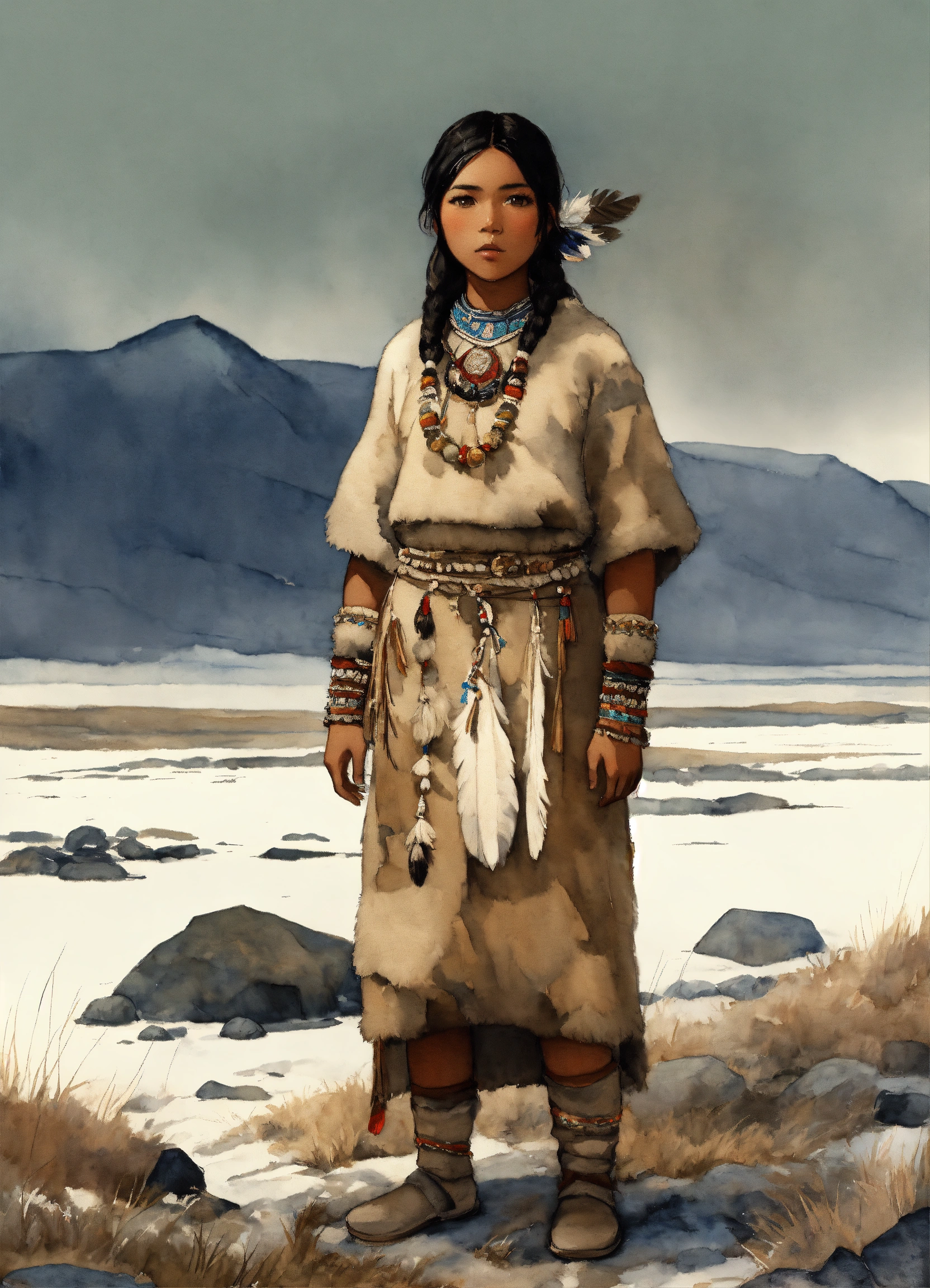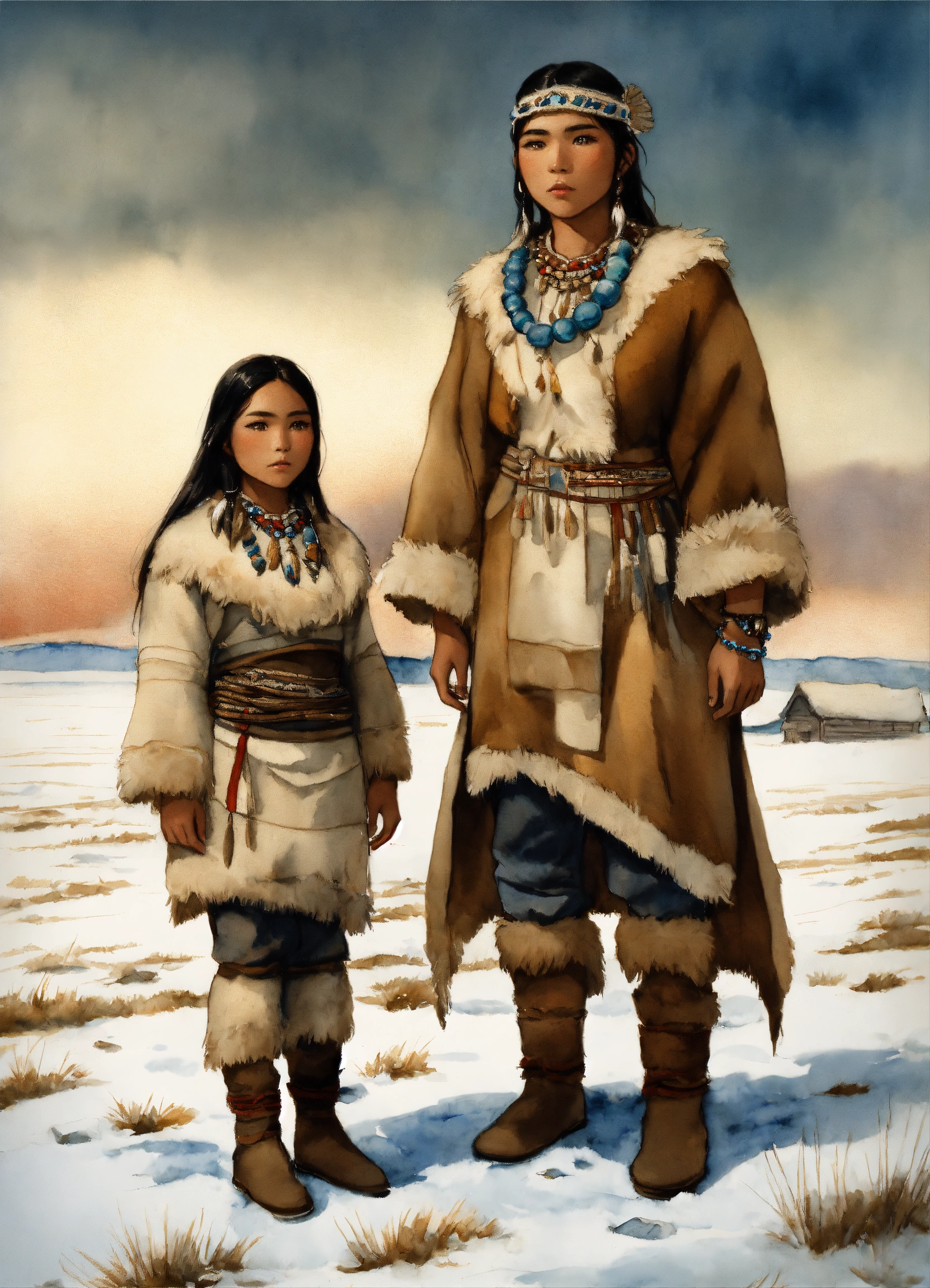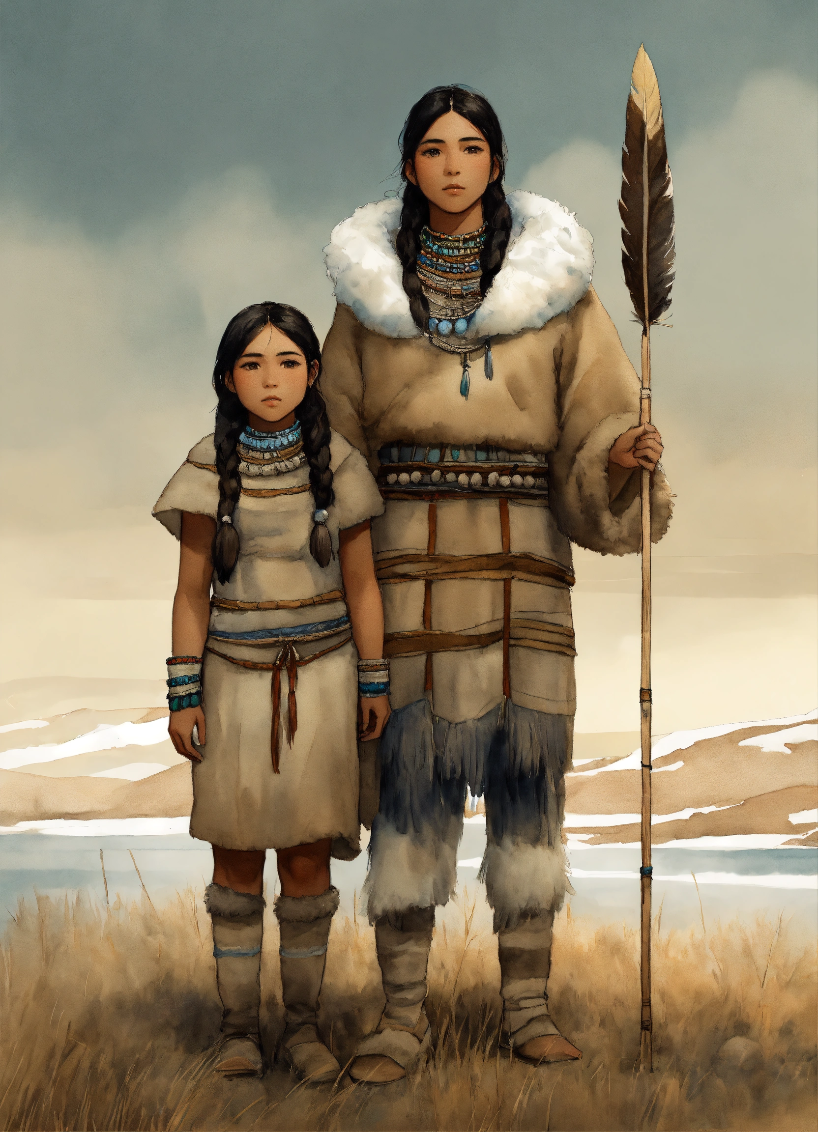 Full body illustration of an inuit woman, young, 18 years old, beautiful, native american phenotype, wearing stone age clothing made from natural fabrics like linen, cotton, or furs, adorned with feathers, beads and shells, stading on the tundra steppe with her youth brother, watercolors, gloomy and depressing ambient, artwork by tom björklund
