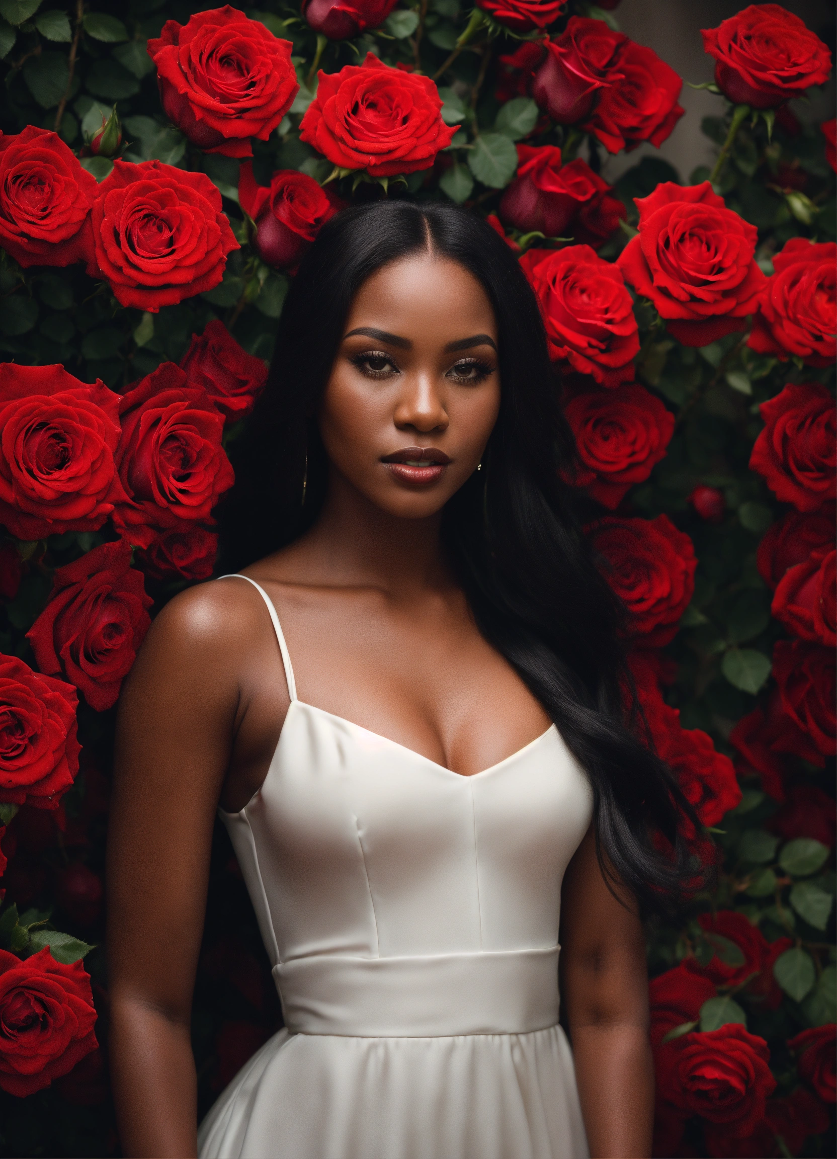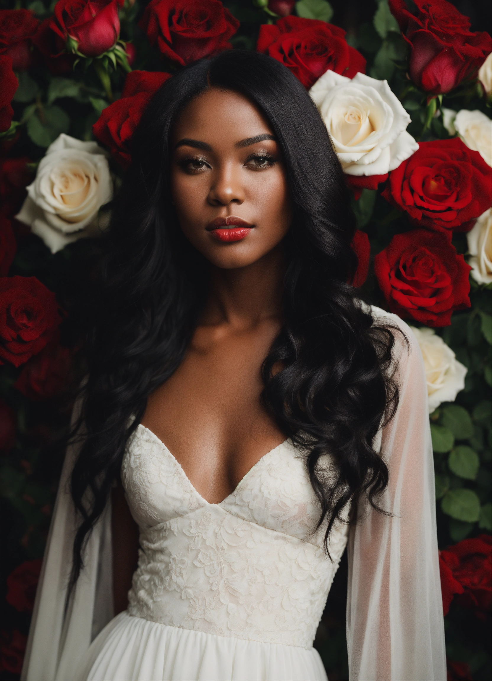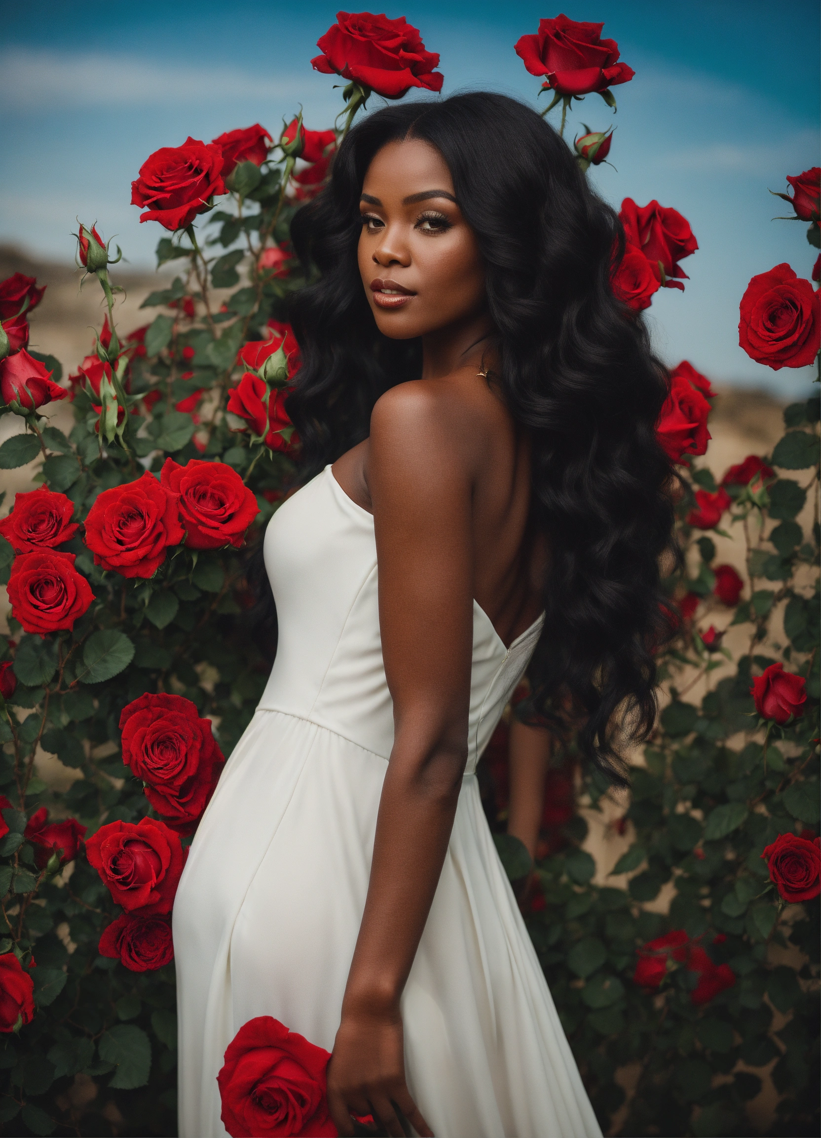 A beautiful shapely brunette black woman with long black hair dressed in a white dress with red roses