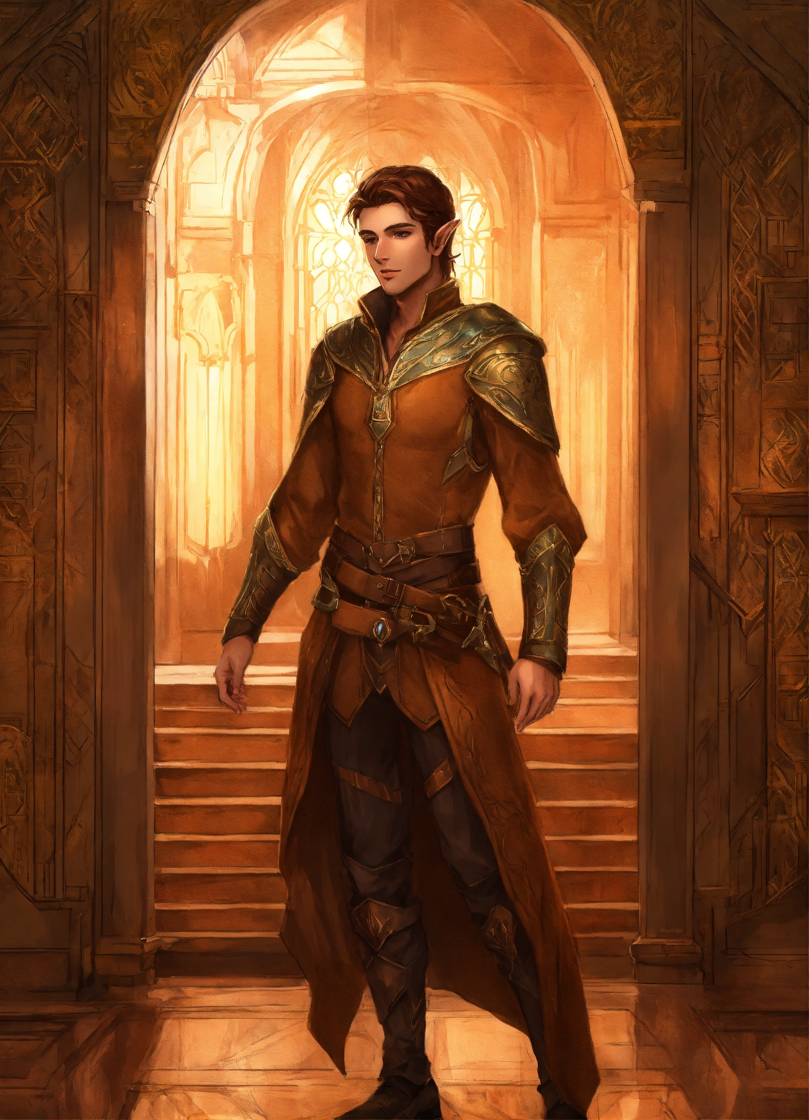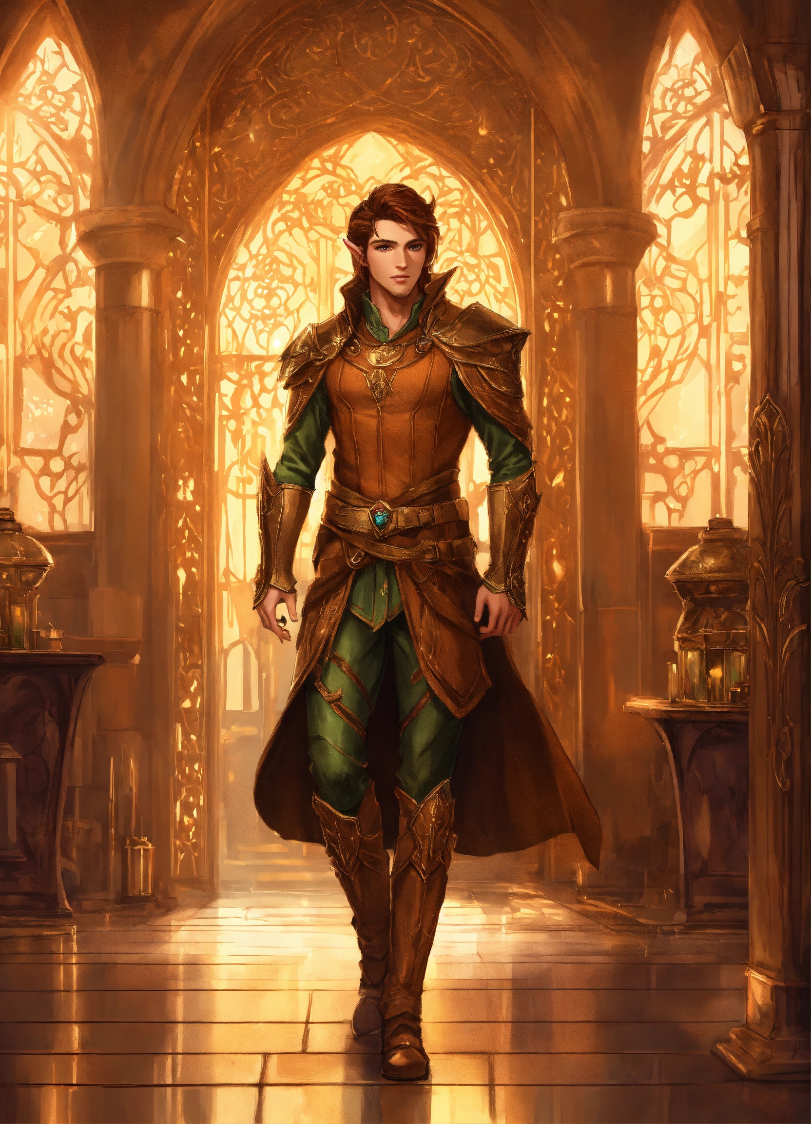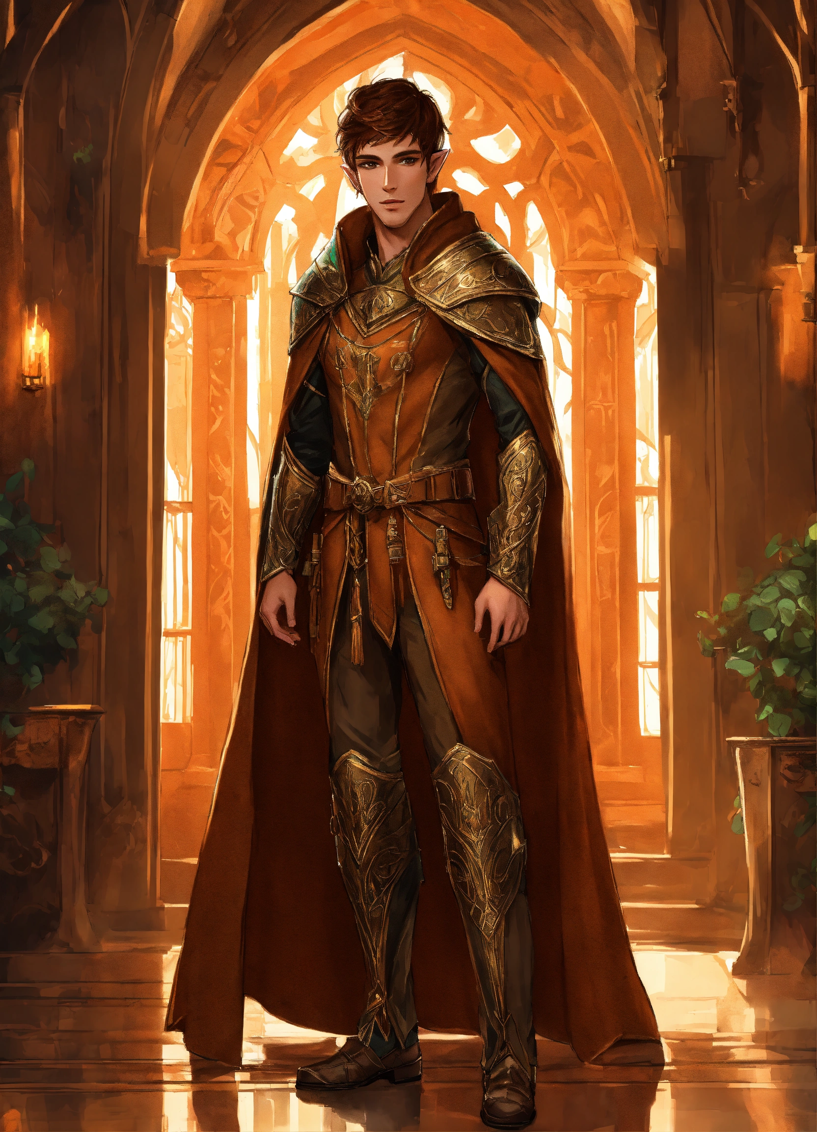 Drawing of an elf, royalty, sci fi, brown cybernetic outfit, brown hair, standing in a copper elven palace hall, handsome, male high elf, 22 years old, full body