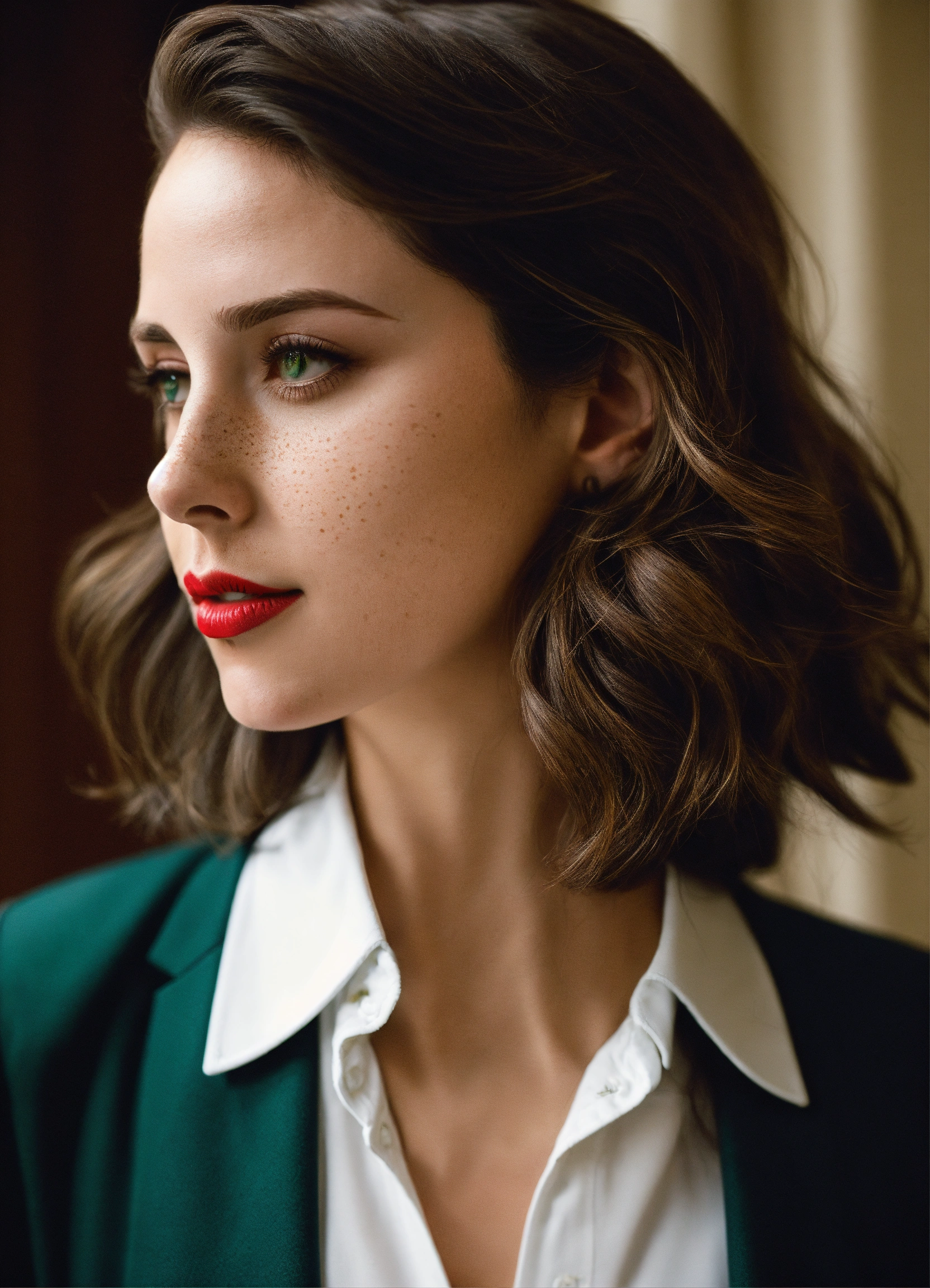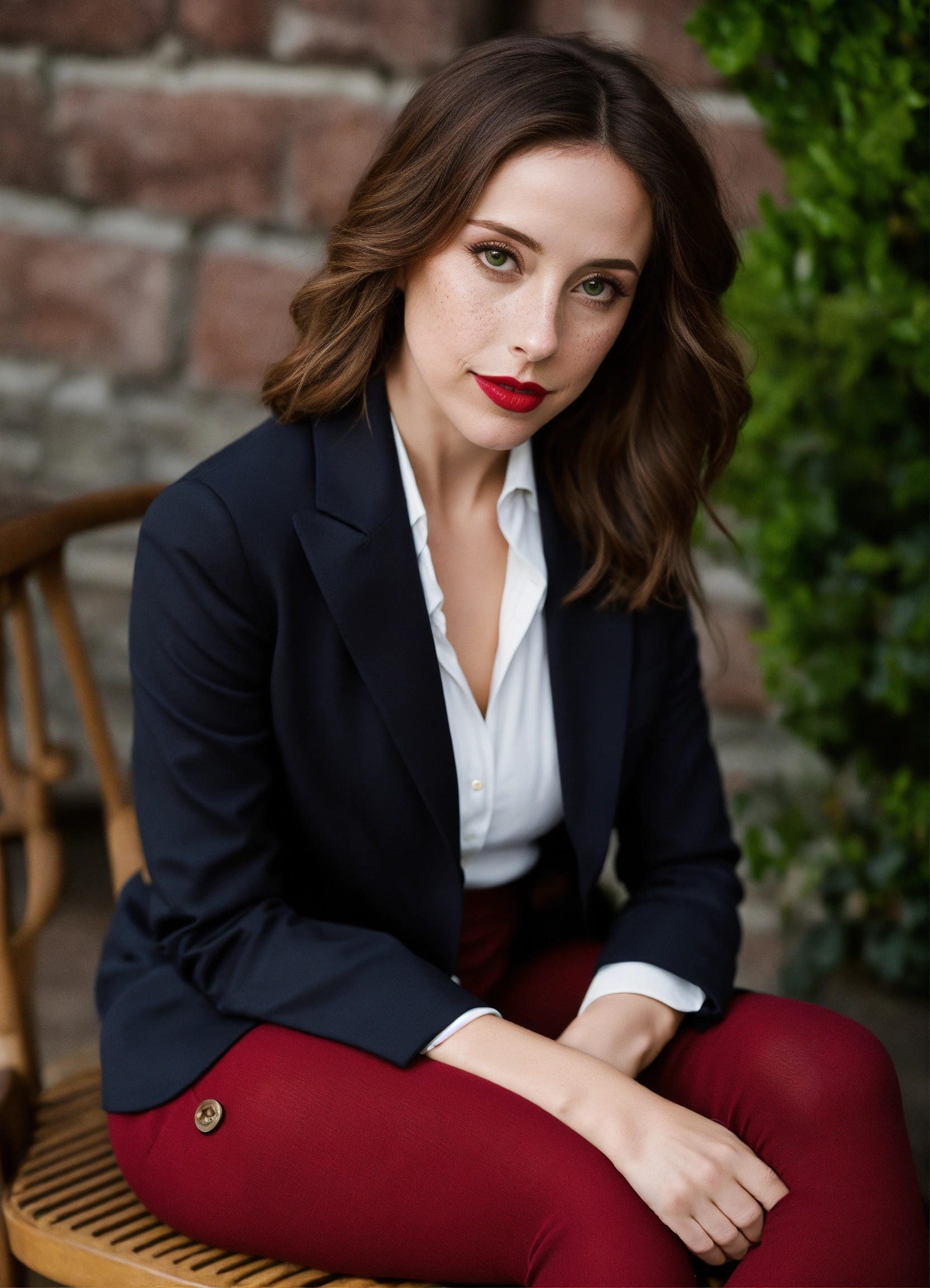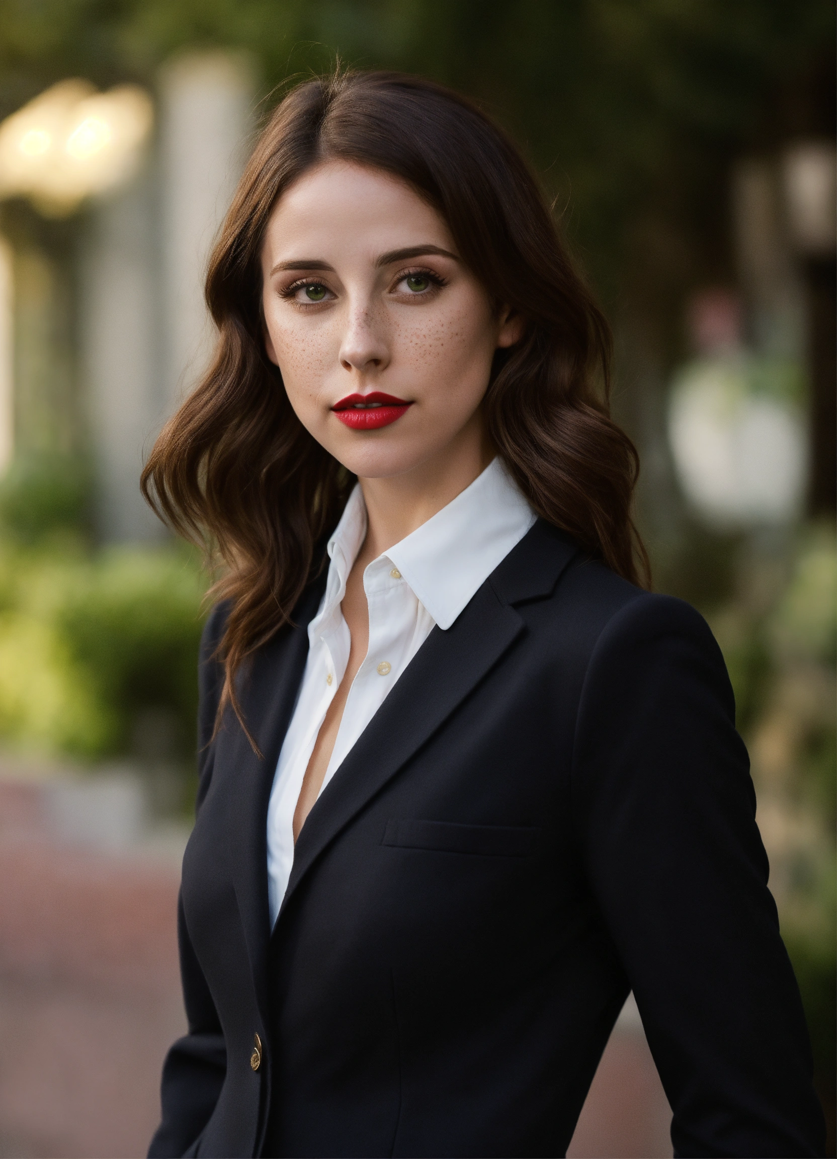 A photographic portrait of alison brie with neck lengthened, untied, greater bust, tight shirt, wide bust, she has green eyes, freckles on her face and red lipstick, form-fitting, curve-hugging, snug, tailored, close-cut, sculpted, defined, pronounced curves, shapely, casual, relaxed, laid-back, undone, informal, nonchalant, easygoing, disheveled, carefree, unbuttoned, unstructured, effortless, she wears a black suit jacket with a white shirt and black tie. her head is triangle shaped, preppy, elite, well-dressed, polished, sophisticated, form-fitting shirt, stylish, prestigious, private school attire, layered, hosiery, affluent, knee-high socks, upscale, traditional