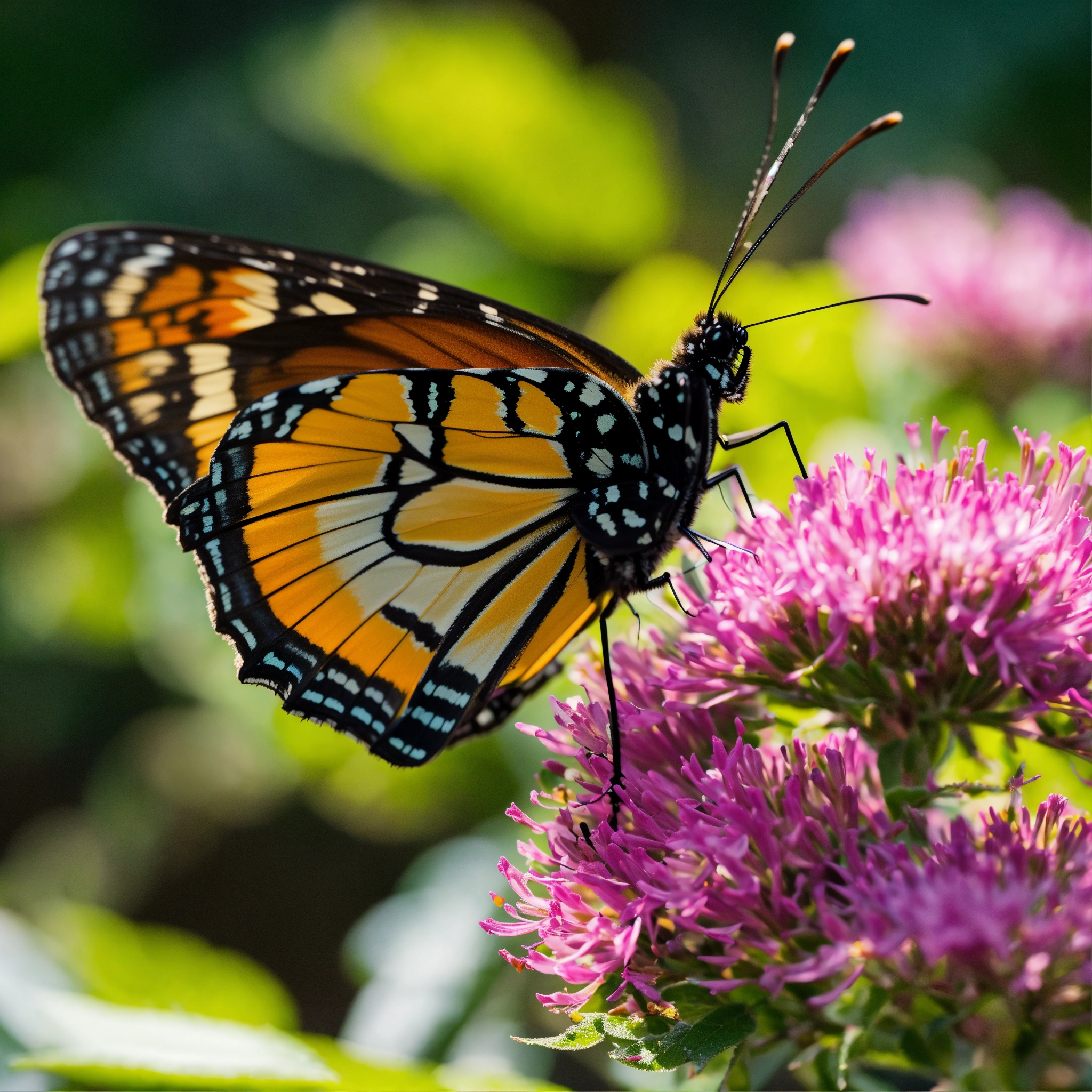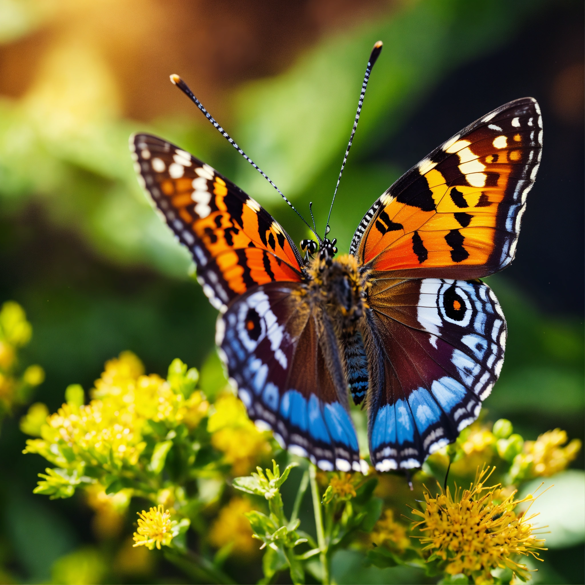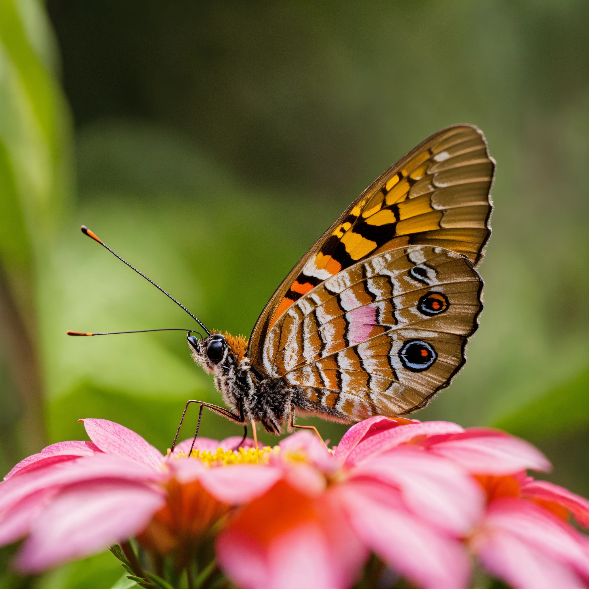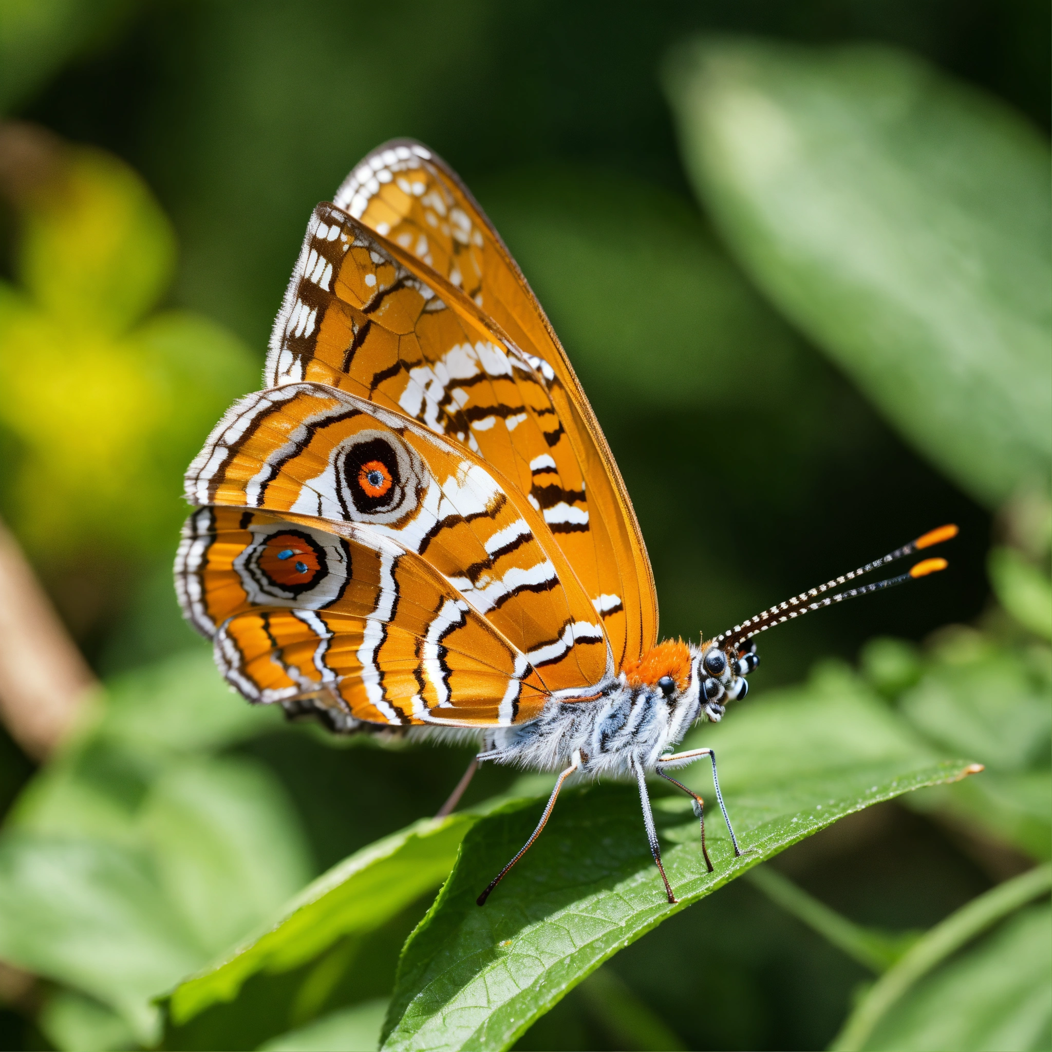Close up of an butterfly very near, at the forest, with high focus to the eyes and head, colorful scene, 8k, highest resolution, perfect view