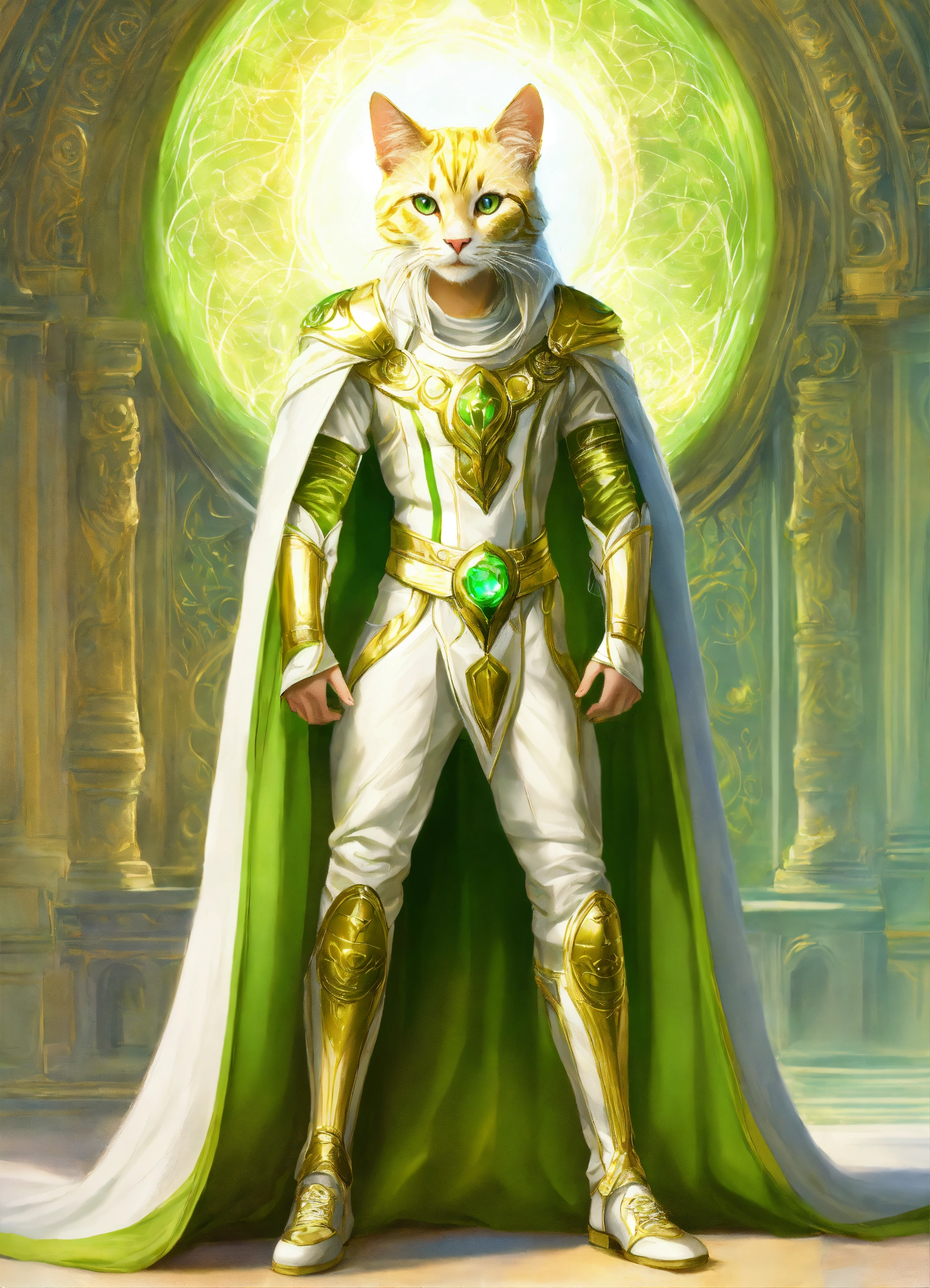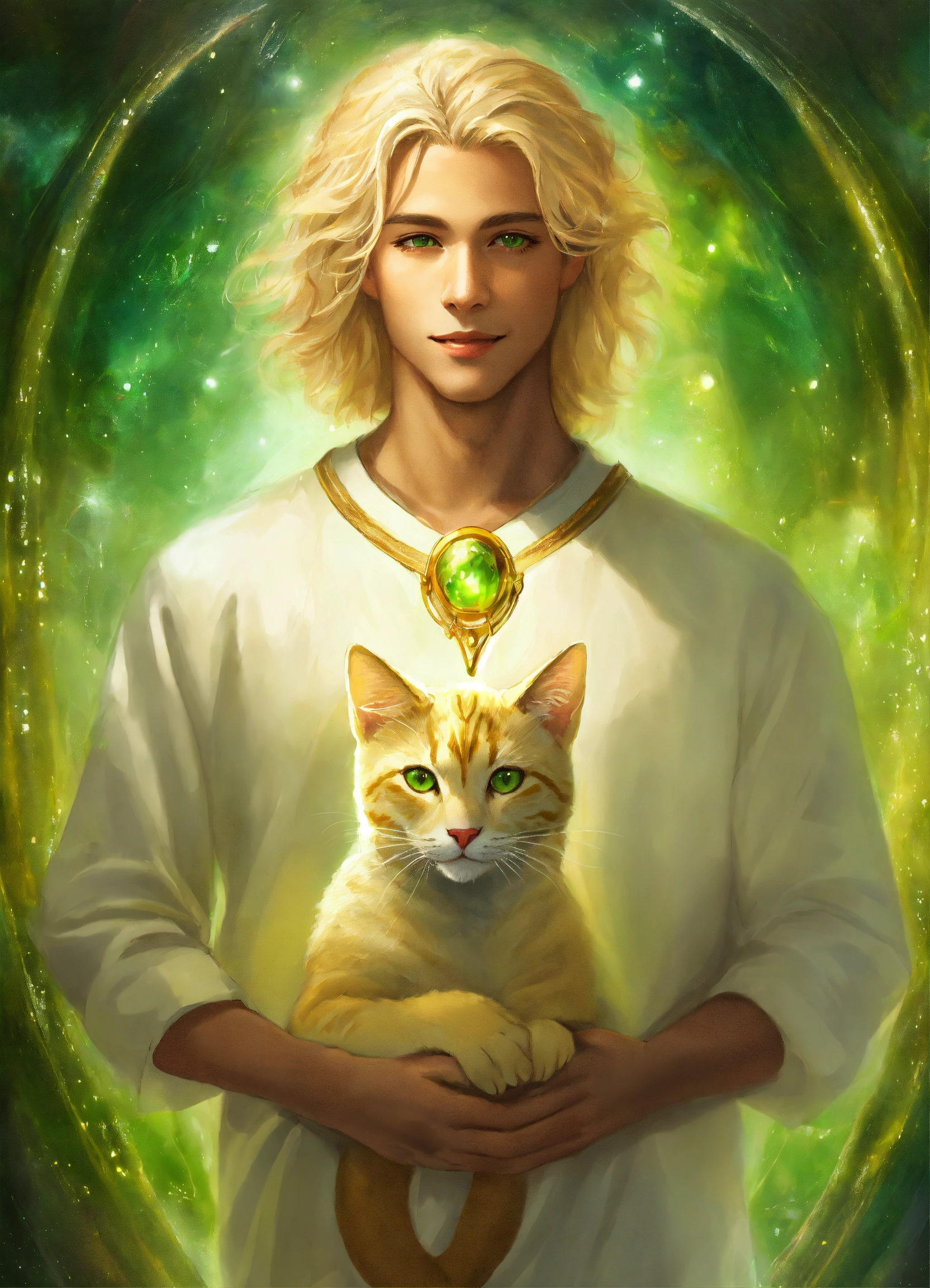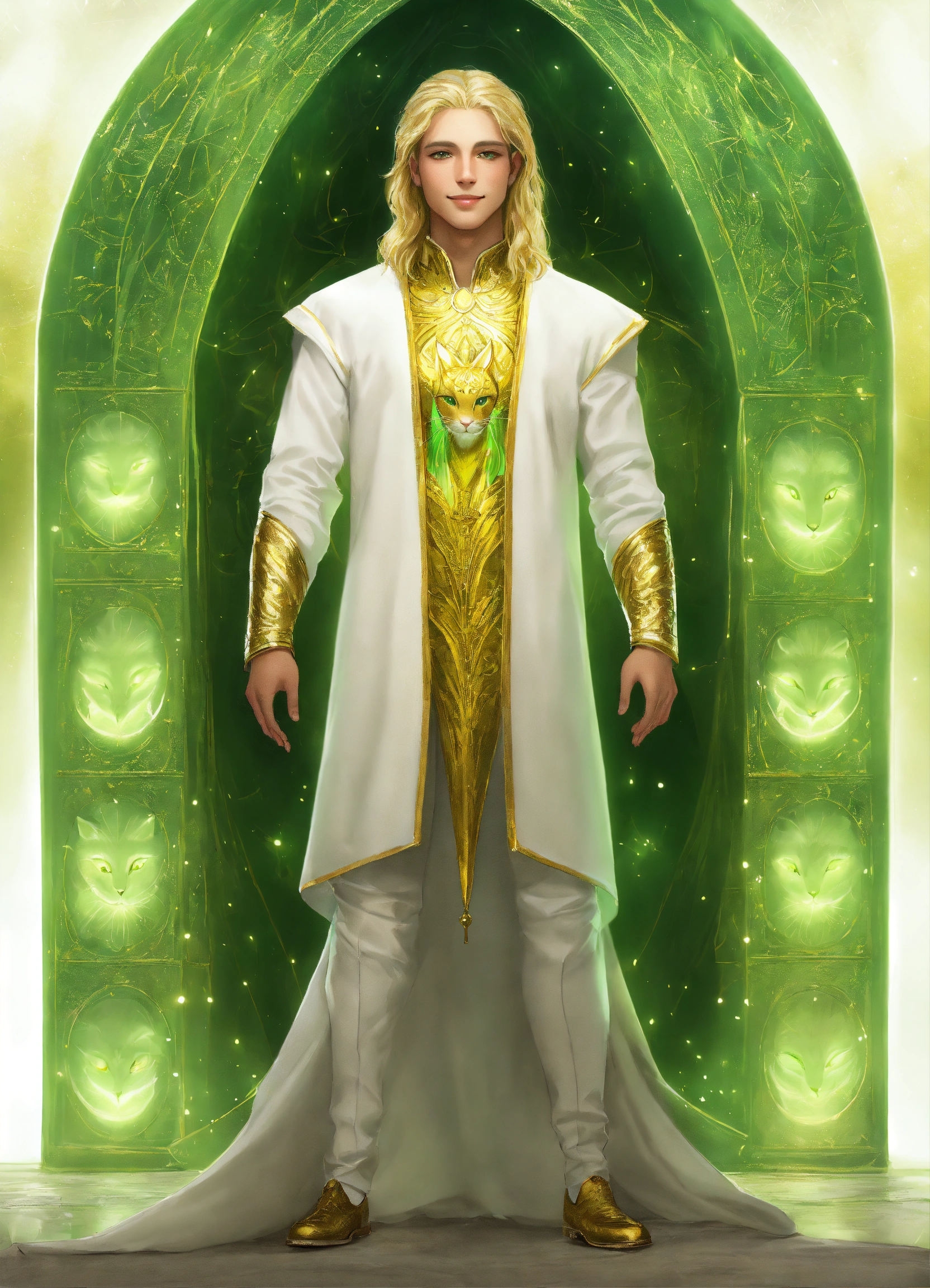Spiritual guide realistic drawing a full body portrait of a young sirian extraterrestrial men, with white skin, golden hair and green feline eyes. feline smile. wearing white clothes. white background. spiritual mentor.